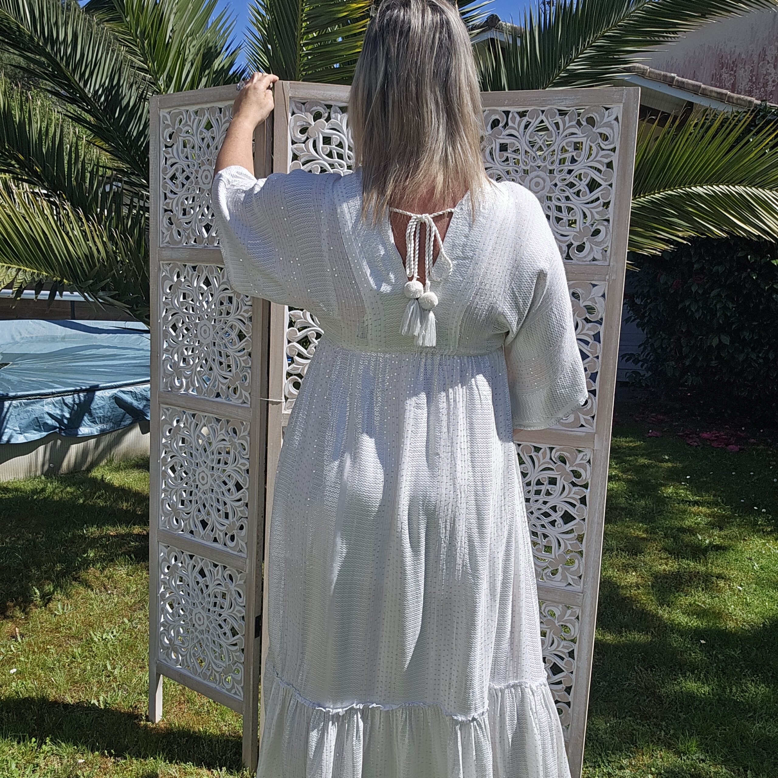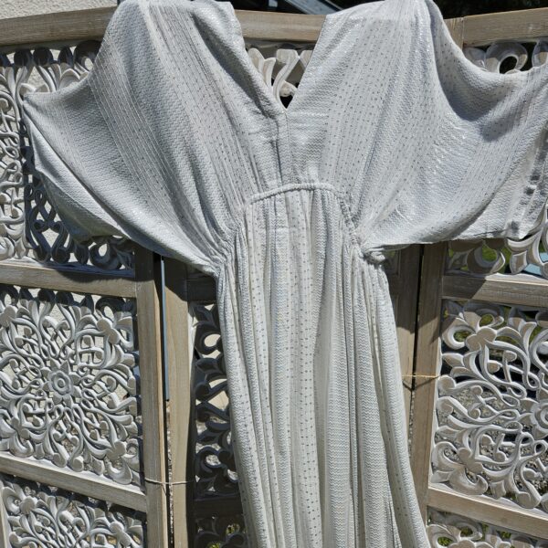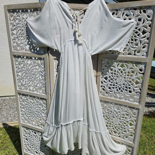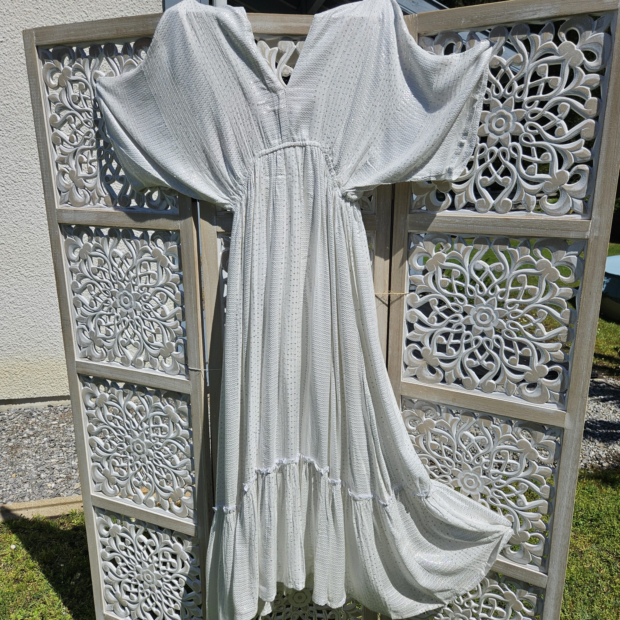 Robe bohème longue blanche avec des fils argentés en forme de vagues avec des alternances de sequins. Elastiquée sous poitrine. Col V devant et derrière. Fermeture derrière par 2 cordons avec des pompons au bout. Manches 3/4 fluides et amples. Doublée jusqu’à mi cuisses. La matière est douce comme de la soie, légère, fluide. TU