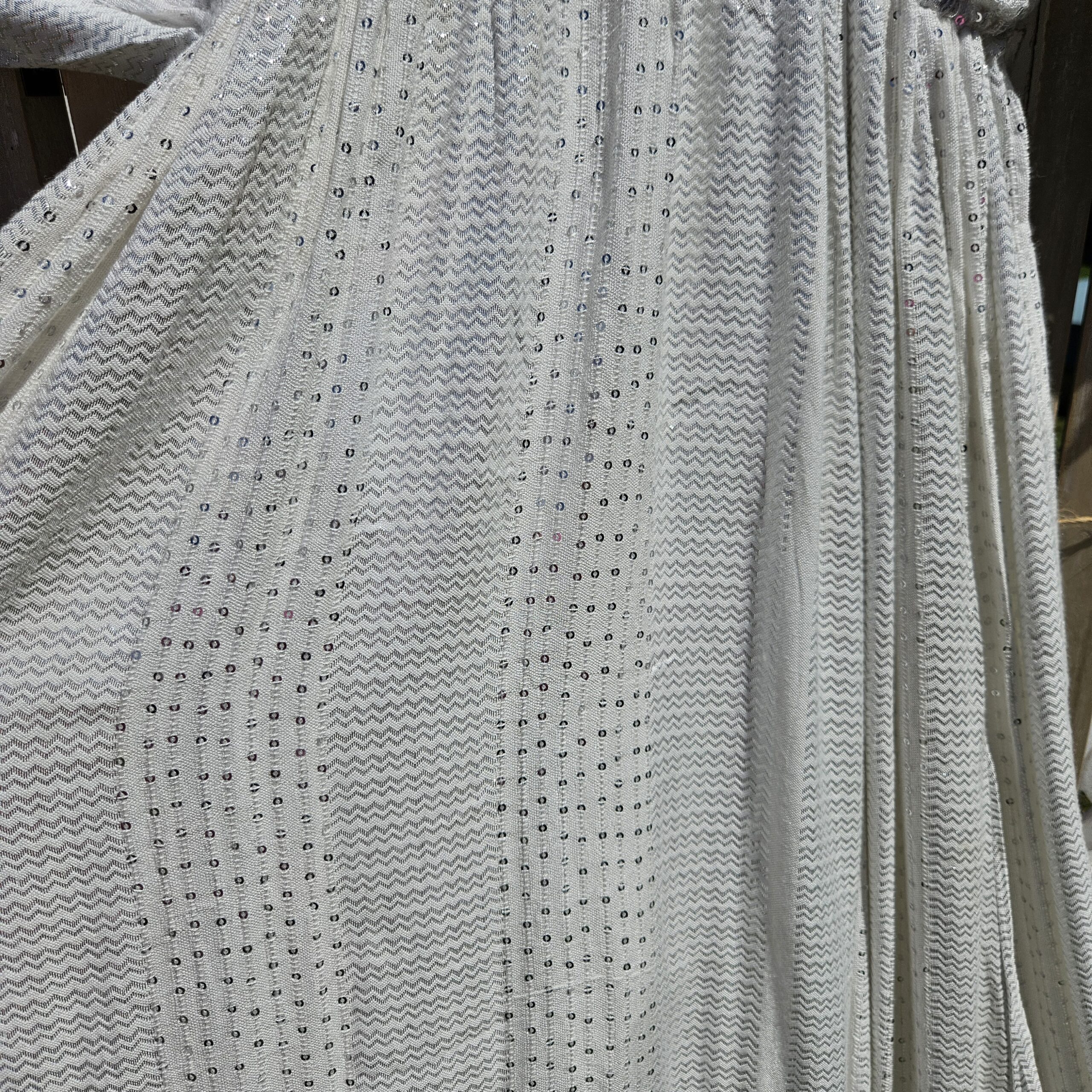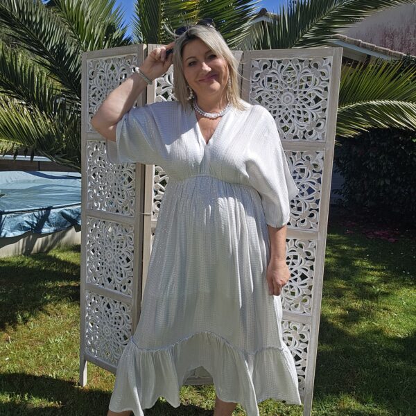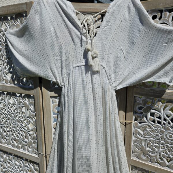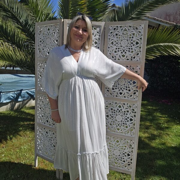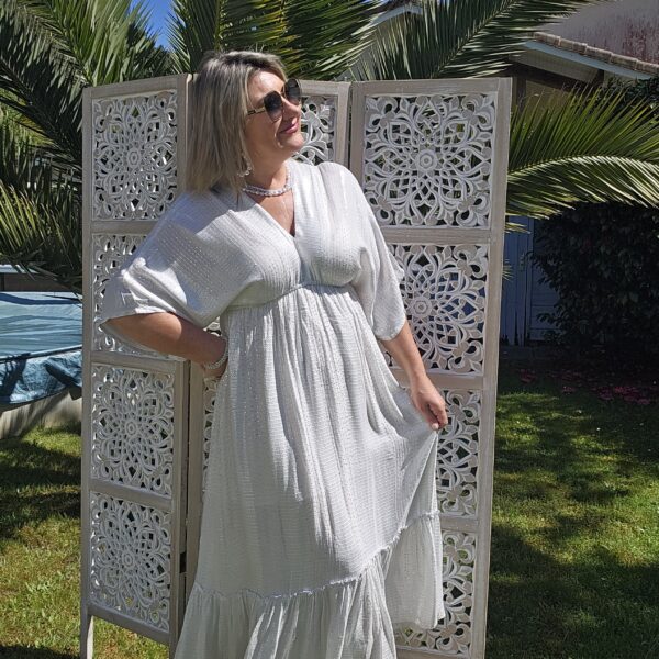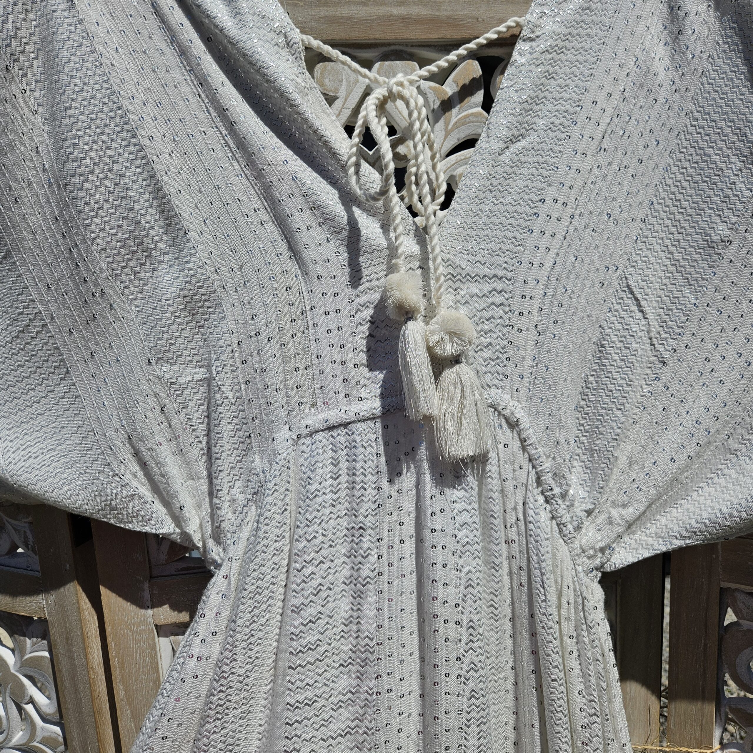 Robe bohème longue blanche avec des fils argentés en forme de vagues avec des alternances de sequins. Elastiquée sous poitrine. Col V devant et derrière. Fermeture derrière par 2 cordons avec des pompons au bout. Manches 3/4 fluides et amples. Doublée jusqu’à mi cuisses. La matière est douce comme de la soie, légère, fluide. TU