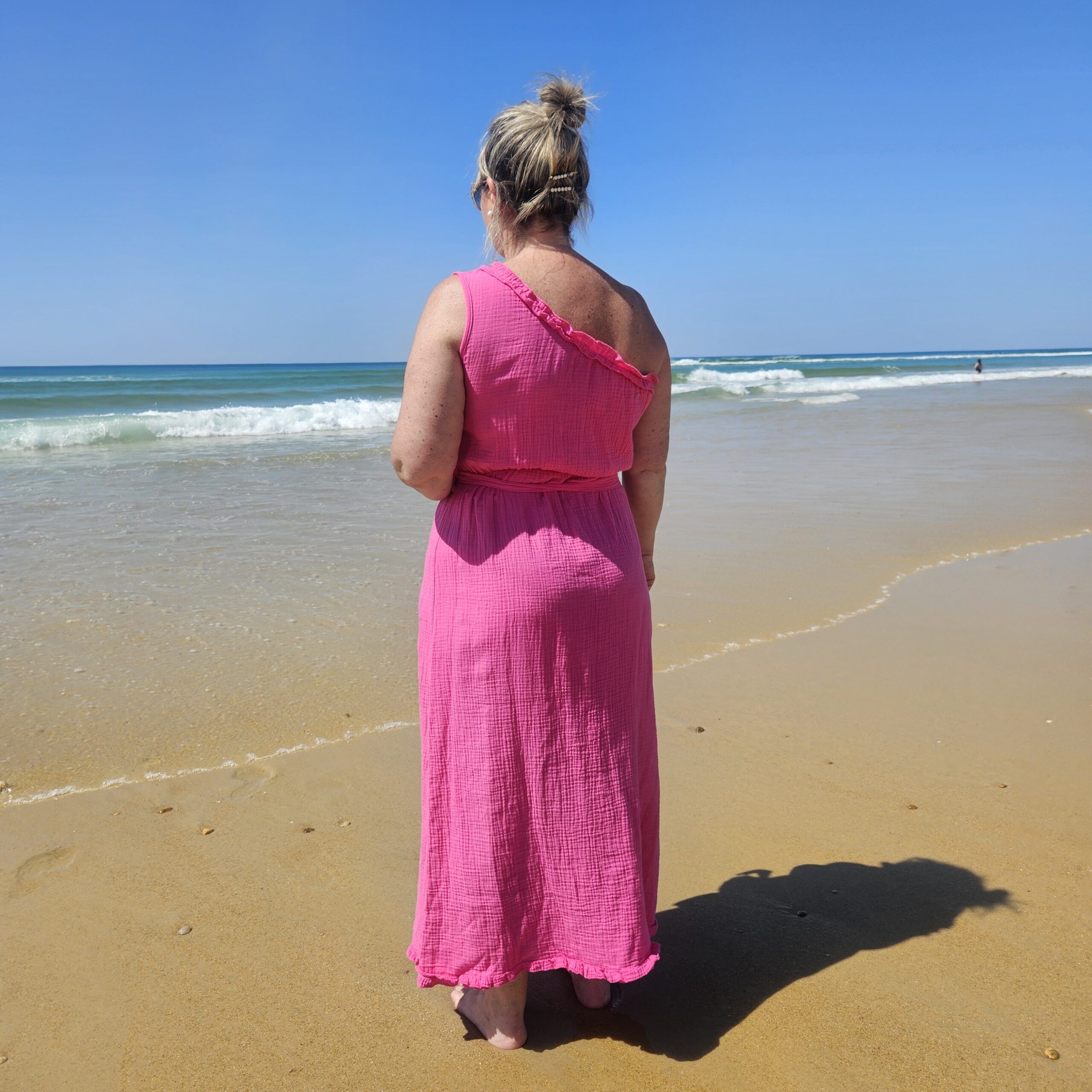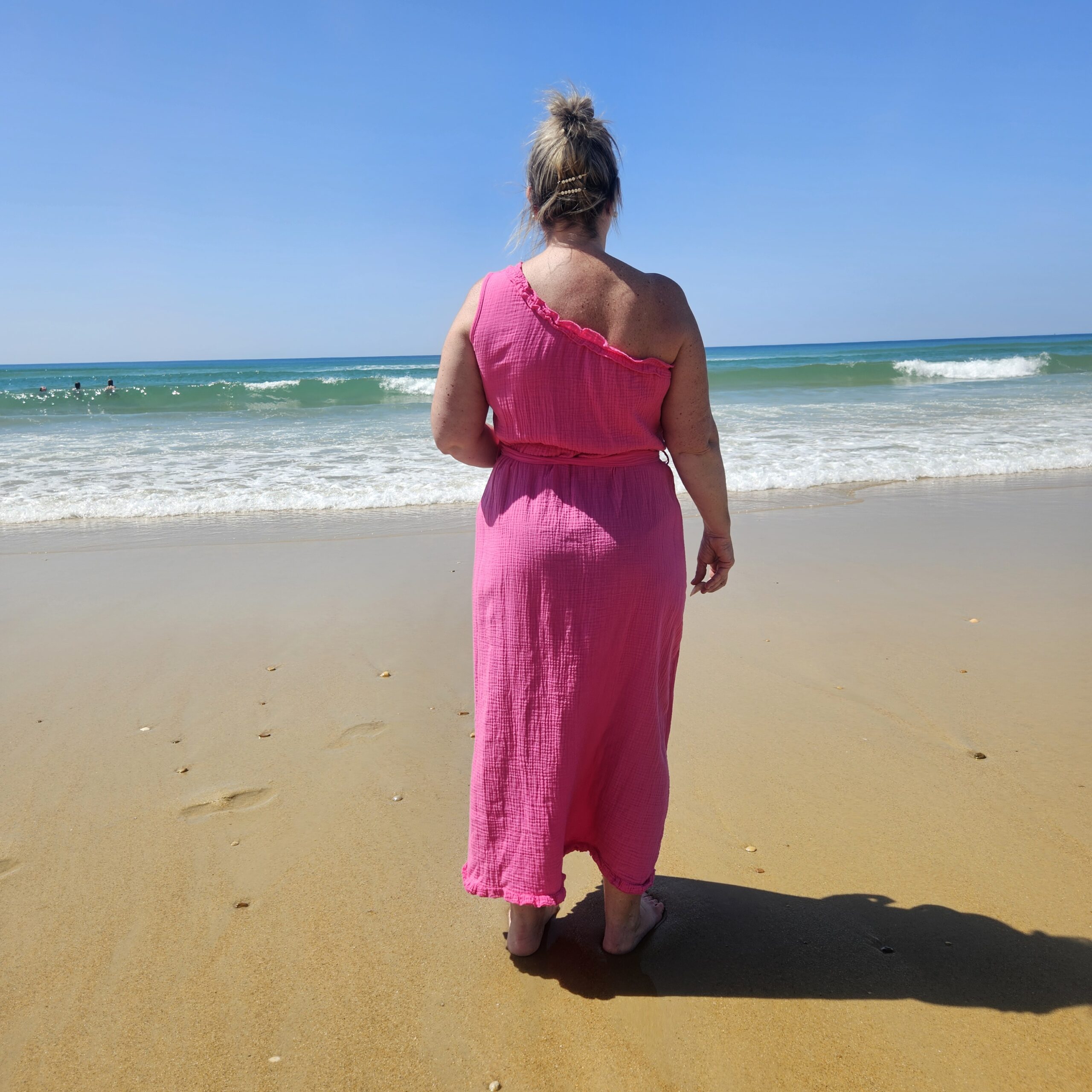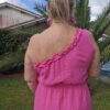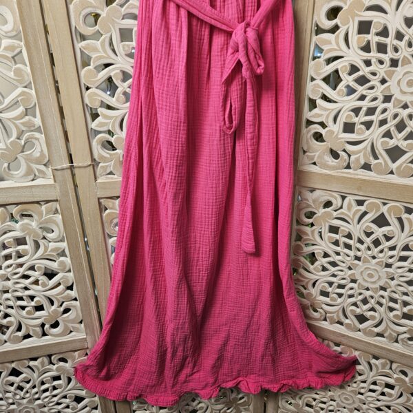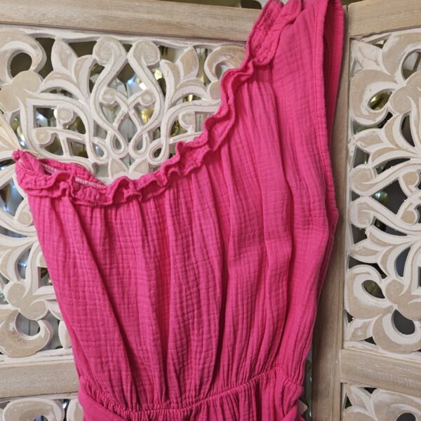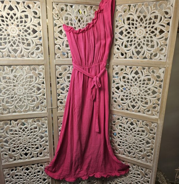 Robe bretelles asymétriques en gaze de coton, élastique autour de la poitrine avec volant, coupe droite, volant au bas de la robe, ceinture. Taille unique.