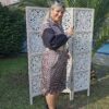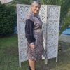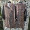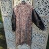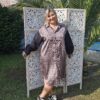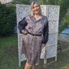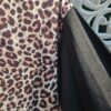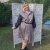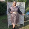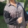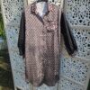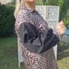 Robe chemise en satin, manches longues bouffantes noires en coton, sur le devant et le bout des manches, dessin noir sur fond taupe, col, poche et dos en léopard. Arrondit devant, fentes sur les côtés. Tissu satin fluide et léger. Peut se porter avec une ceinture. Il existe 2 tailles : 36/40 et 42/46.