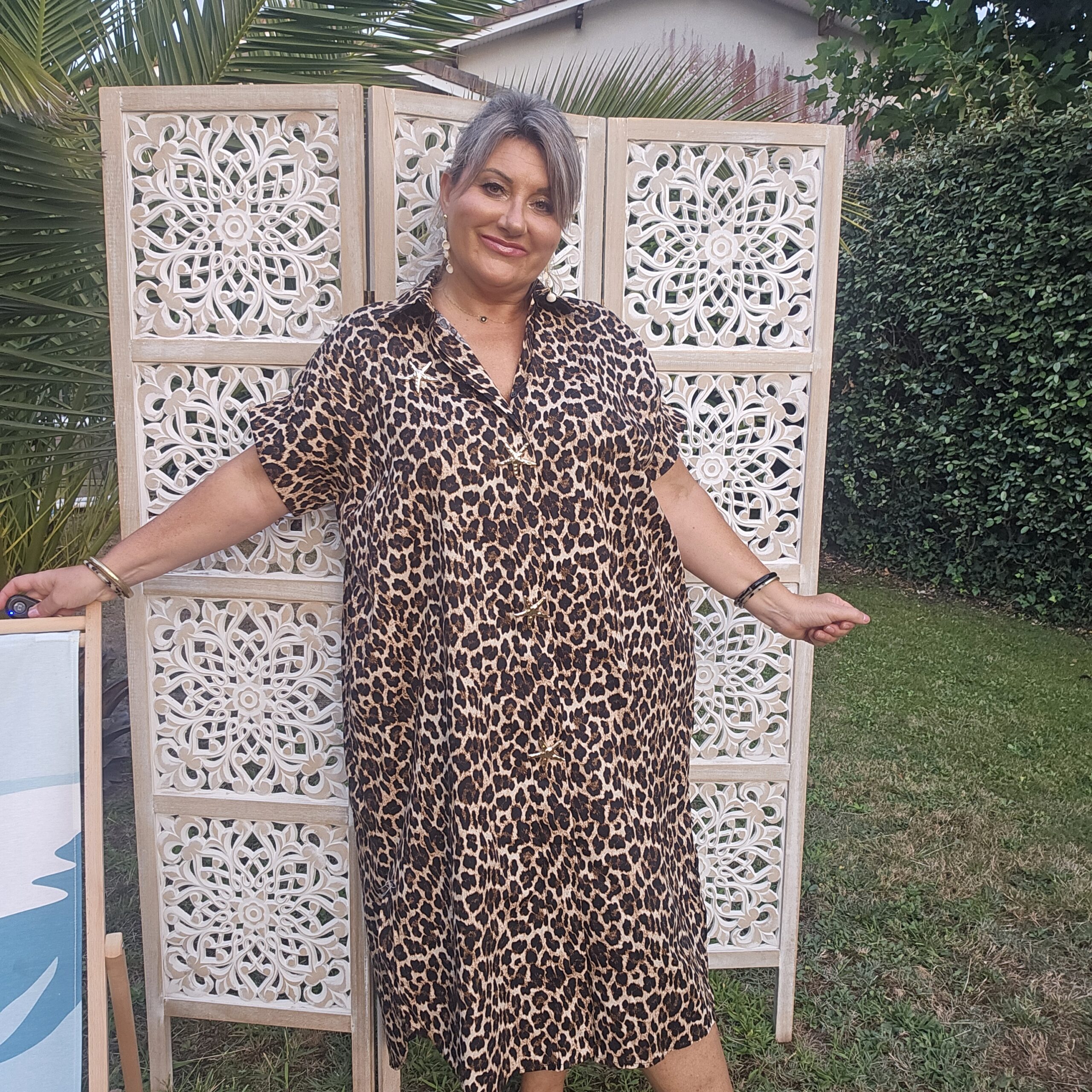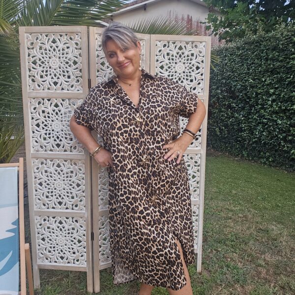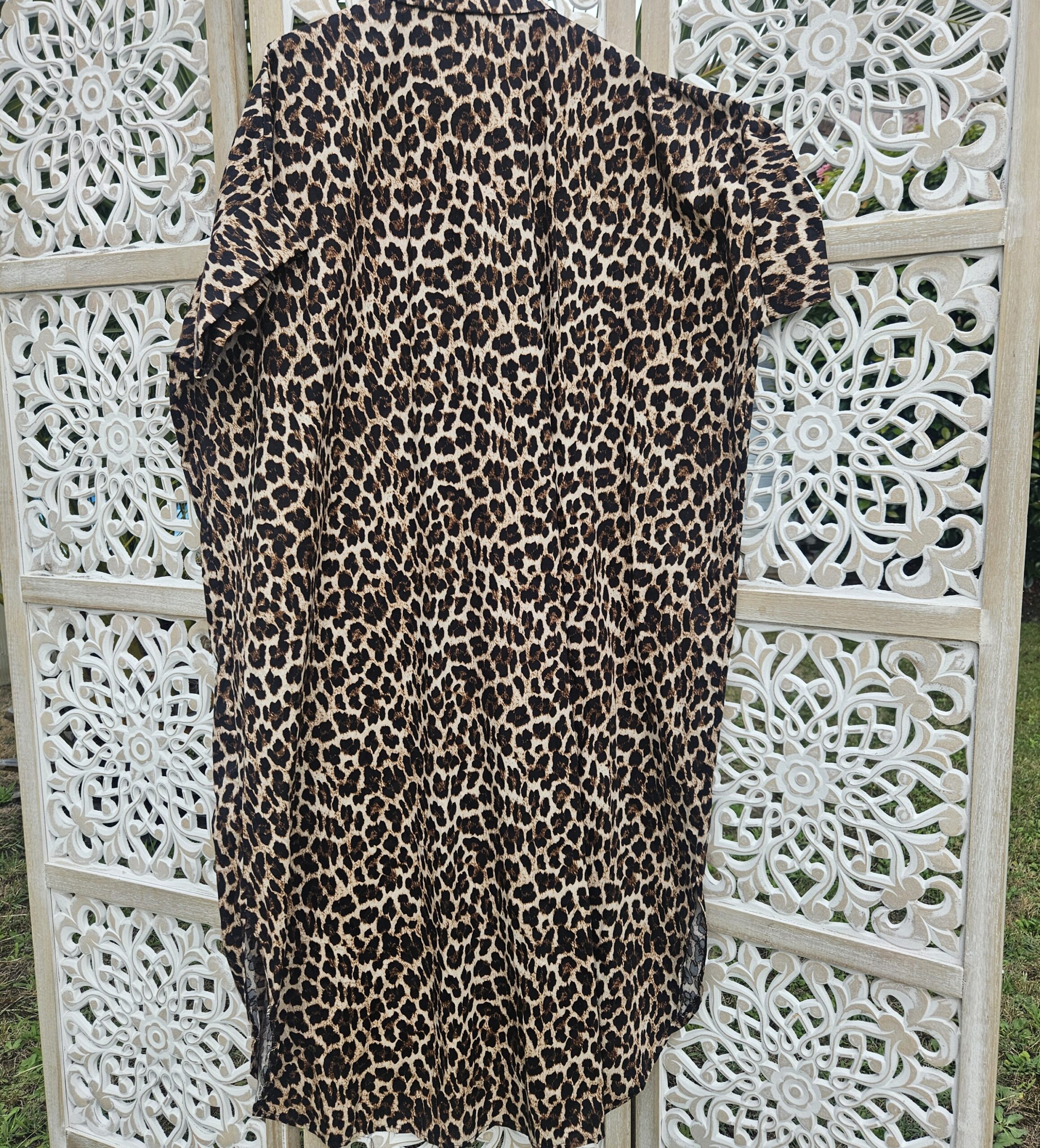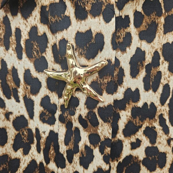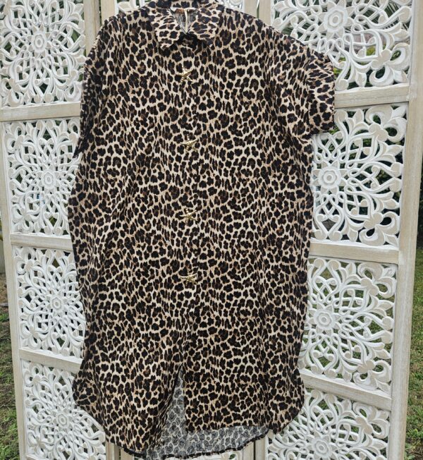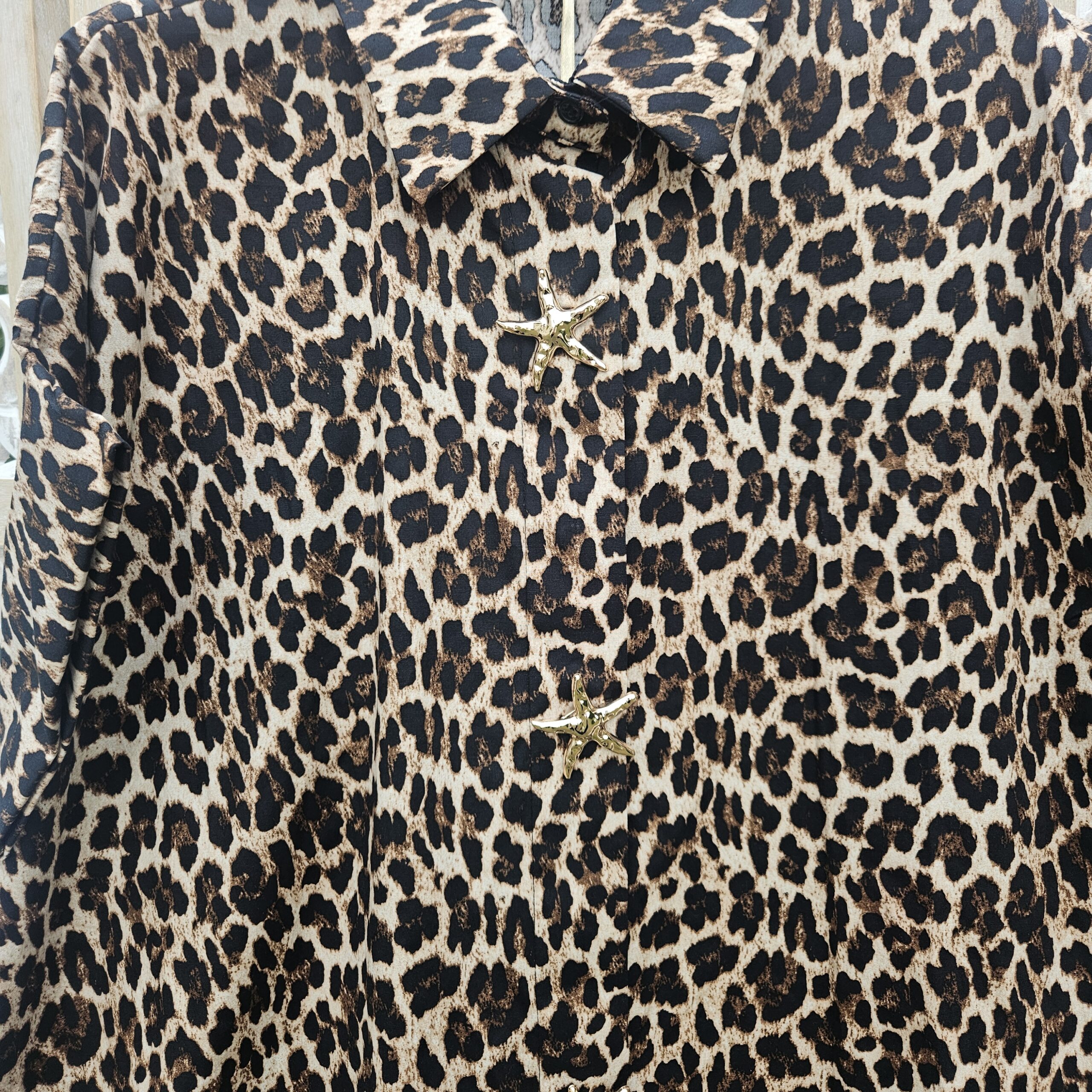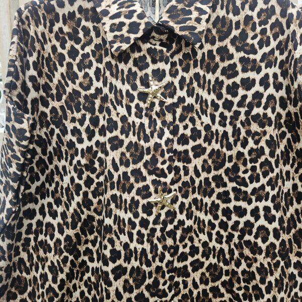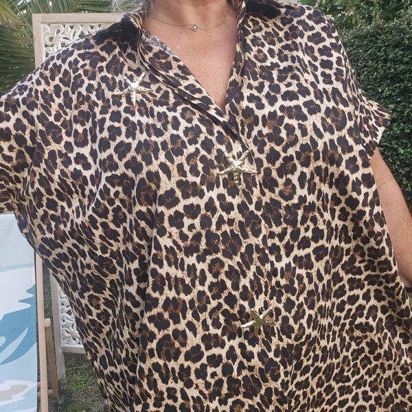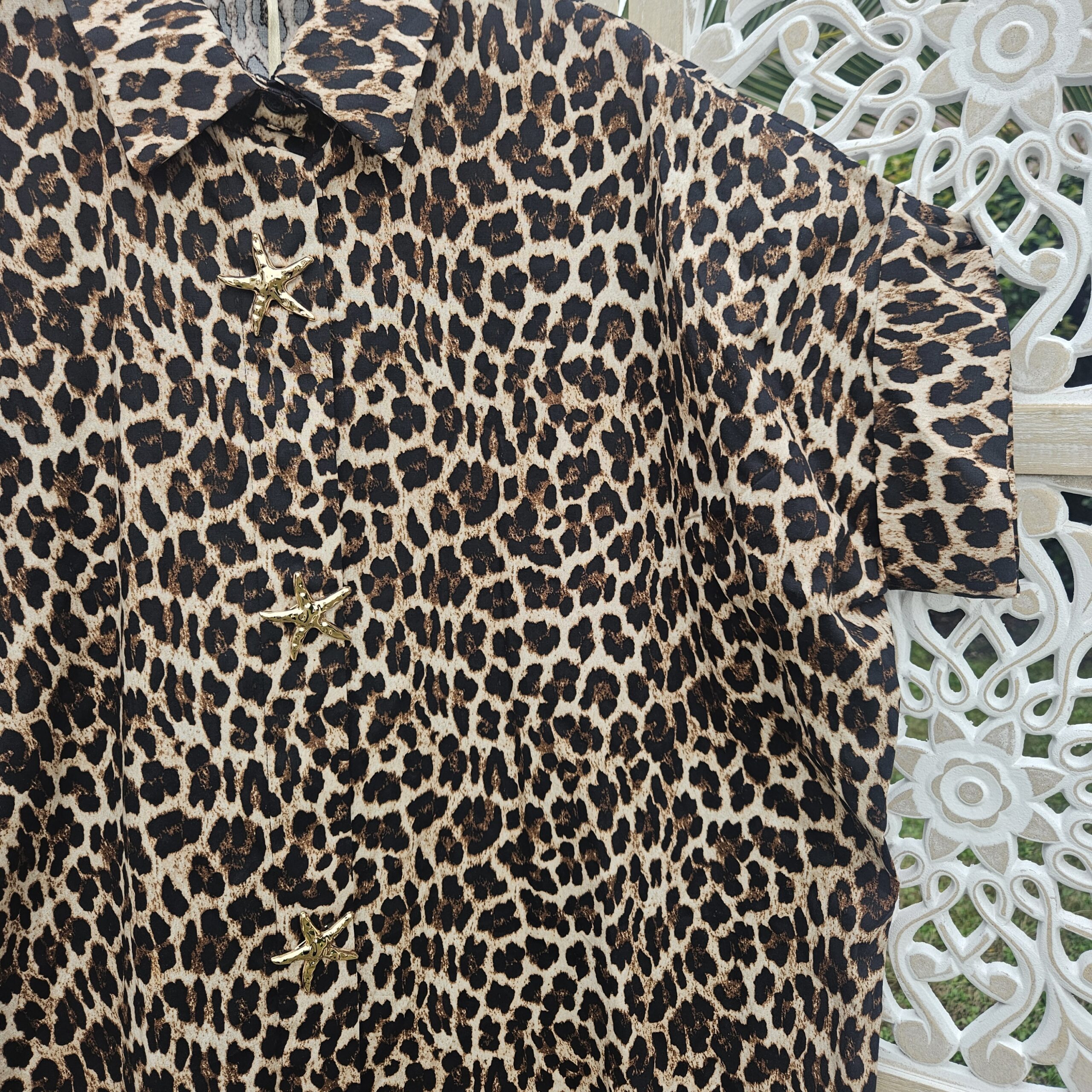 Robe chemise léopard, manches courtes avec revers, des boutons cachés par une patte et accessoirisés par des broches en forme d’étoiles de mer. Arrondit devant et derrière, fentes sur les côtés. Plus longue derrière. Fluide et légère. Peut se porter avec une ceinture. TU