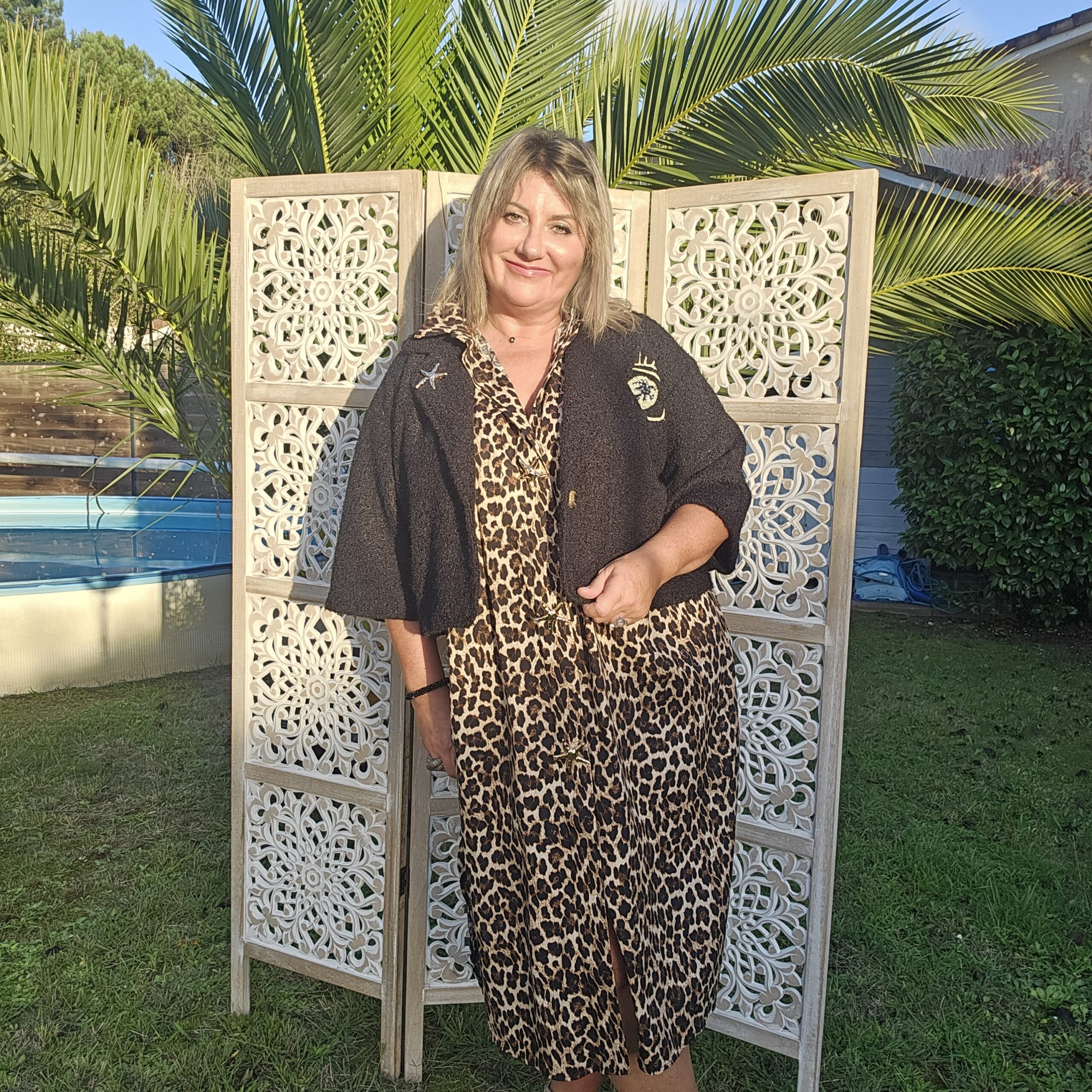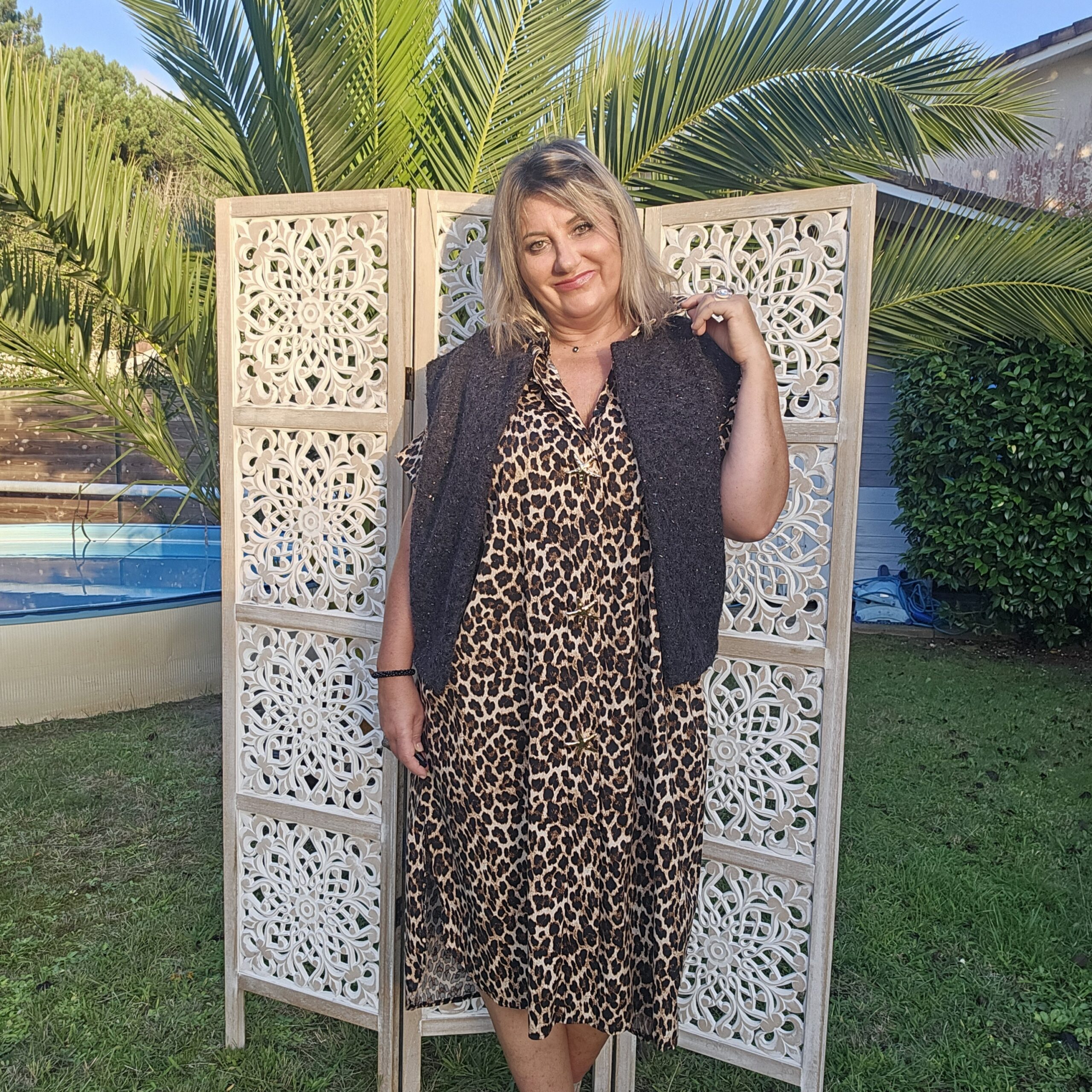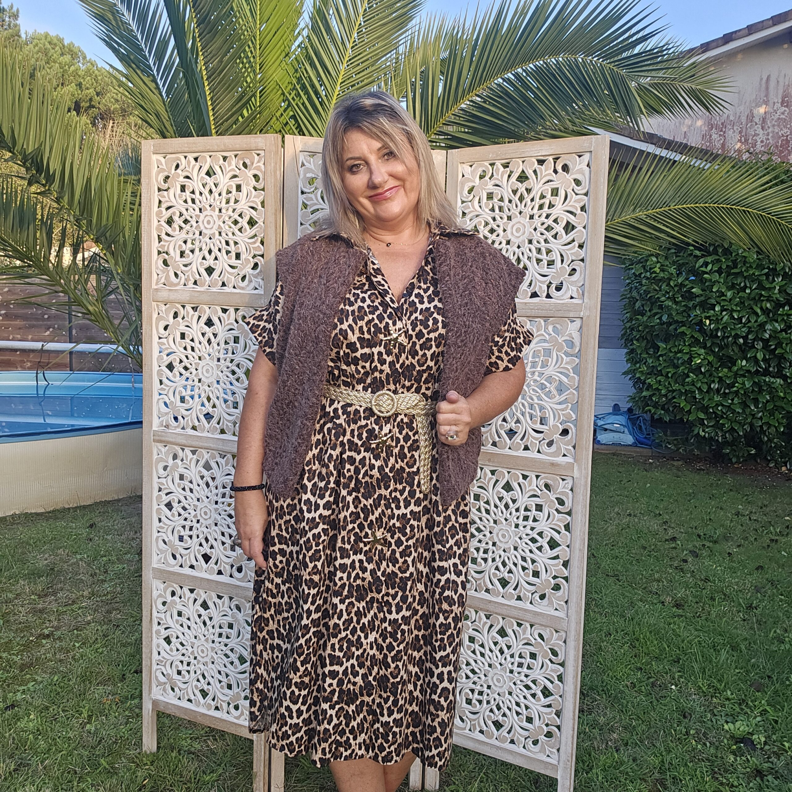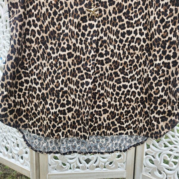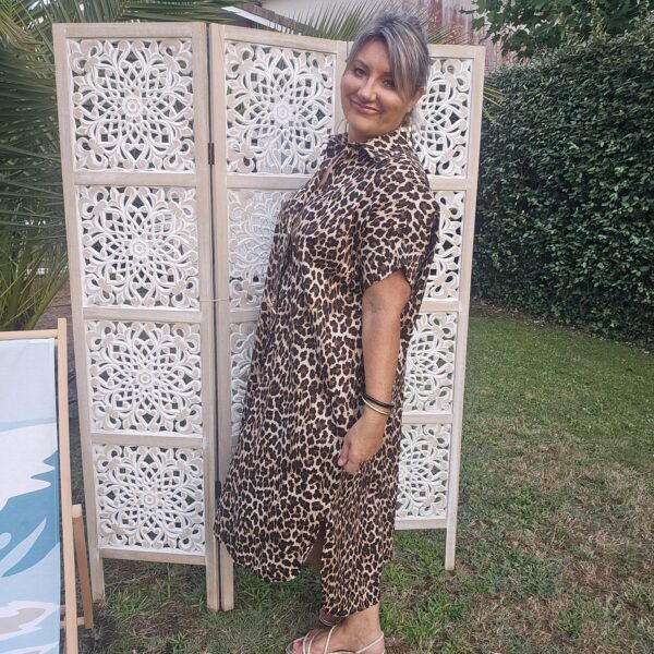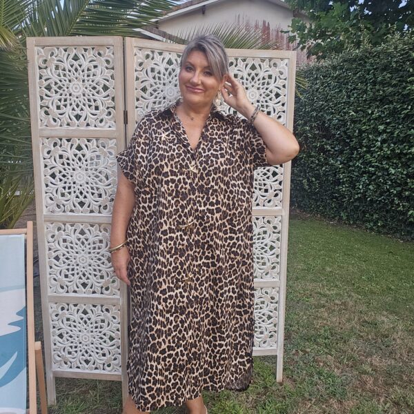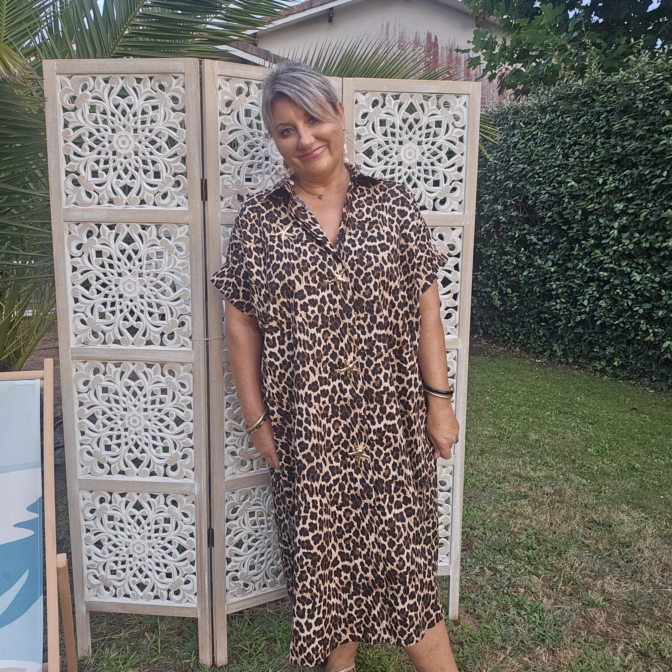 Robe chemise léopard, manches courtes avec revers, des boutons cachés par une patte et accessoirisés par des broches en forme d’étoiles de mer. Arrondit devant et derrière, fentes sur les côtés. Plus longue derrière. Fluide et légère. Peut se porter avec une ceinture. TU