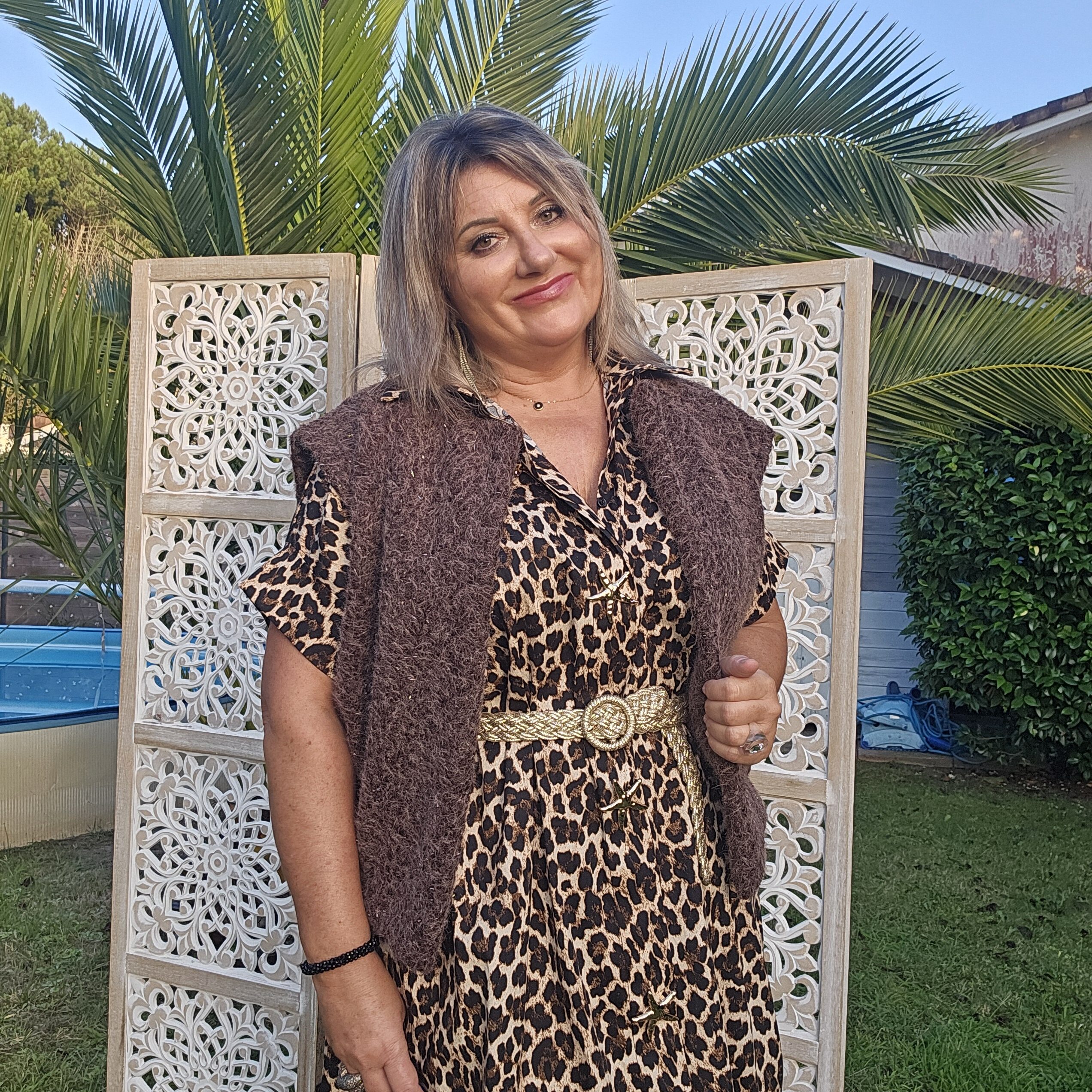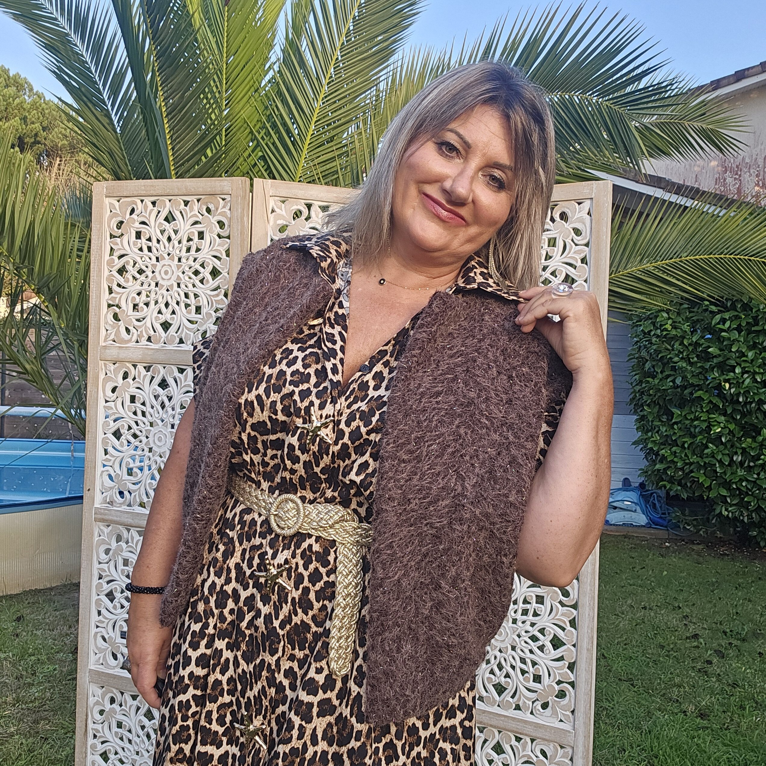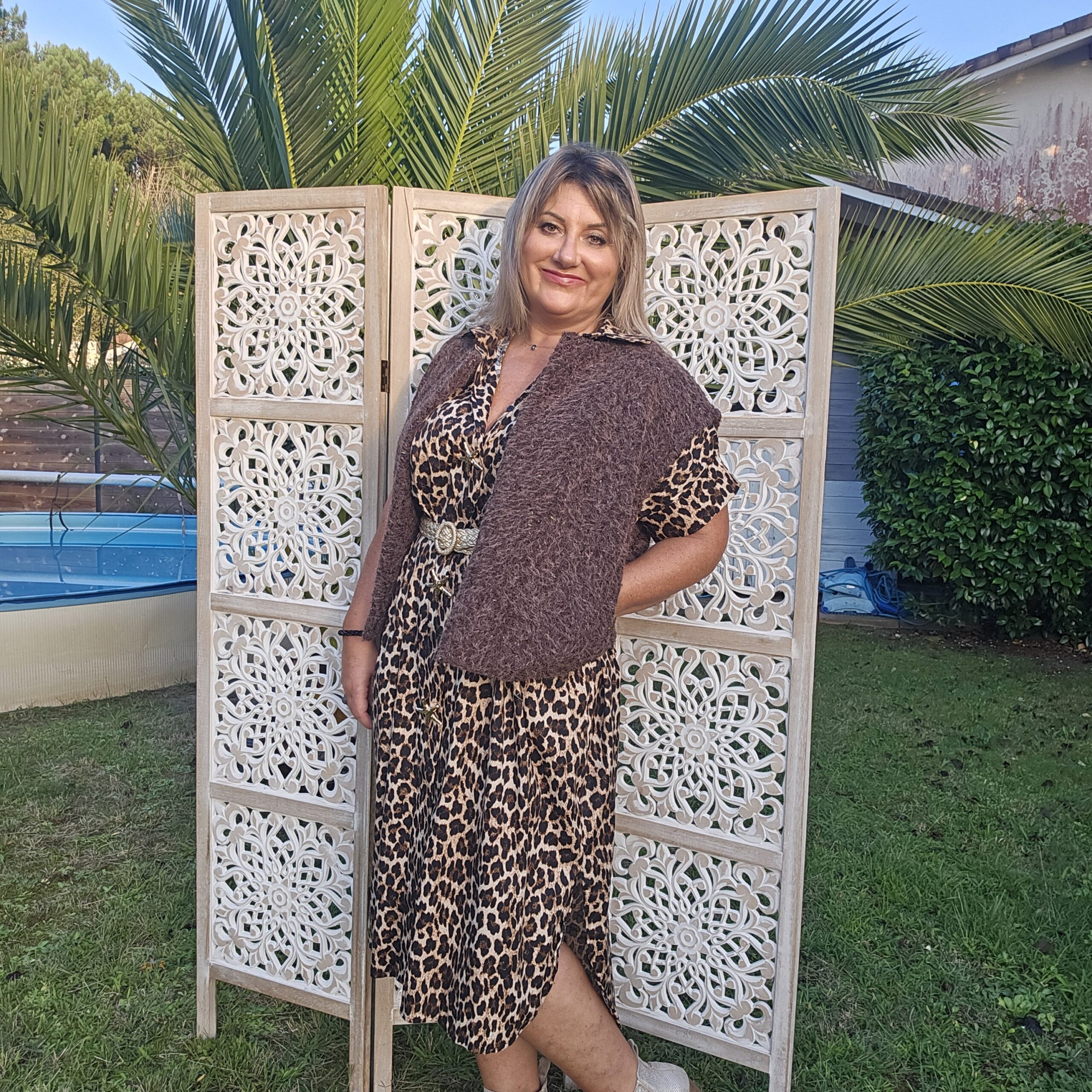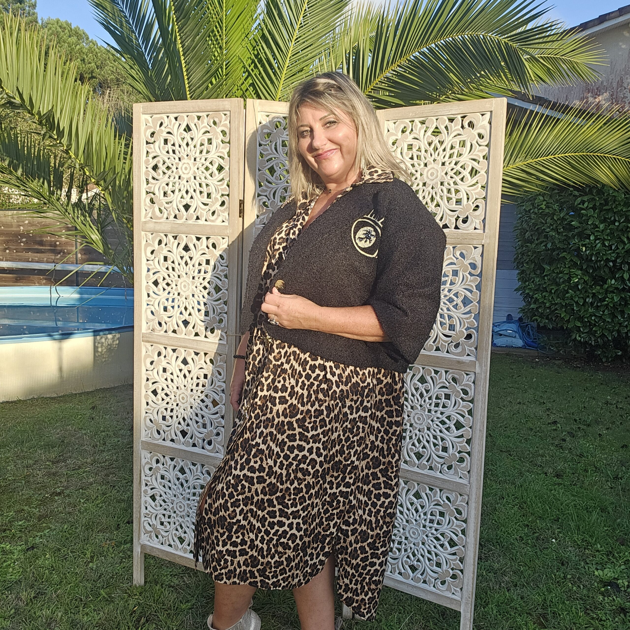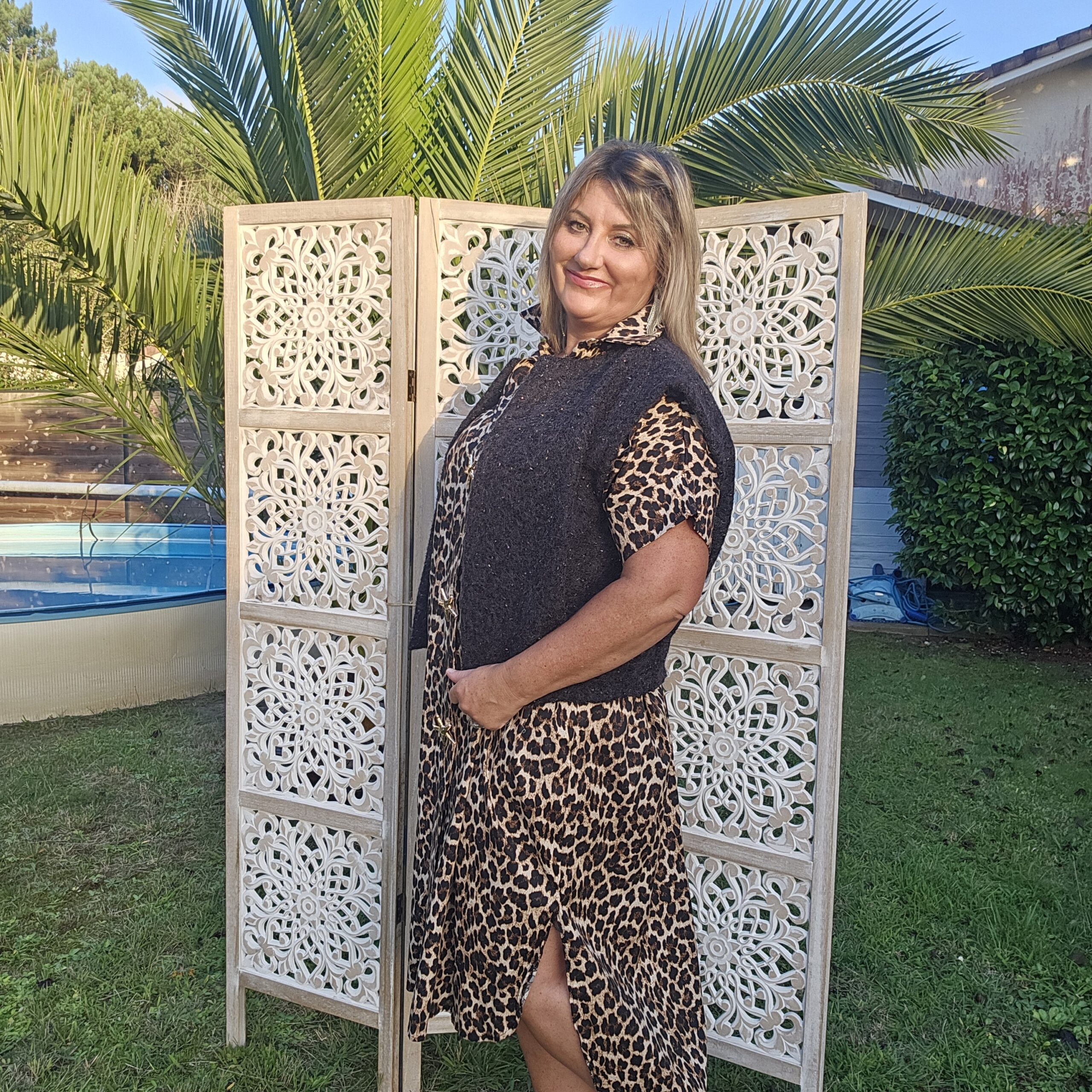Robe chemise léopard, manches courtes avec revers, des boutons cachés par une patte et accessoirisés par des broches en forme d’étoiles de mer. Arrondit devant et derrière, fentes sur les côtés. Plus longue derrière. Fluide et légère. Peut se porter avec une ceinture. TU