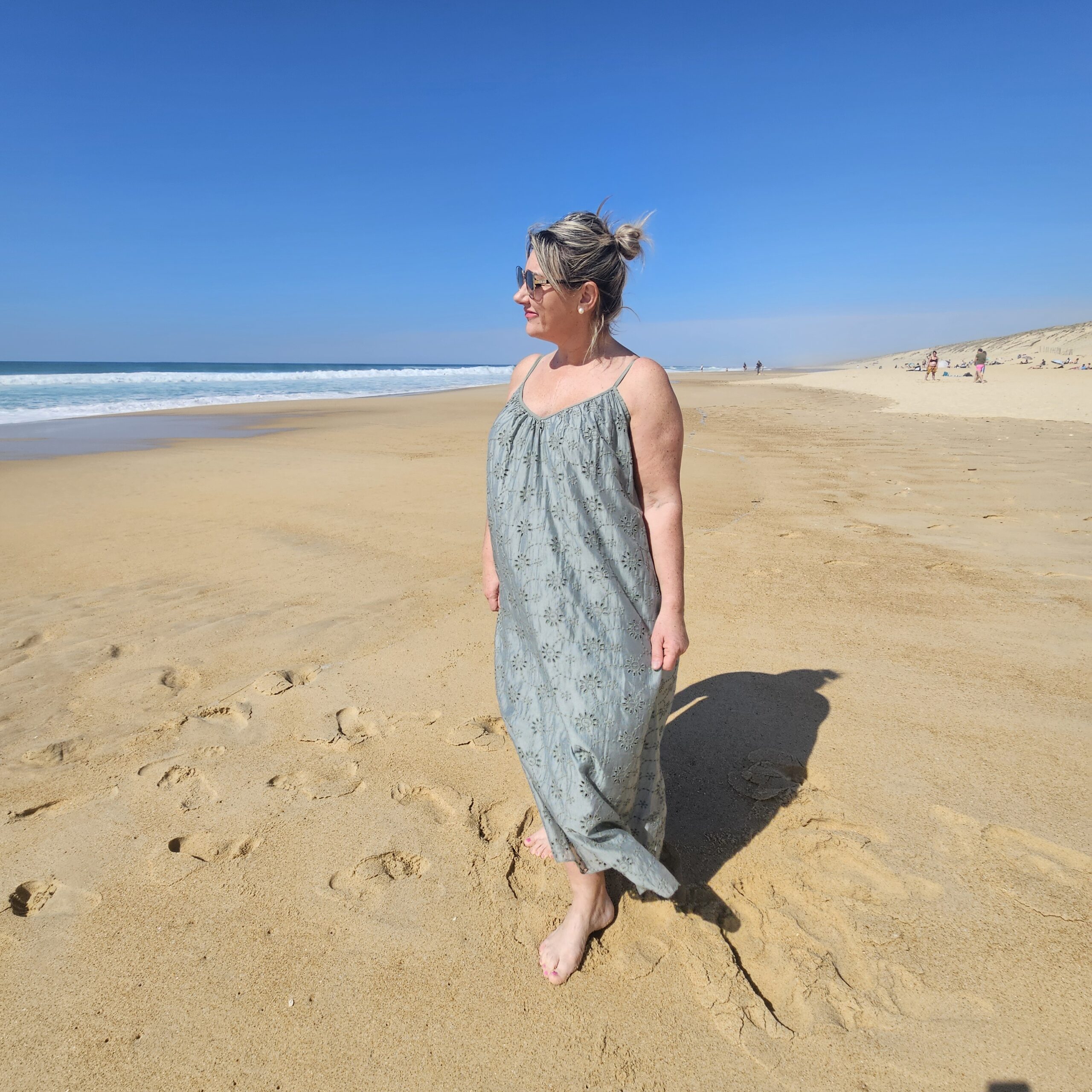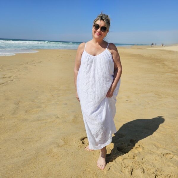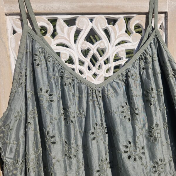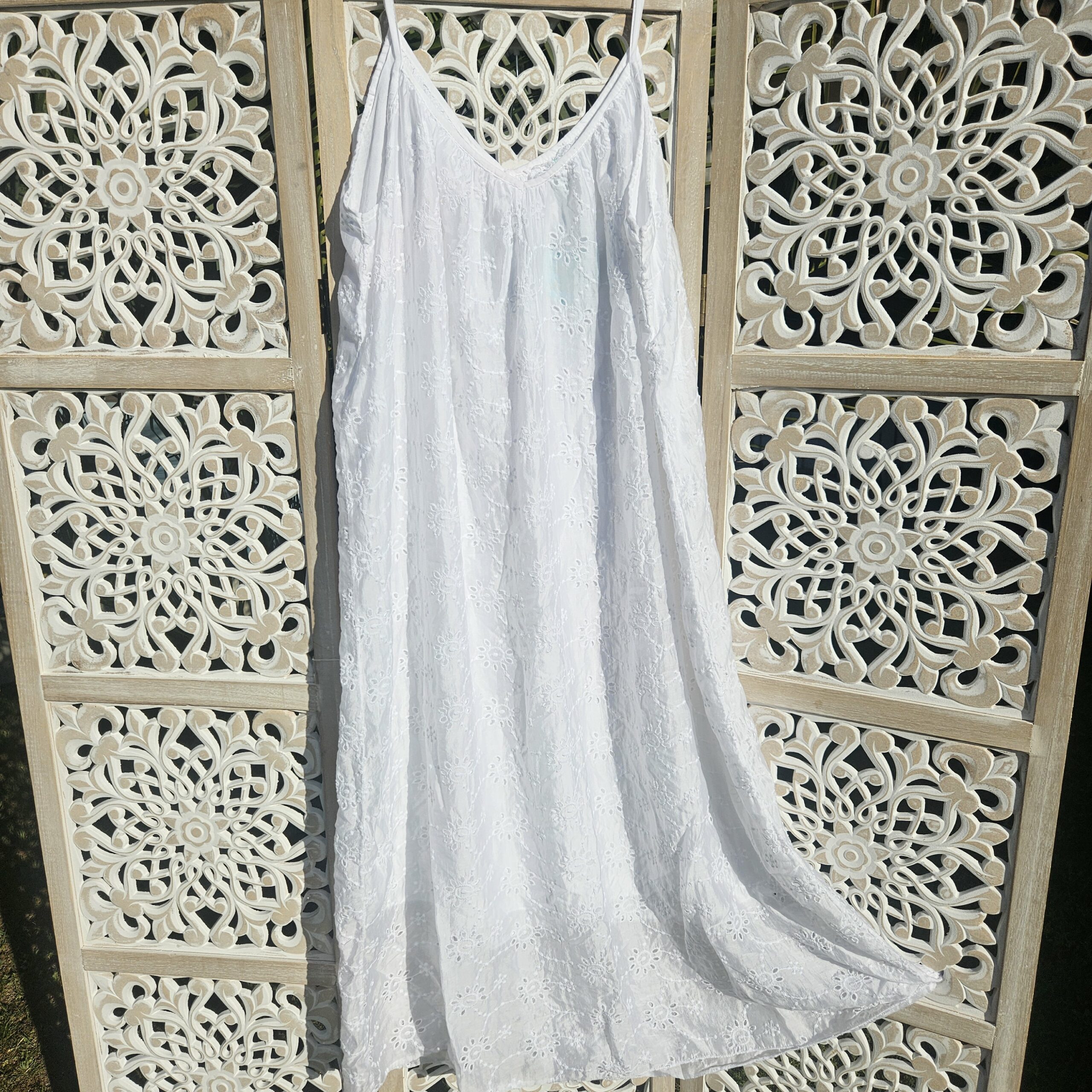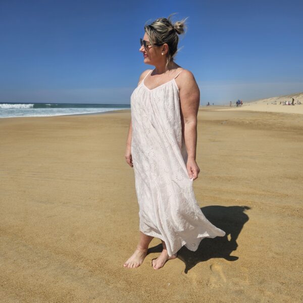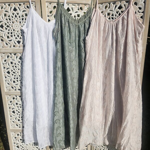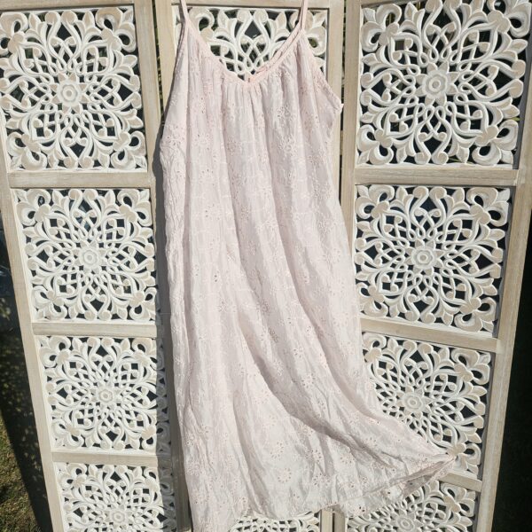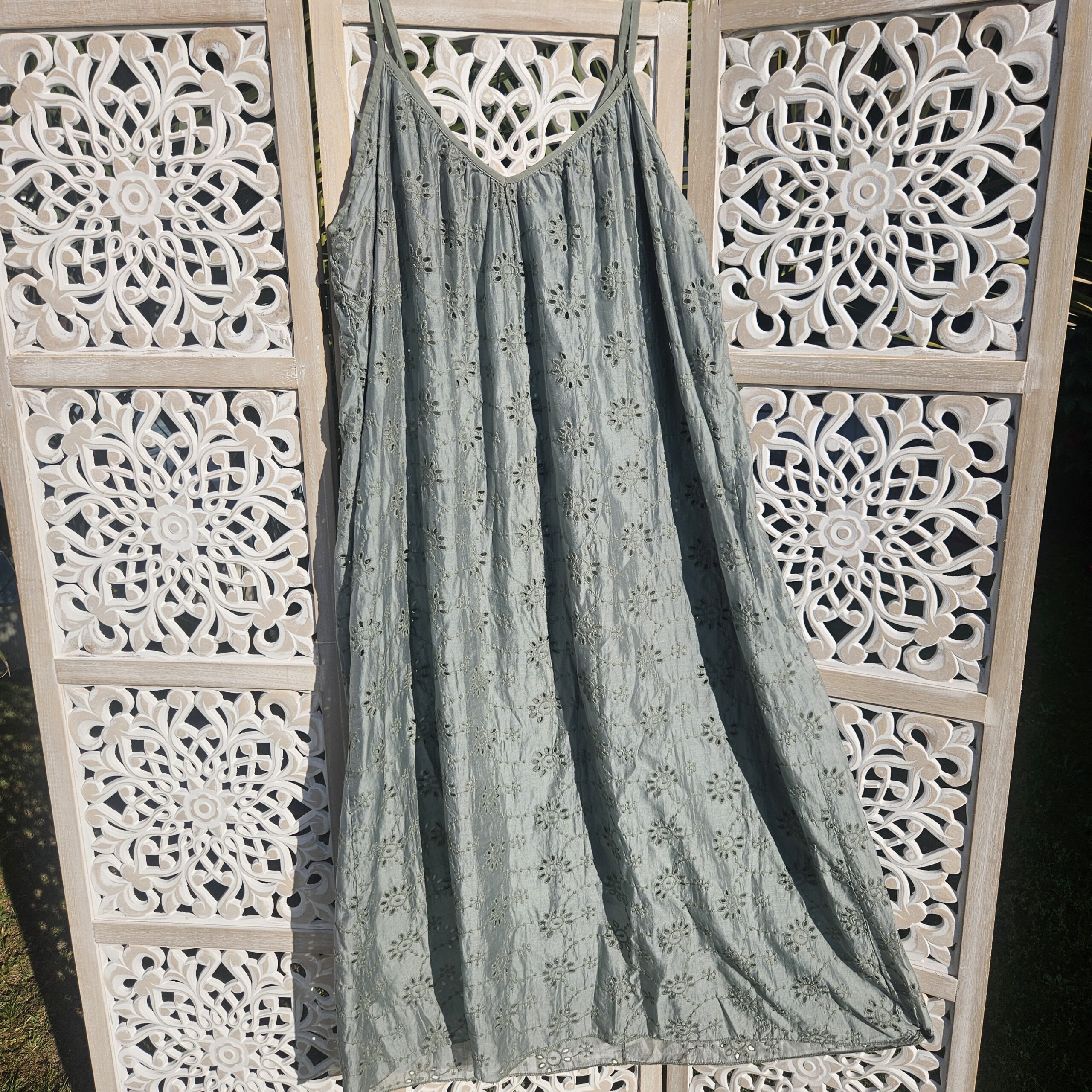 Robe longue en dentelle anglaise en soie et coton, petites bretelles, col V devant et derrière, doublée jusqu’à mi mollet. Robe légère et fluide. Existe en blanc, rose baby et kaki. Peut se porter avec une ceinture en cuir. TU.