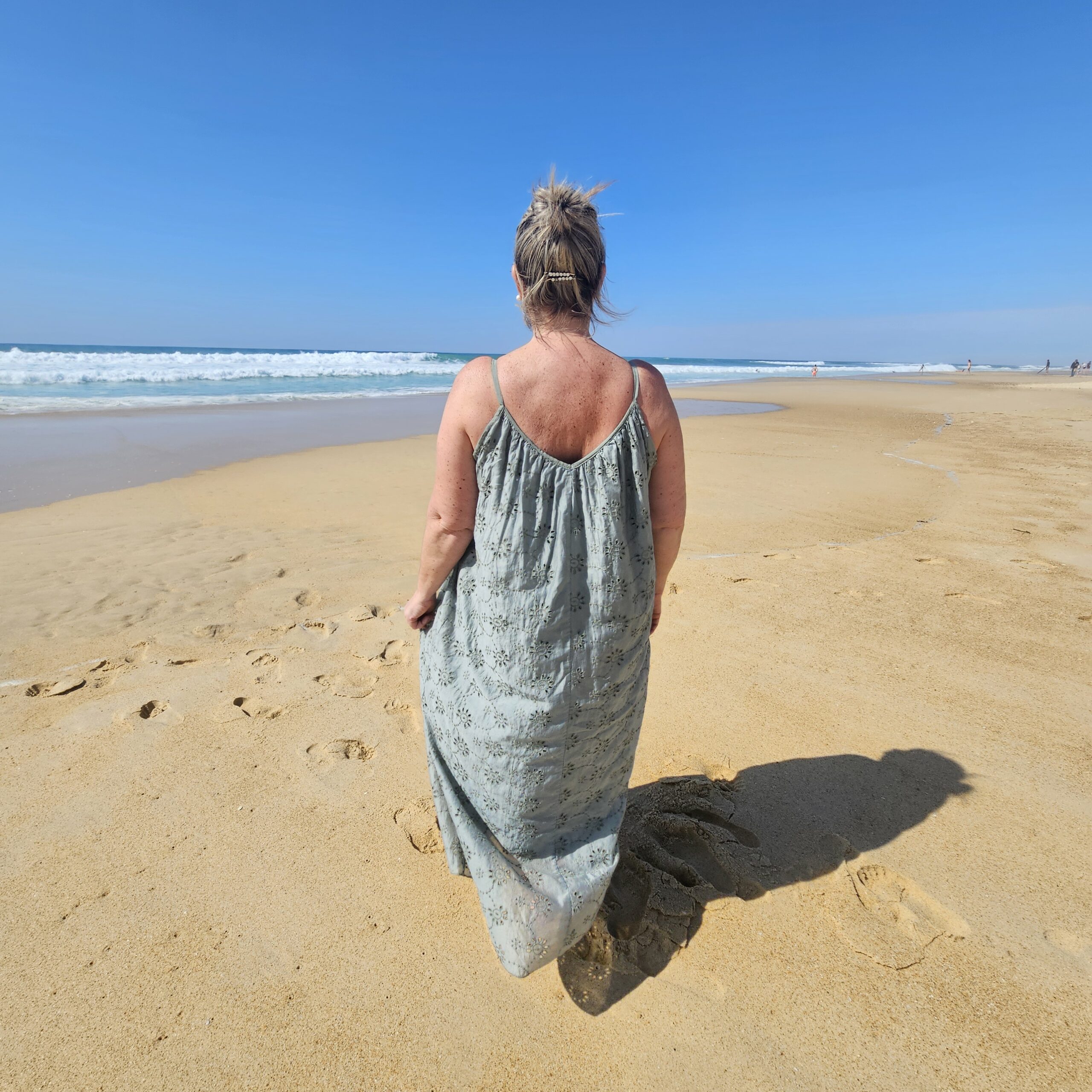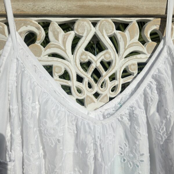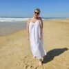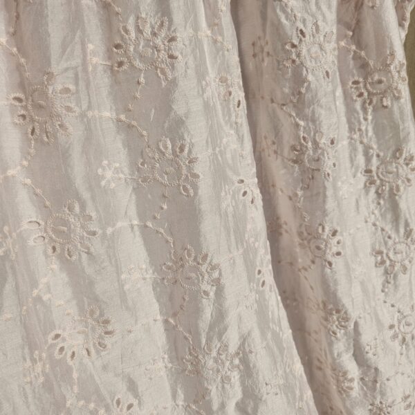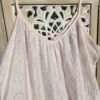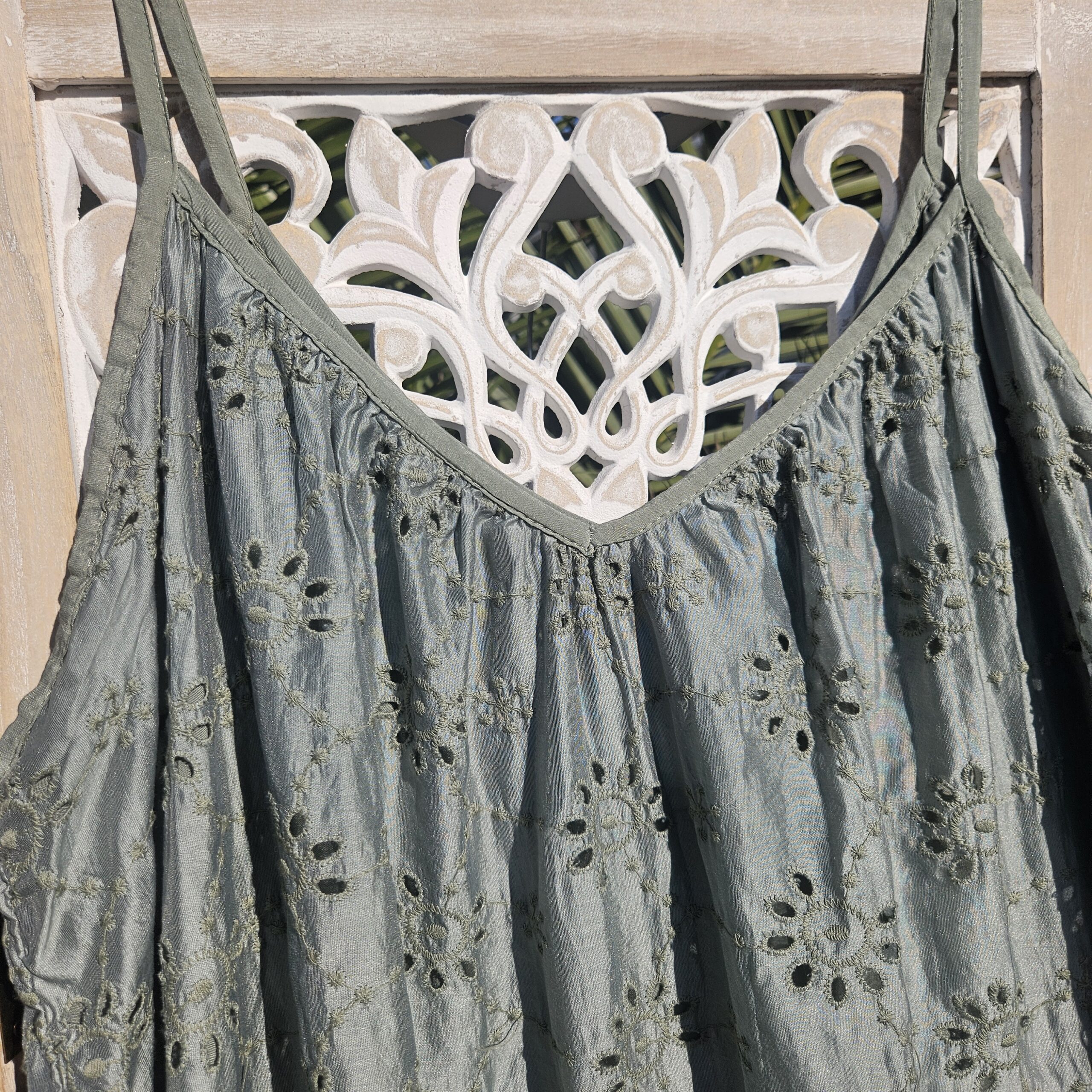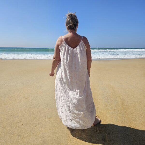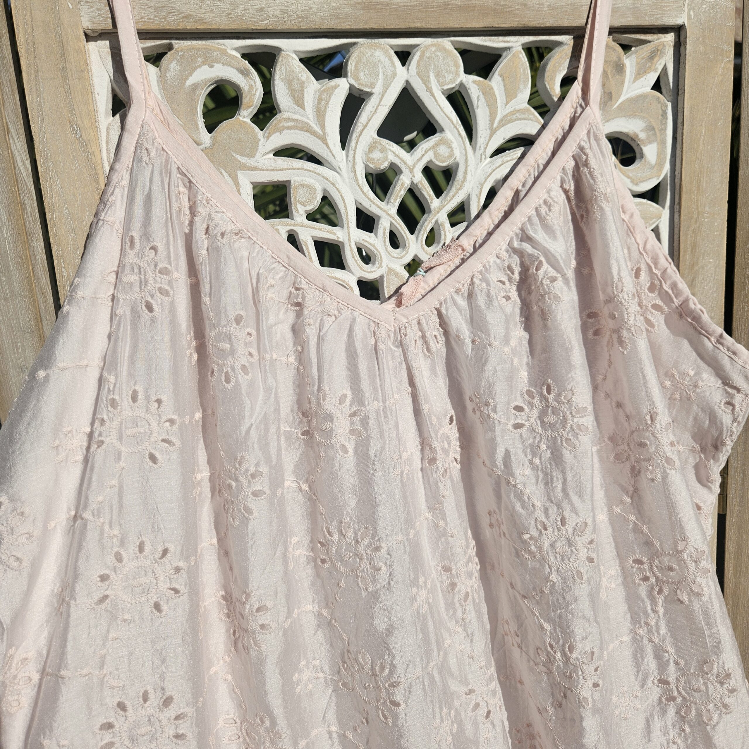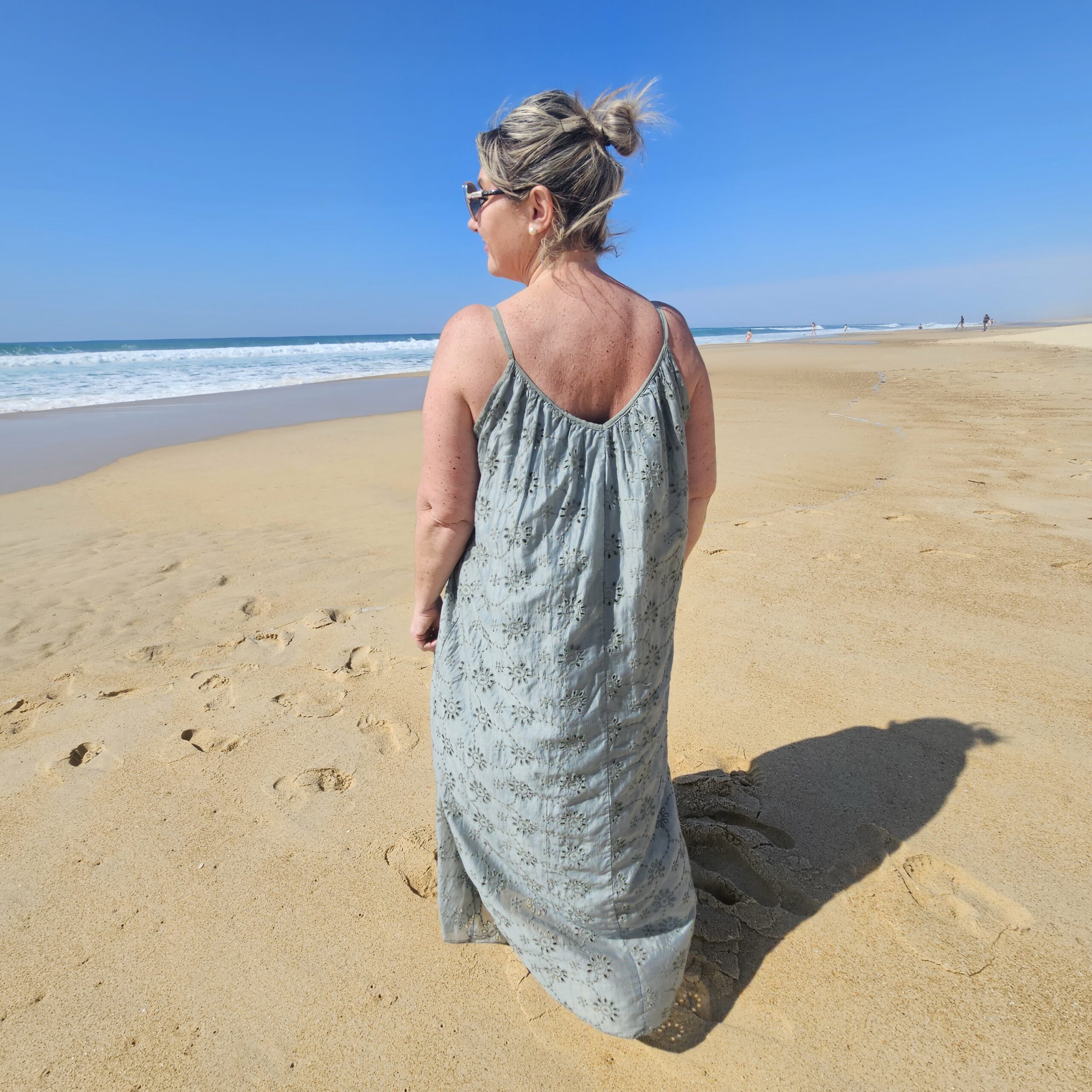 Robe longue en dentelle anglaise en soie et coton, petites bretelles, col V devant et derrière, doublée jusqu’à mi mollet. Robe légère et fluide. Existe en blanc, rose baby et kaki. Peut se porter avec une ceinture en cuir. TU.