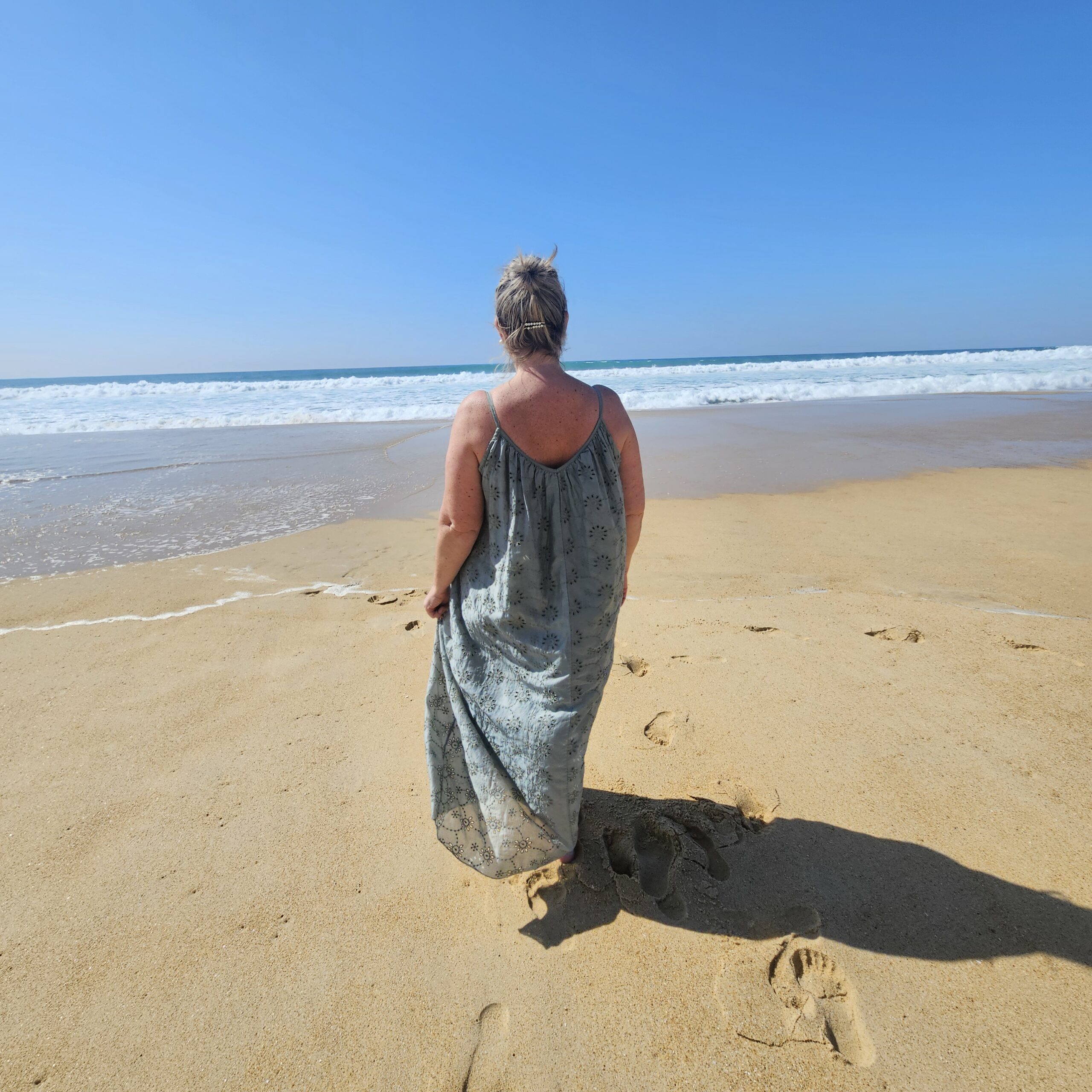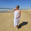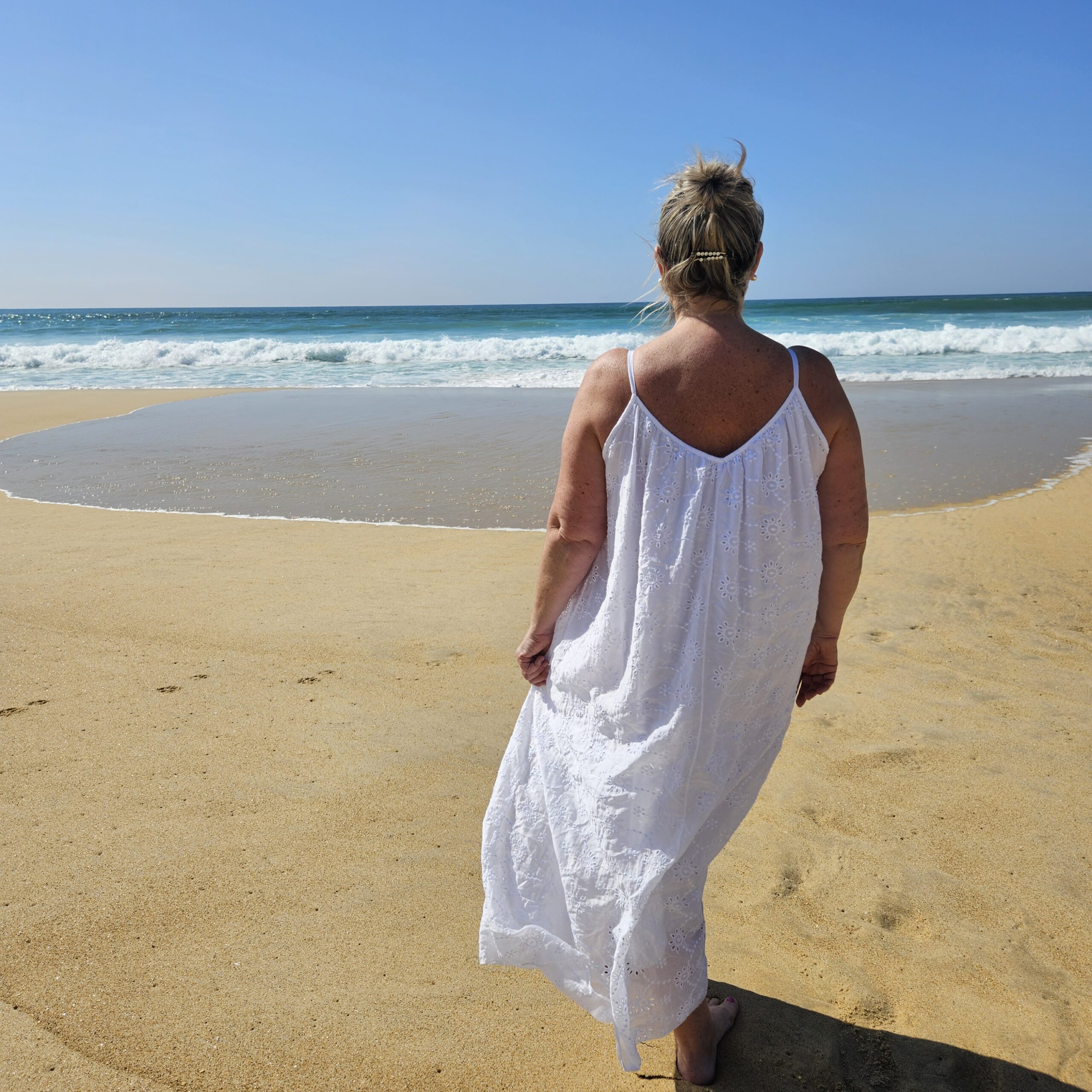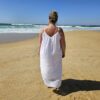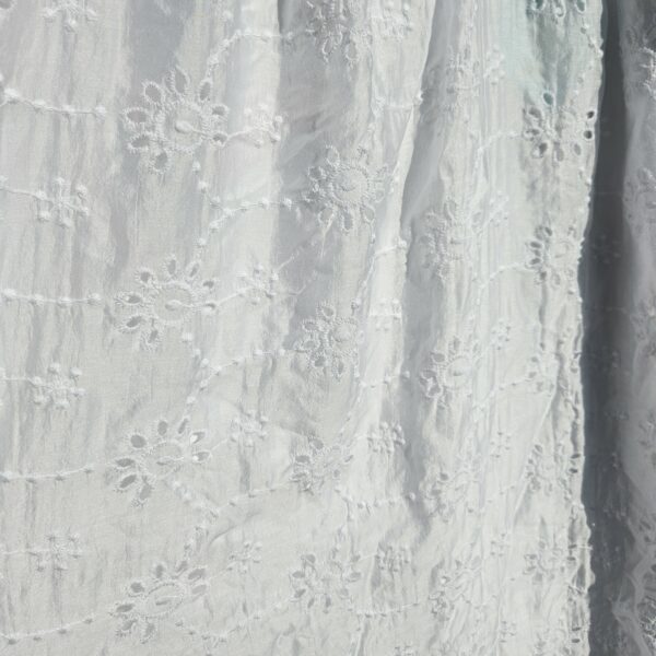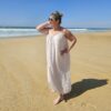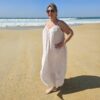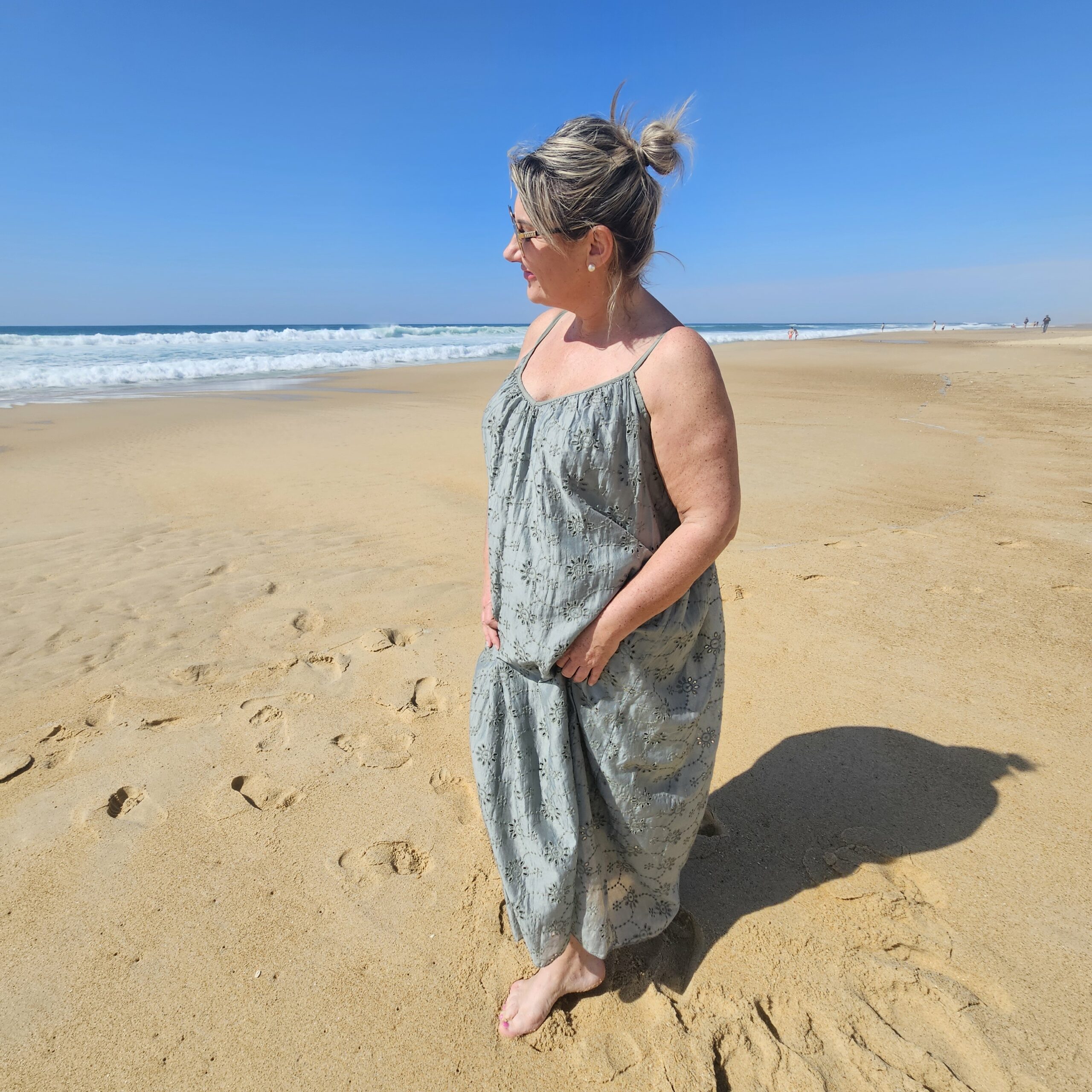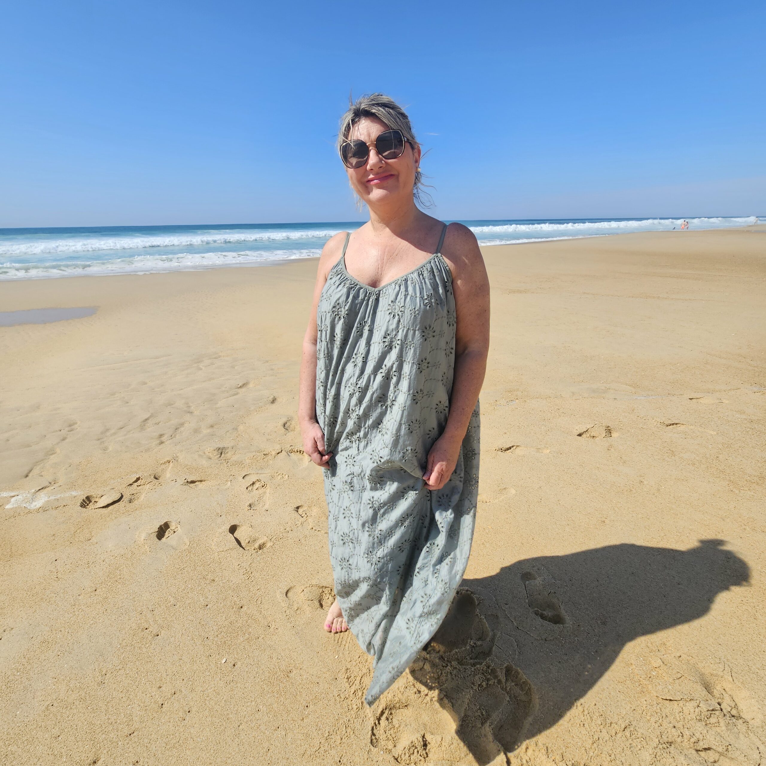 Robe longue en dentelle anglaise en soie et coton, petites bretelles, col V devant et derrière, doublée jusqu’à mi mollet. Robe légère et fluide. Existe en blanc, rose baby et kaki. Peut se porter avec une ceinture en cuir. TU.