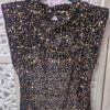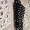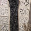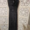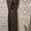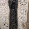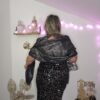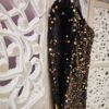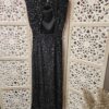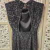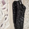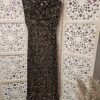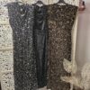Robe longue en velours couvertes de sequins, épaulettes, col légèrement tombant, fermeture par 2 boutons à l’arrière de la nuque dévoilant un dos nu en forme de triangle. Double doublure au niveau du buste afin de maintenir la poitrine, et simple doublure pour le reste de la robe. Les sequins ne sont pas à même la peau, donc ne pique pas. Existe en noir, argenté et doré. TU.