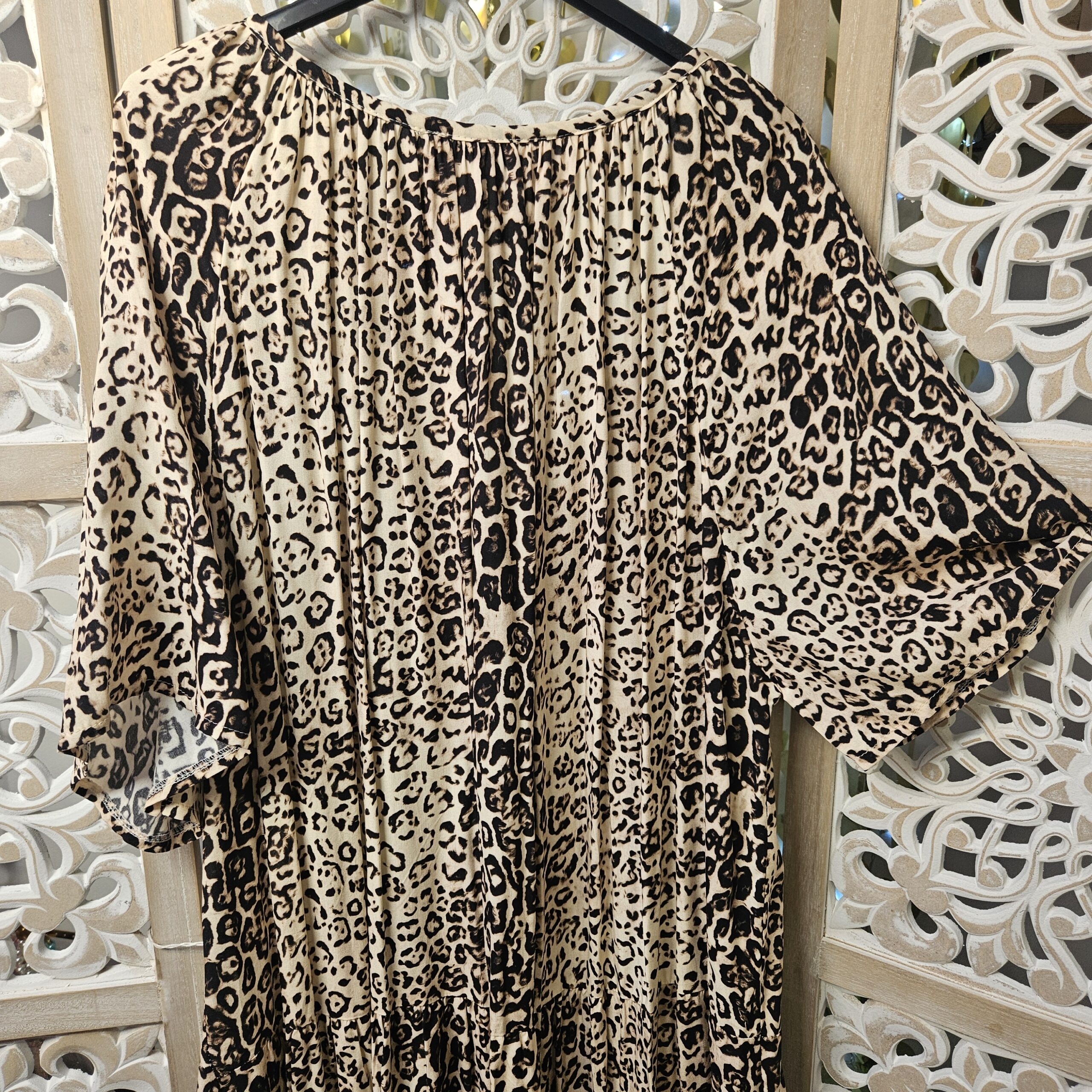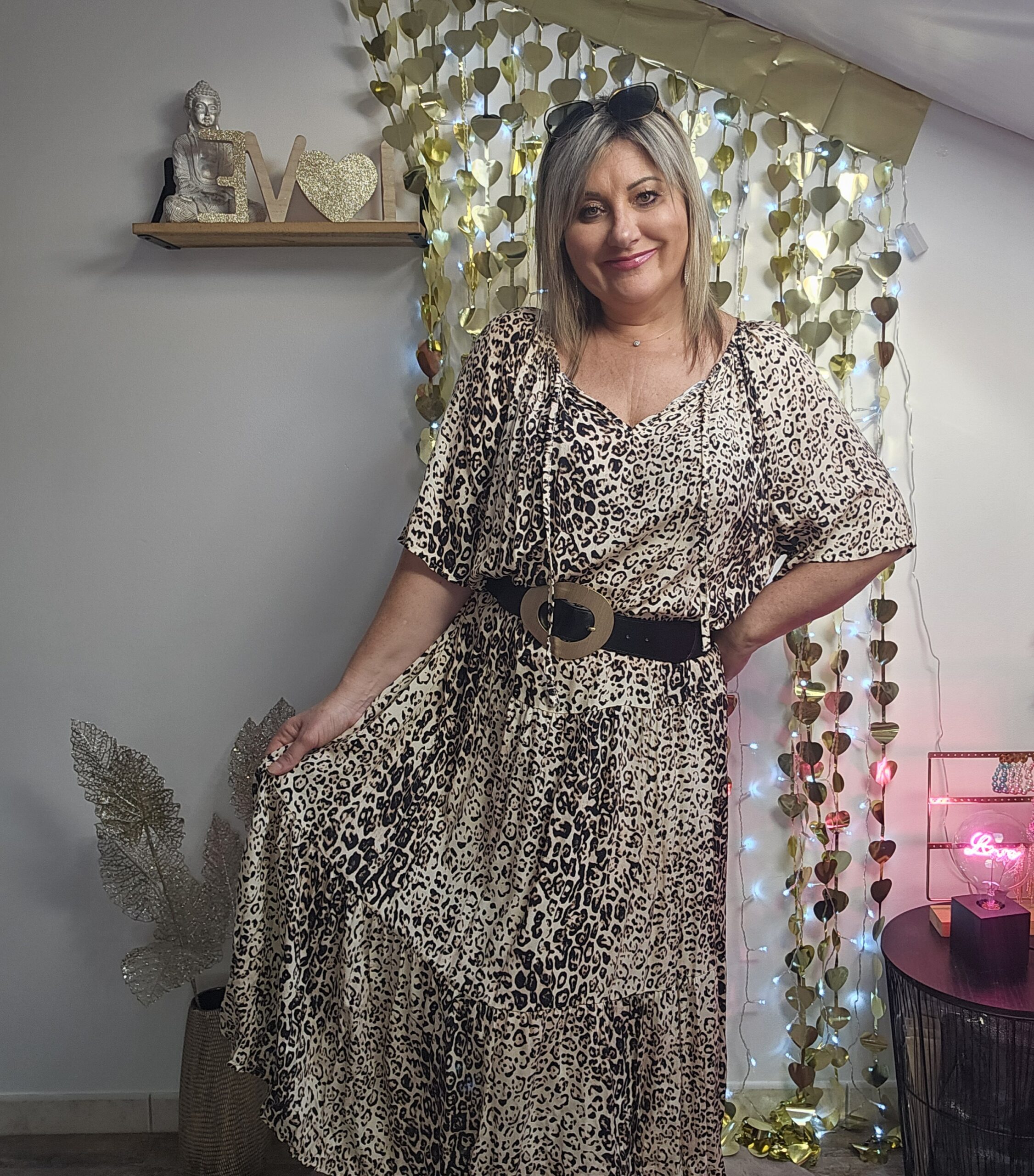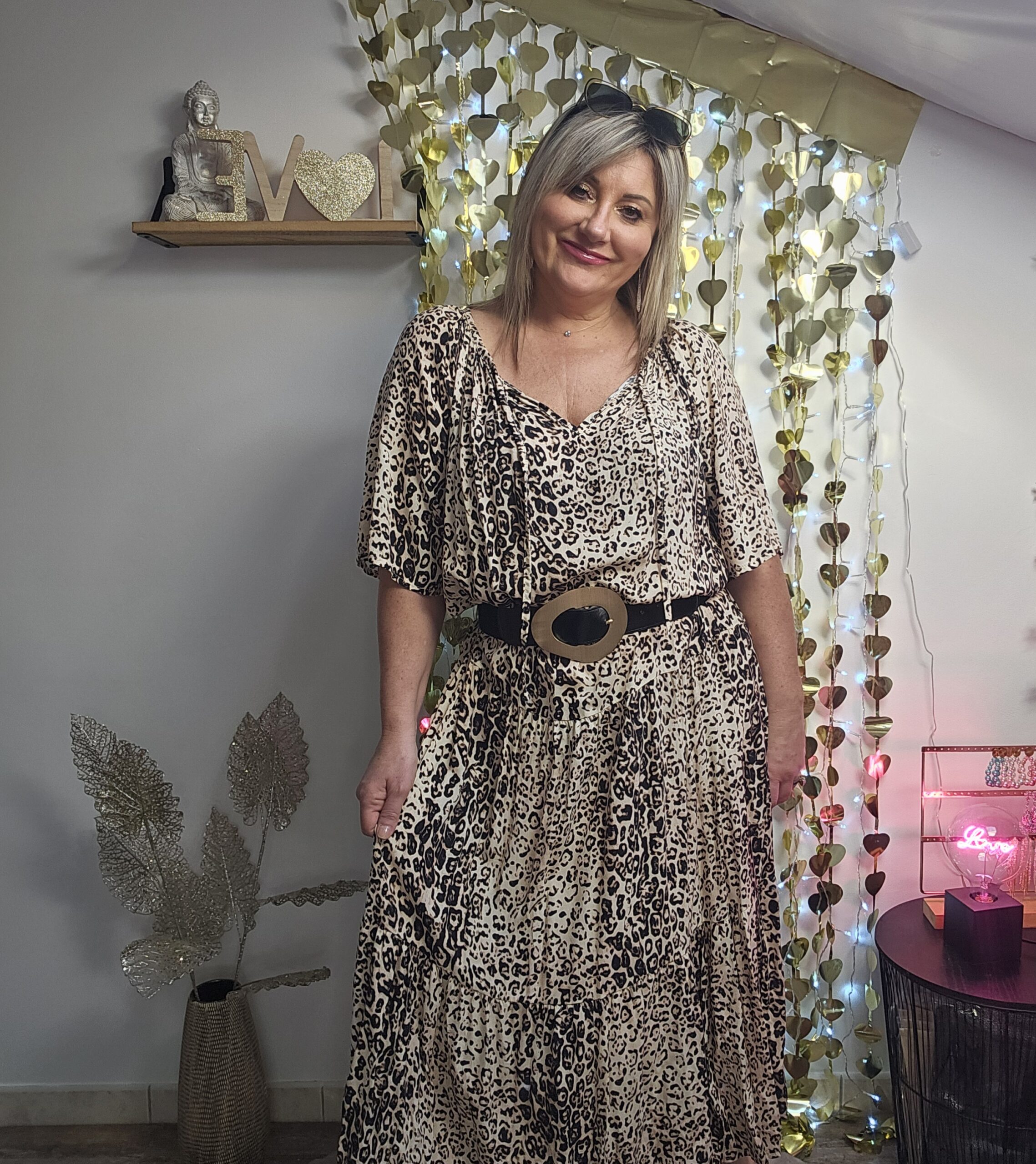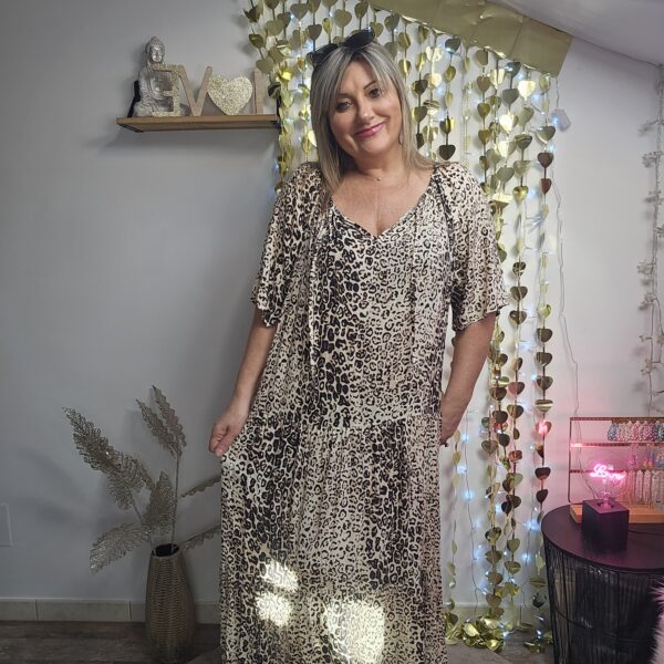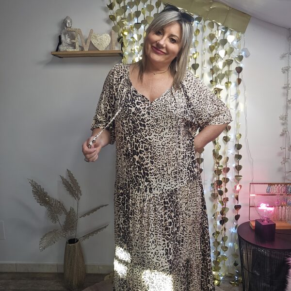 Robe longue léopard oversize, manches larges avec noeud sur le devant à fermer ou pas. A ceinturer selon votre convenance.