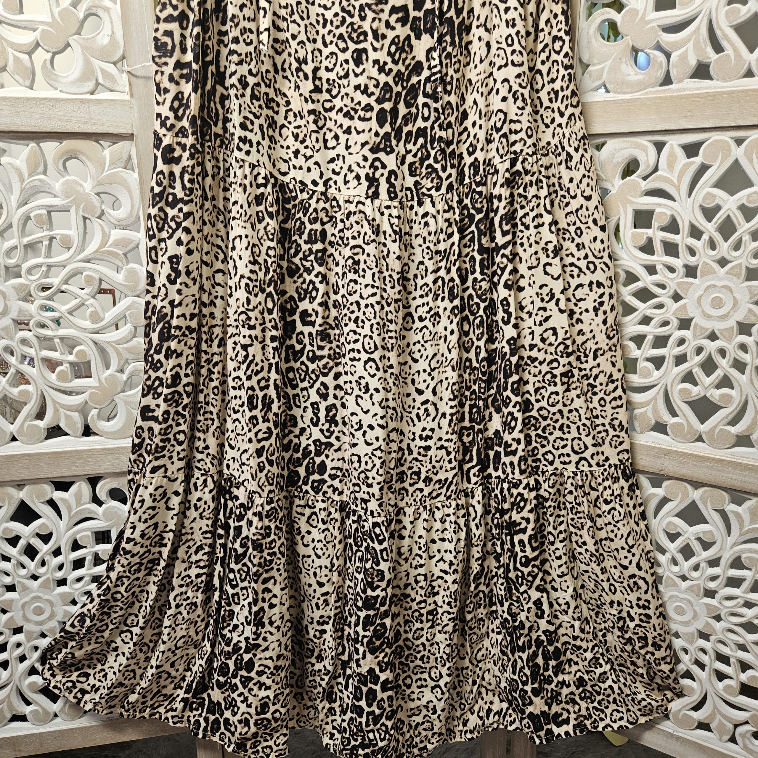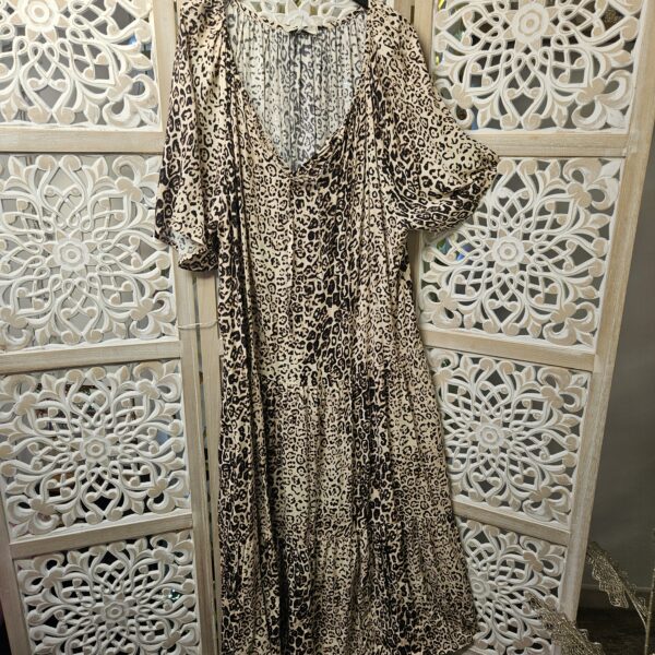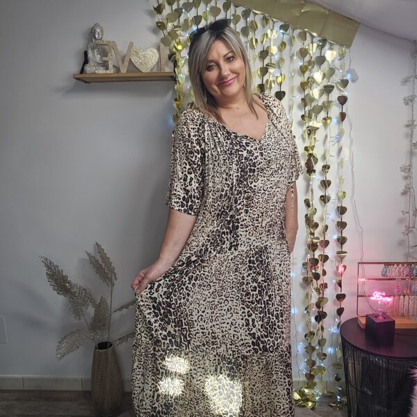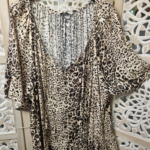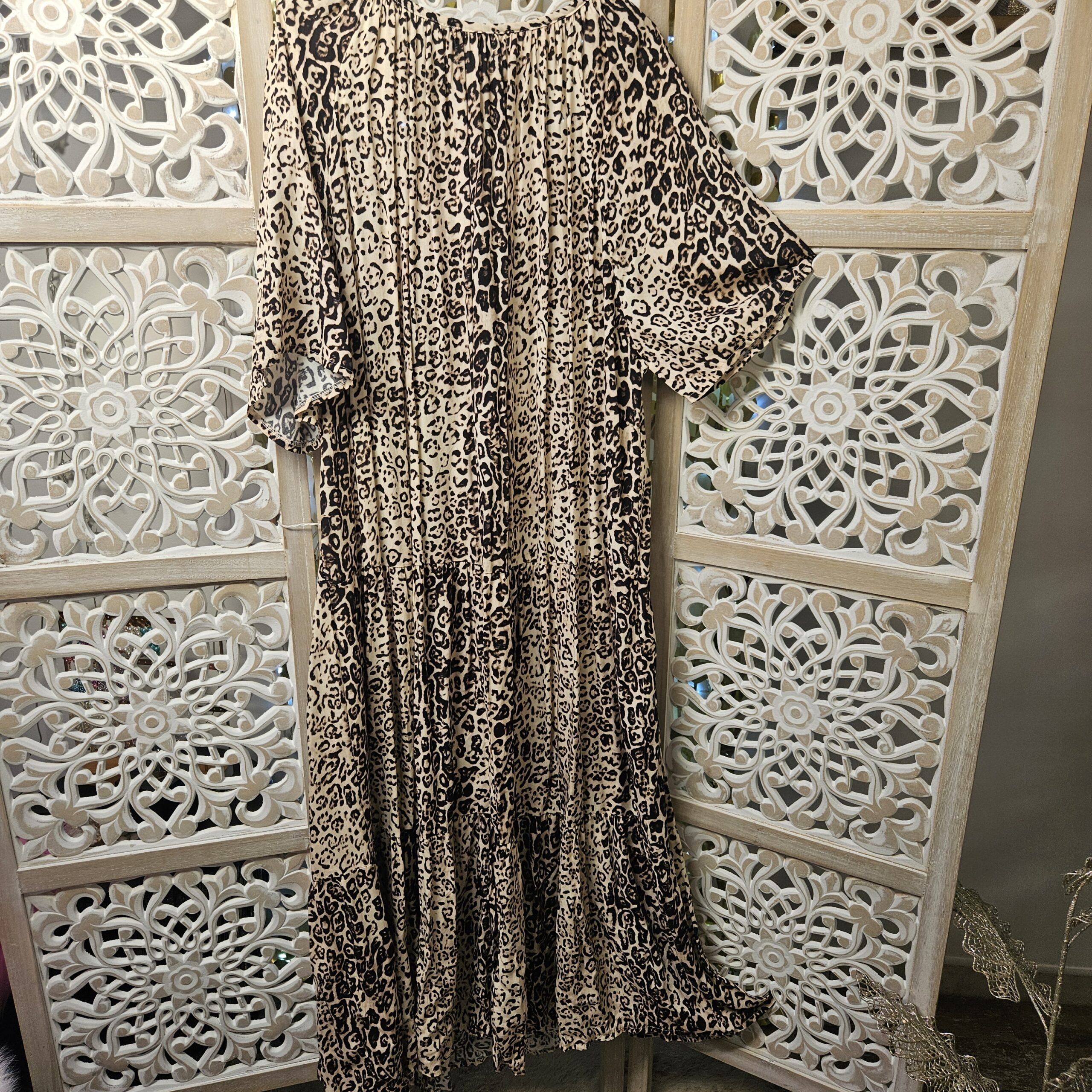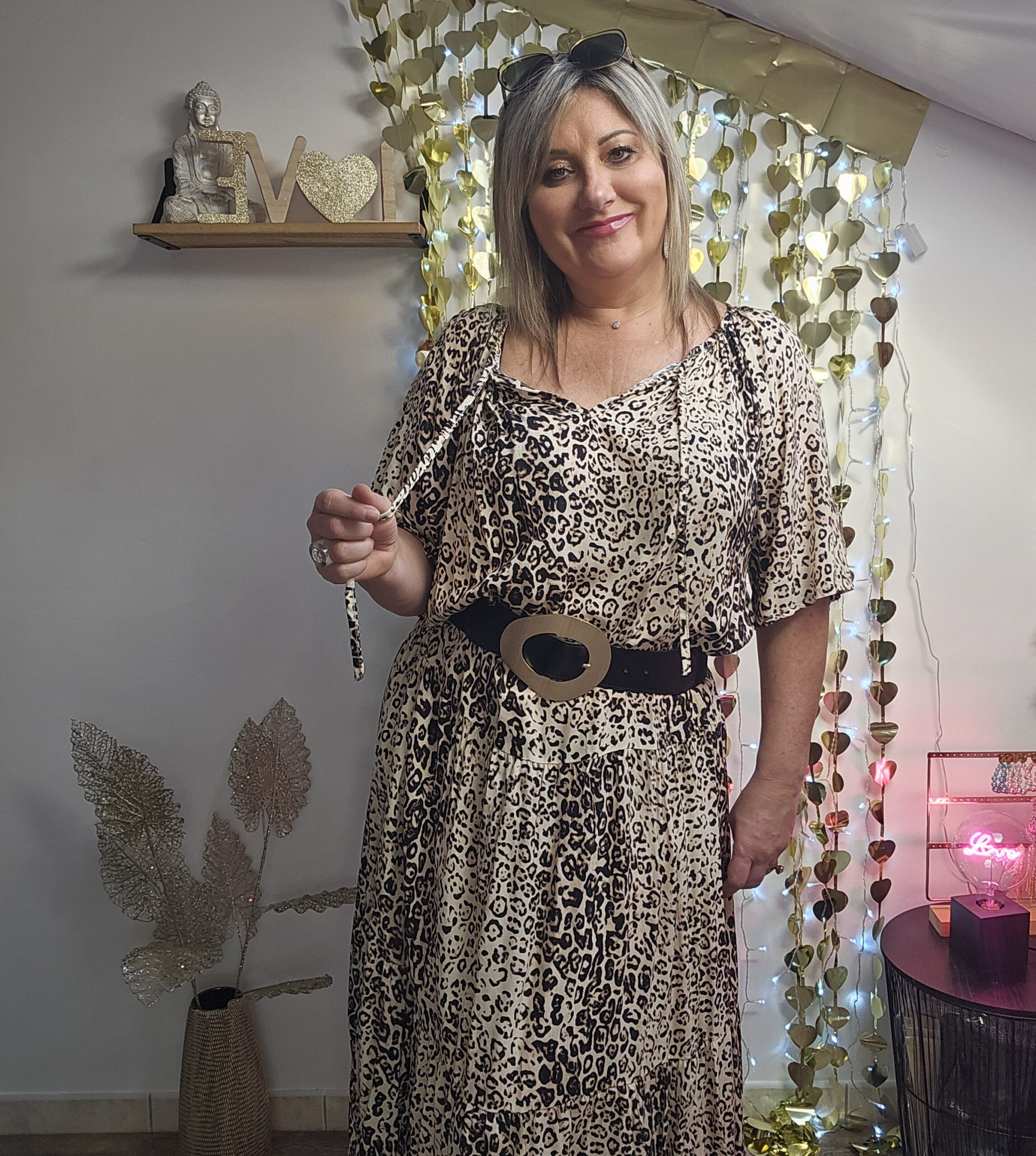 Robe longue léopard oversize, manches larges avec noeud sur le devant à fermer ou pas. A ceinturer selon votre convenance.