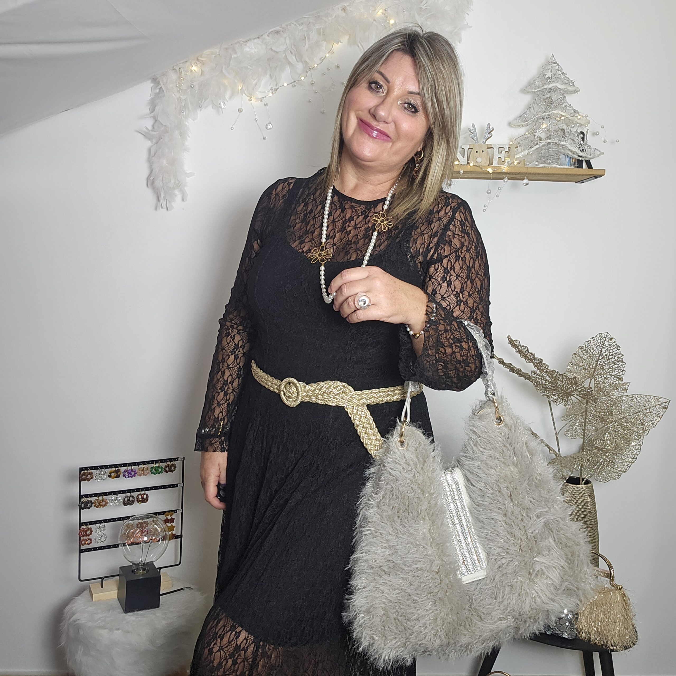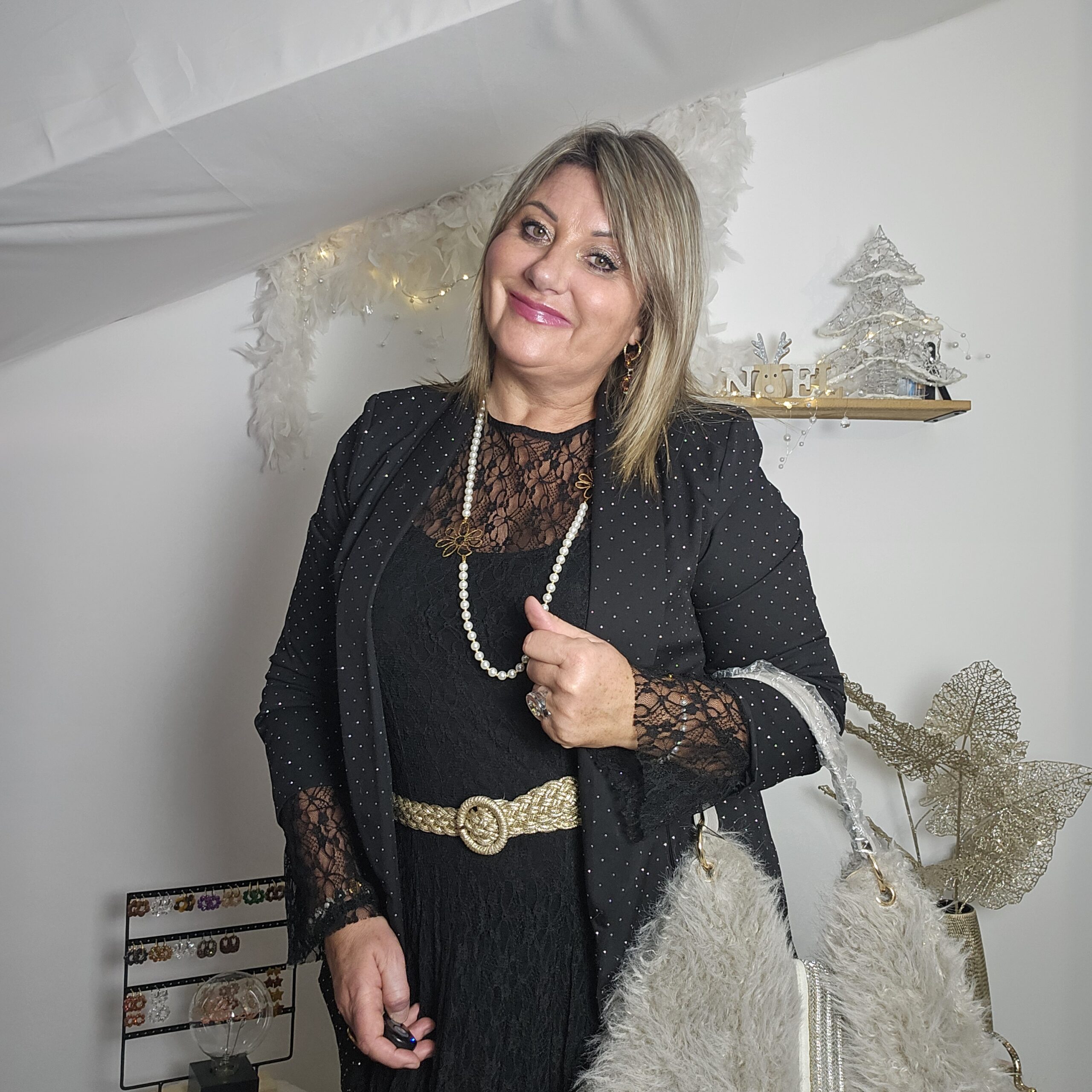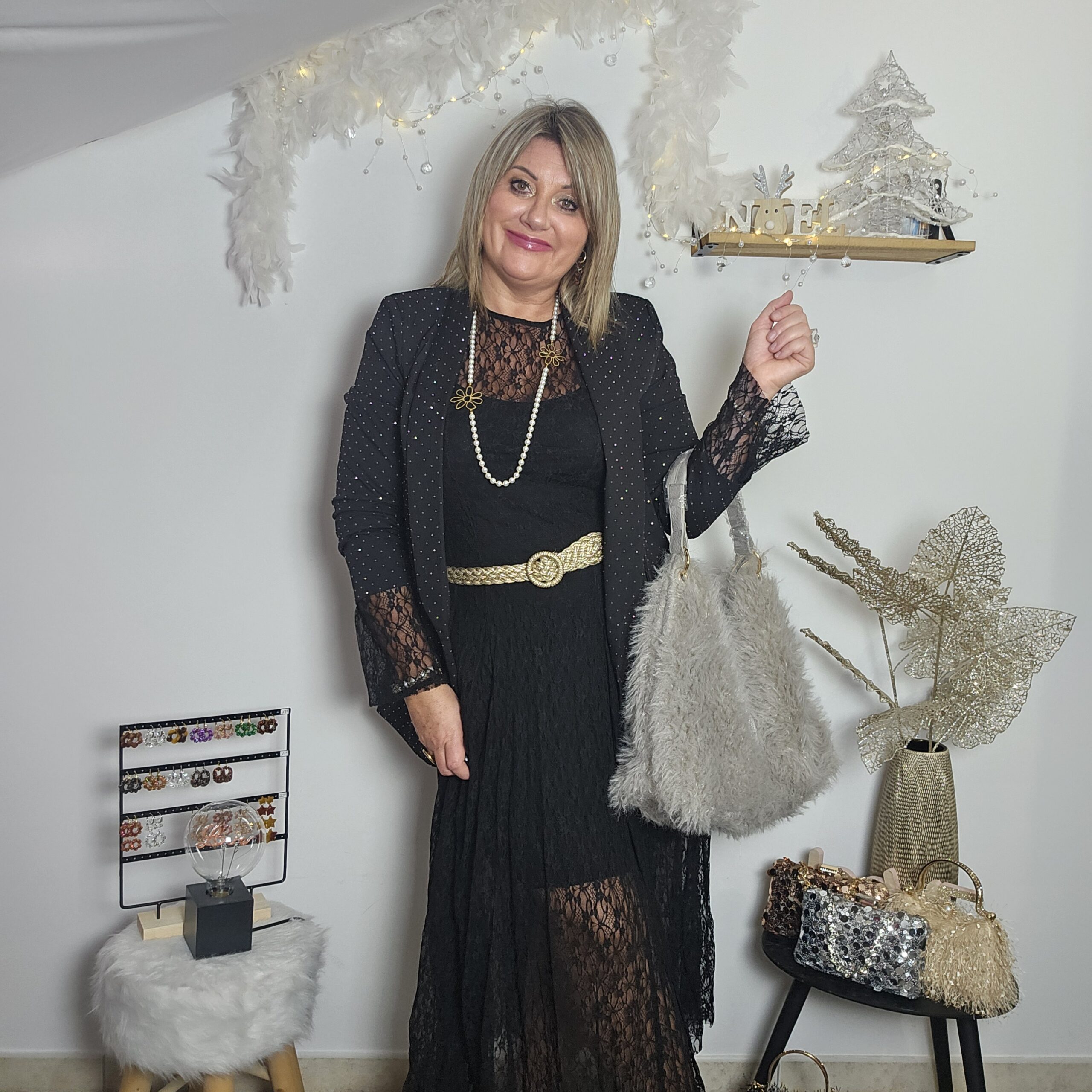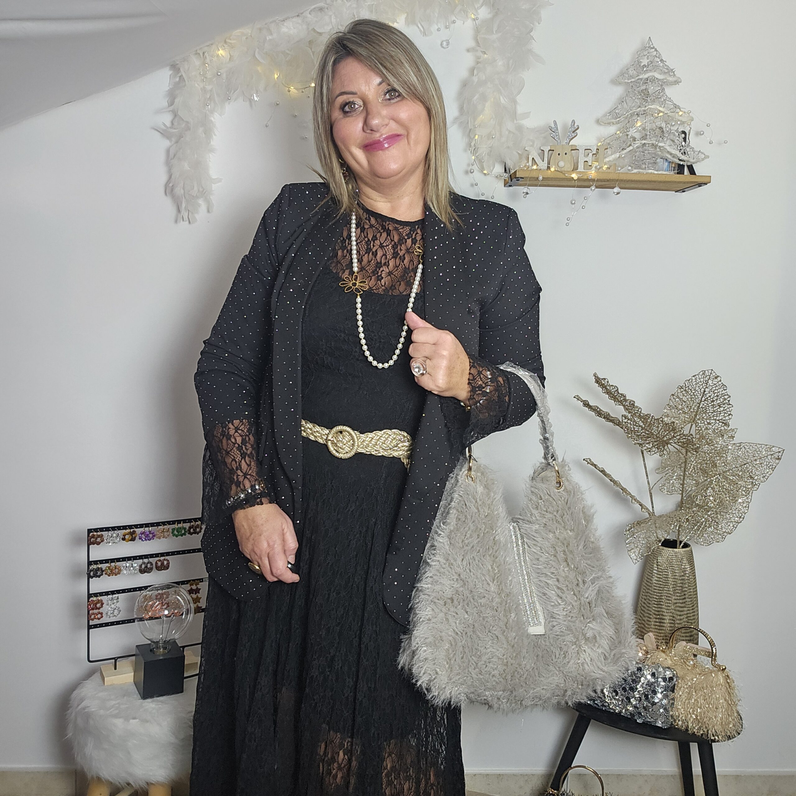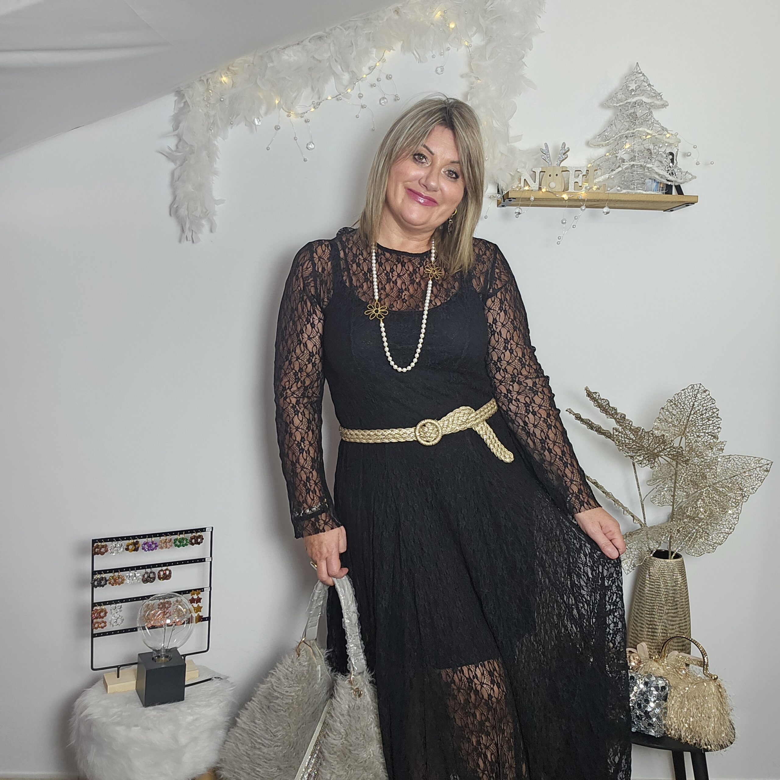Mon regard pailleté : On aime cette robe en dentelle qui illuminera vos soirées ainsi que vos fêtes de fin d’année !! A porter avec une ceinture et une veste en sequins ou en suédine dorée. Convient à toute les morphologies du 42 au 48.