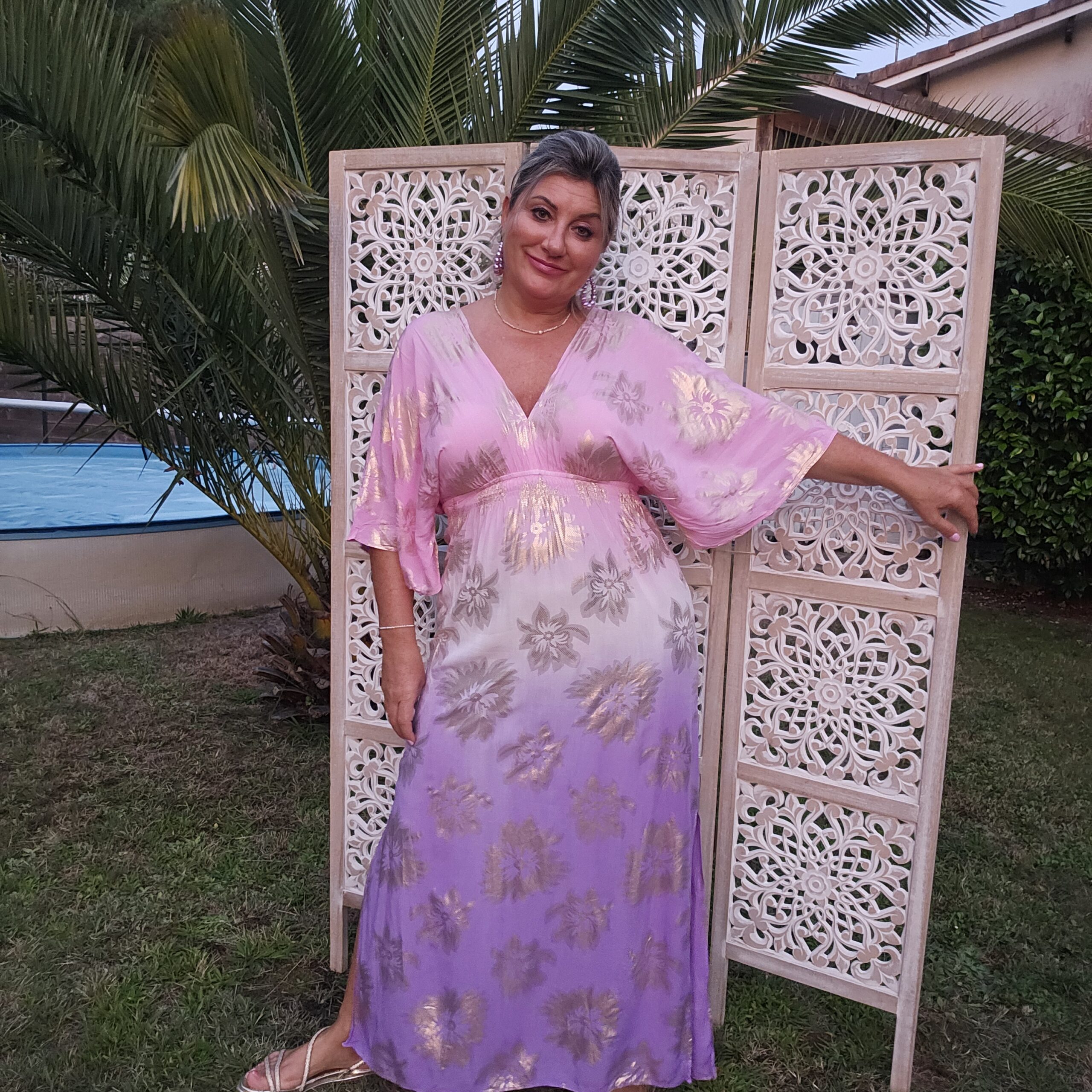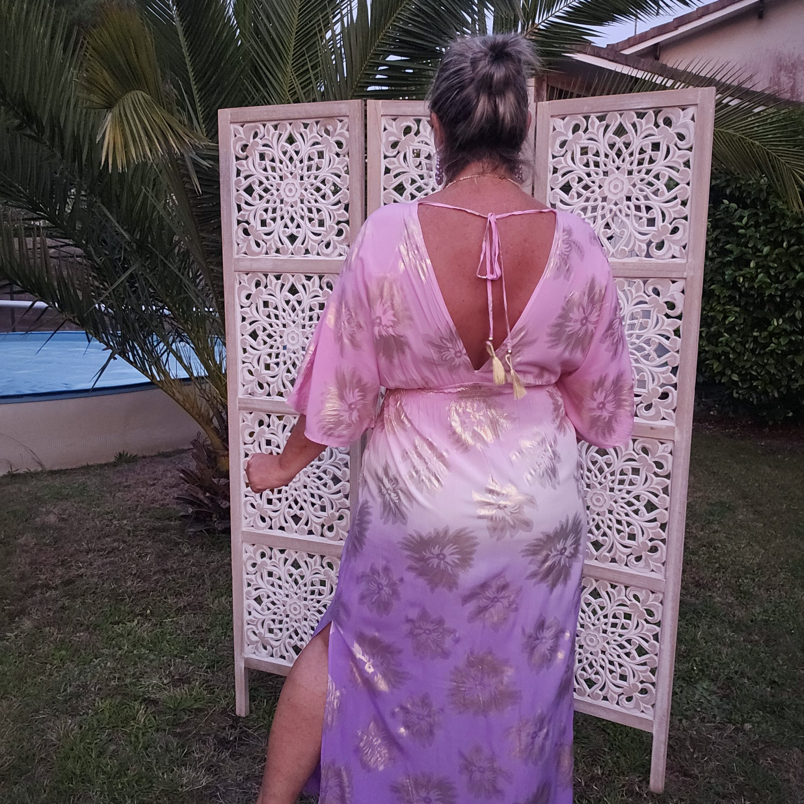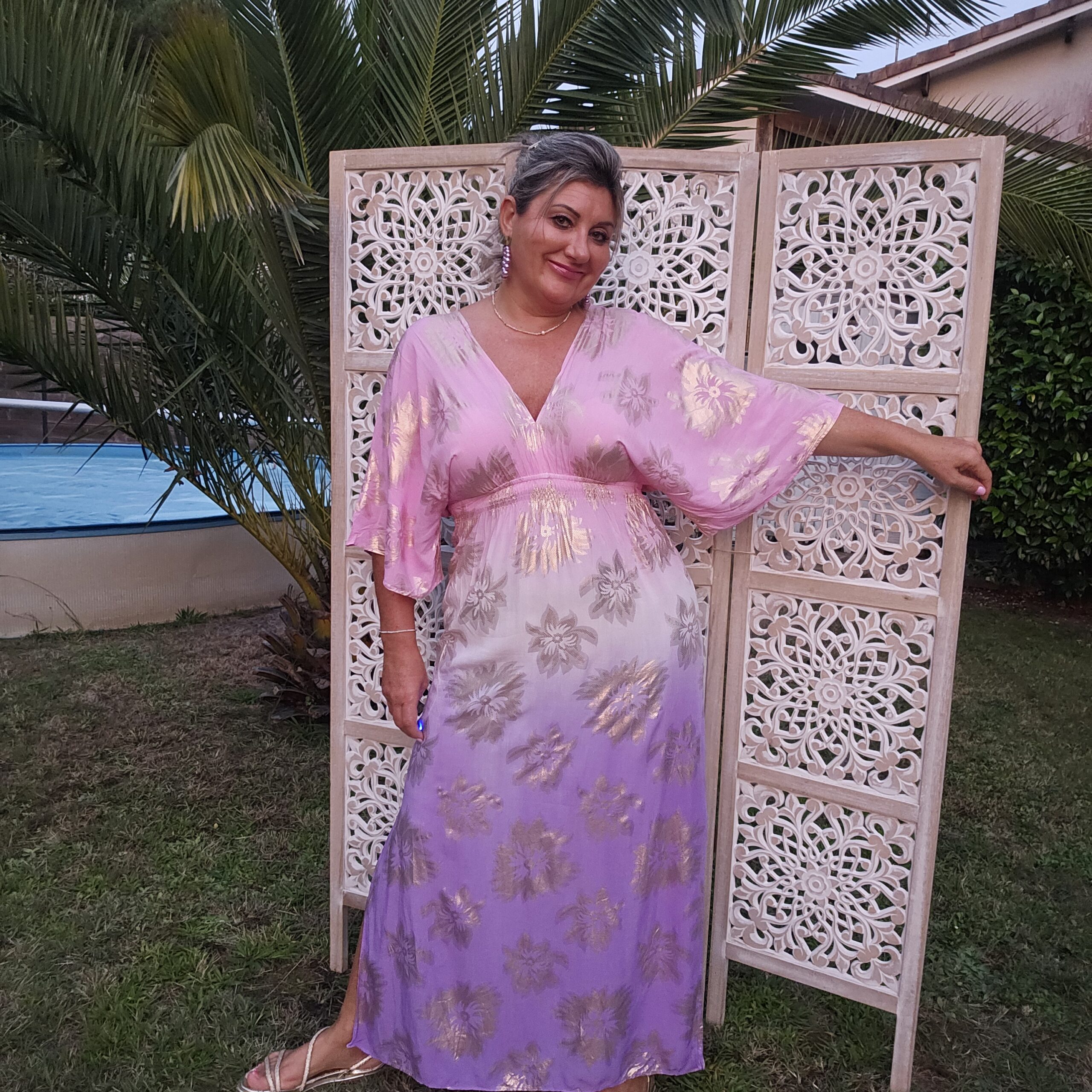 Robe longue rose, violet en dégradé, avec fleurs dorées, élastique sous la poitrine, en « V » devant et derrière, fermeture avec des pompons dorés. Fente sur les côtés.