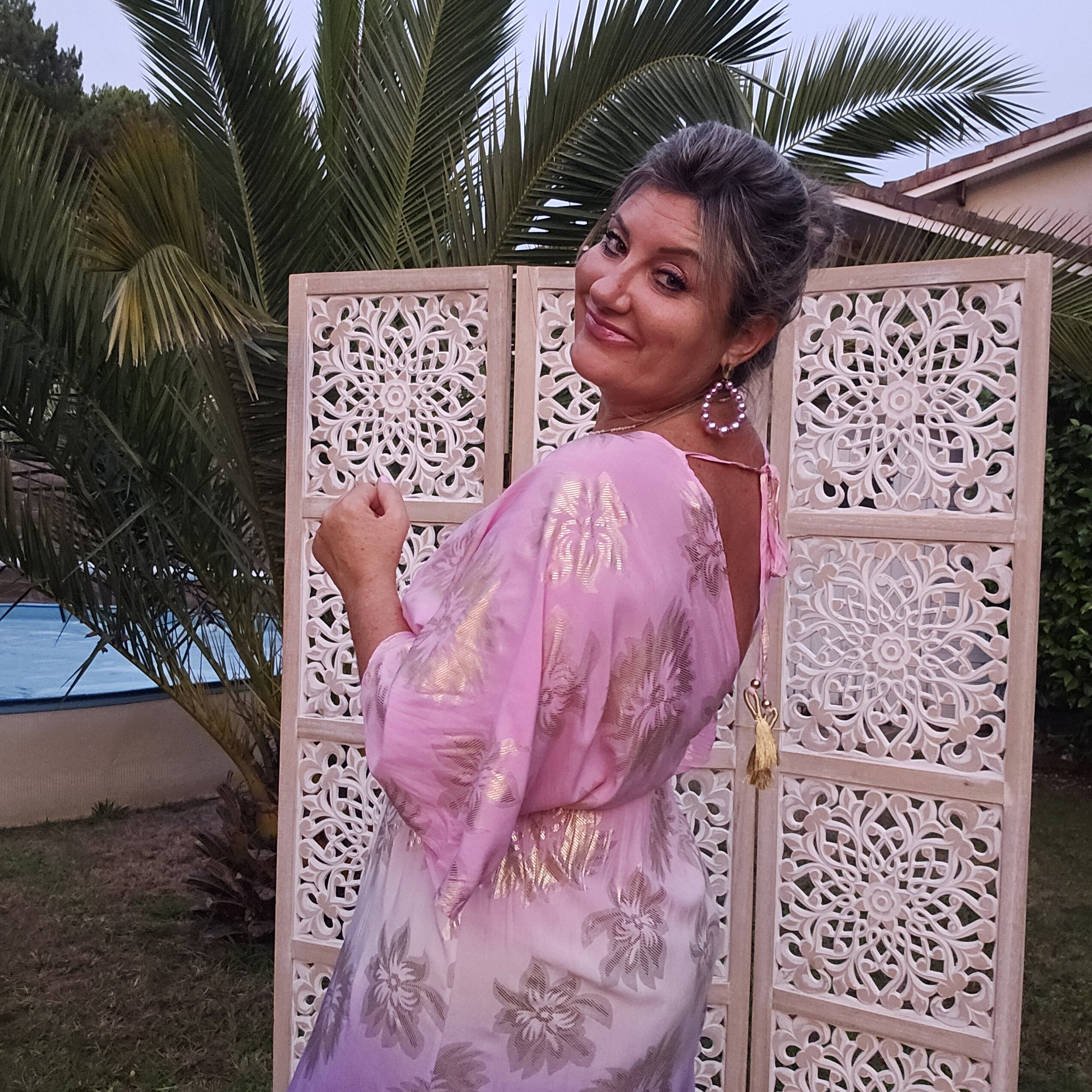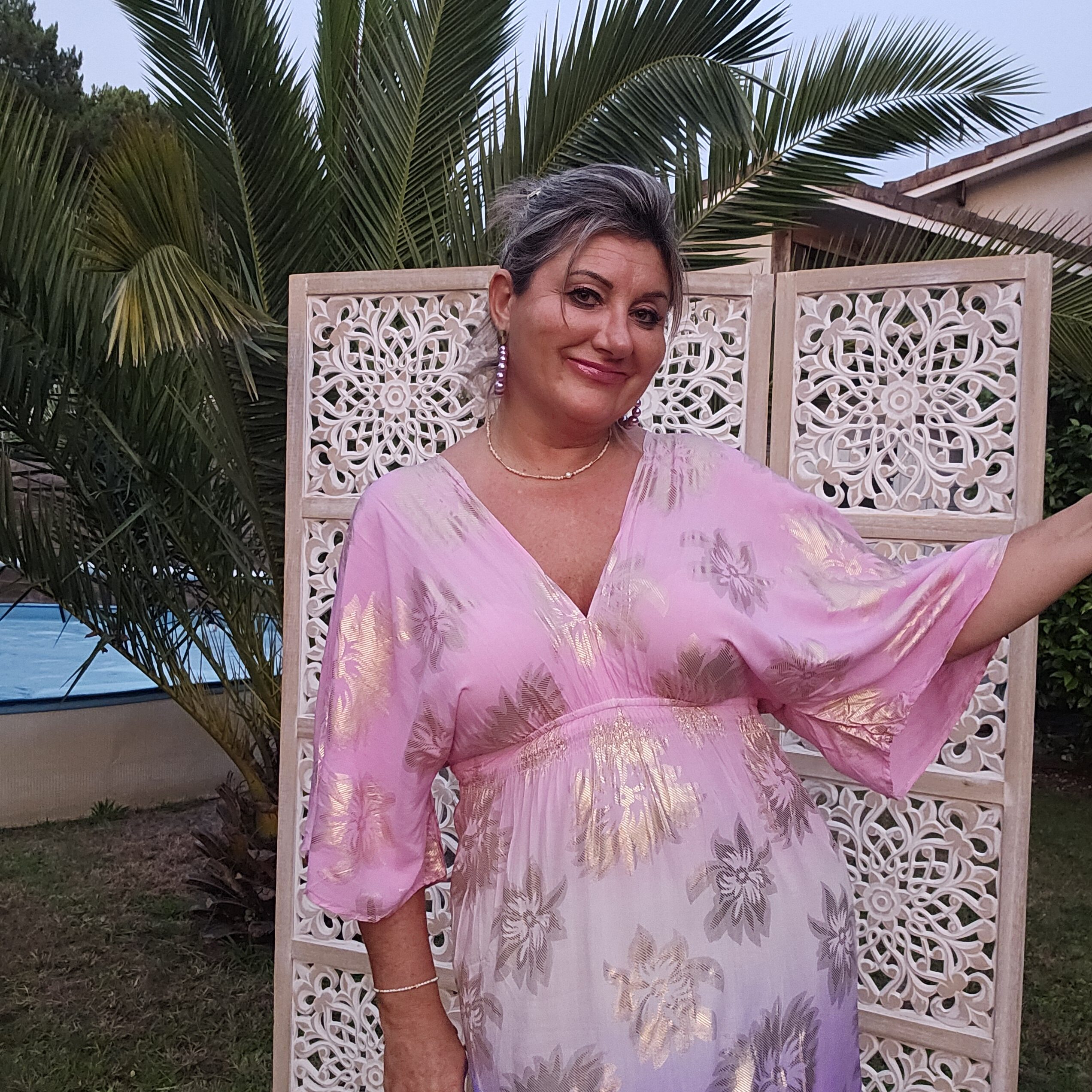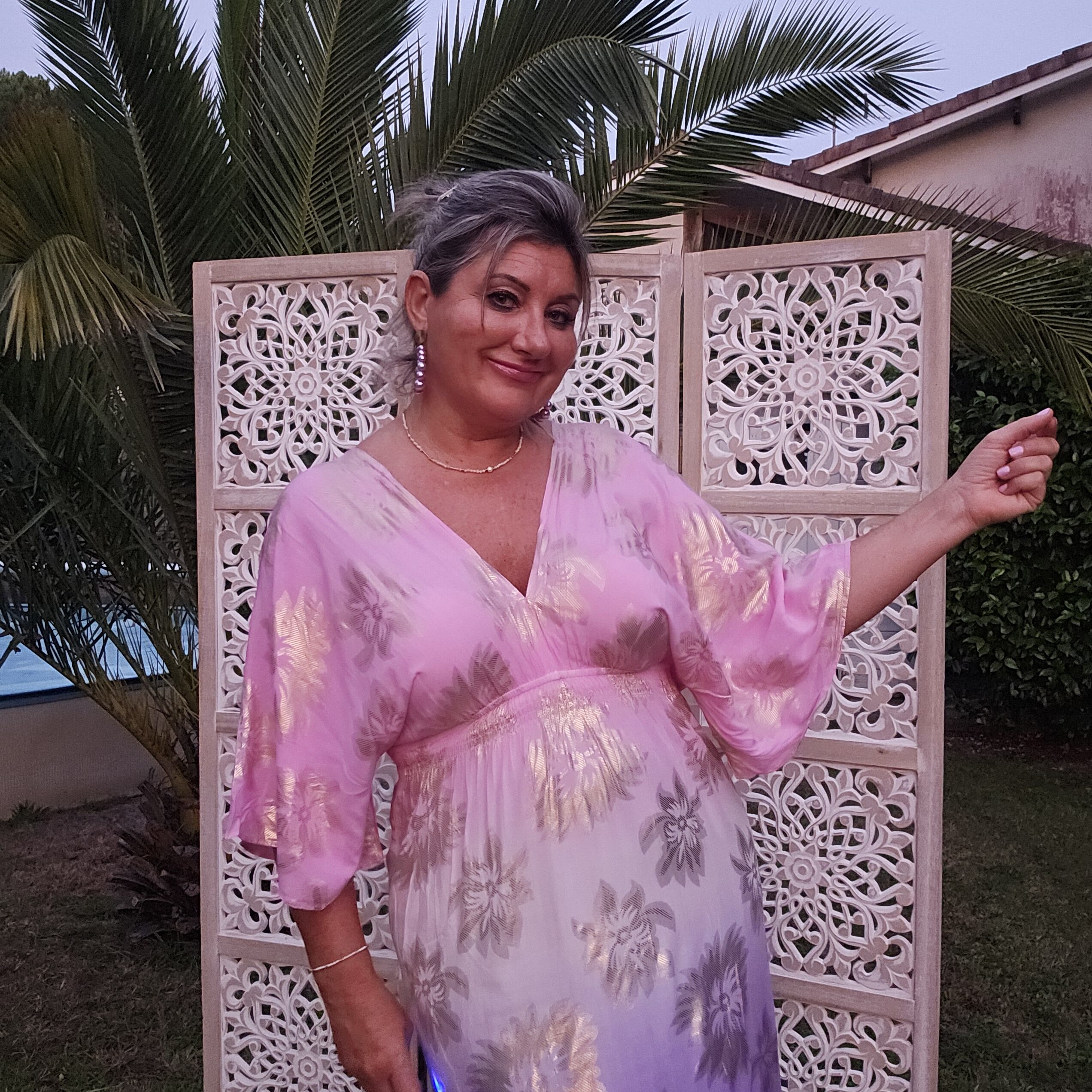 Robe longue rose, violet en dégradé, avec fleurs dorées, élastique sous la poitrine, en « V » devant et derrière, fermeture avec des pompons dorés. Fente sur les côtés.