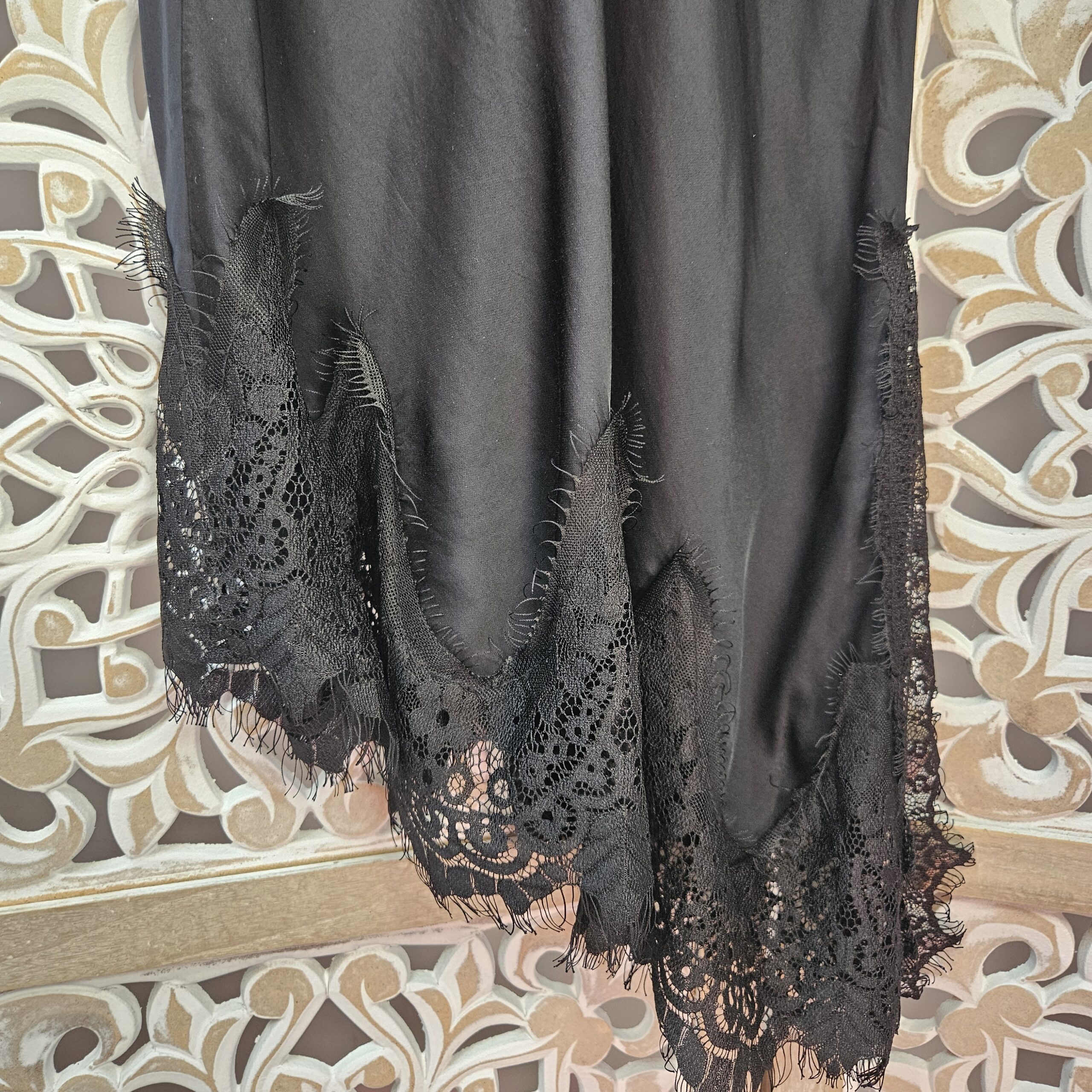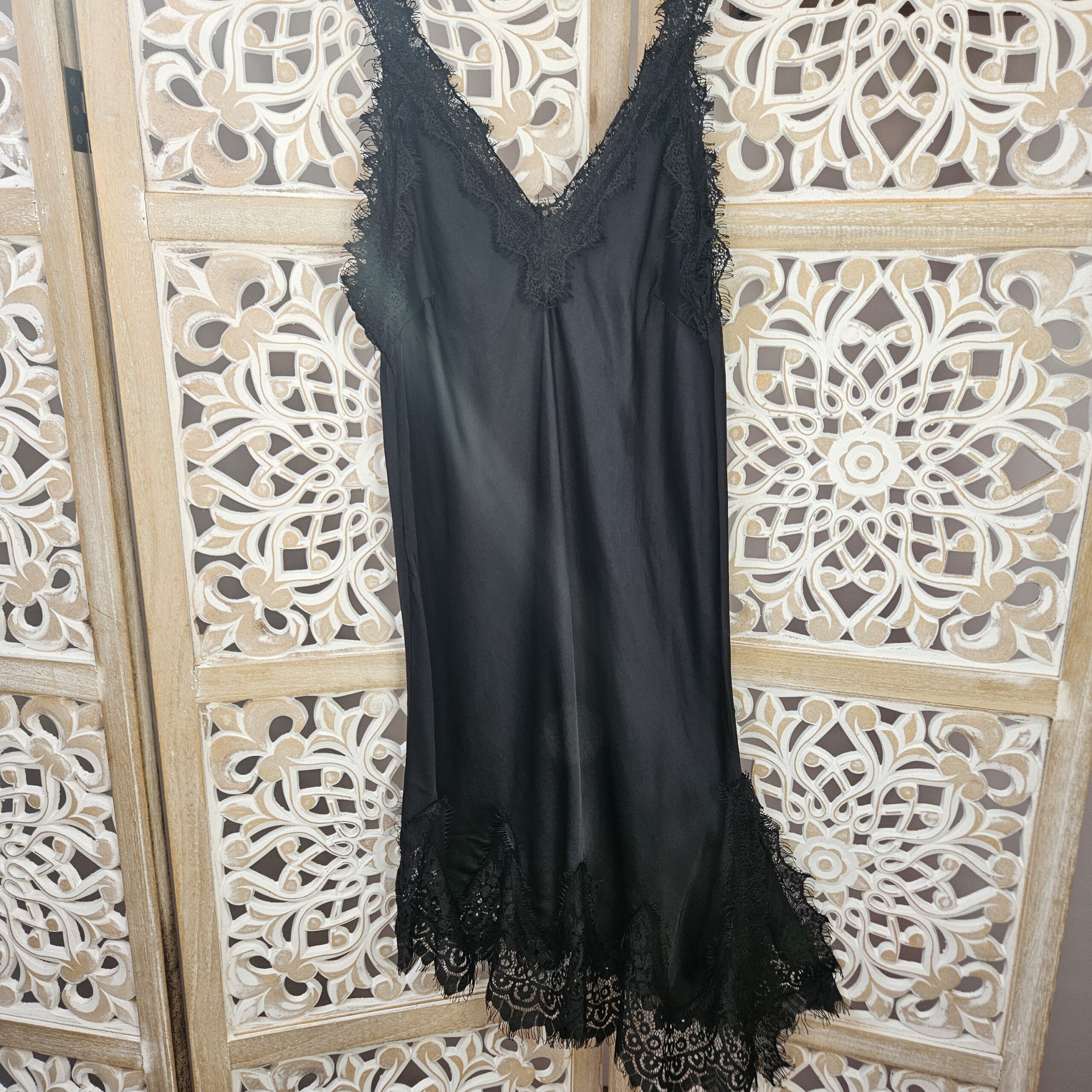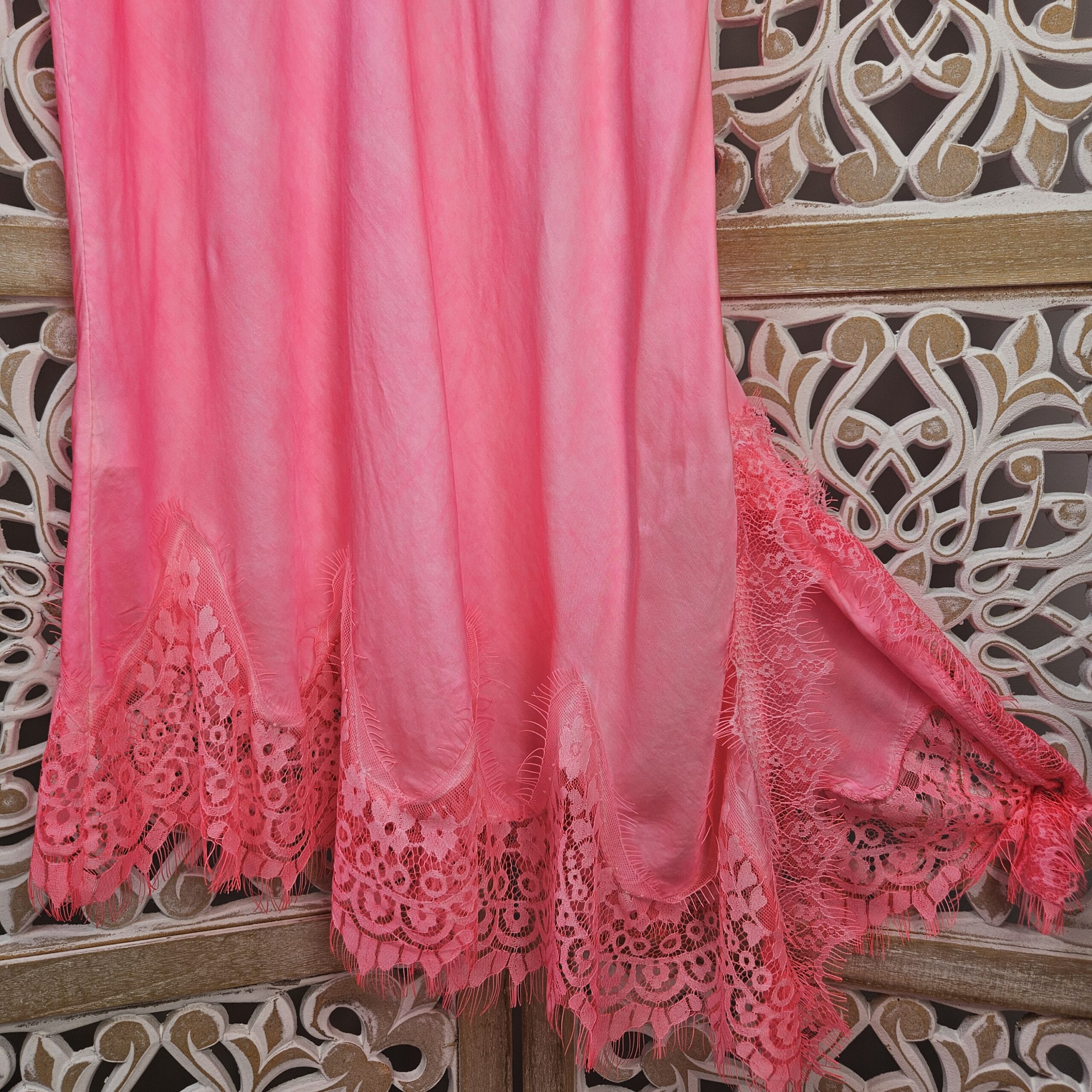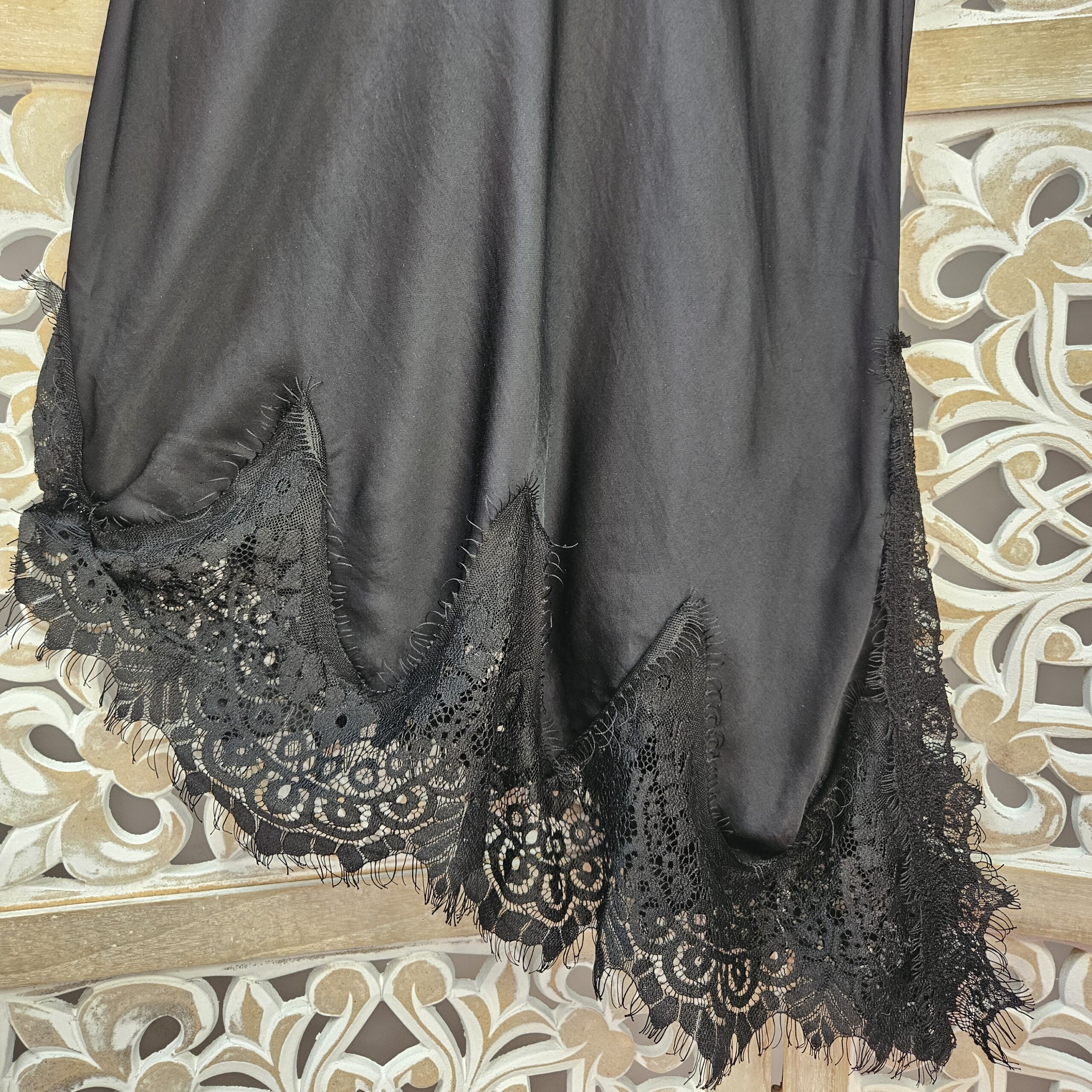 Robe/tunique à bretelles, col V devant et derrière, avec de la dentelle au niveau des bretelles et de la poitrine. En bas dentelle asymétrique. TU.