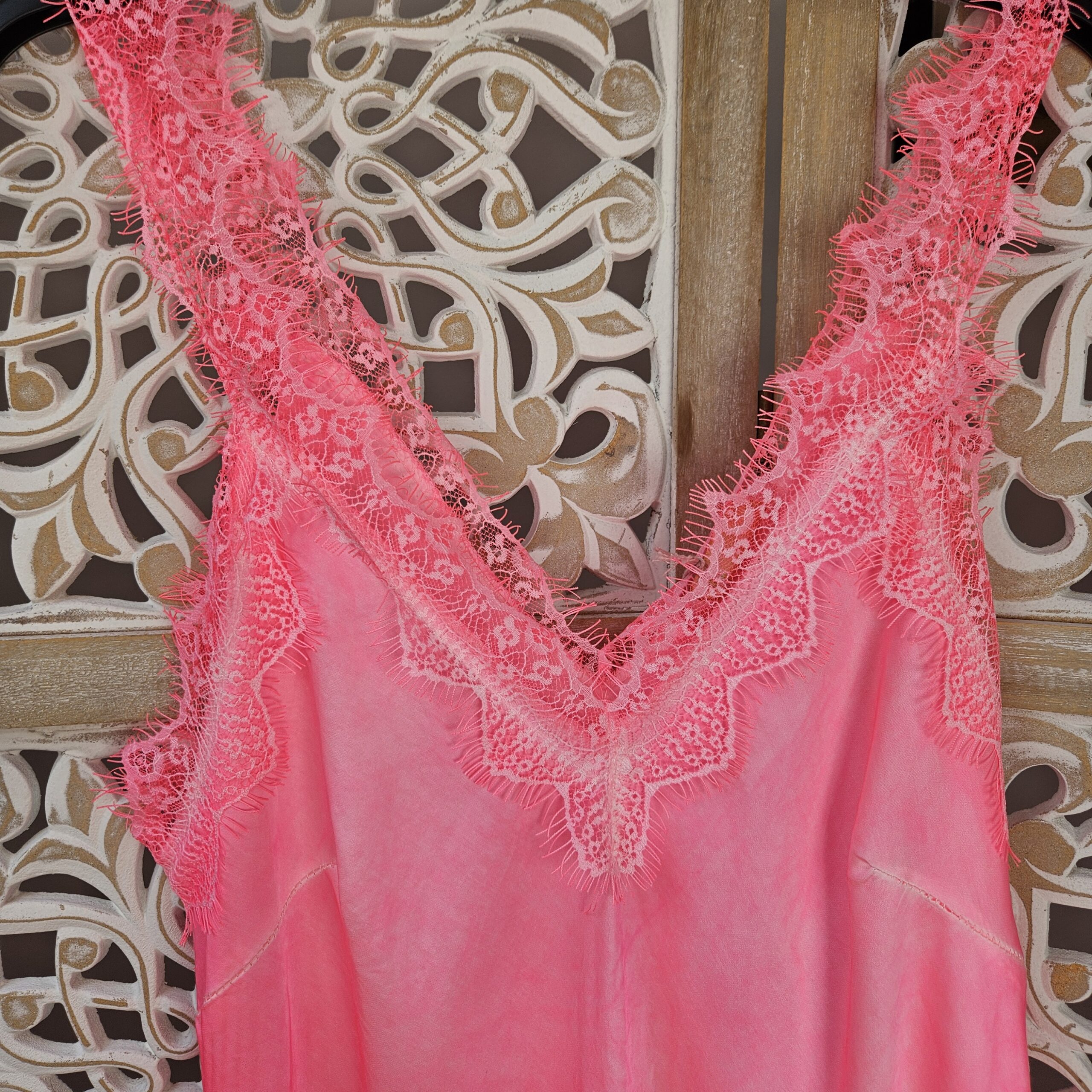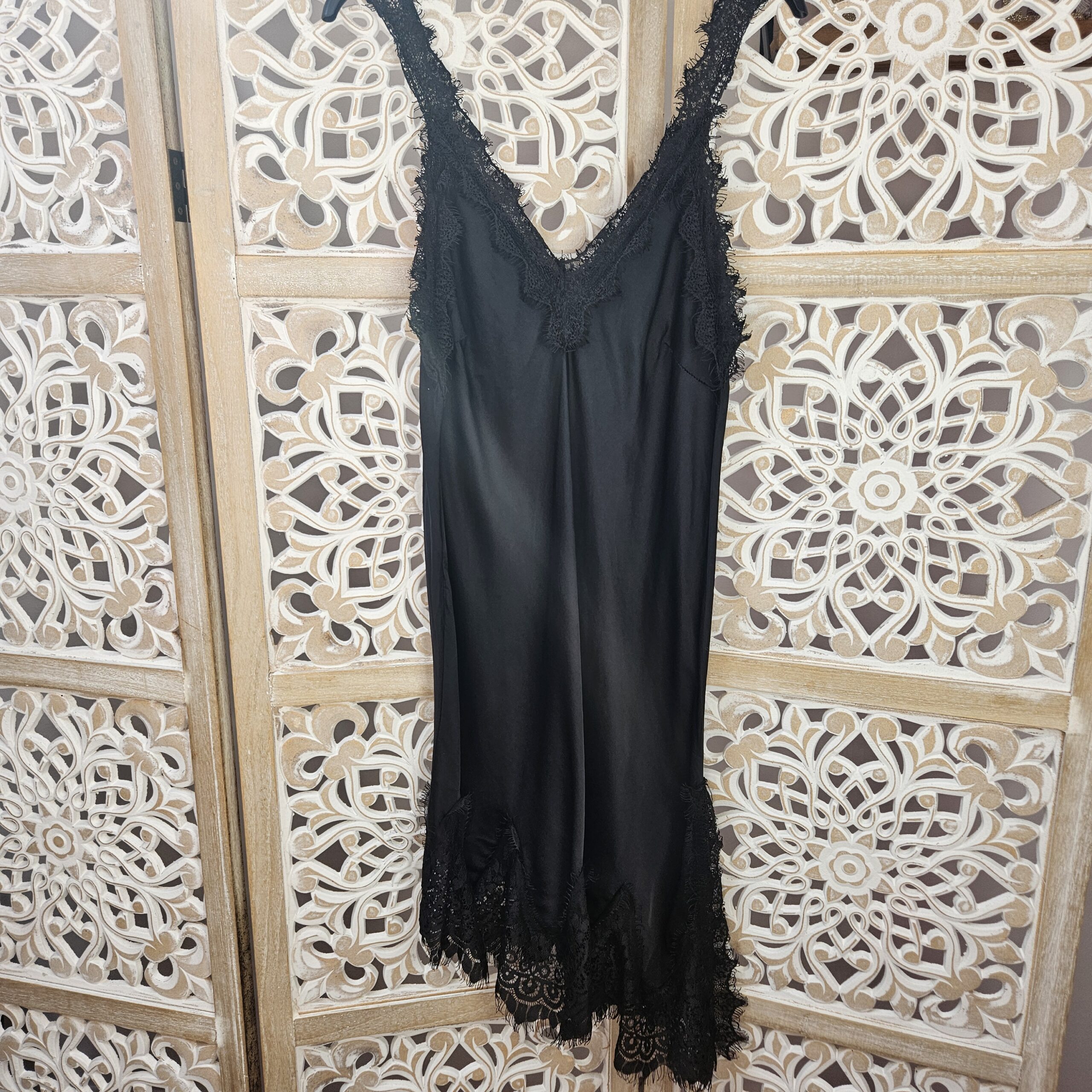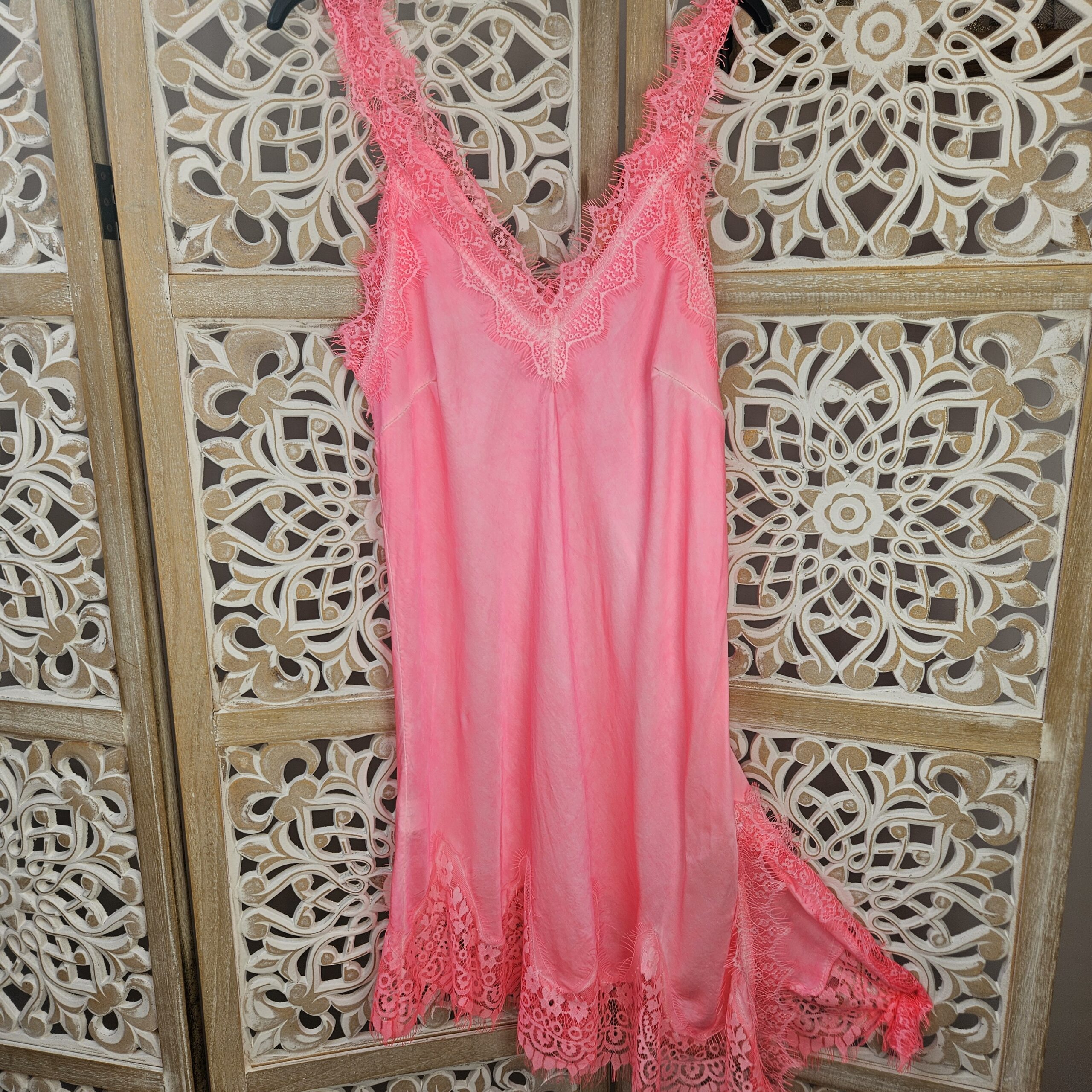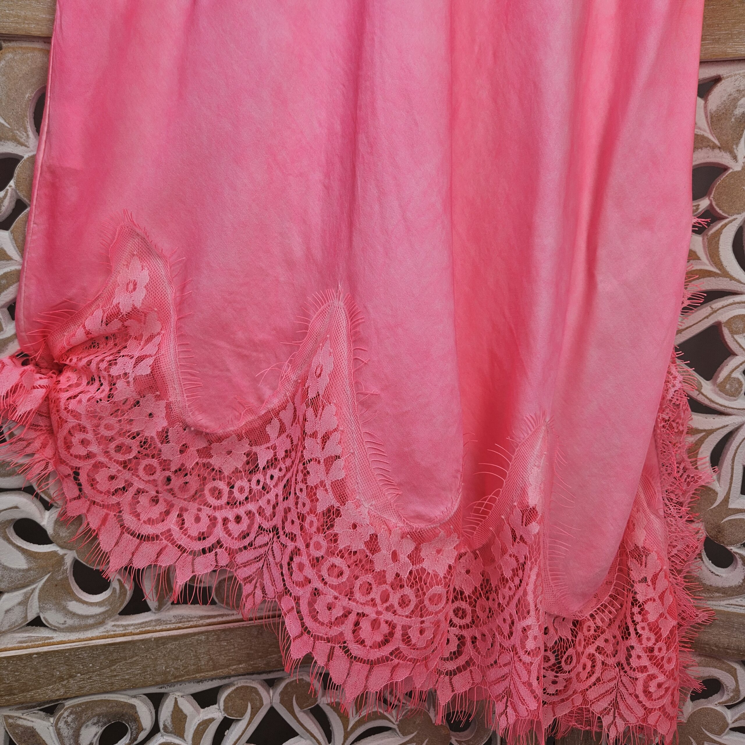 Robe/tunique à bretelles, col V devant et derrière, avec de la dentelle au niveau des bretelles et de la poitrine. En bas dentelle asymétrique. TU.