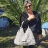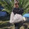 Sac en fourrure, fermeture par bouton pression et 1 bande de strass avec fermeture pression, anse et intérieur en PU. A l’intérieur 1 pochette, avec sa bandoulière amovible, avec 2 poches intérieures, dont 1 avec fermeture éclaire. Fond plat rigide.