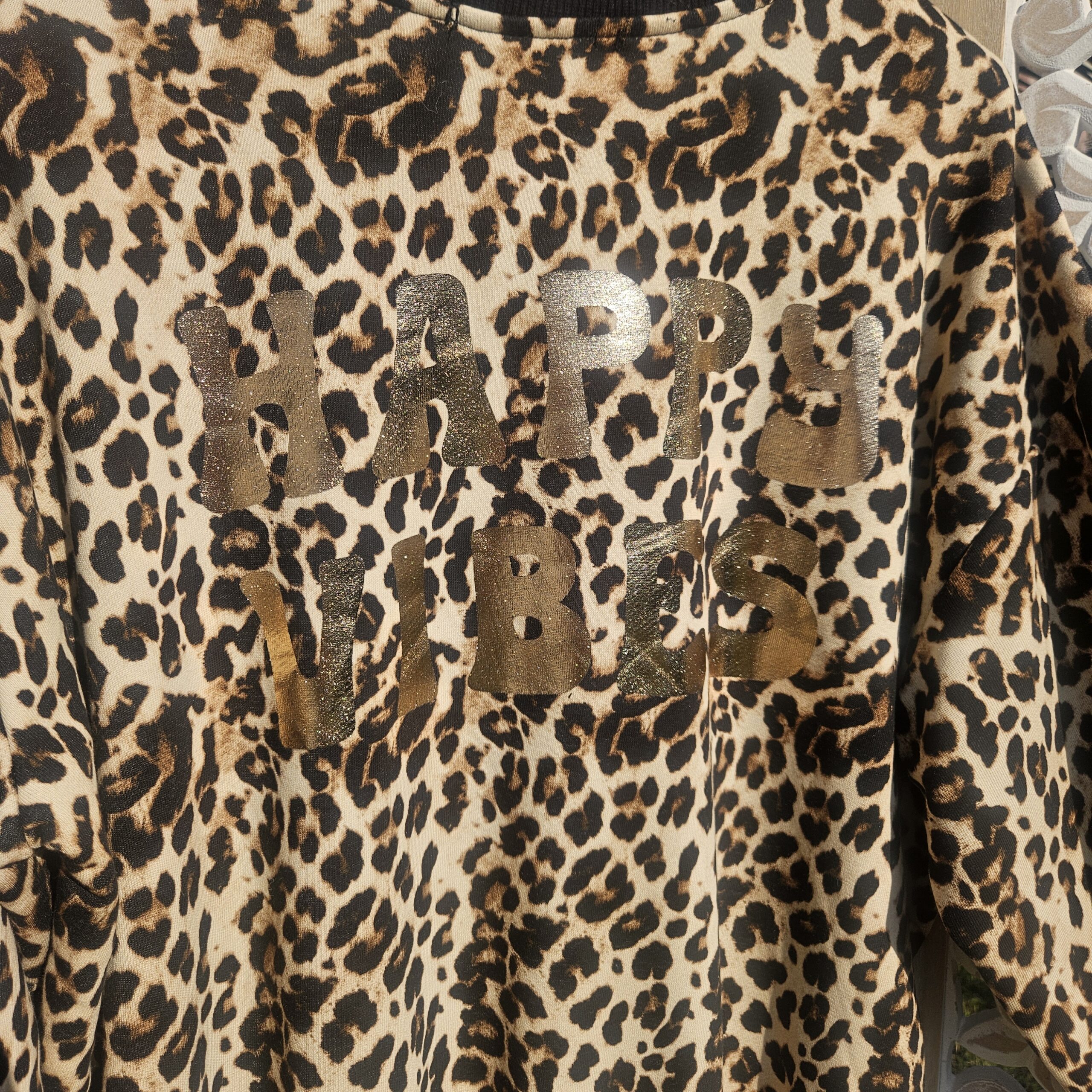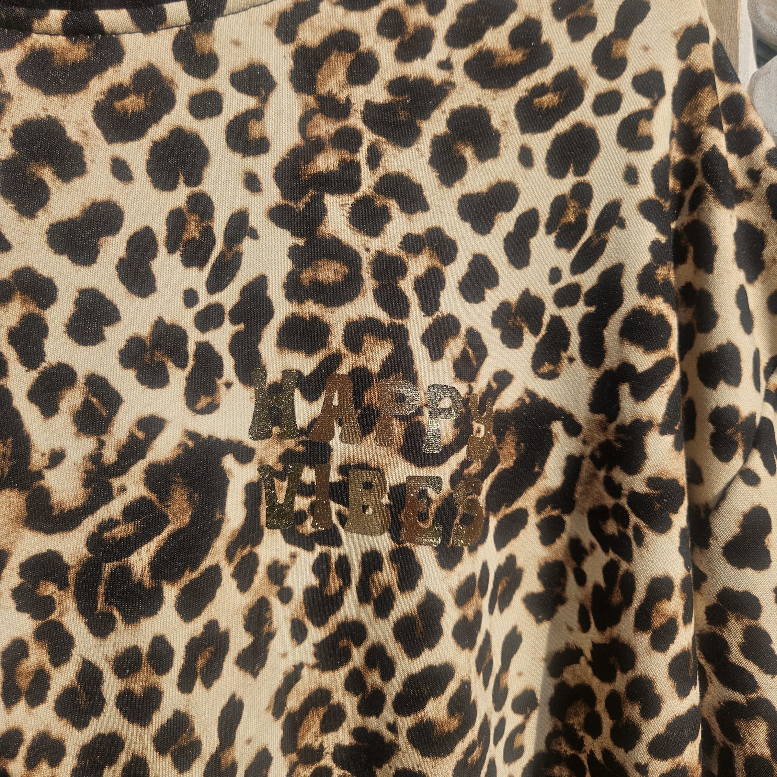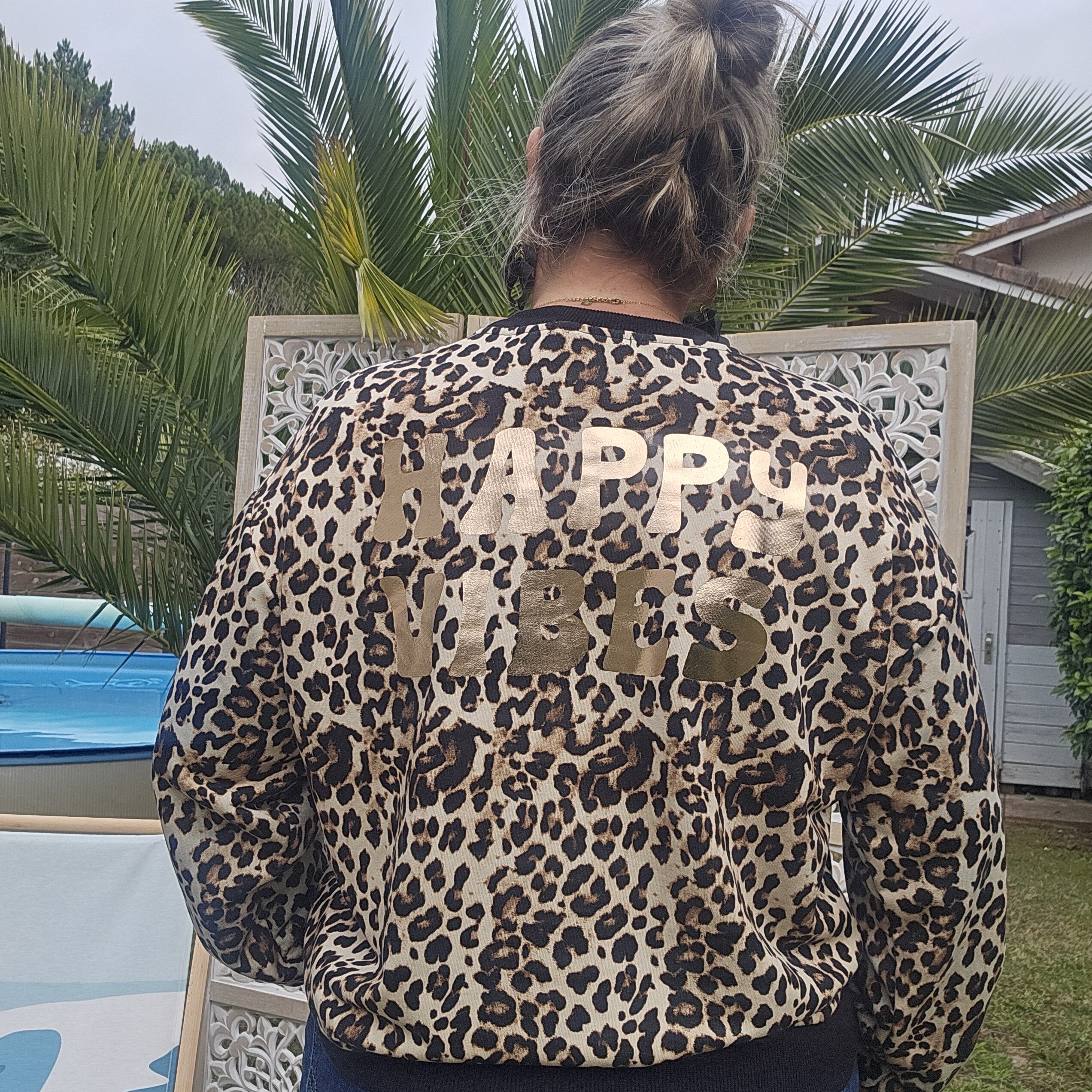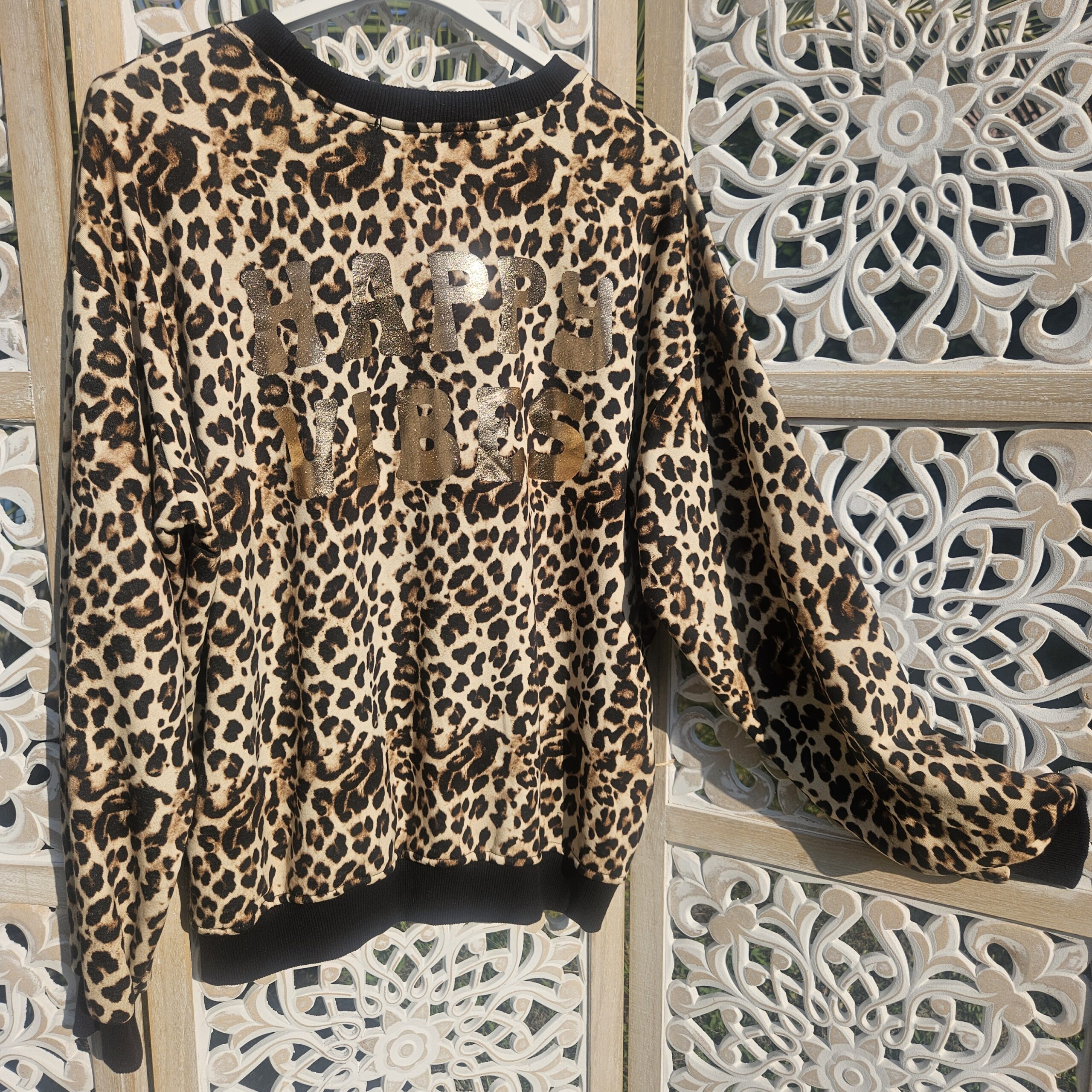 Sweat imprimé léopard, écriture HAPPY VIBES en doré en petit devant et en grand dans le dos. Jersey au bout des manches et au col. Manches longues. Coupe ample et confortable pour un look frais et élégant. TU