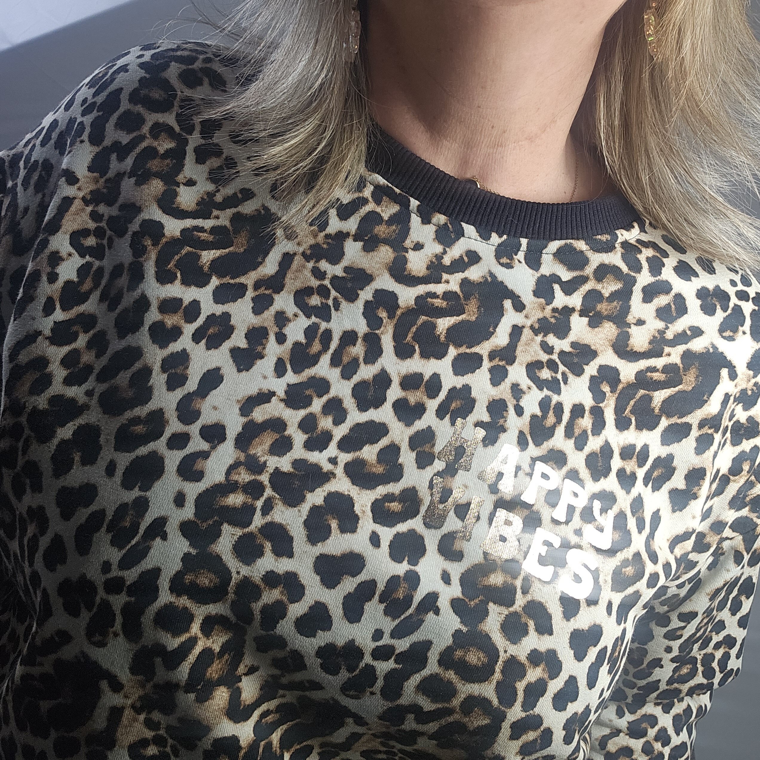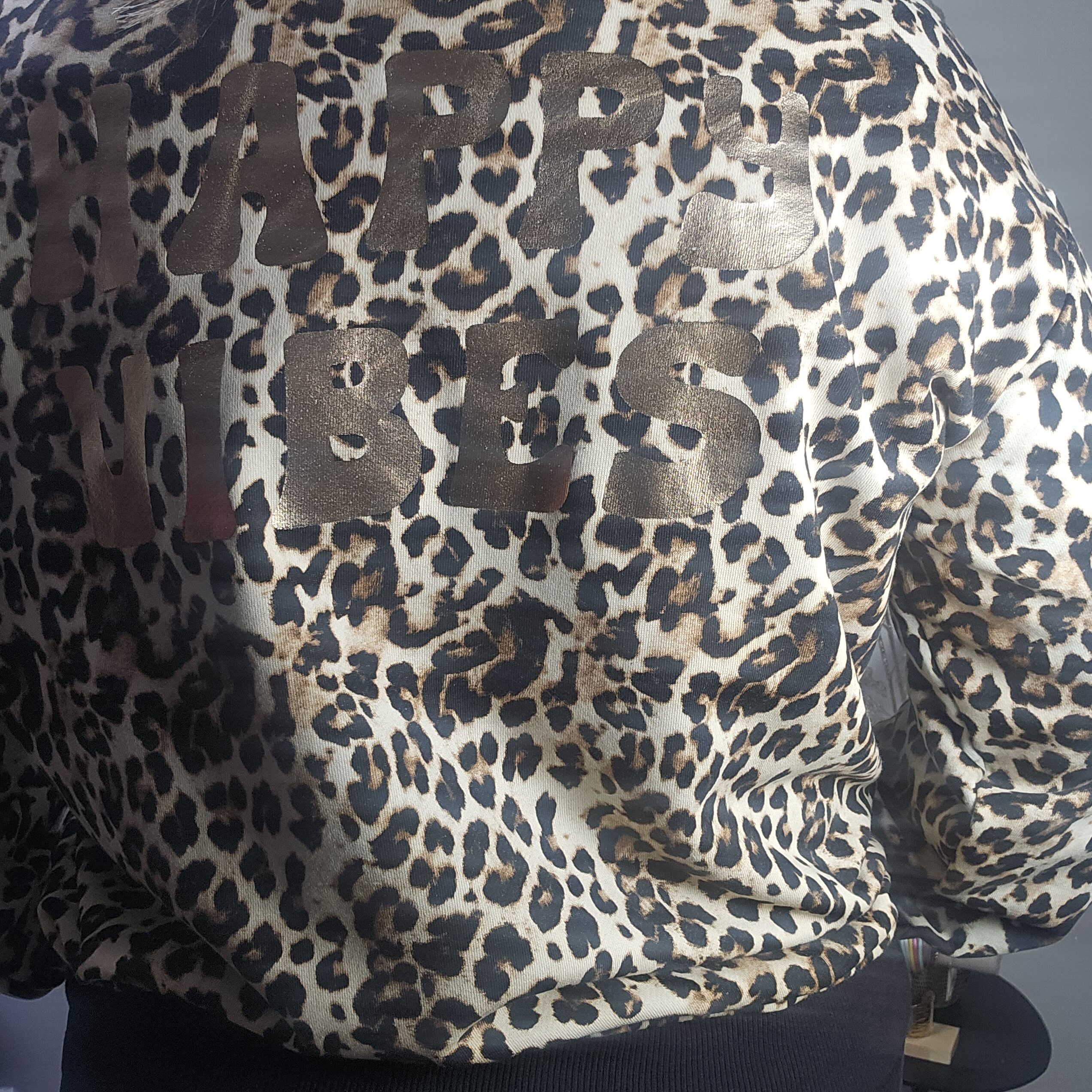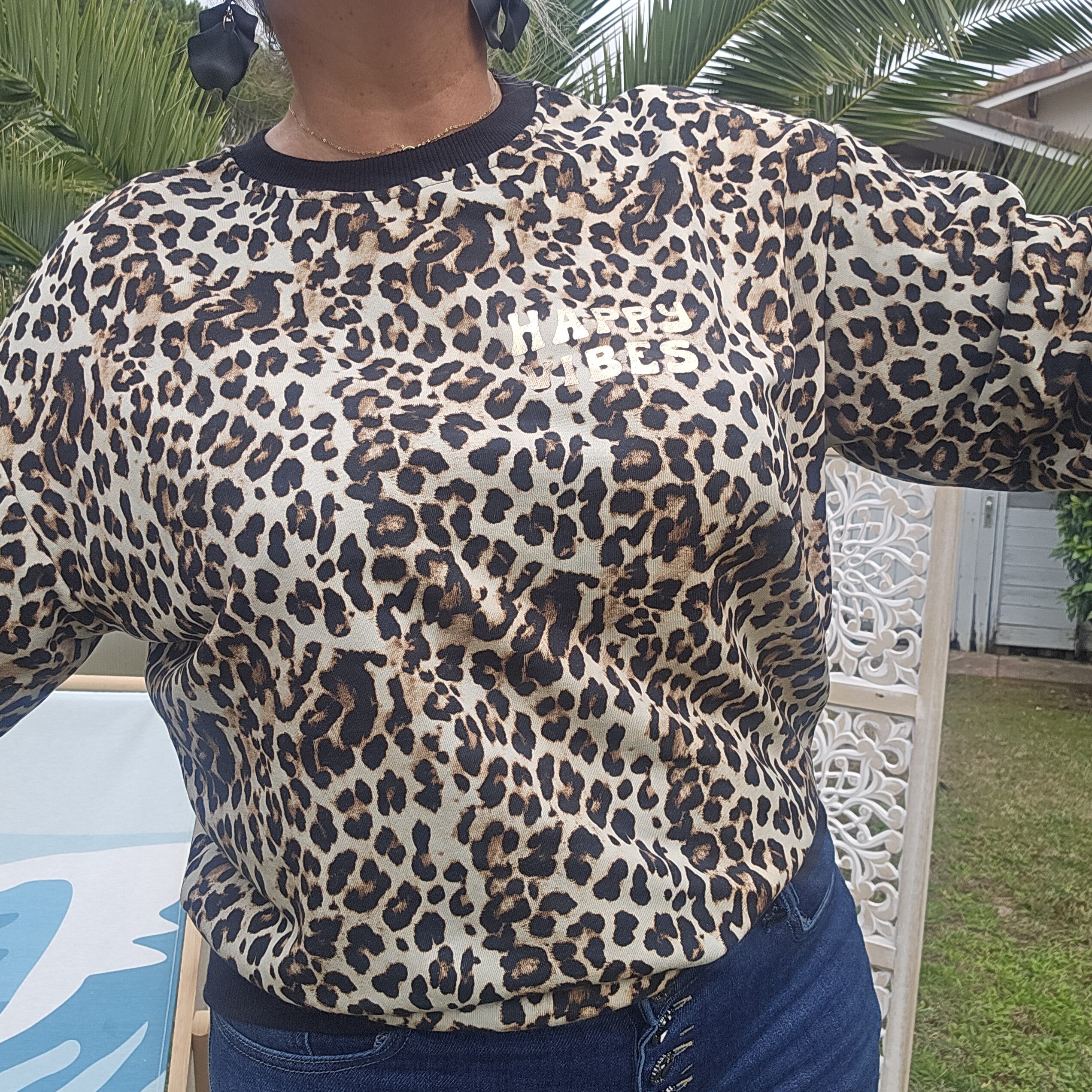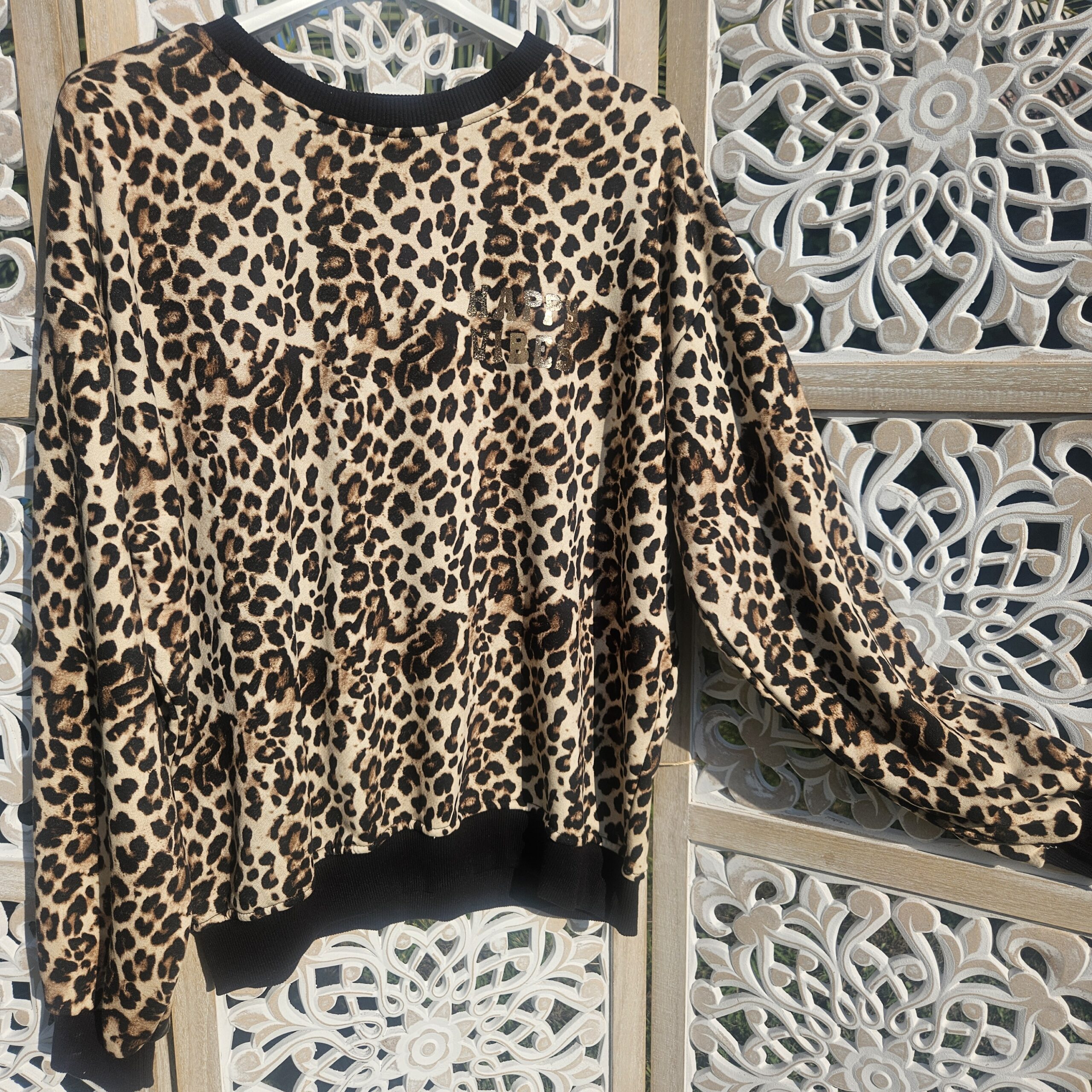 Sweat imprimé léopard, écriture HAPPY VIBES en doré en petit devant et en grand dans le dos. Jersey au bout des manches et au col. Manches longues. Coupe ample et confortable pour un look frais et élégant. TU
