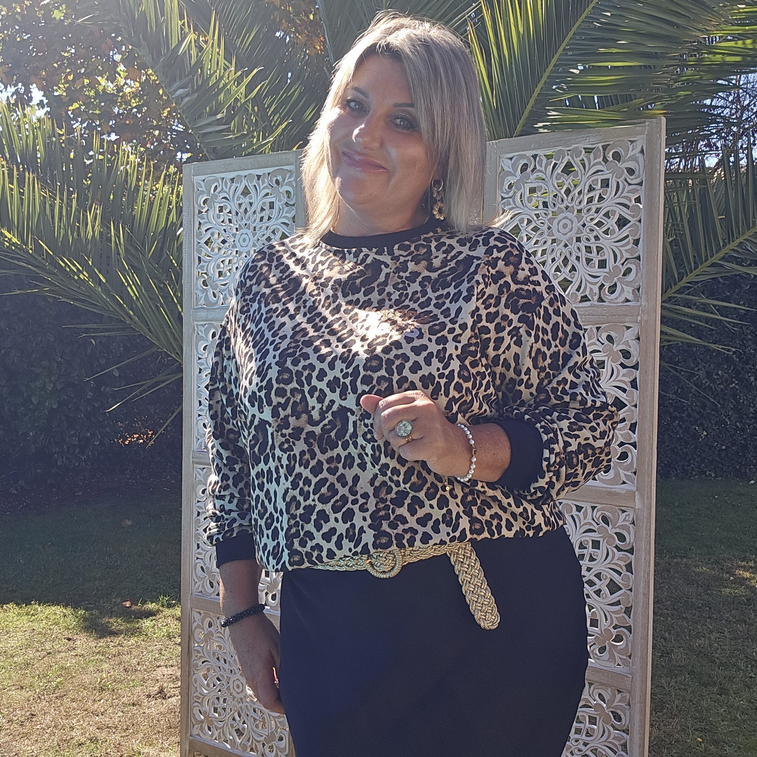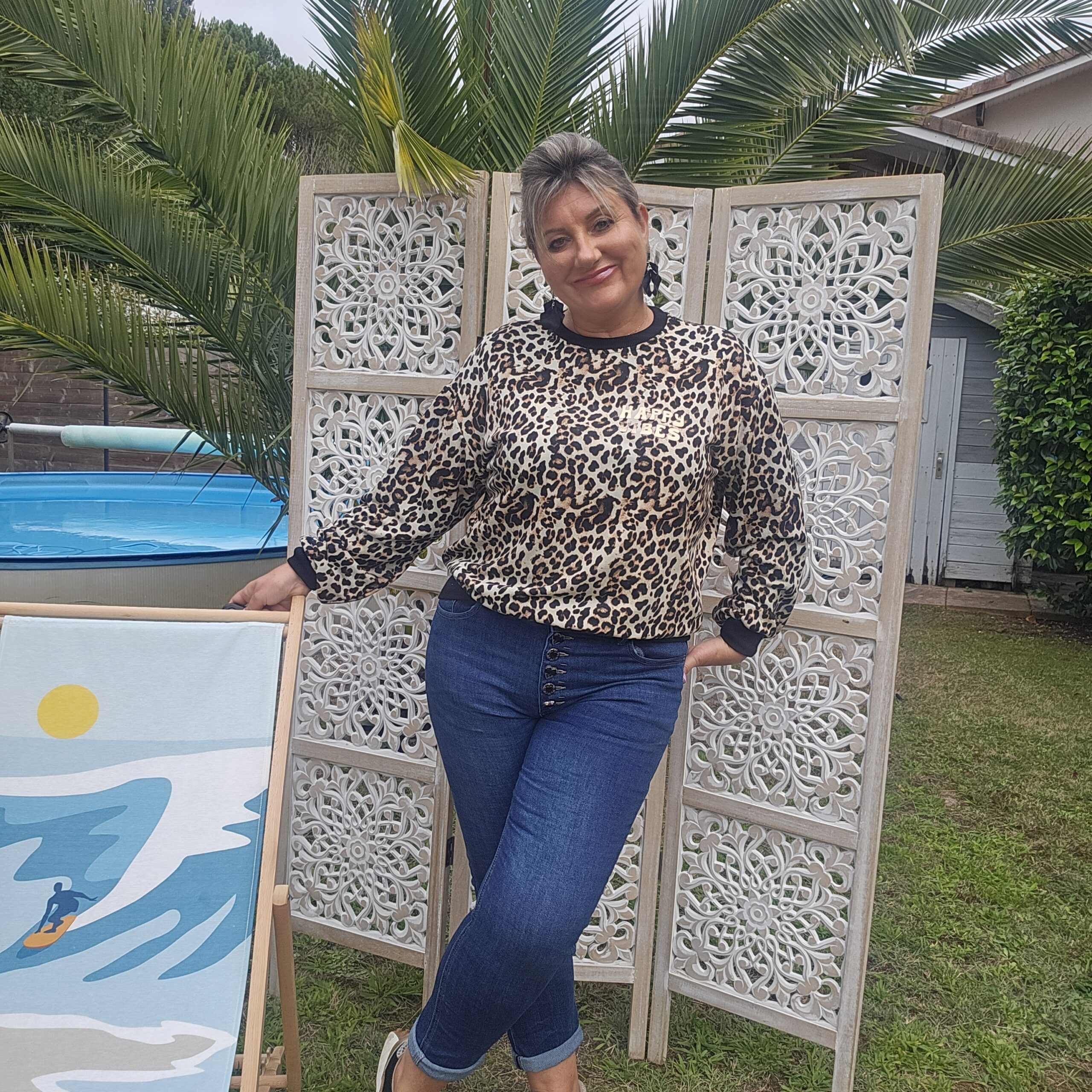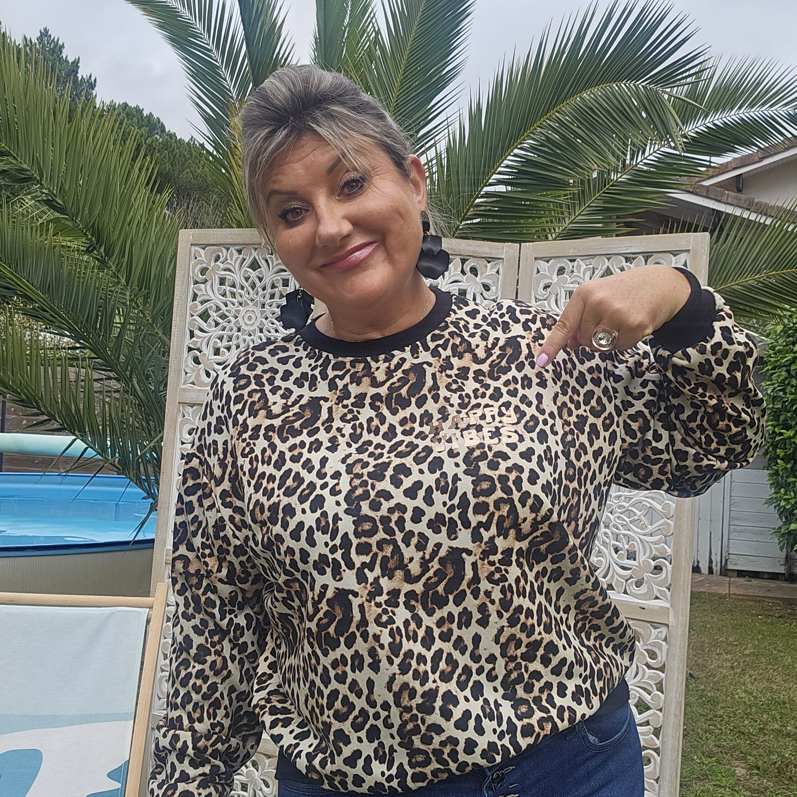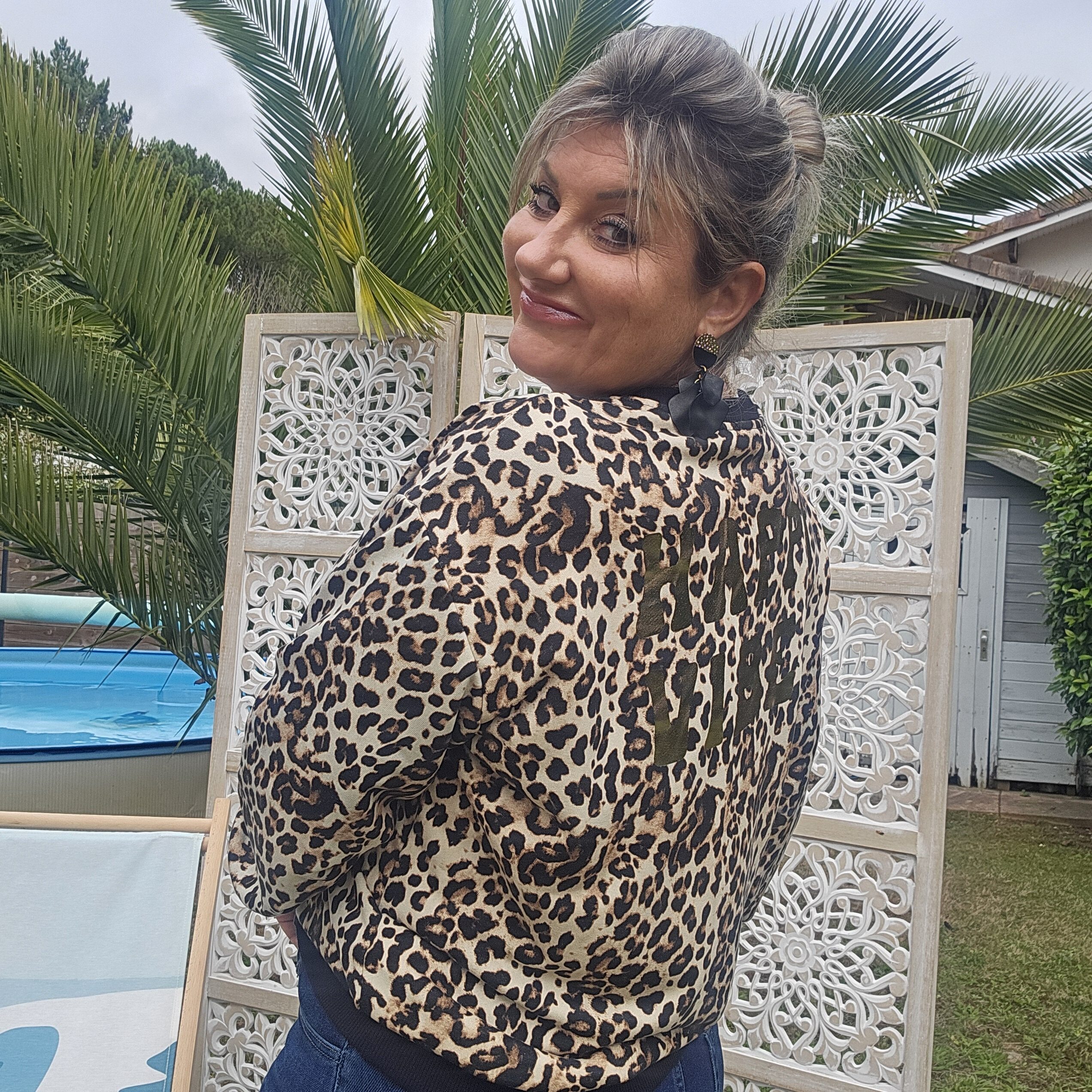 Sweat imprimé léopard, écriture HAPPY VIBES en doré en petit devant et en grand dans le dos. Jersey au bout des manches et au col. Manches longues. Coupe ample et confortable pour un look frais et élégant. TU