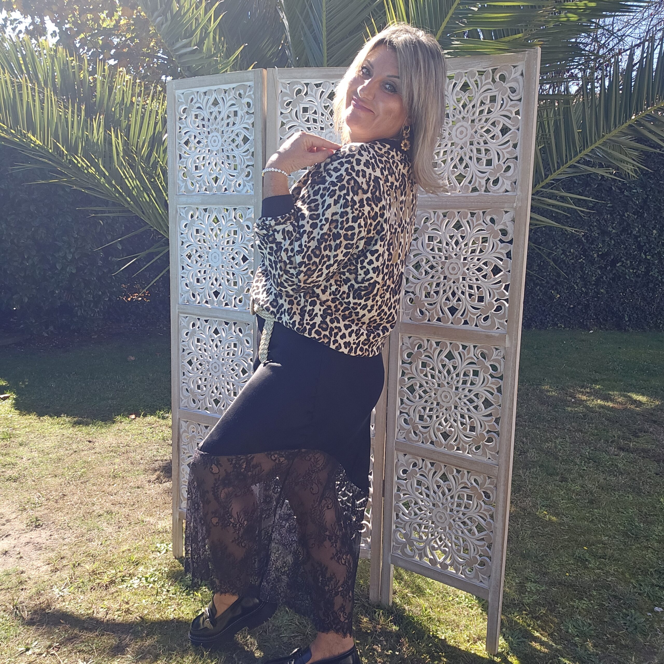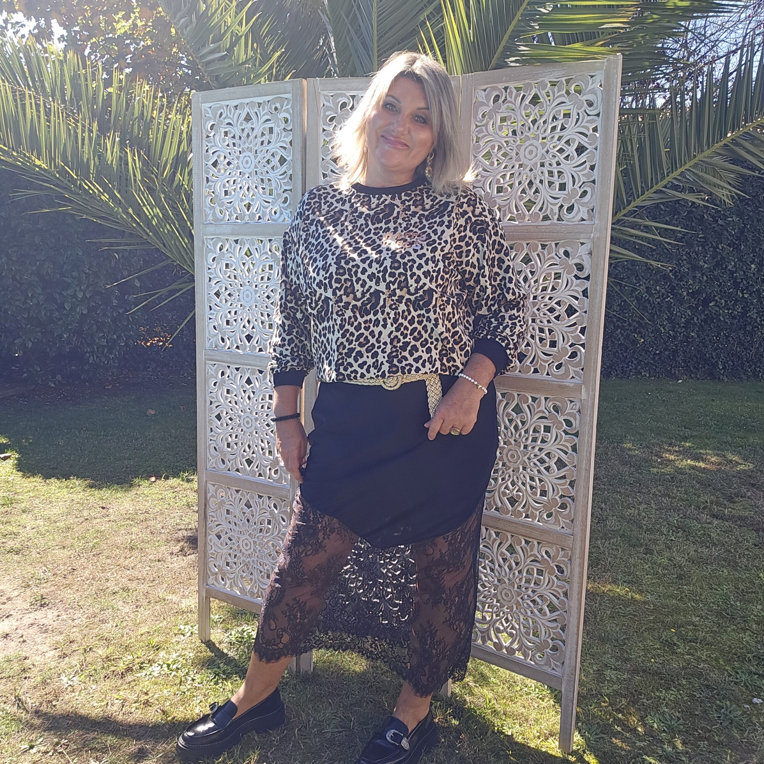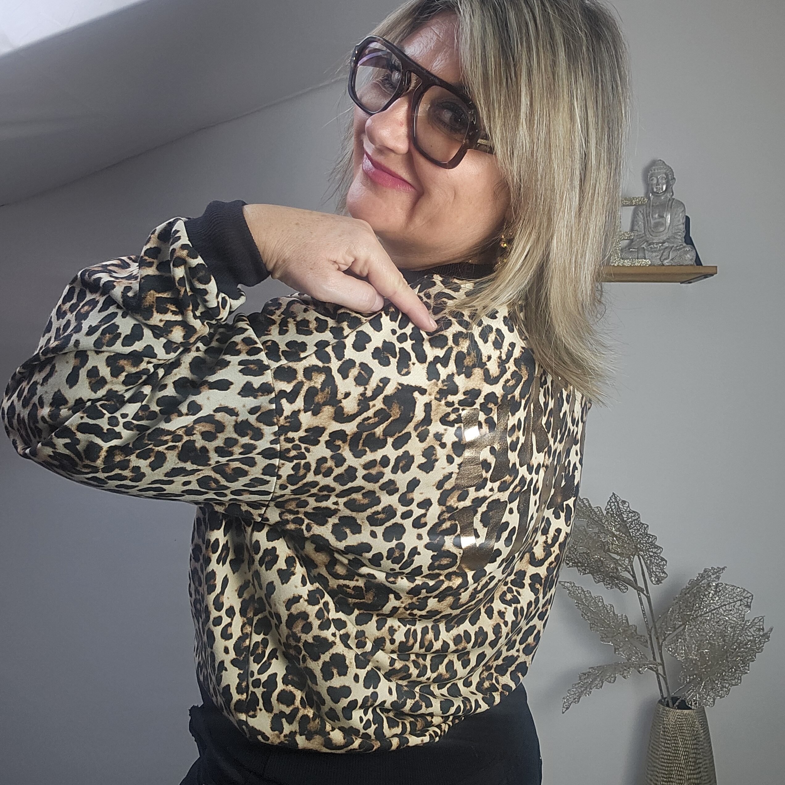 Mon regard pailleté : Sweat en léopard avec écriture HAPPY VIBES en doré, est indispensable et à avoir absolument dans sa garde robe ! Il vous apportera un look frais et élégant pour cet automne ! Peut se porter avec un jean’s bleu, gris ou noir. Convient à toutes les morphologies !