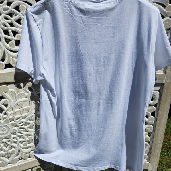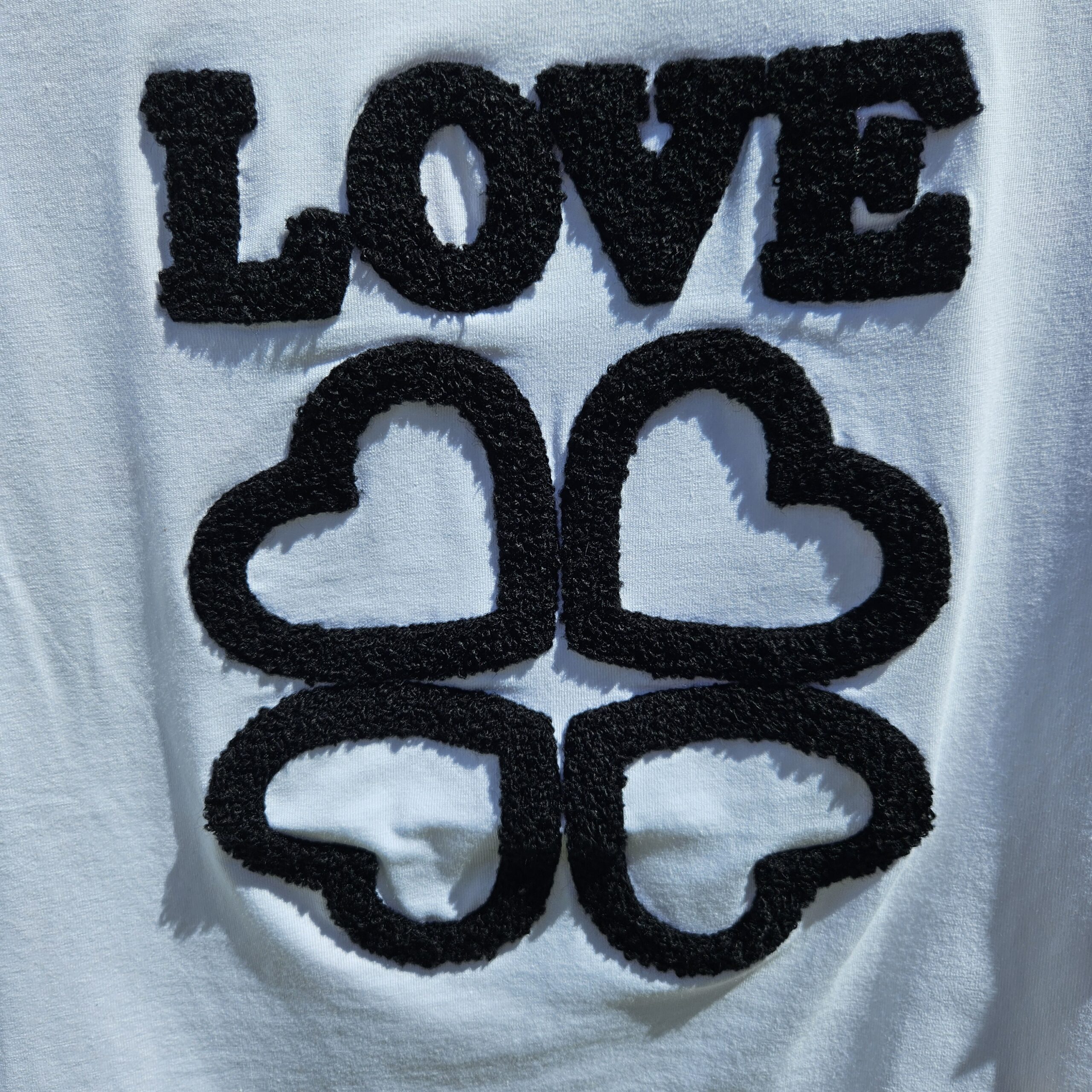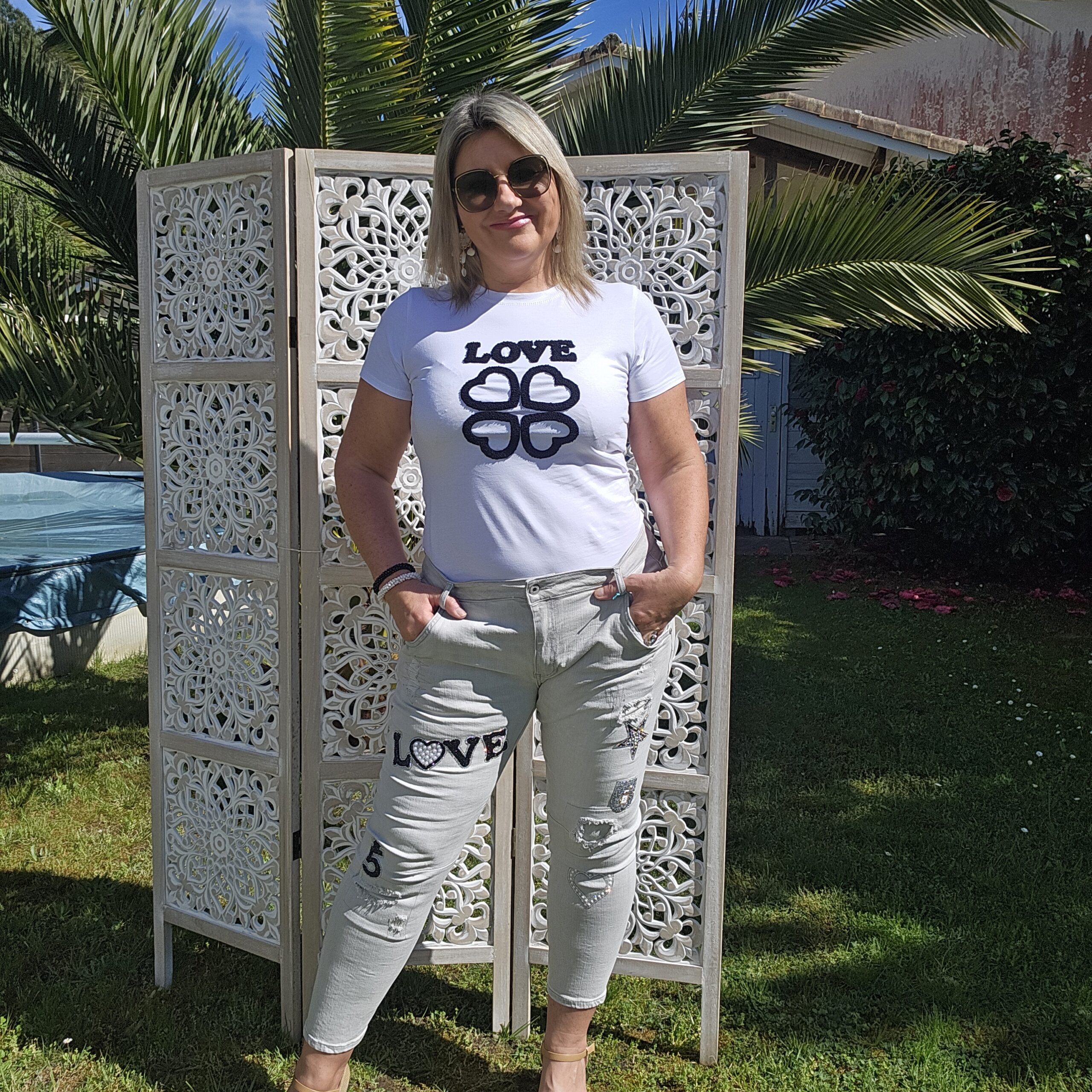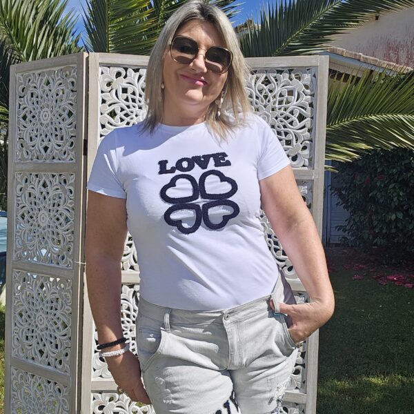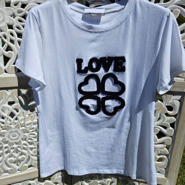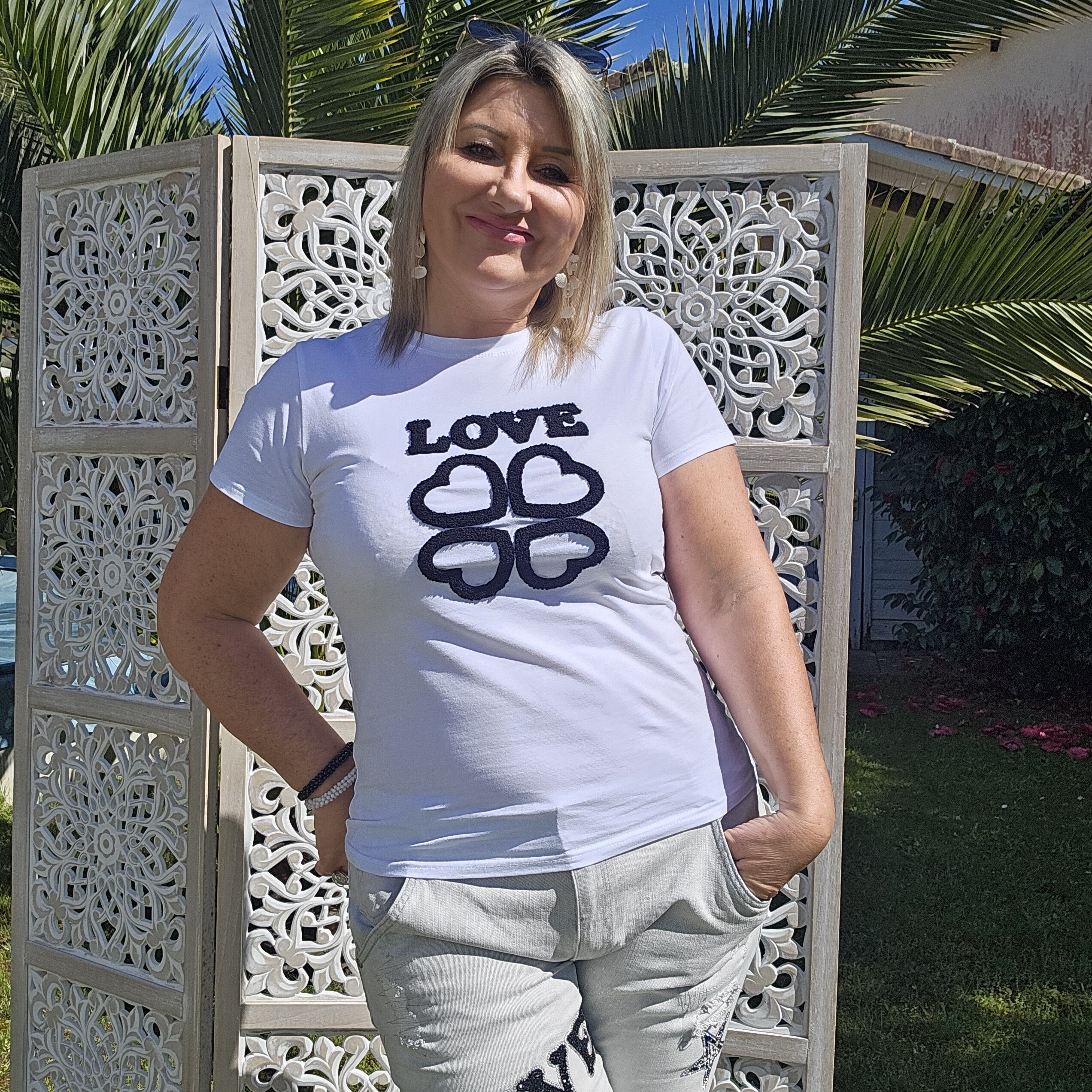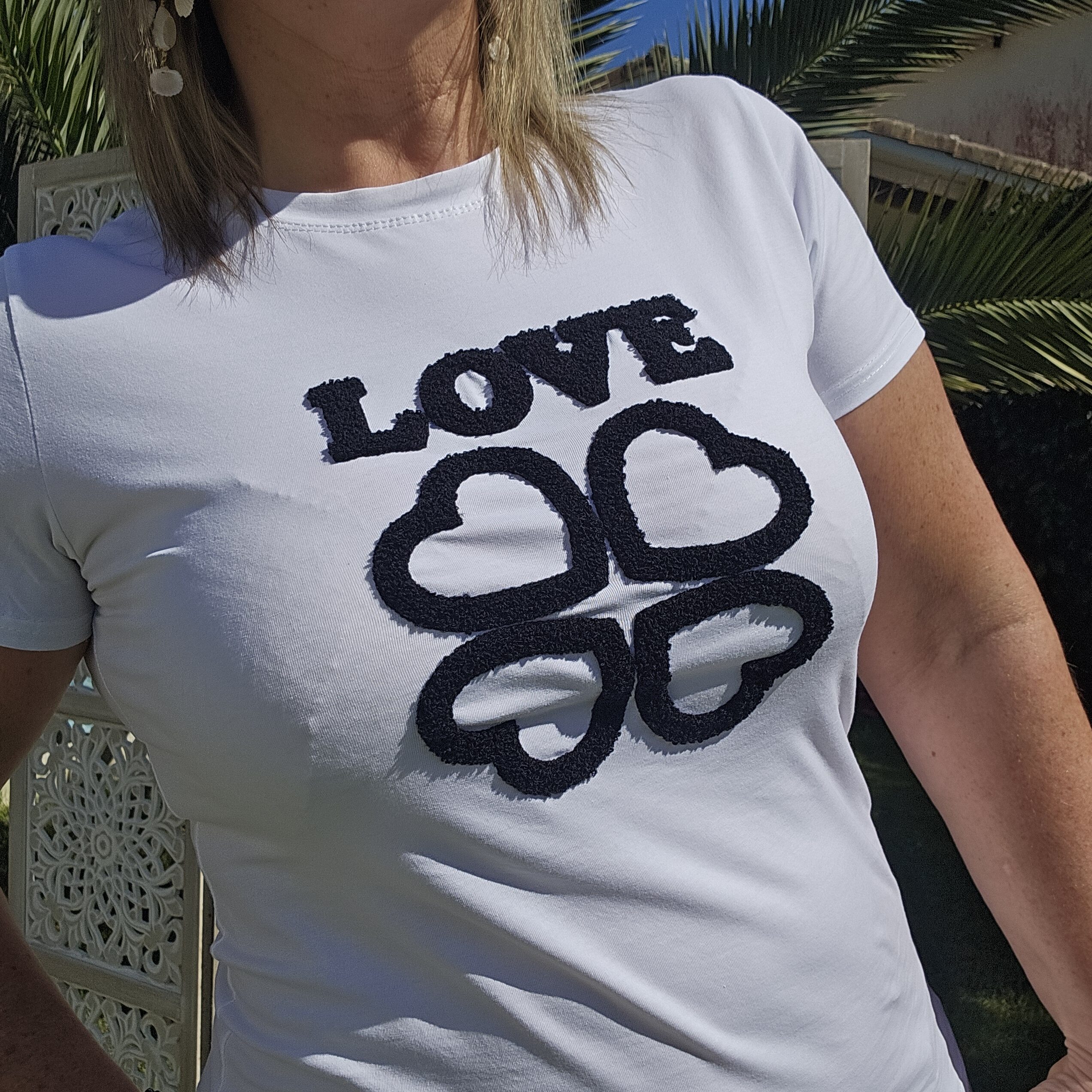 T shirt blanc, manches courtes, col arrondit, écriture « LOVE » en noir, en relief et moumoute. Le mélange de coton et d’élasthanne rend ce t shirt très confortable et extensible. Existe en S/M ou M/L