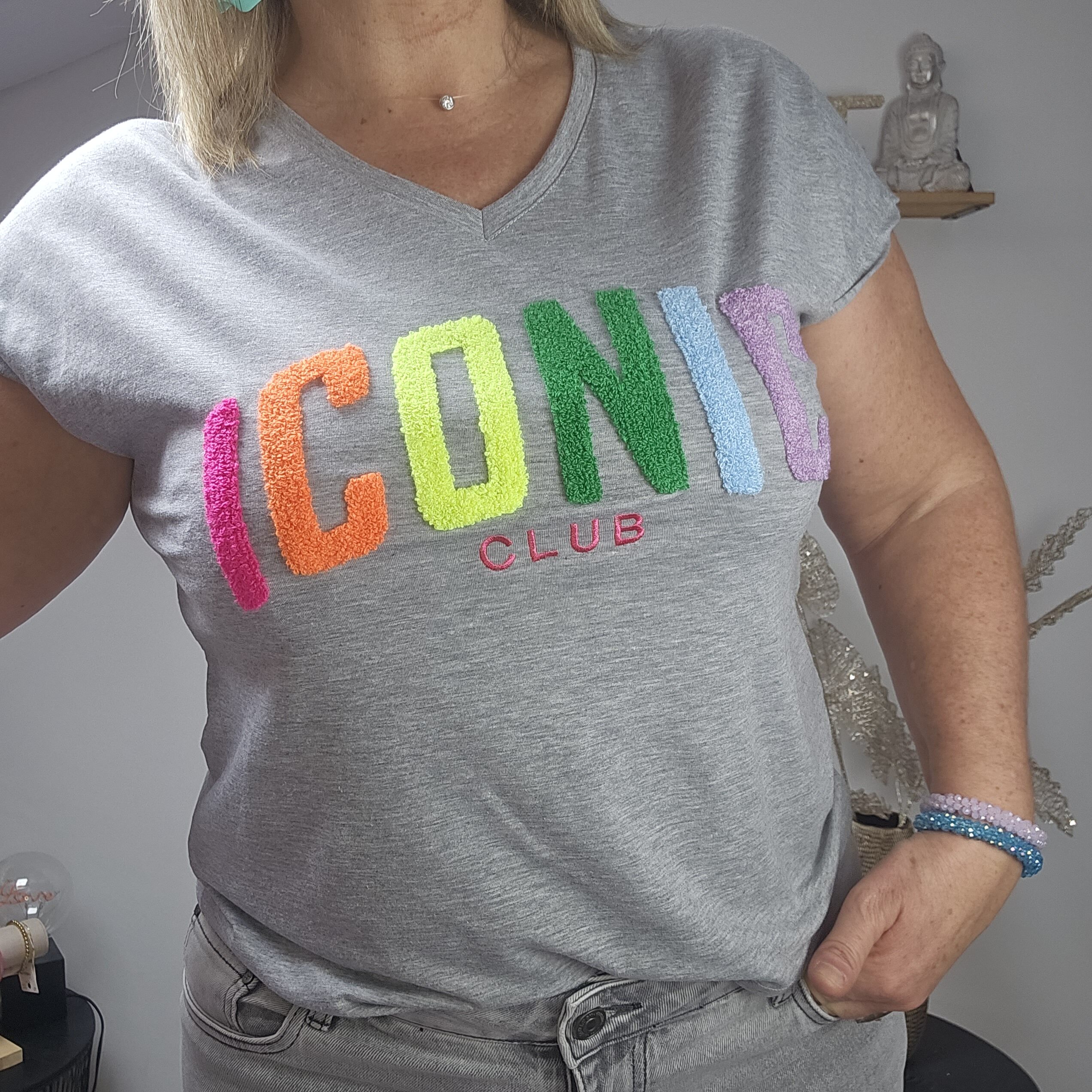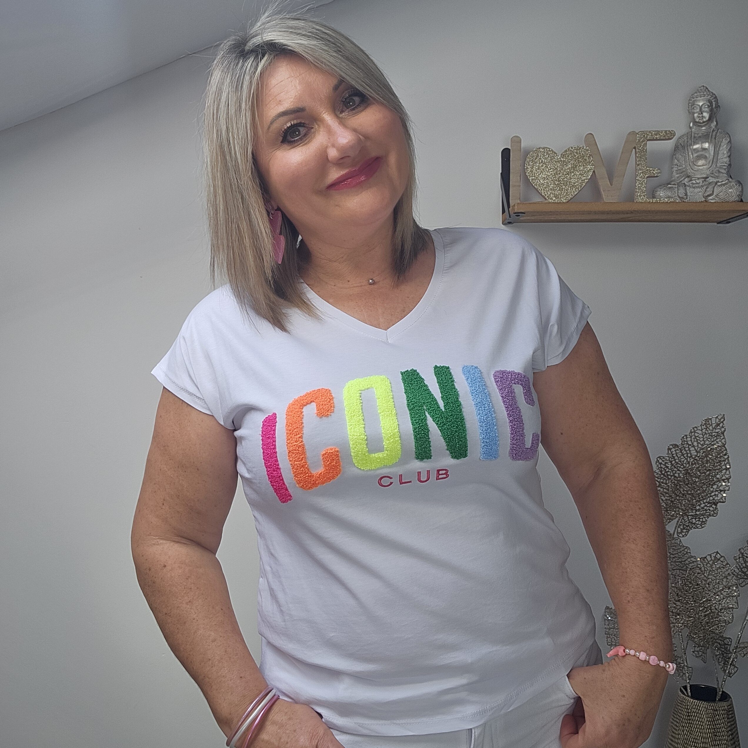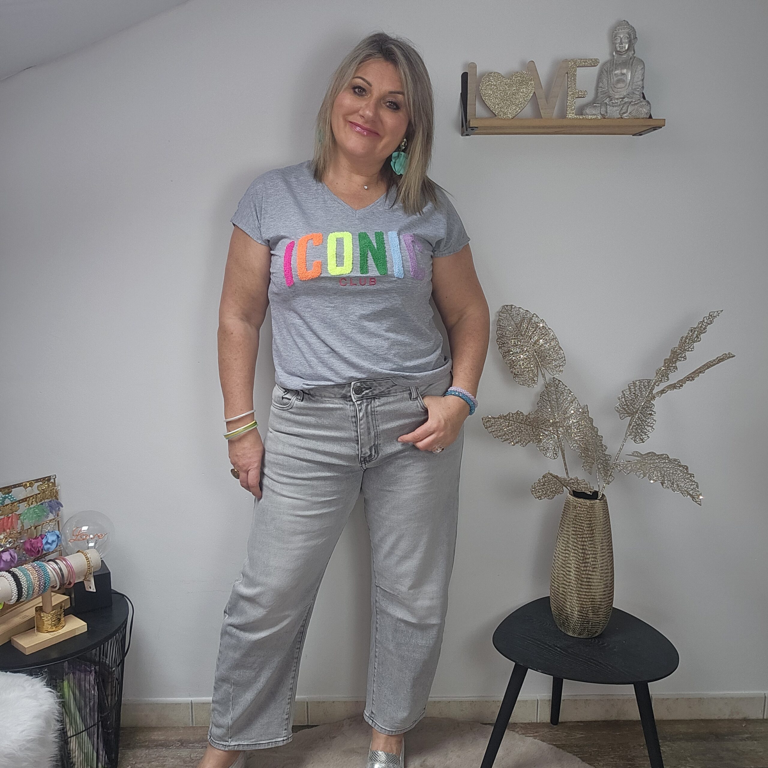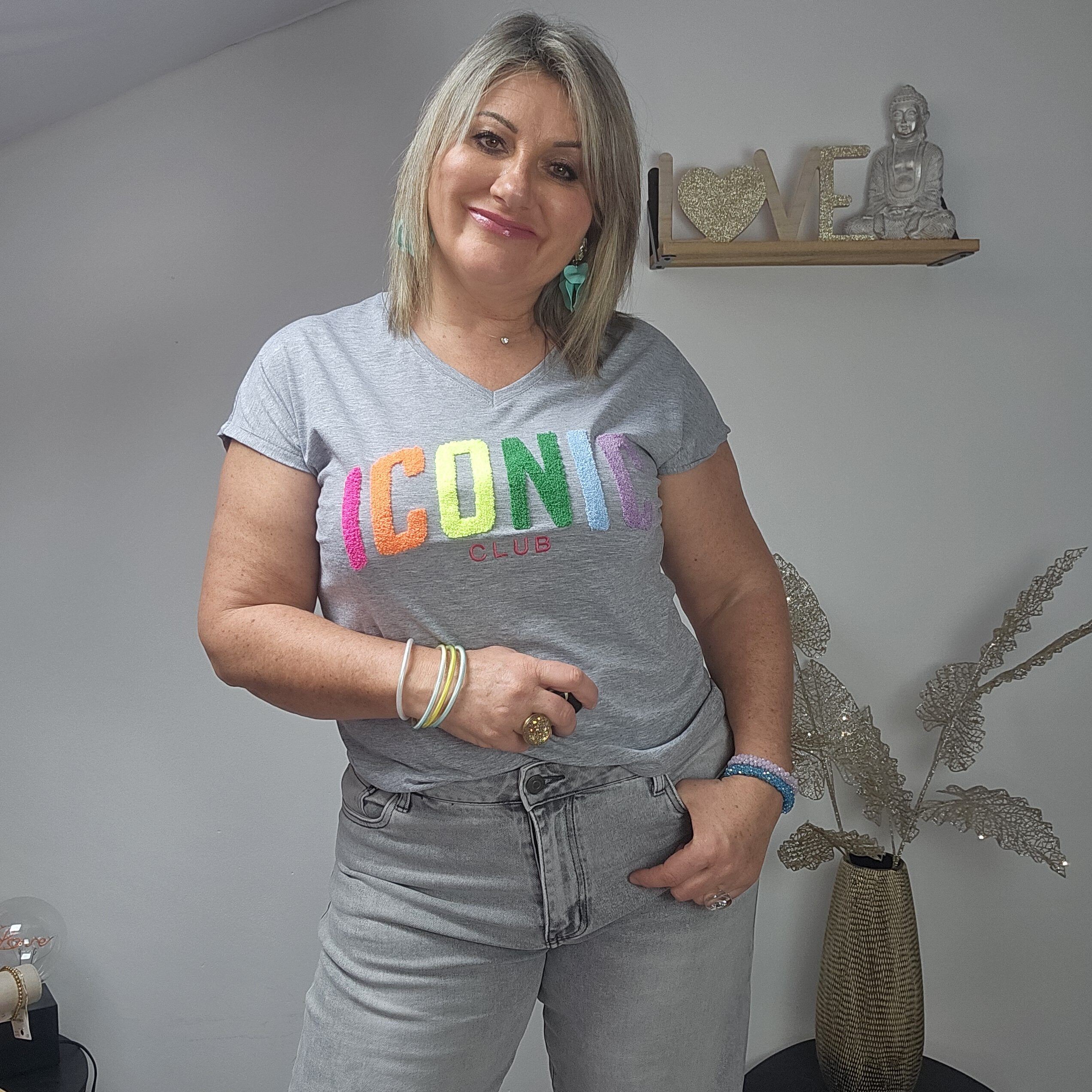 Mon regard pailleté : T shirt ICONIC tendance, idéal pour le printemps/été, à associer avec le gilet oversize 3 cœurs et les BO créoles.