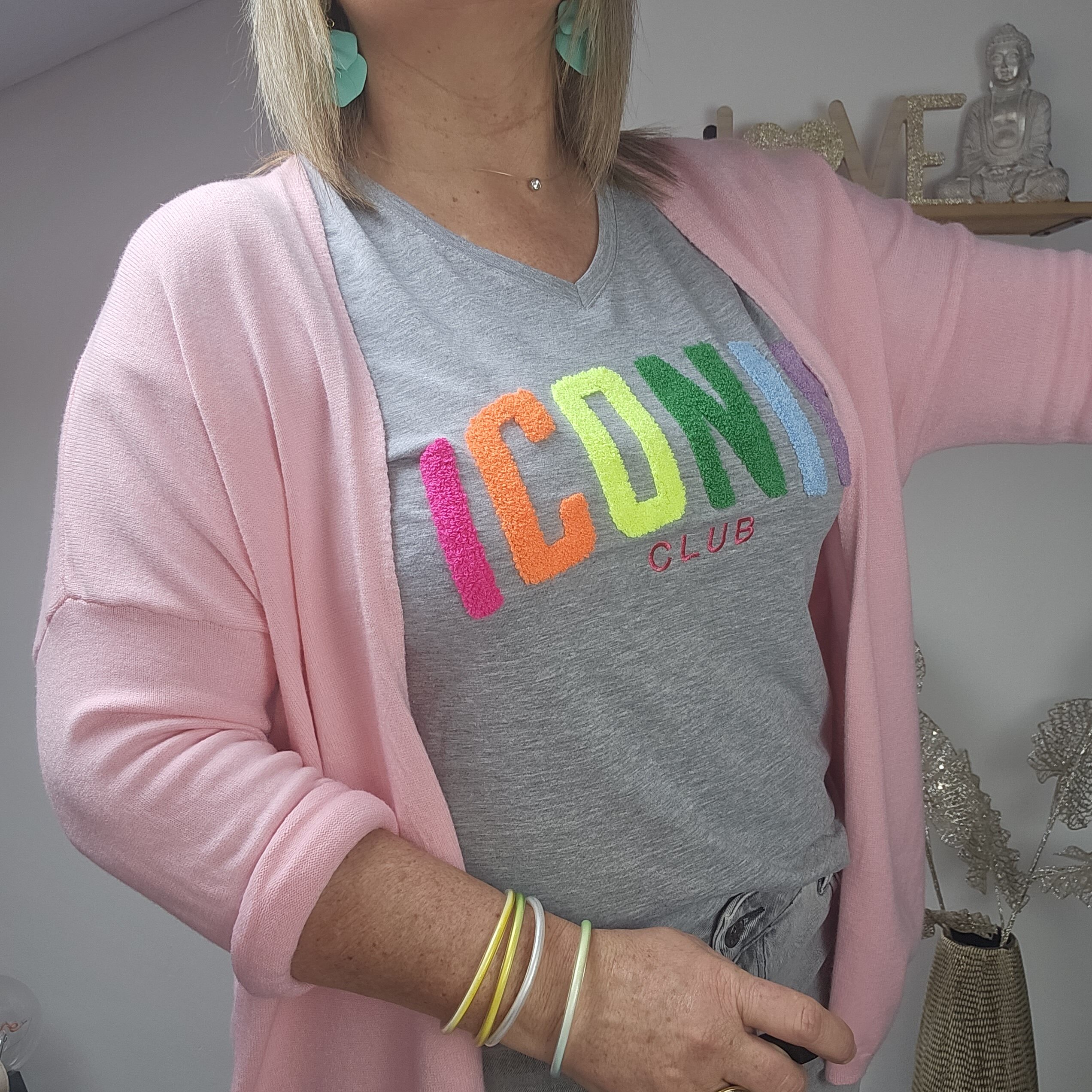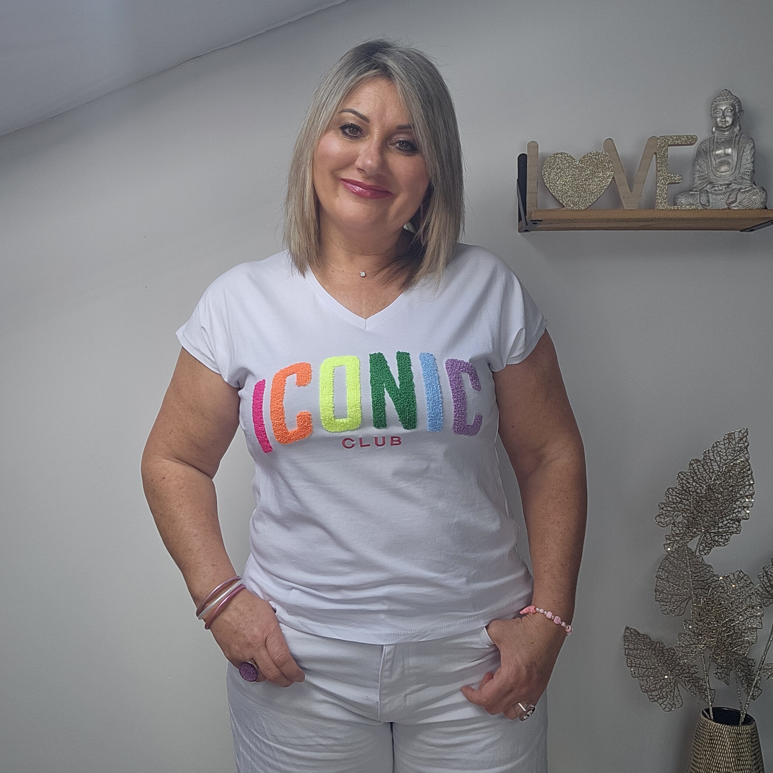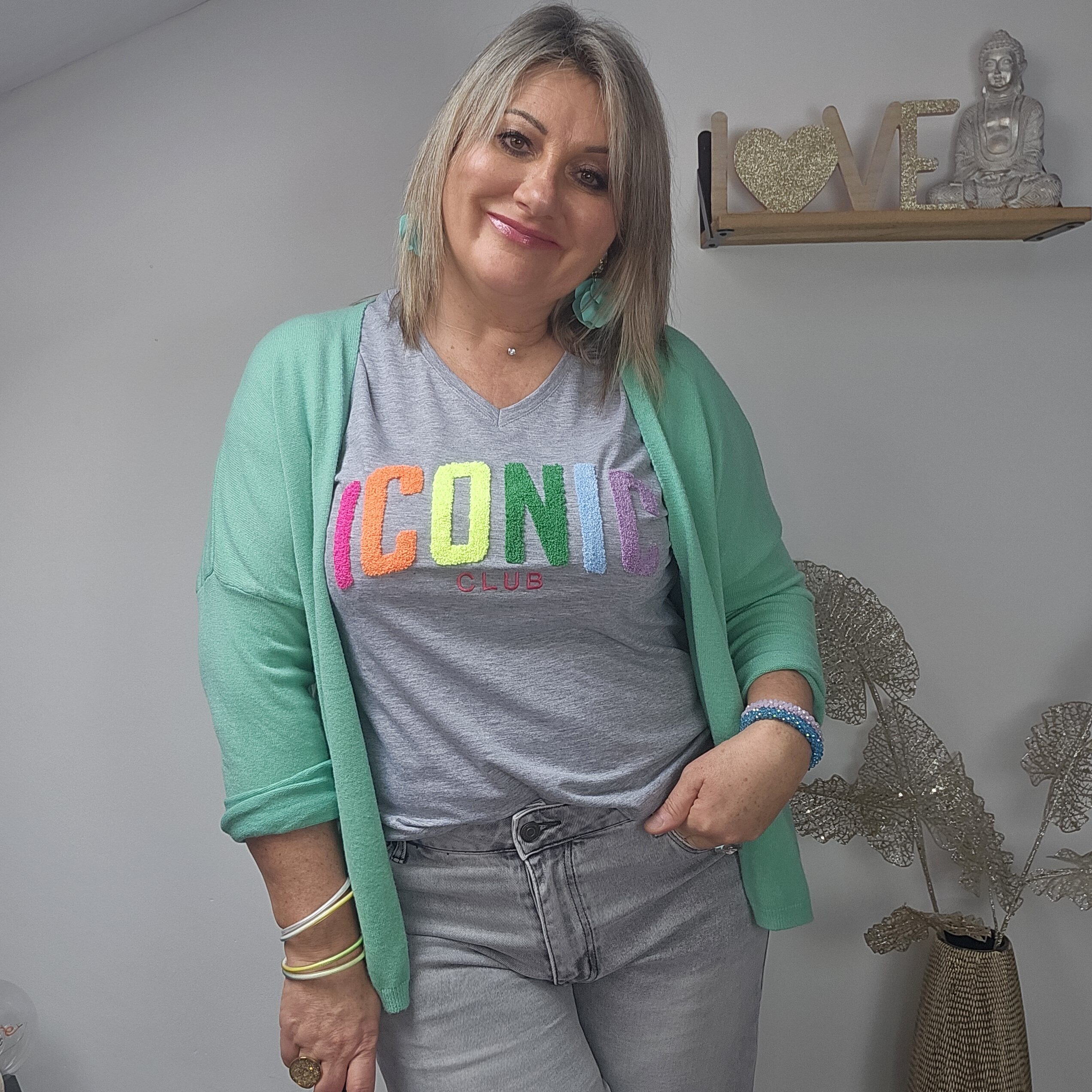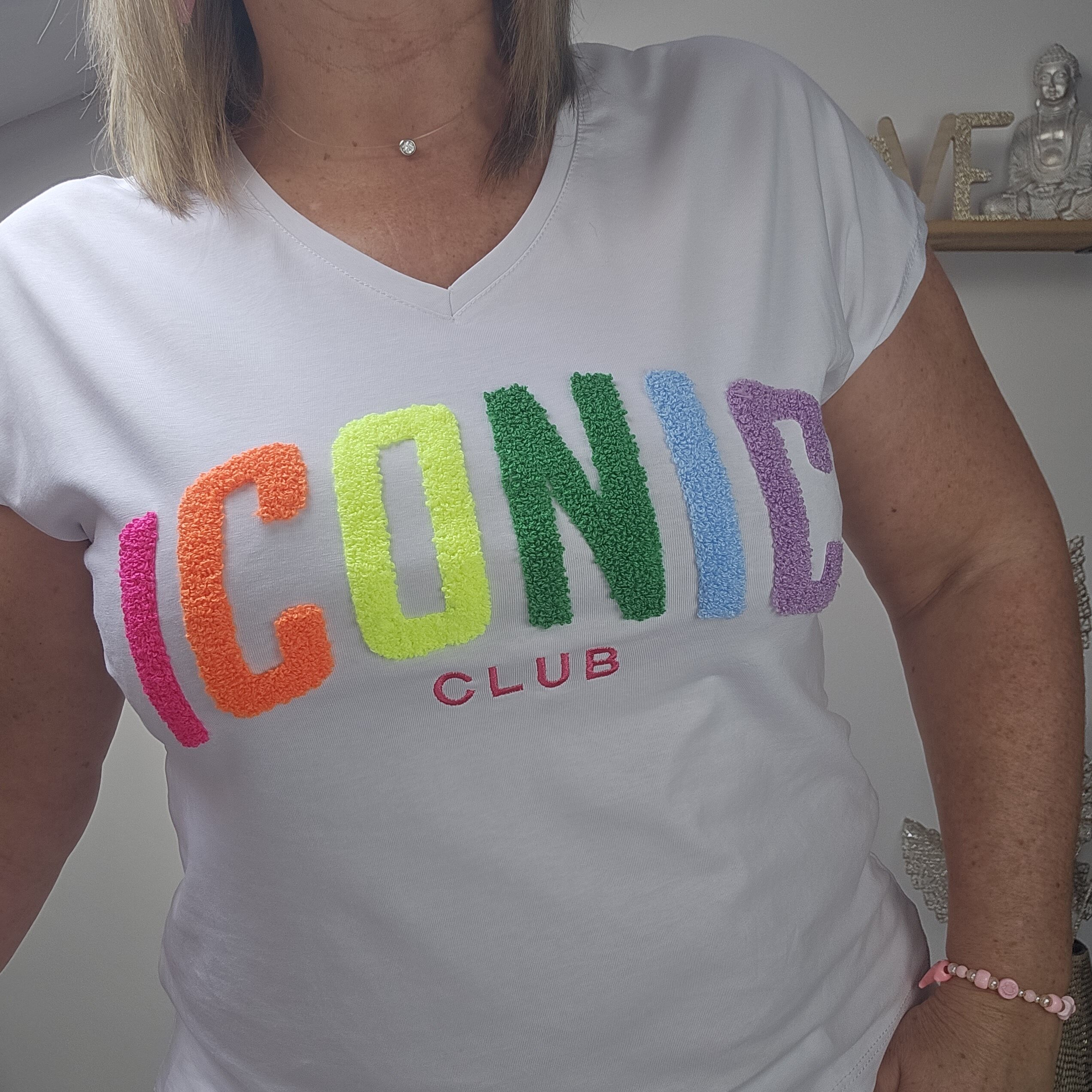 Mon regard pailleté : T shirt ICONIC tendance, idéal pour le printemps/été, à associer avec le gilet oversize 3 cœurs et les BO créoles.