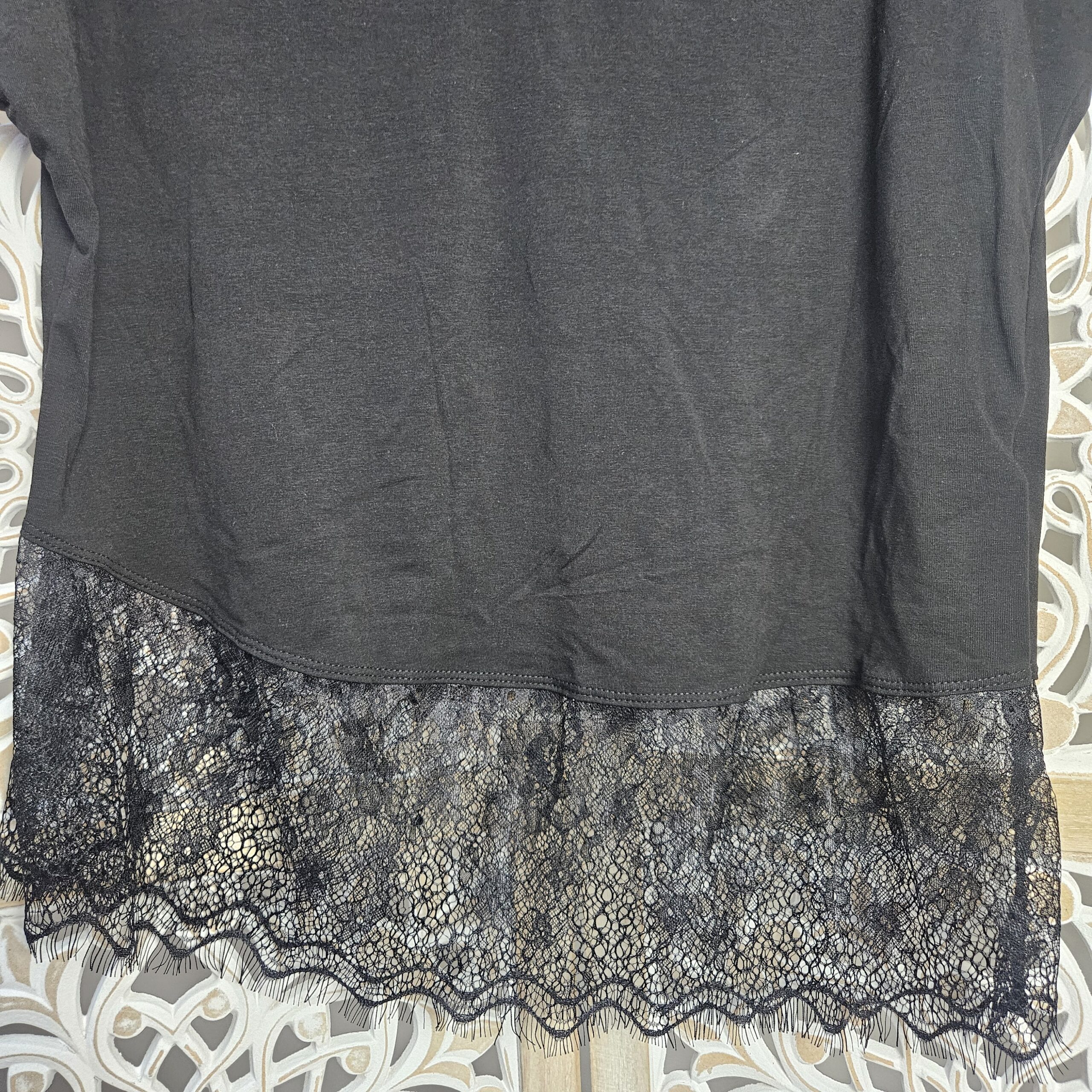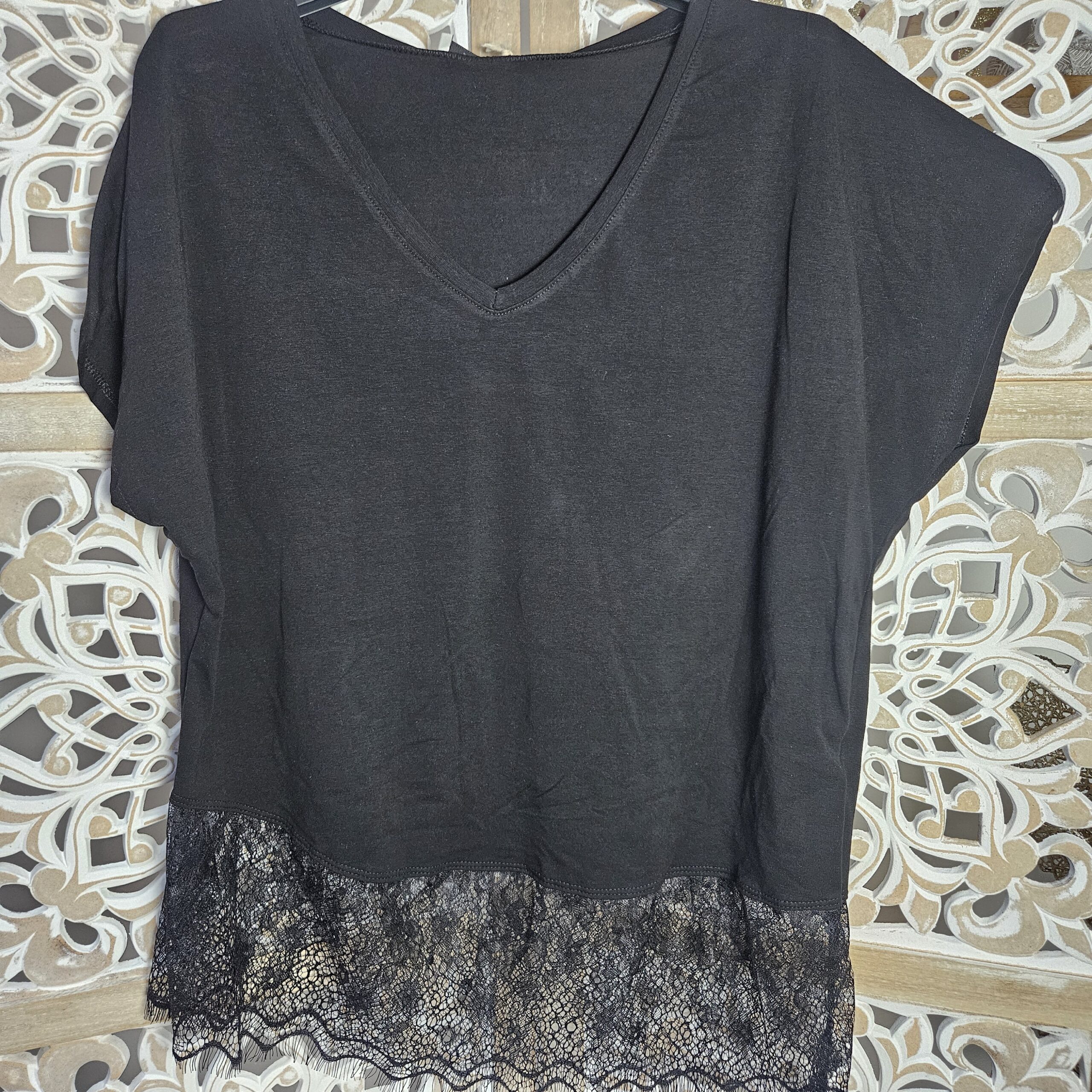 T shirt noir col V, oversize, manches courtes, au bas du t shirt ajout de dentelle asymétrique. TU