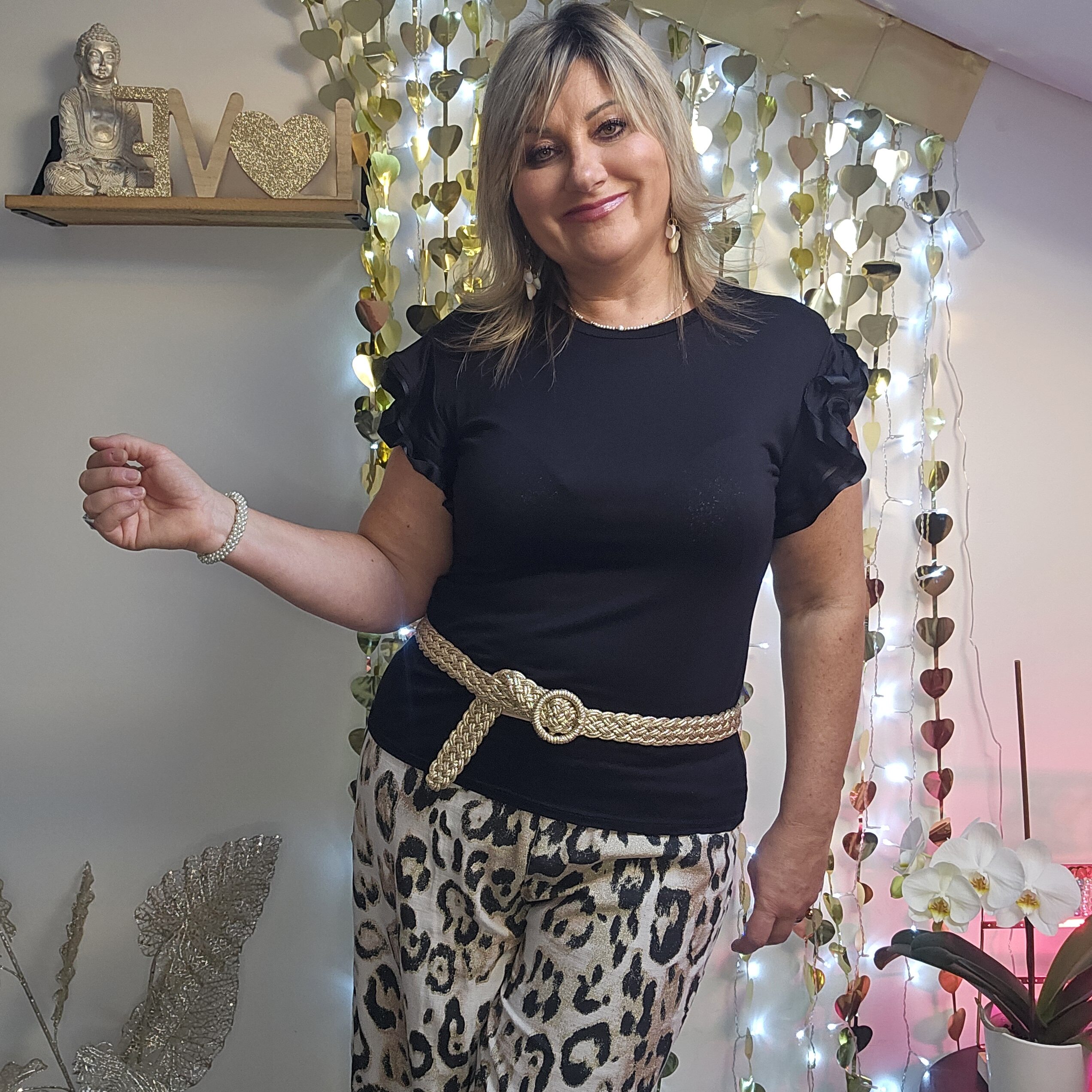 T shirt EZIA noir fluide manche froufrou (liseré de tissu épais ), col rond. Très confortable par sa matière douce et extensible.
