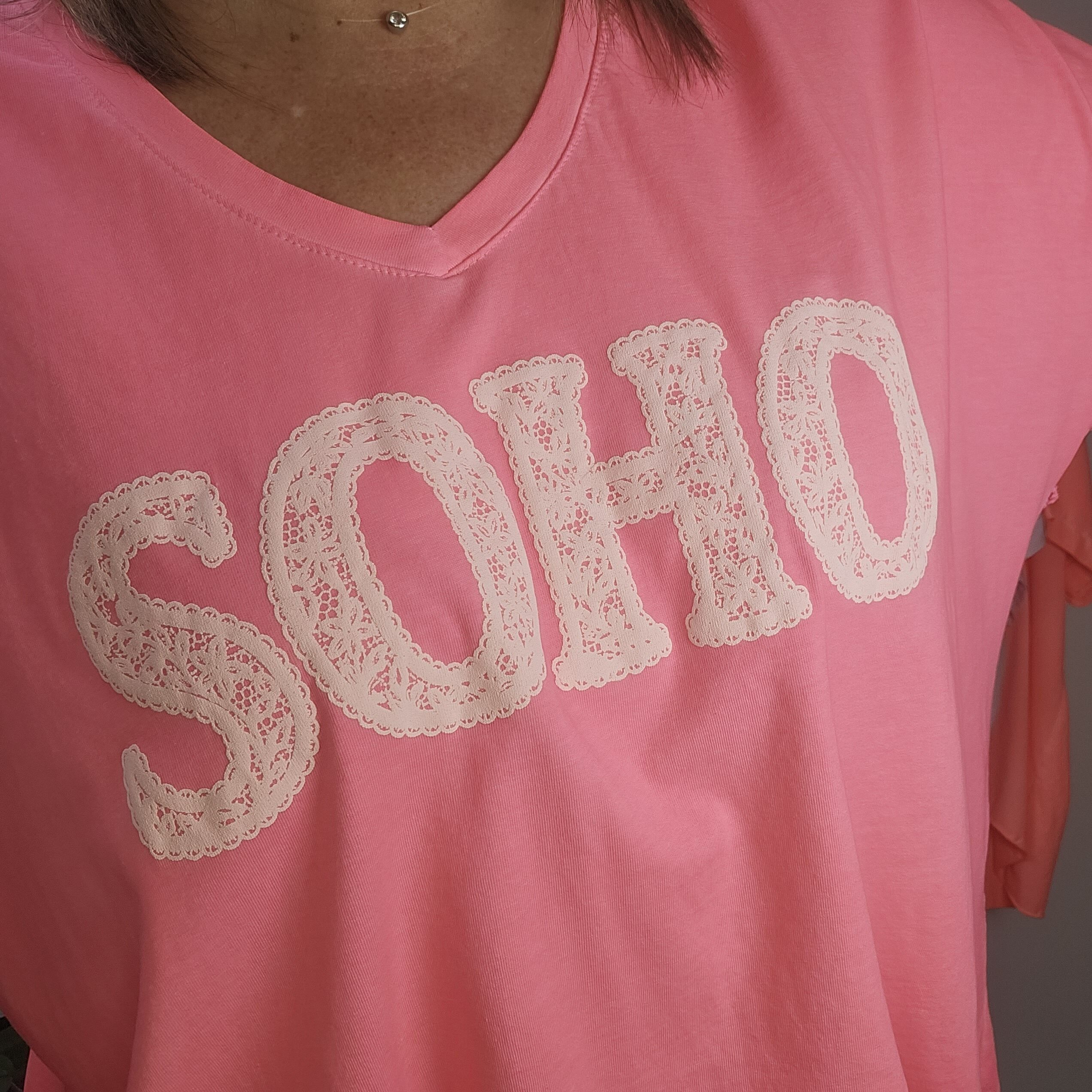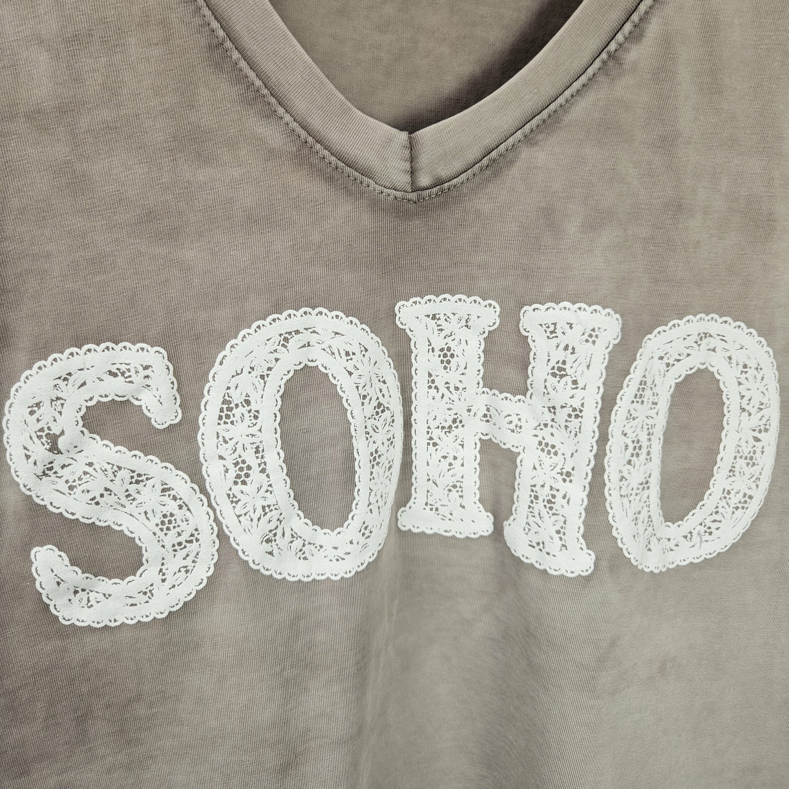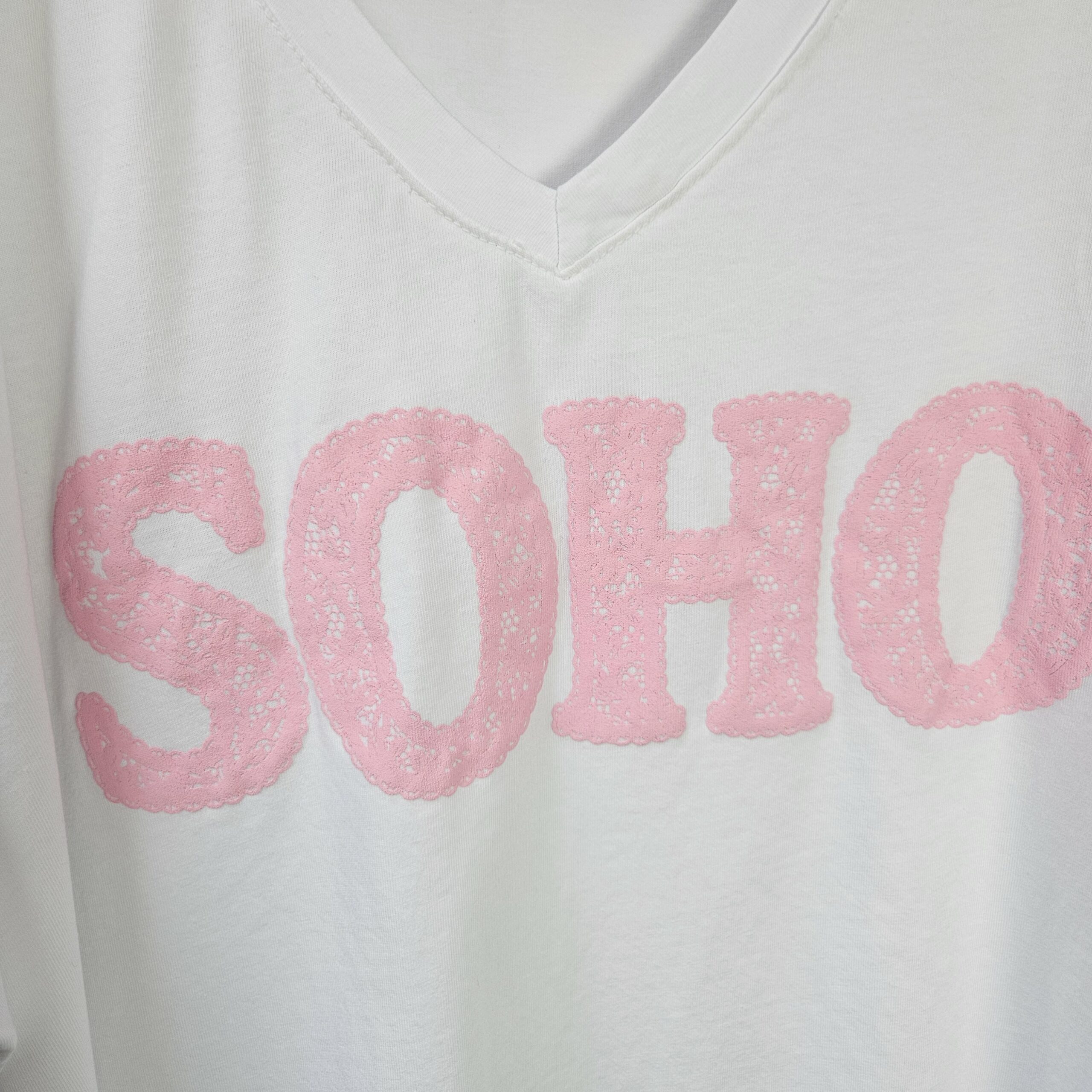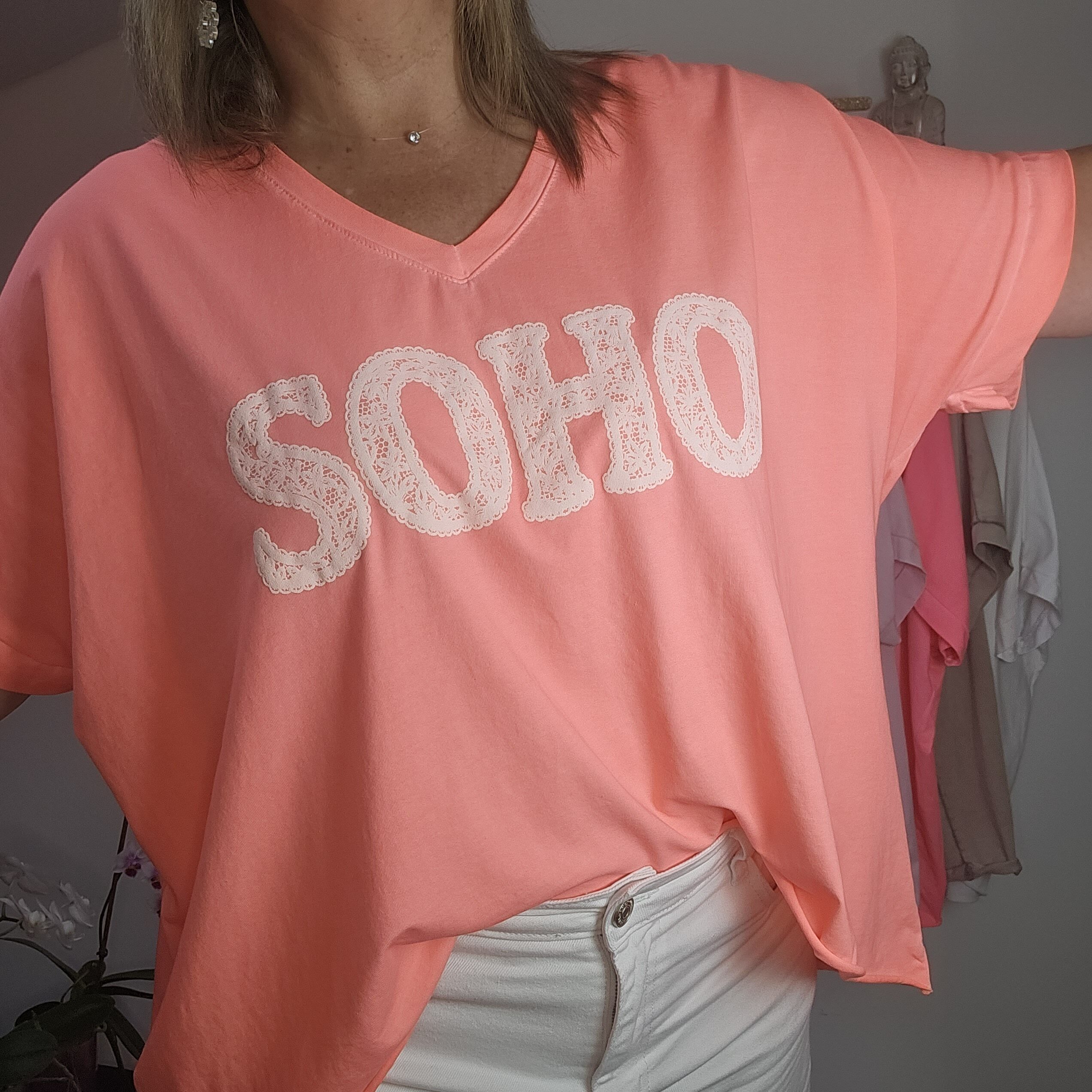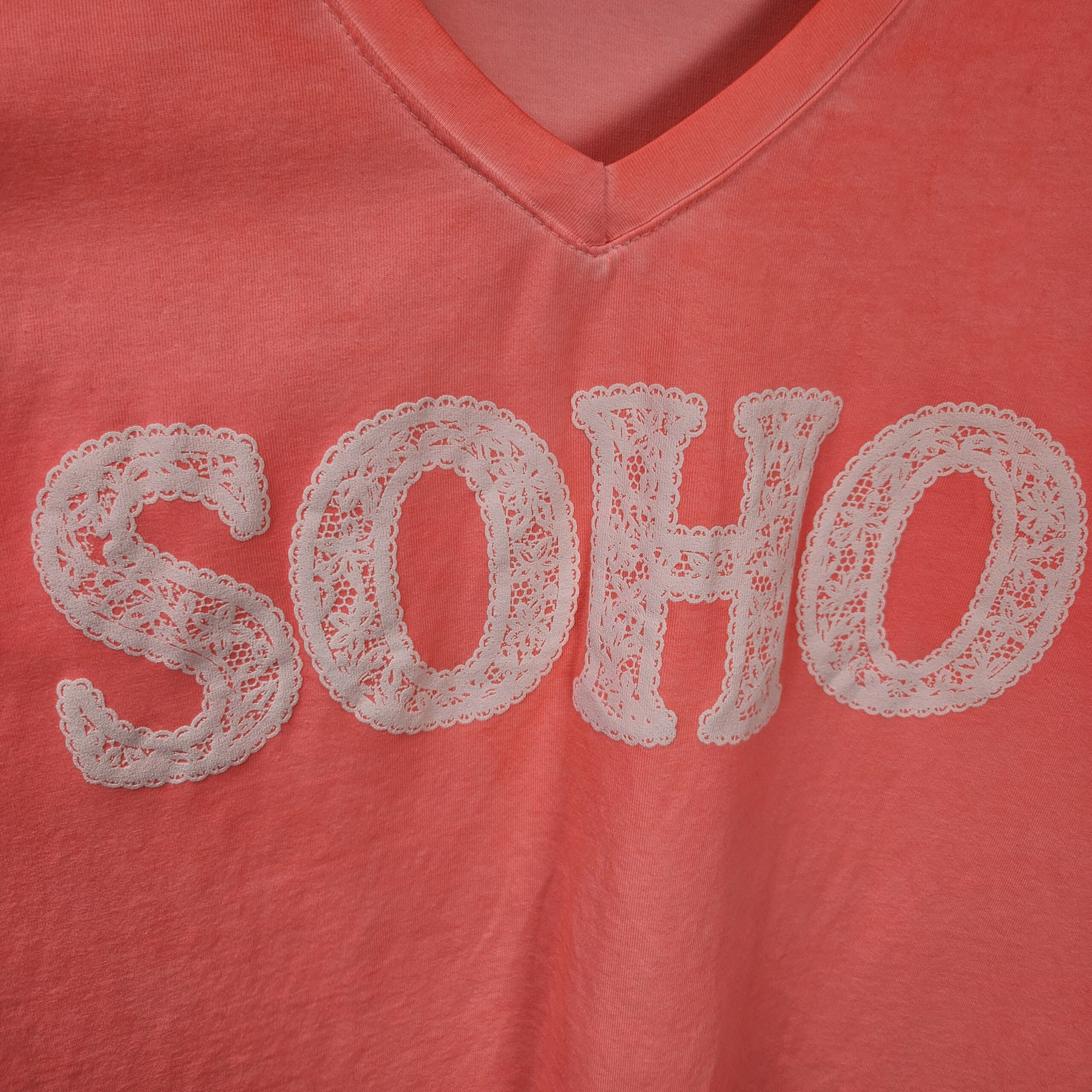 T shirt oversize col V, délavé, manches courtes, inscription SOHO en impression dentelle. Plus court devant que derrière. TU