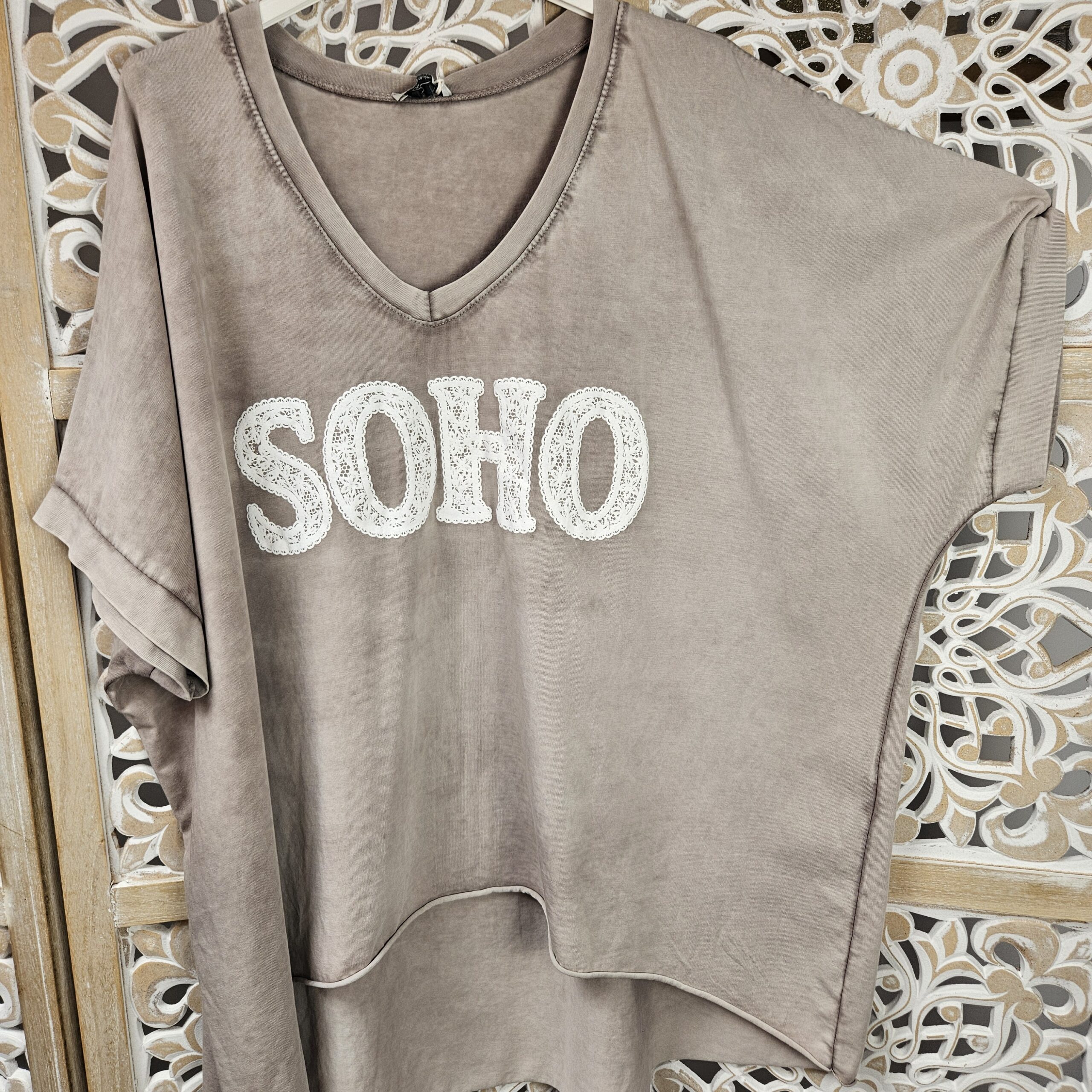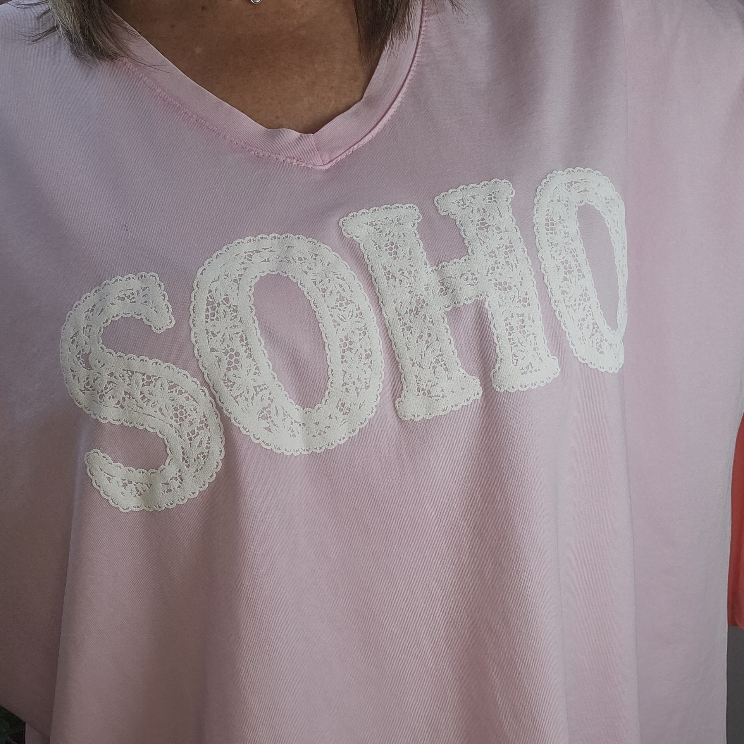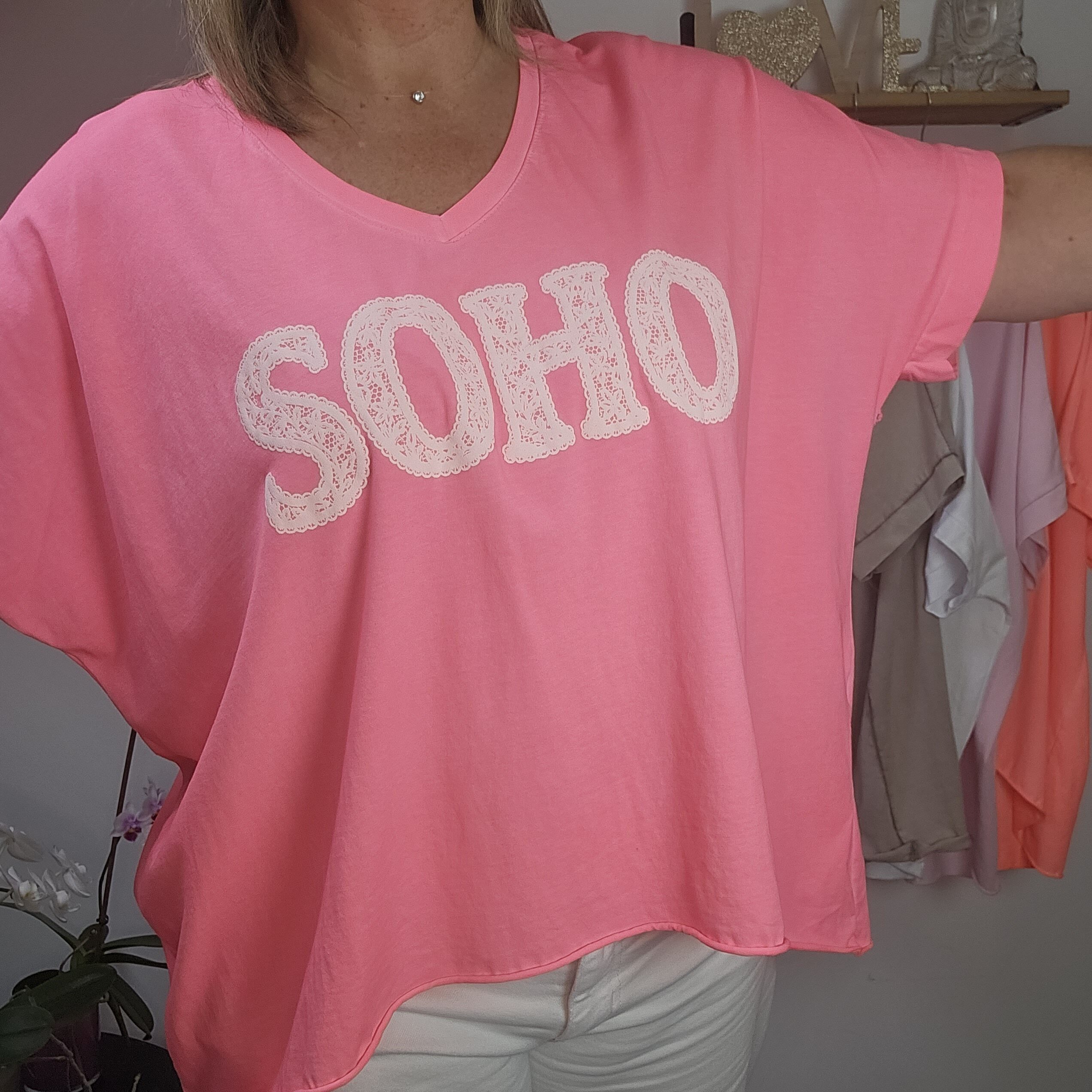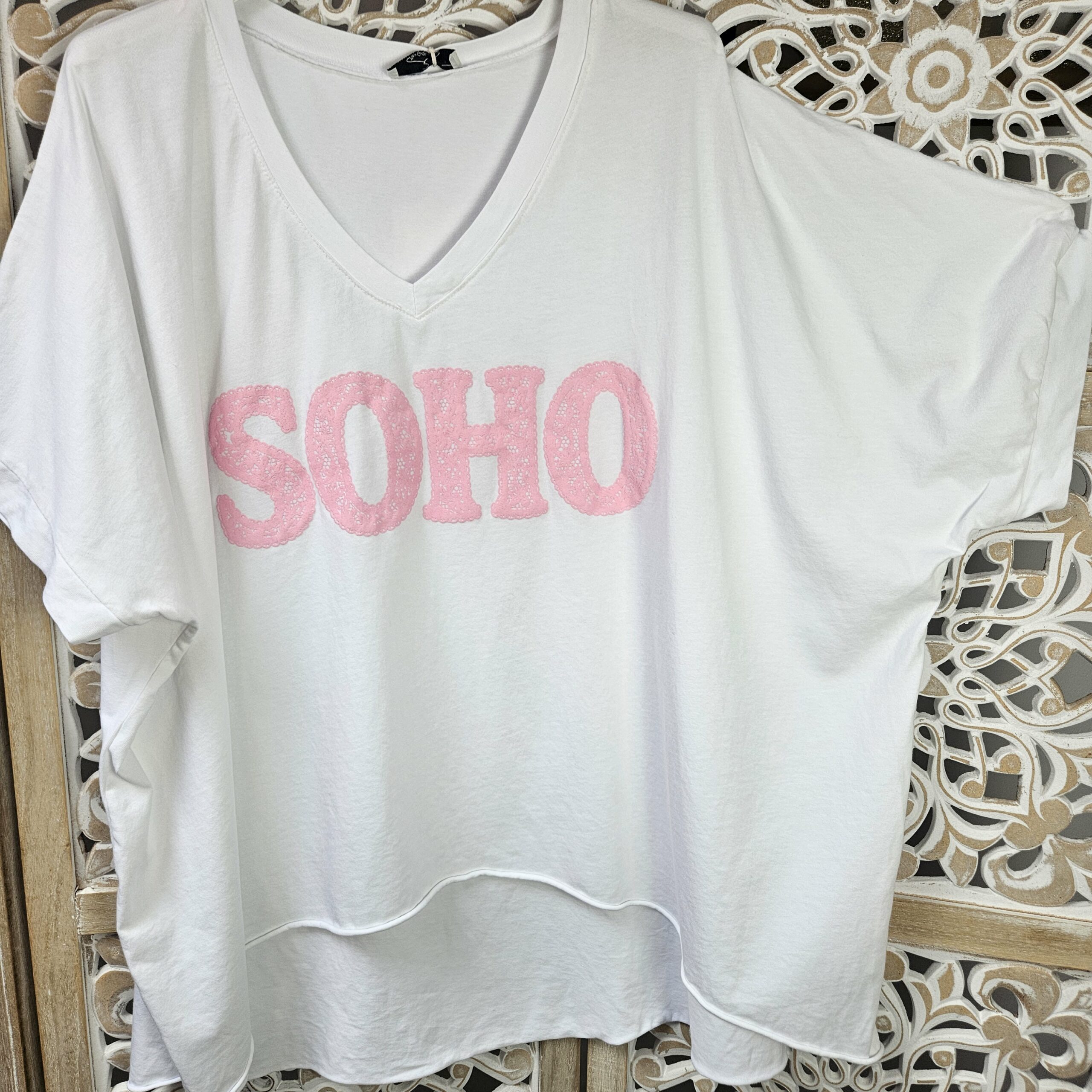 T shirt oversize col V, délavé, manches courtes, inscription SOHO en impression dentelle. Plus court devant que derrière. TU