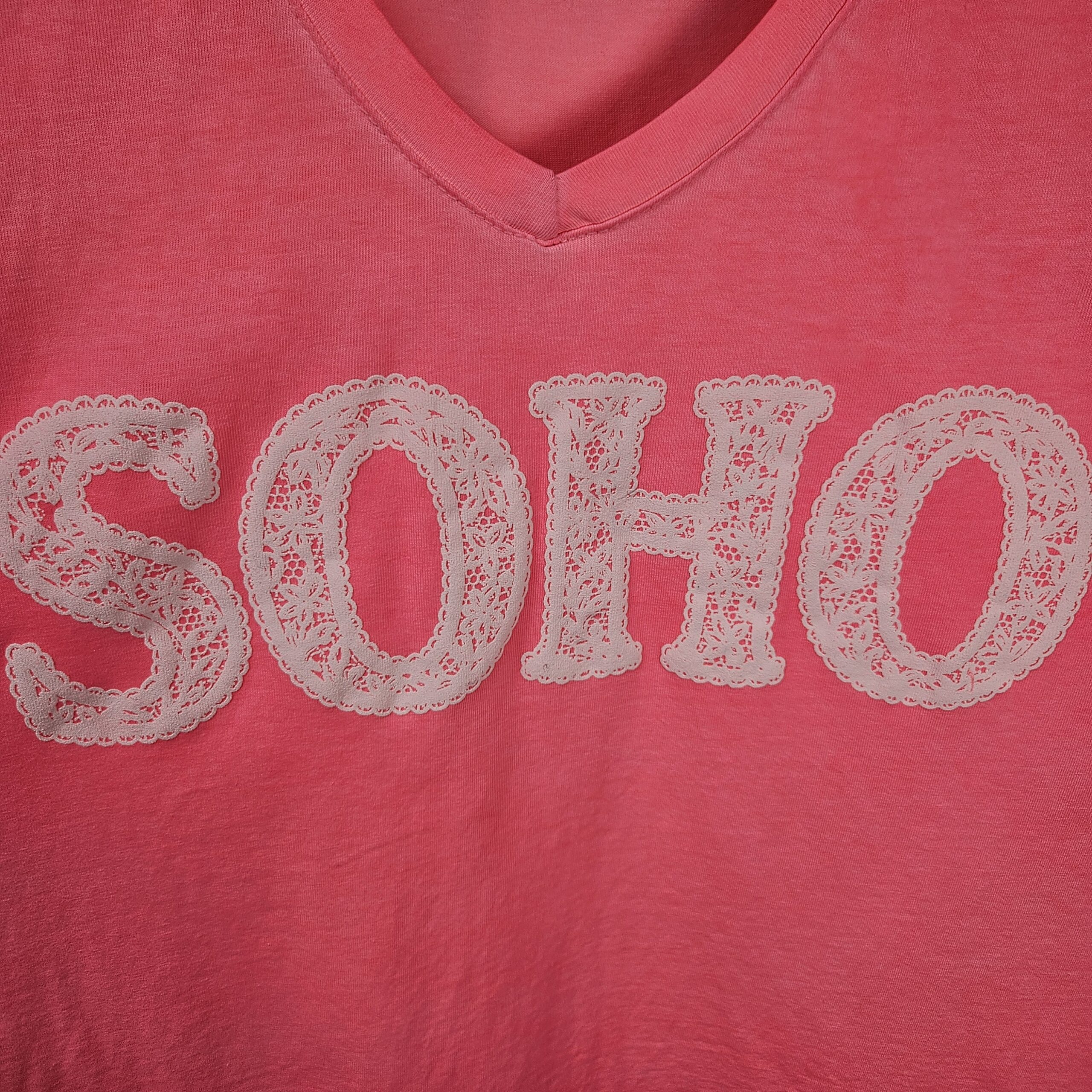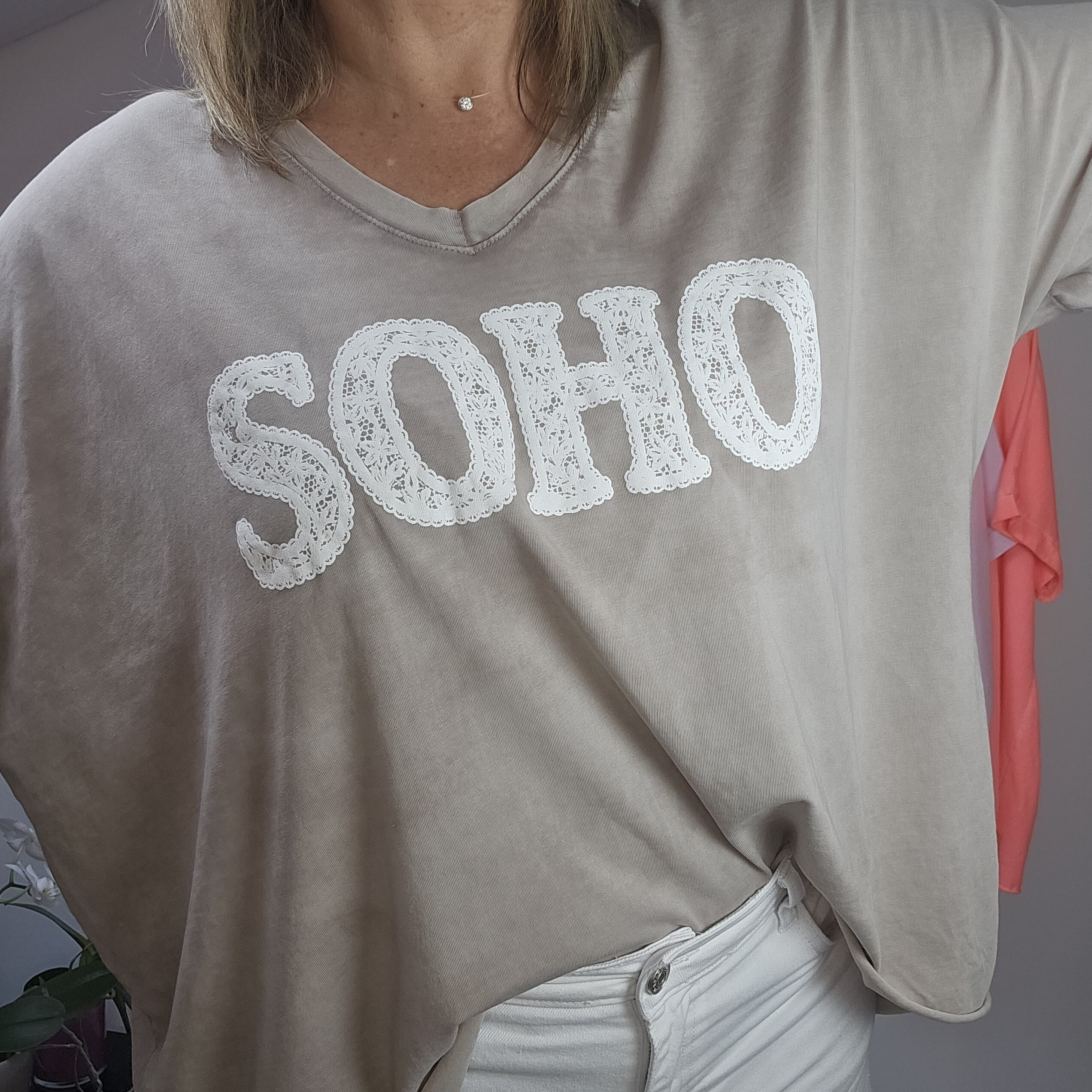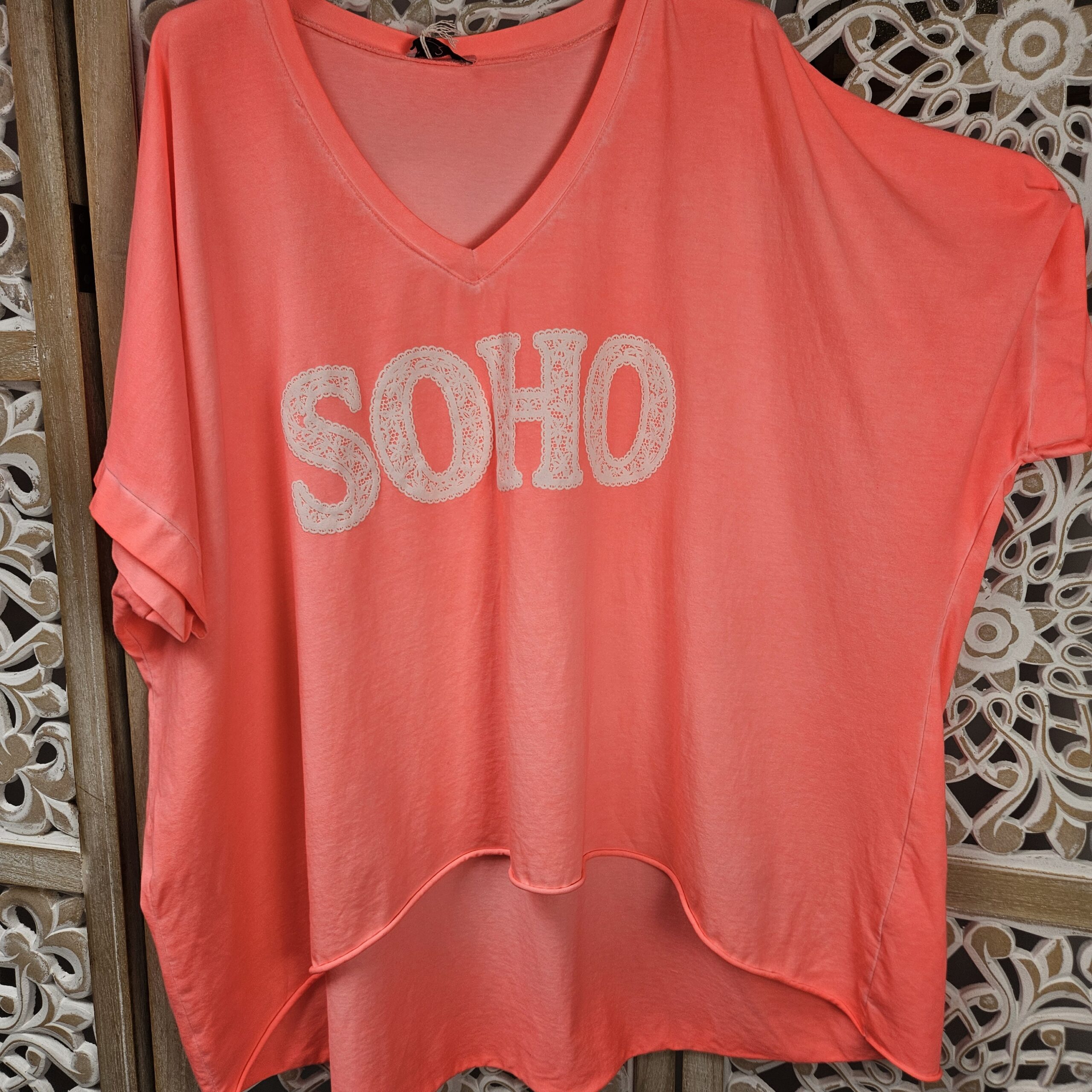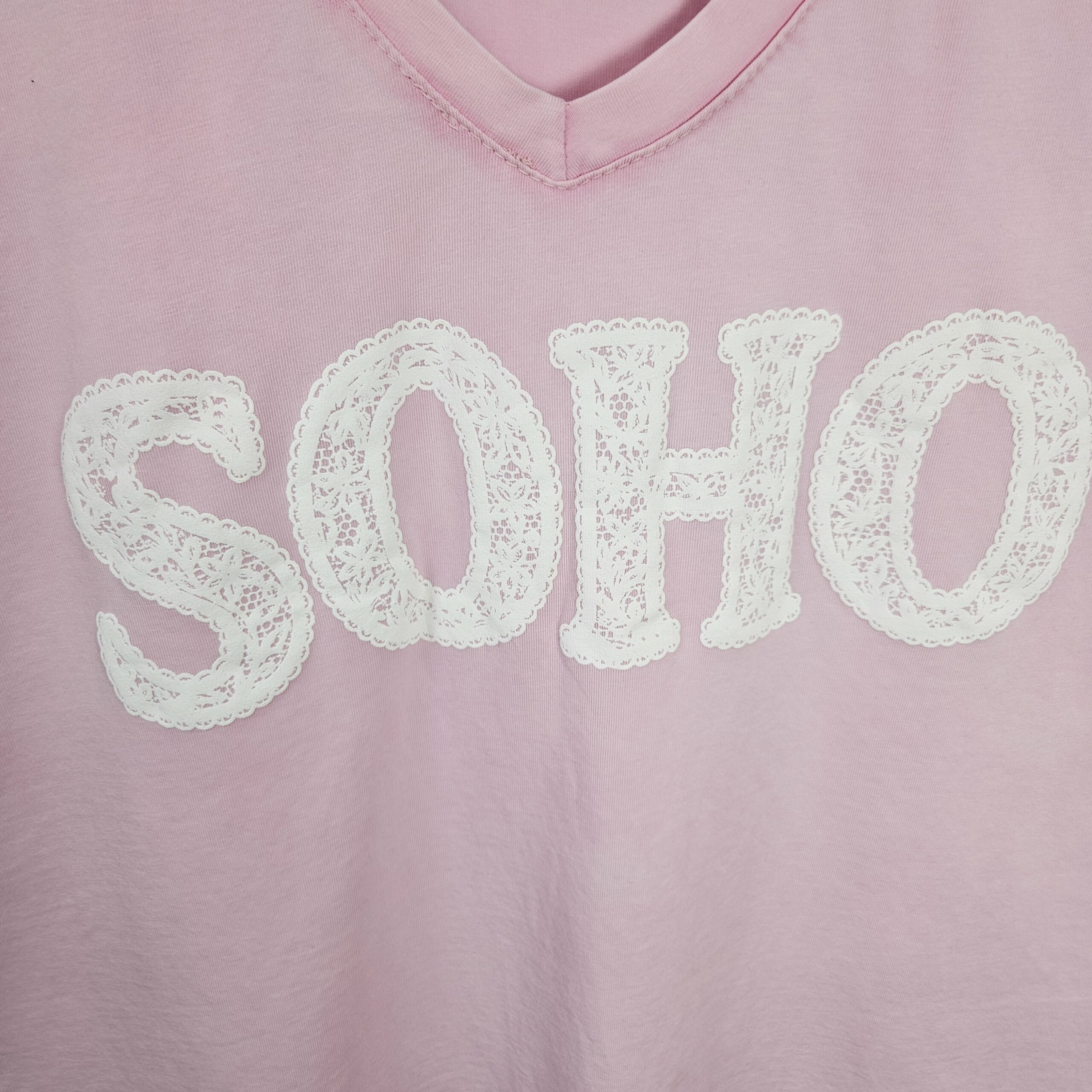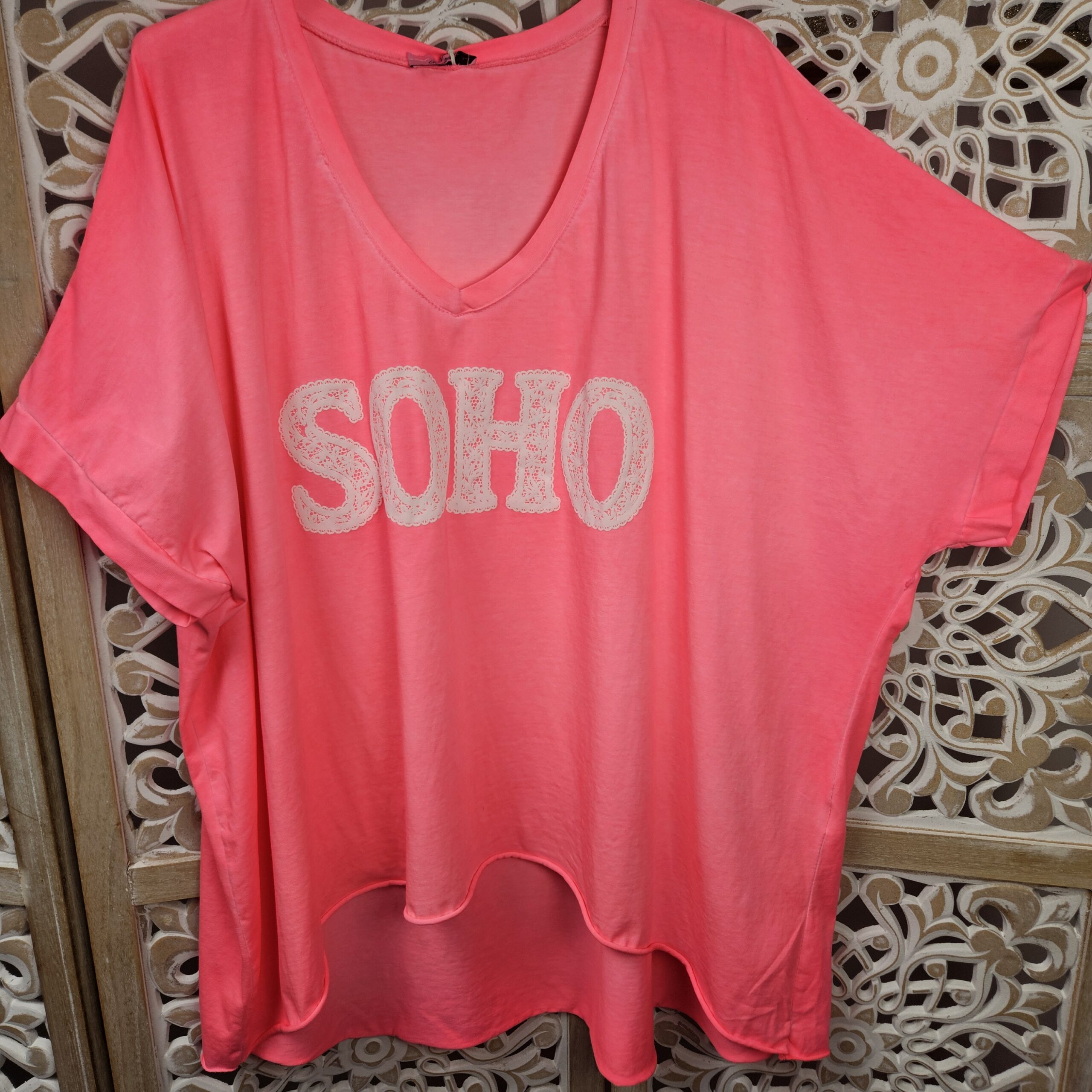 T shirt oversize col V, délavé, manches courtes, inscription SOHO en impression dentelle. Plus court devant que derrière. TU