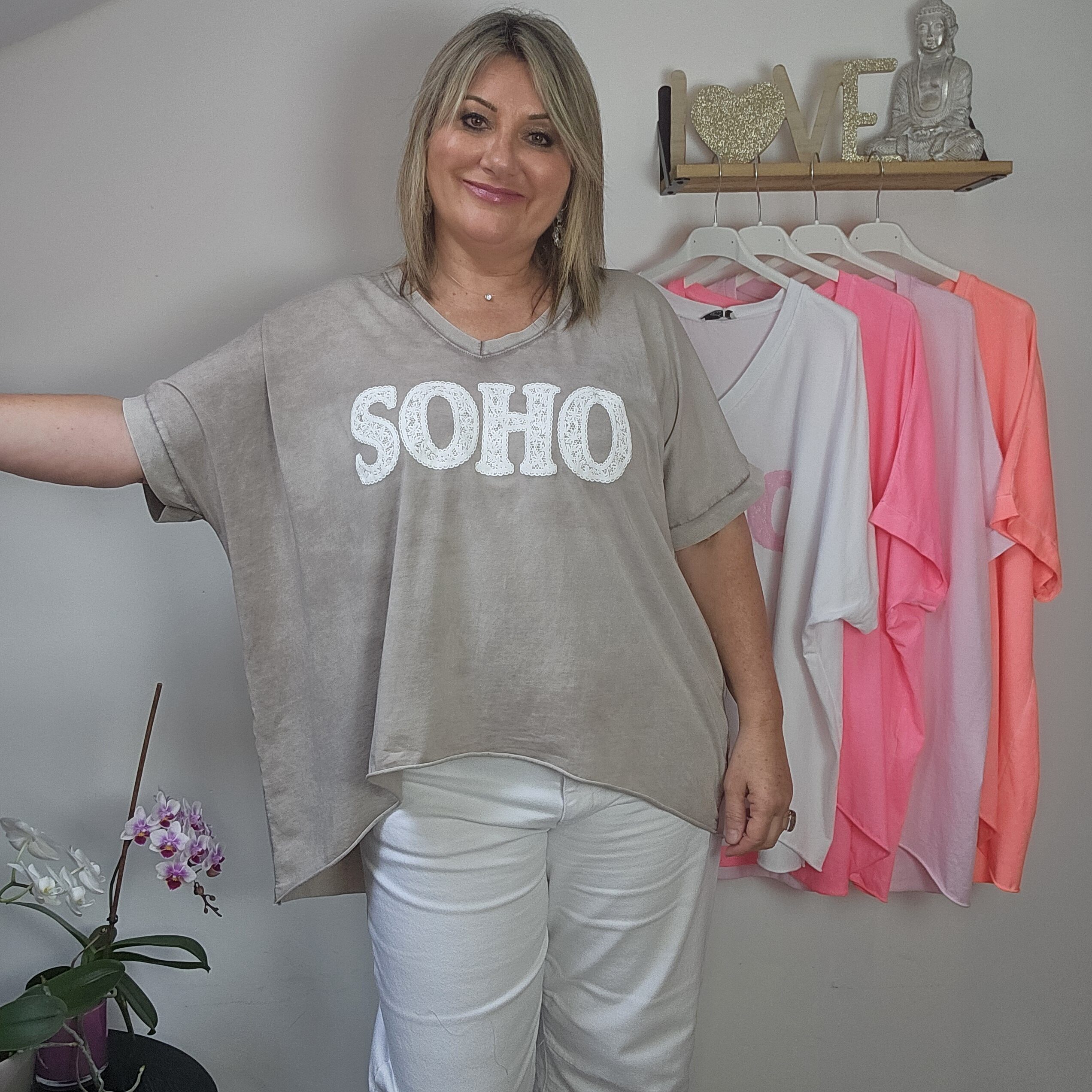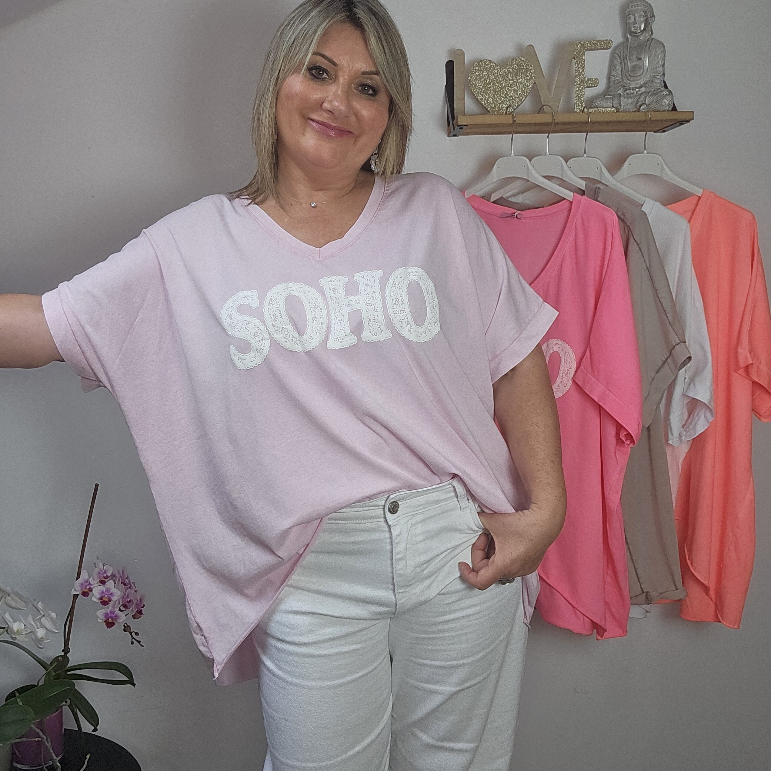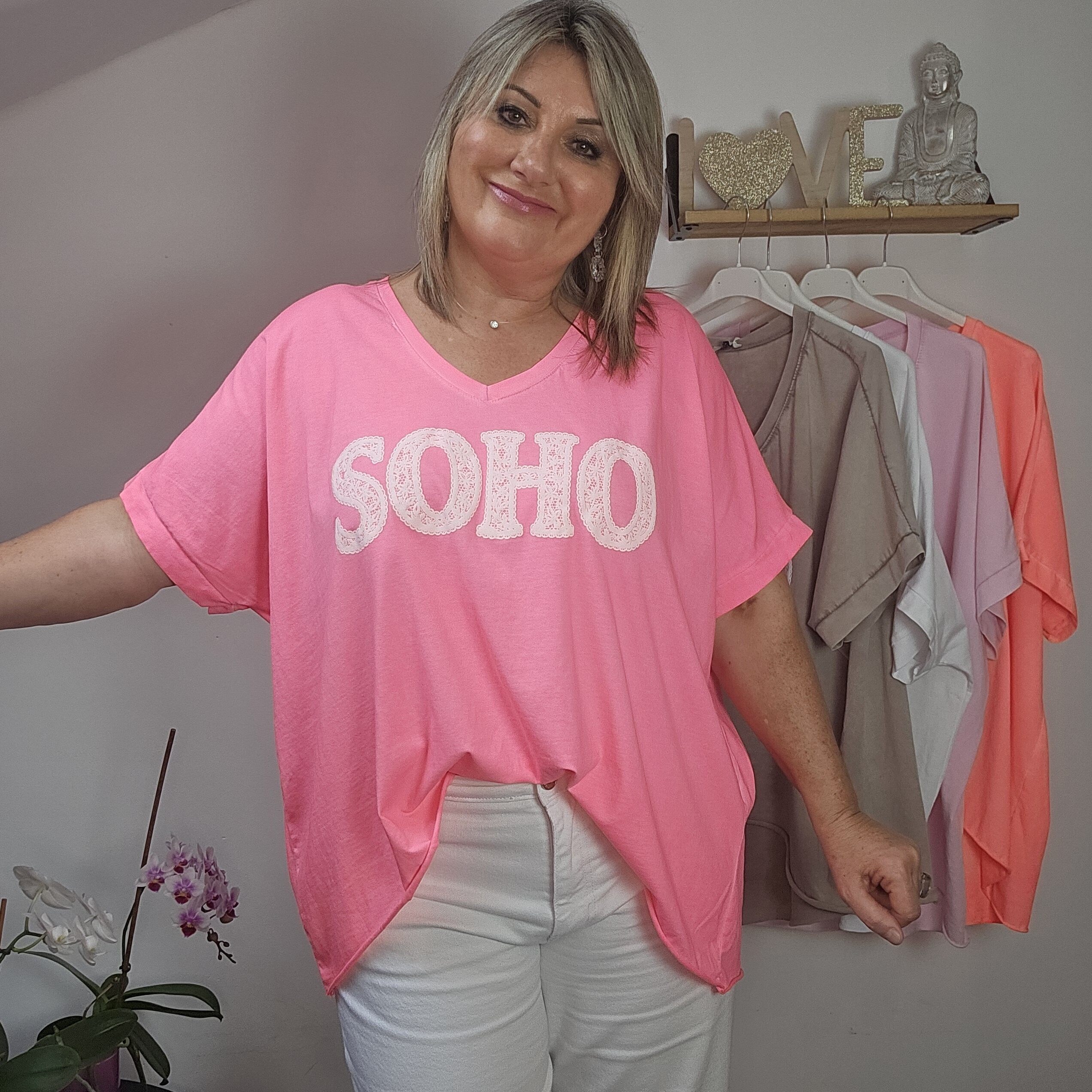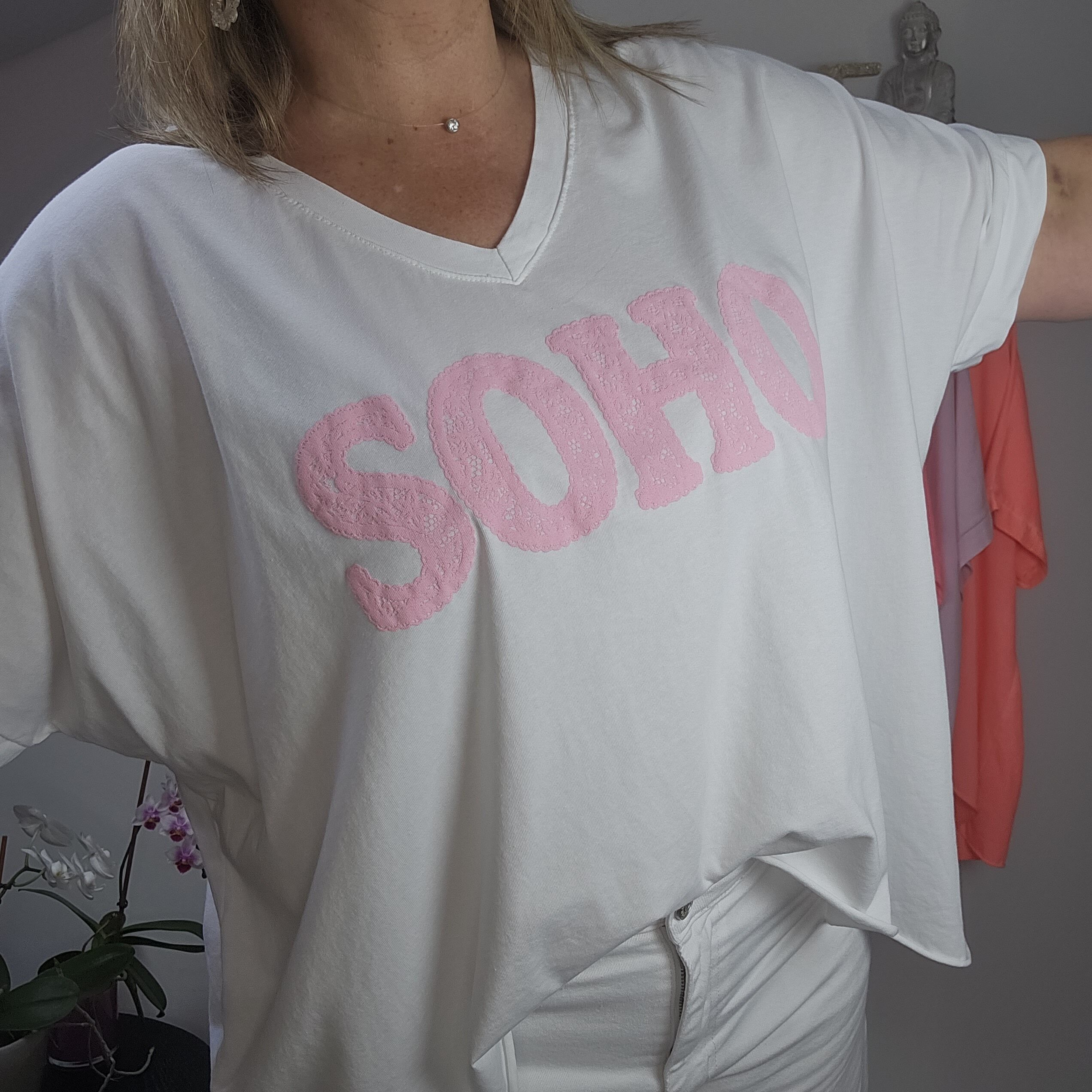 T shirt oversize col V, délavé, manches courtes, inscription SOHO en impression dentelle. Plus court devant que derrière. TU