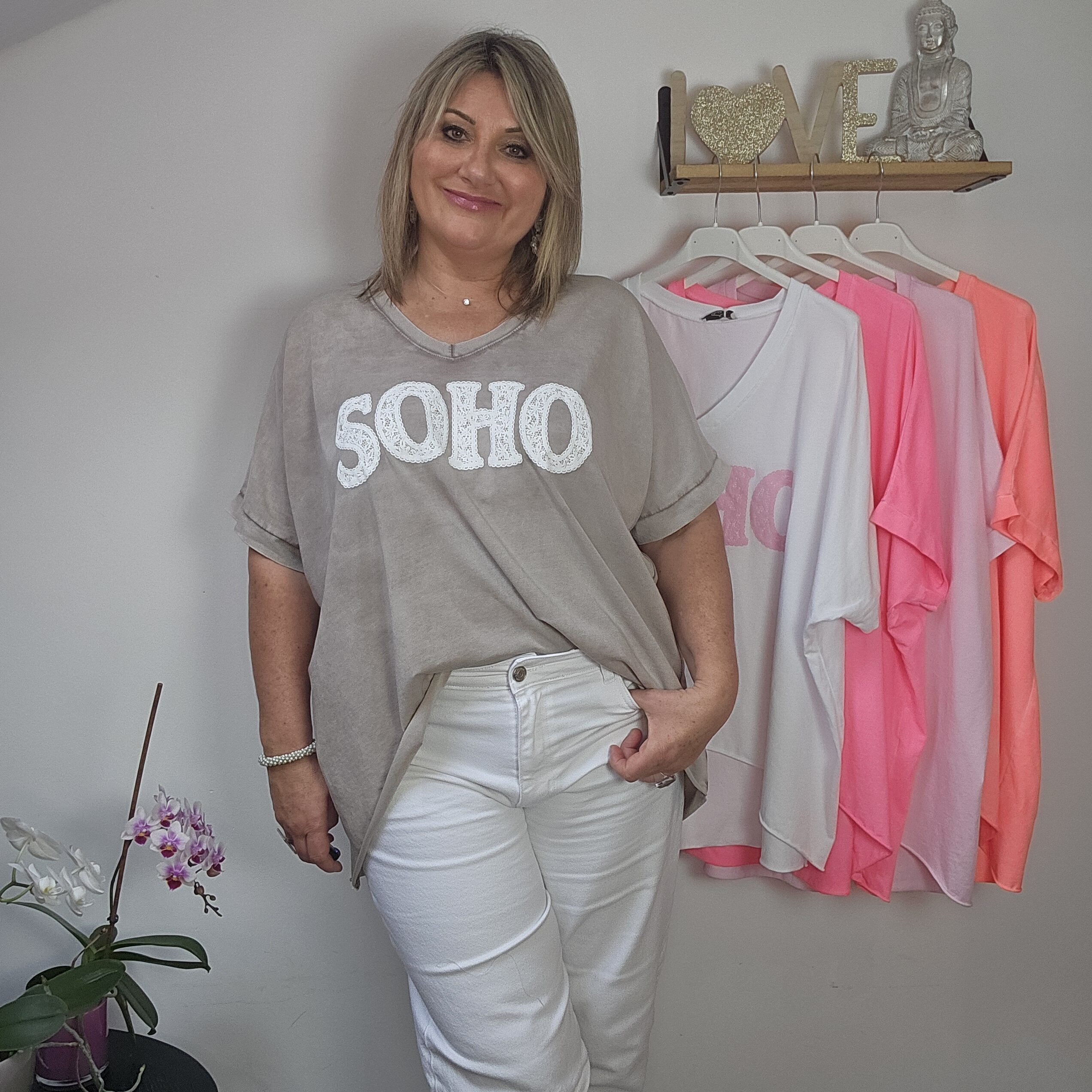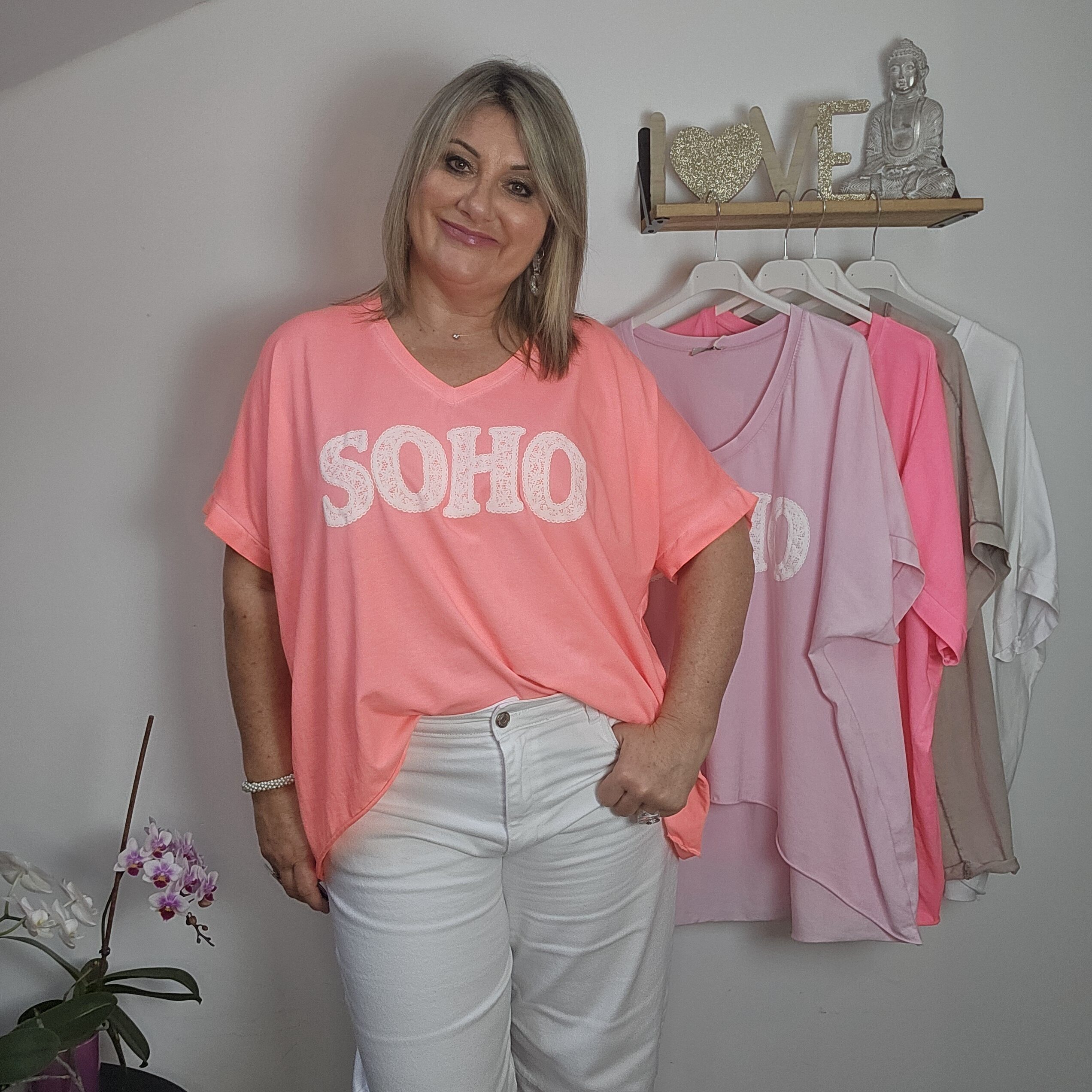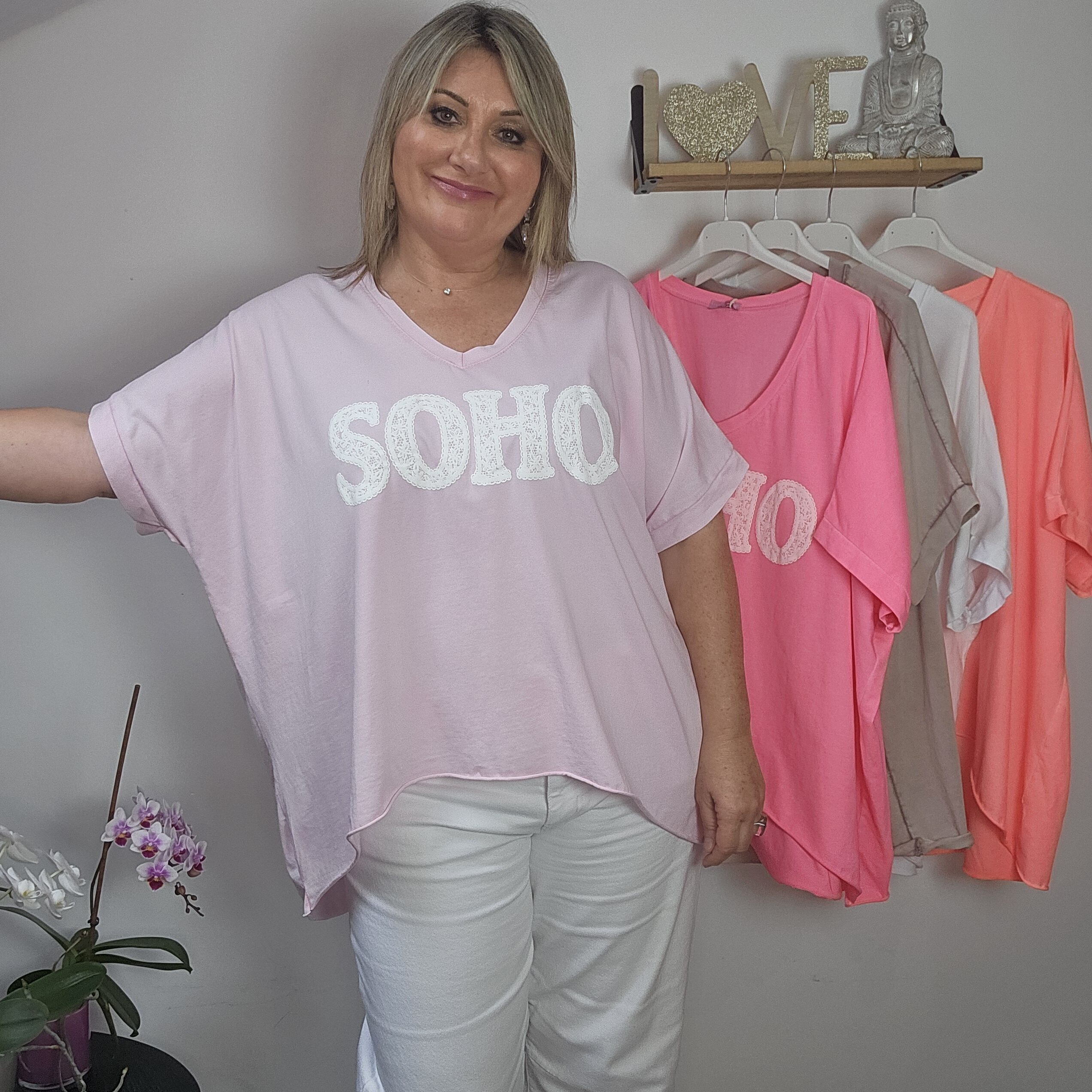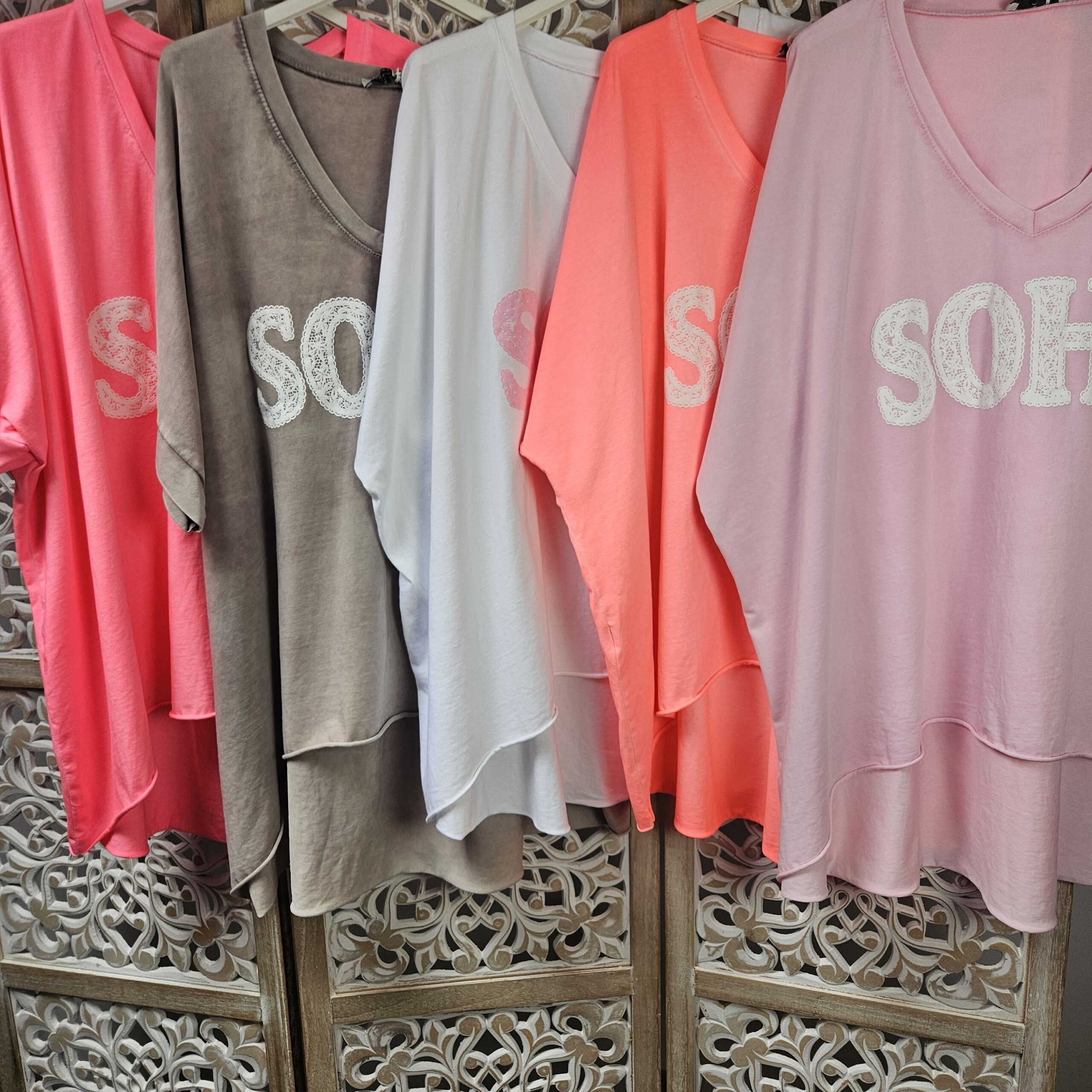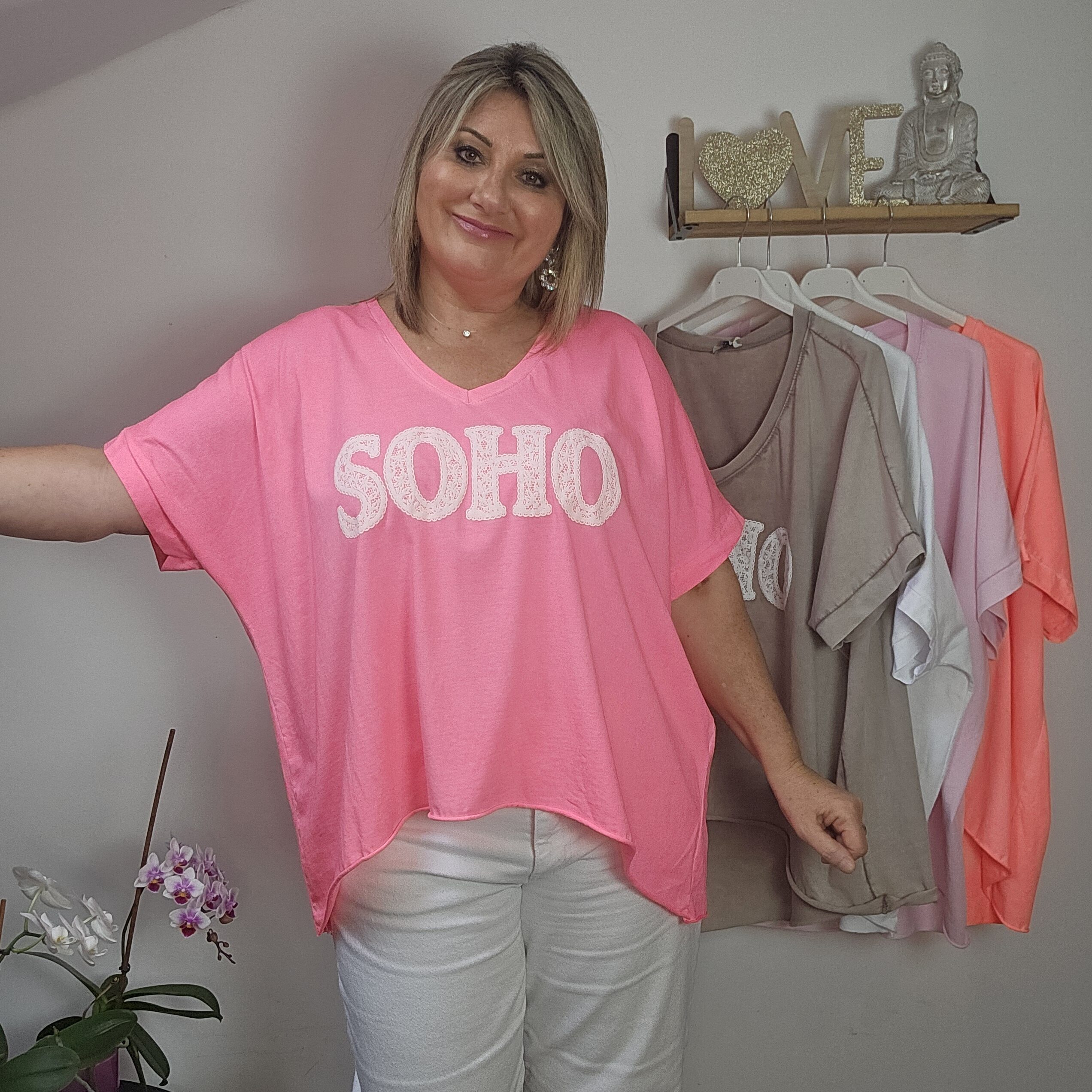 T shirt oversize col V, délavé, manches courtes, inscription SOHO en impression dentelle. Plus court devant que derrière. TU