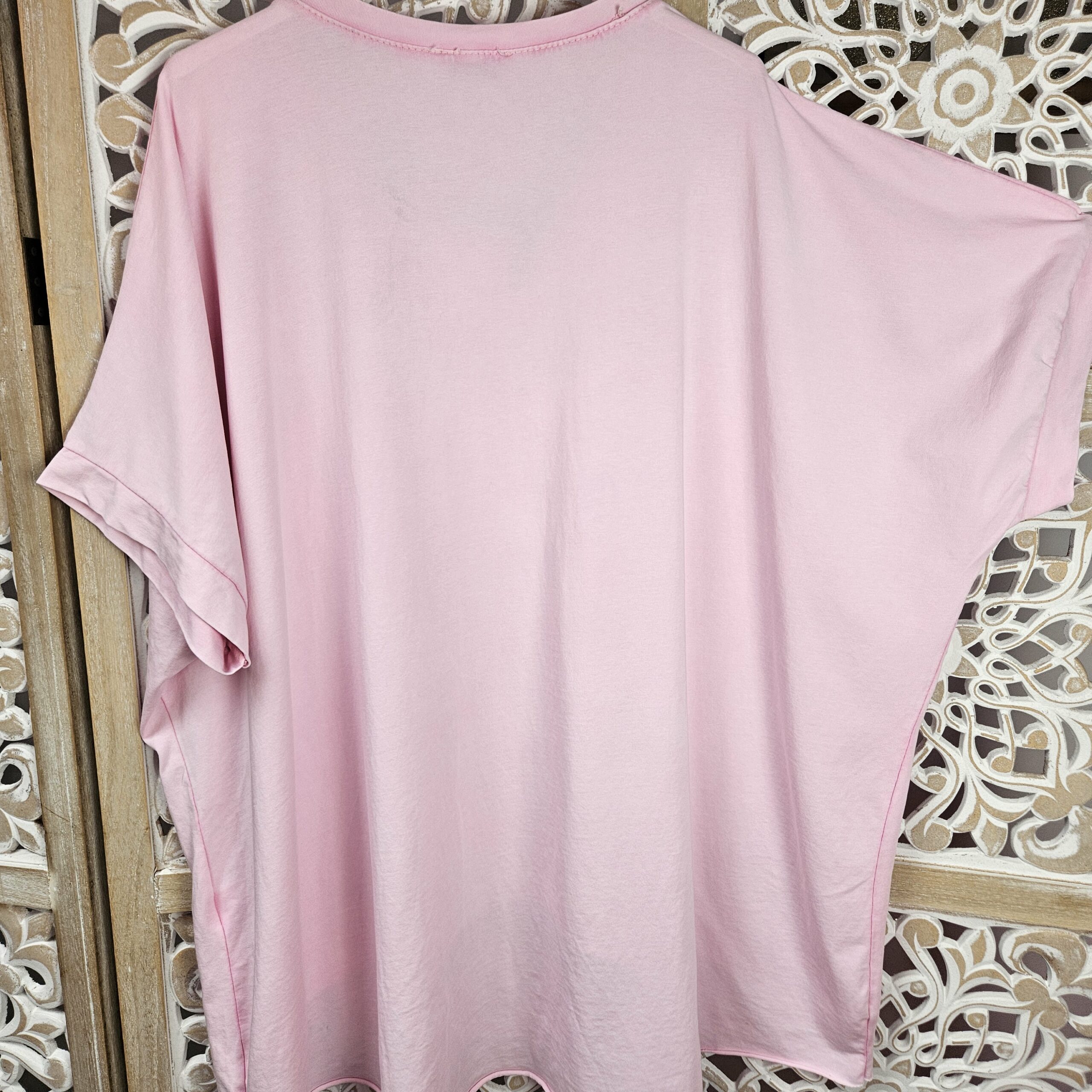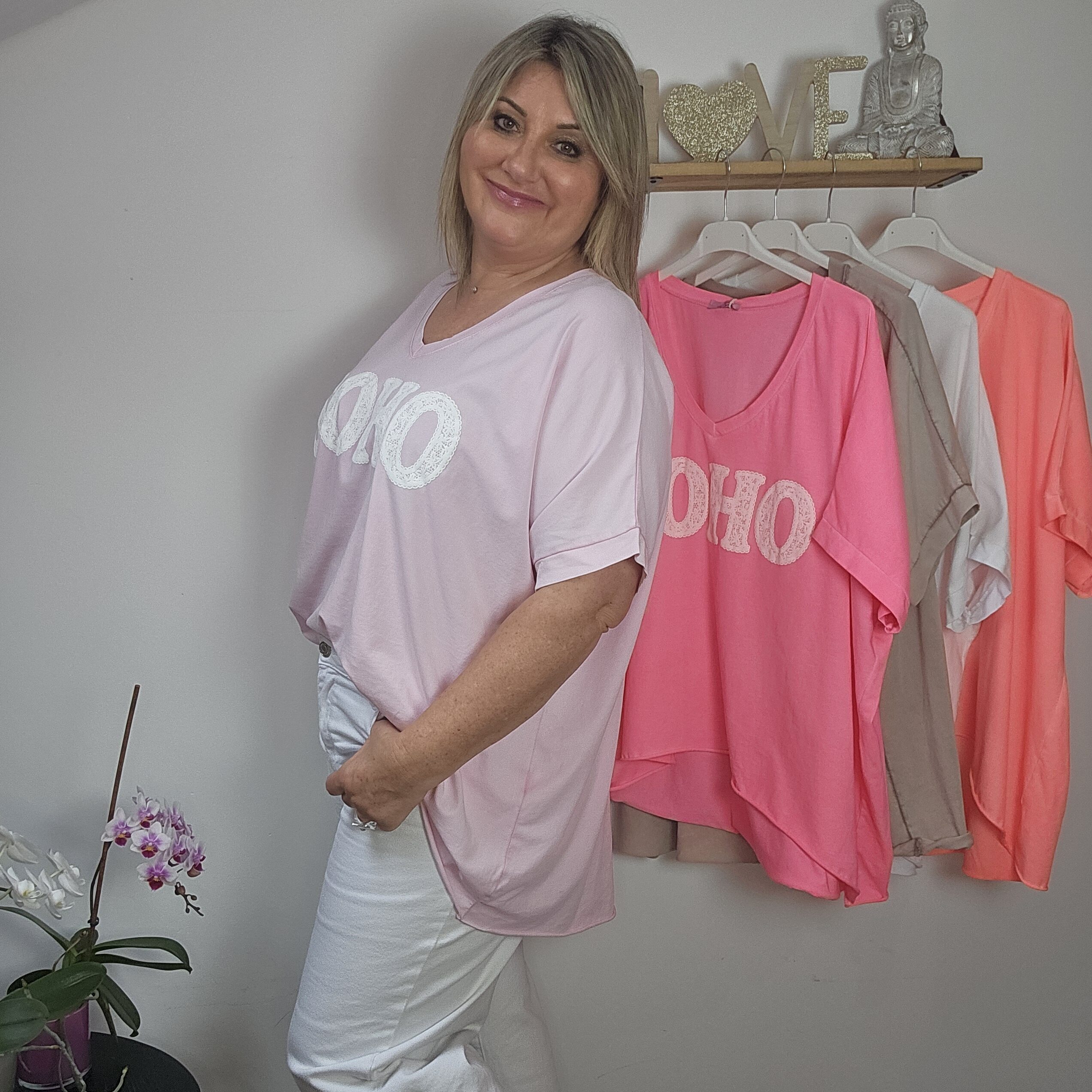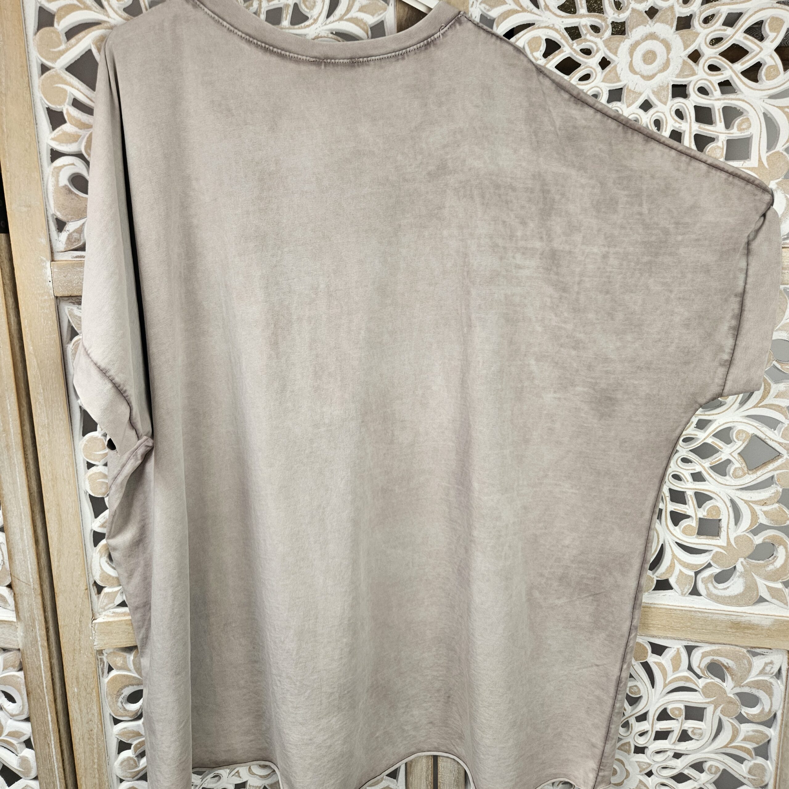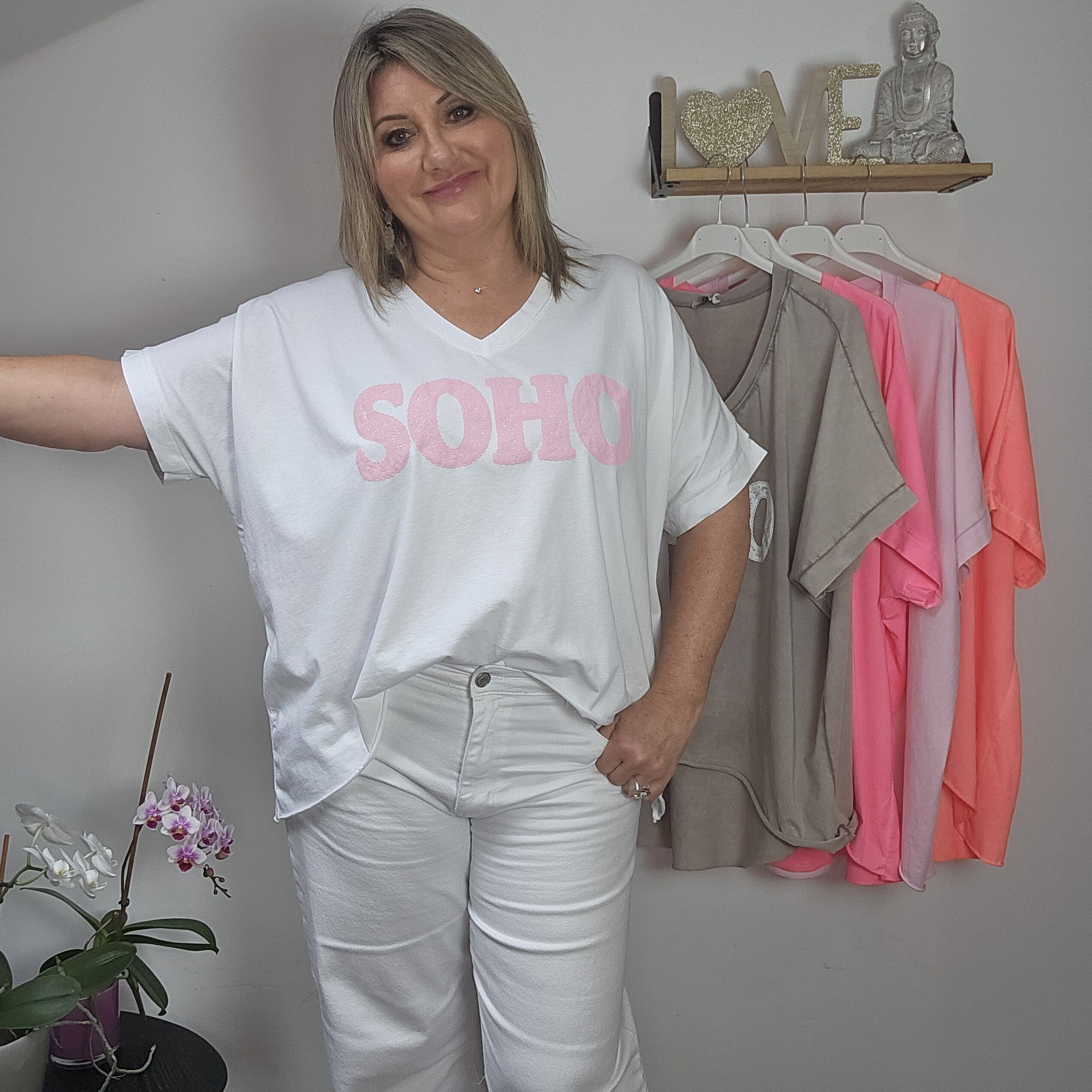 T shirt oversize col V, délavé, manches courtes, inscription SOHO en impression dentelle. Plus court devant que derrière. TU