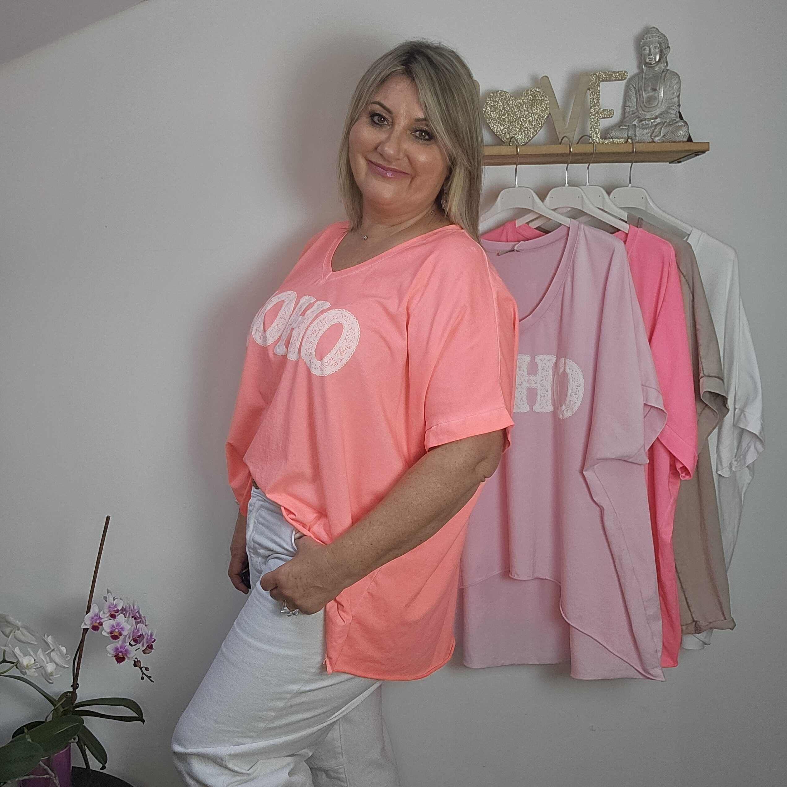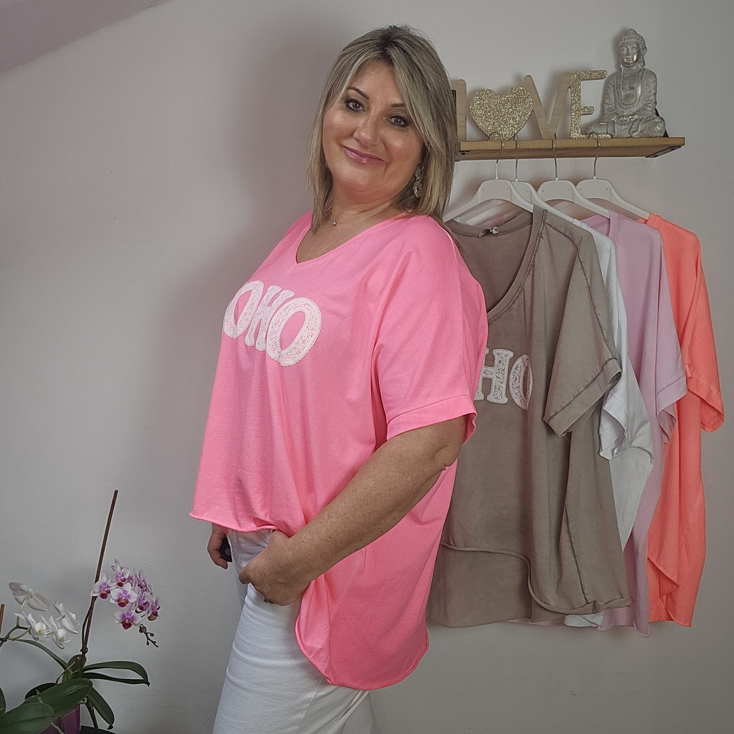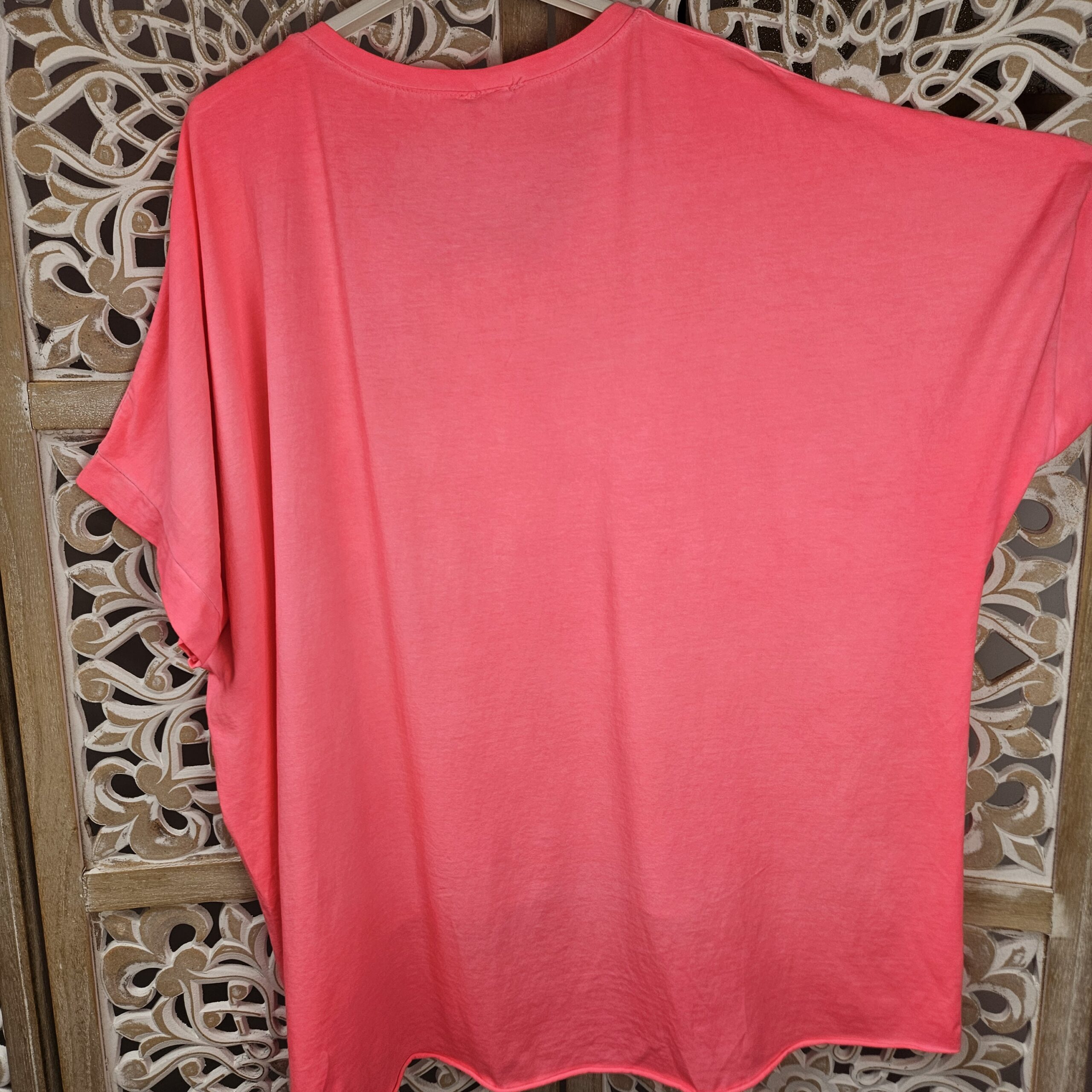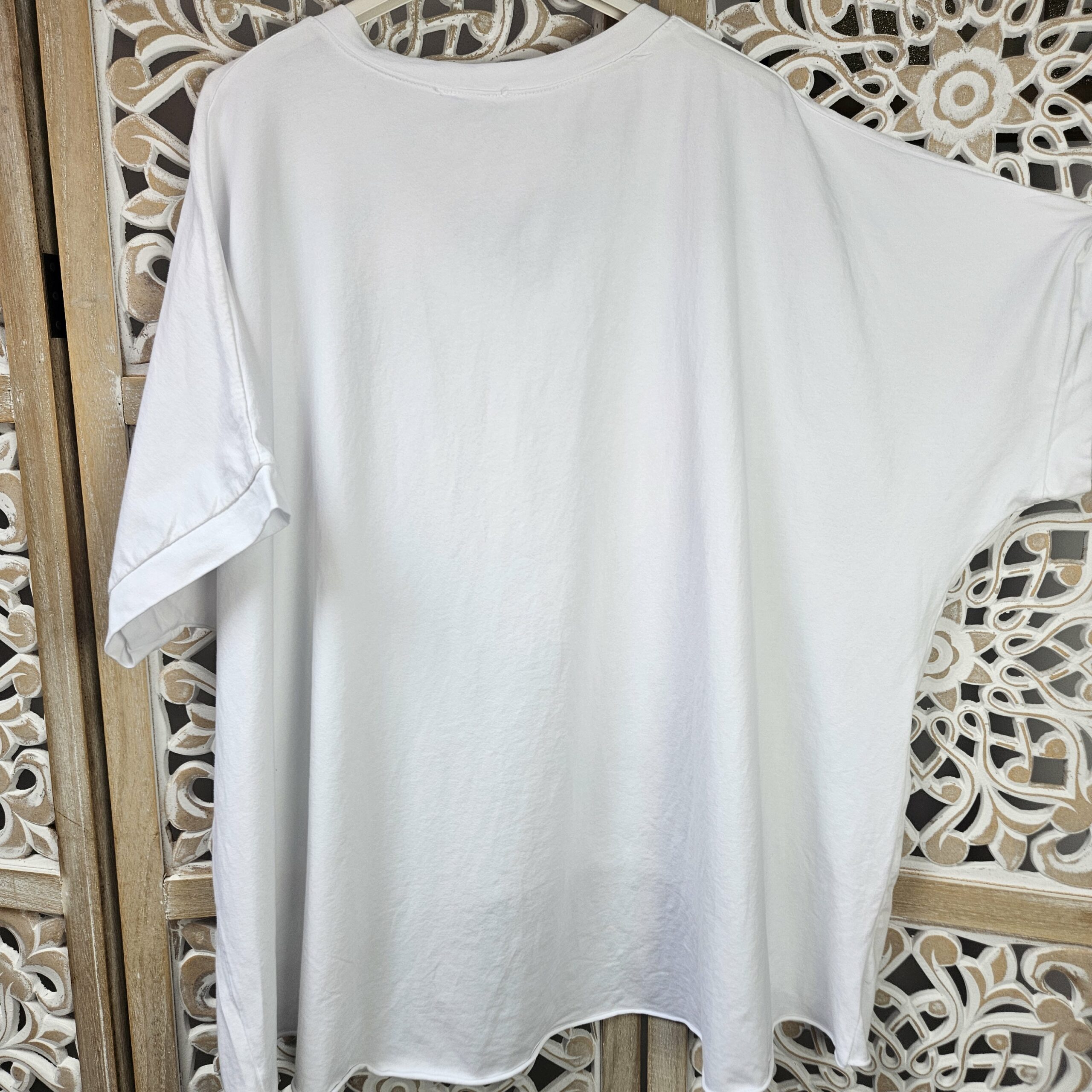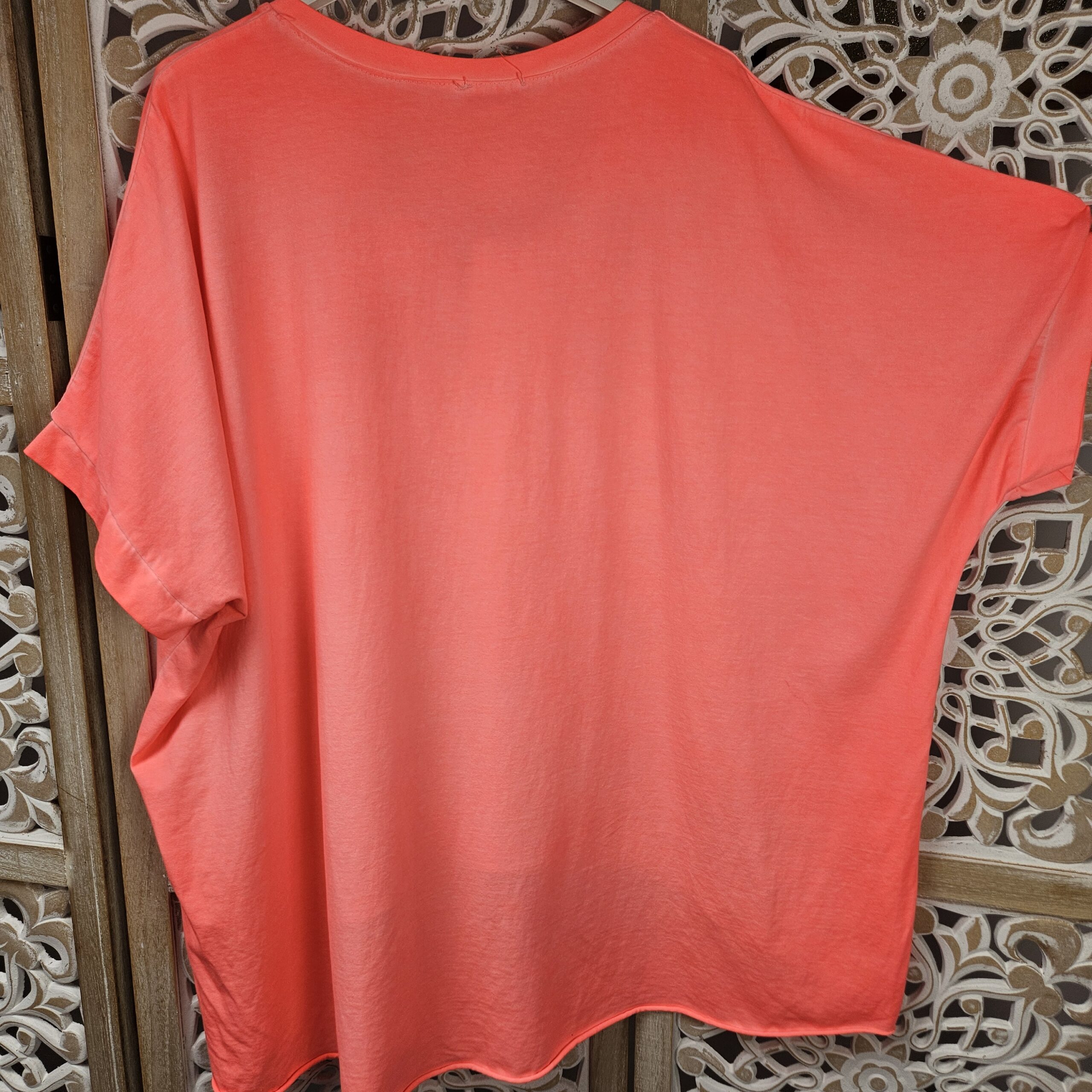 T shirt oversize col V, délavé, manches courtes, inscription SOHO en impression dentelle. Plus court devant que derrière. TU