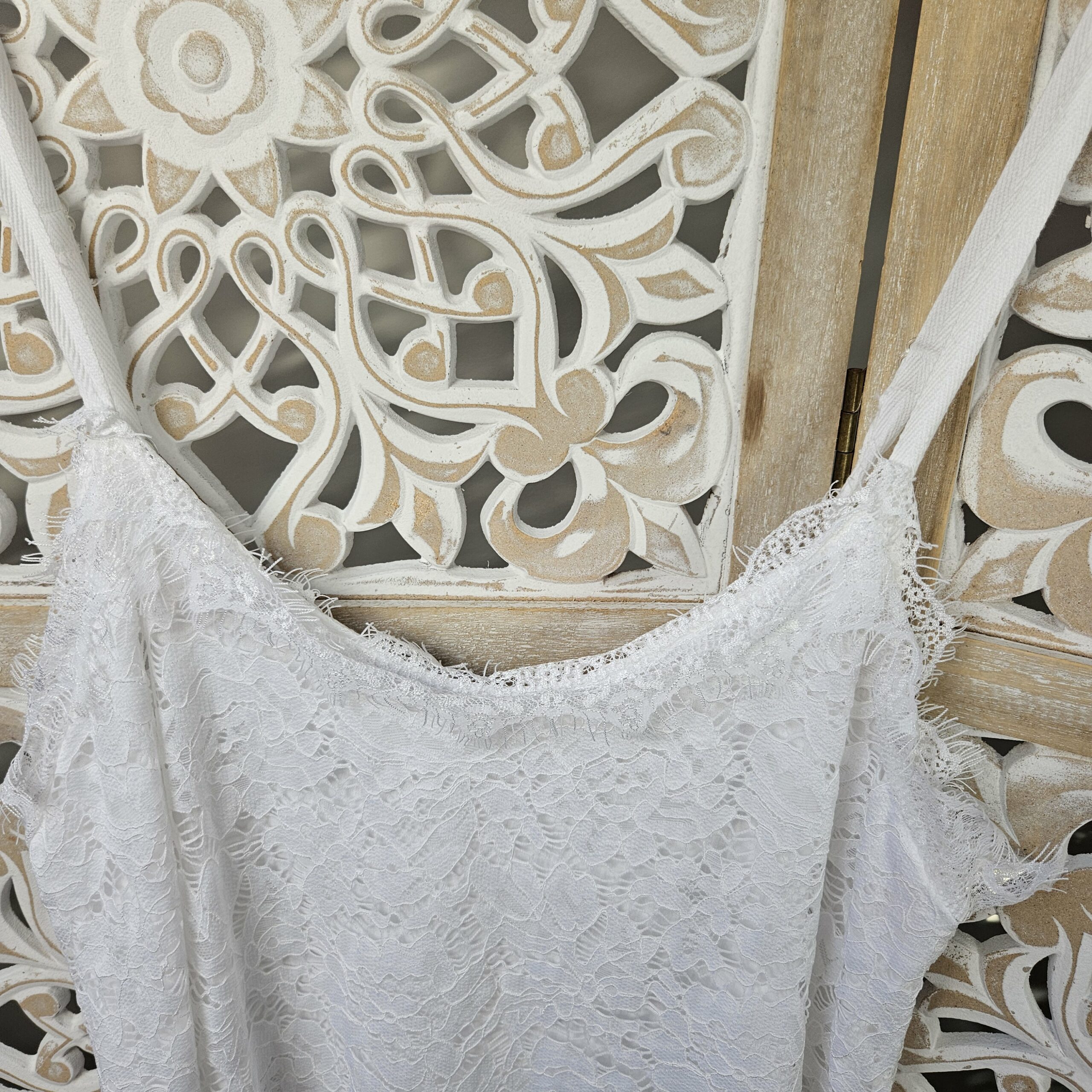 Top en dentelle à bretelles réglables, doublé, dentelle au niveau du décolleté et dos . Existe en blanc et rose fluo. TU.