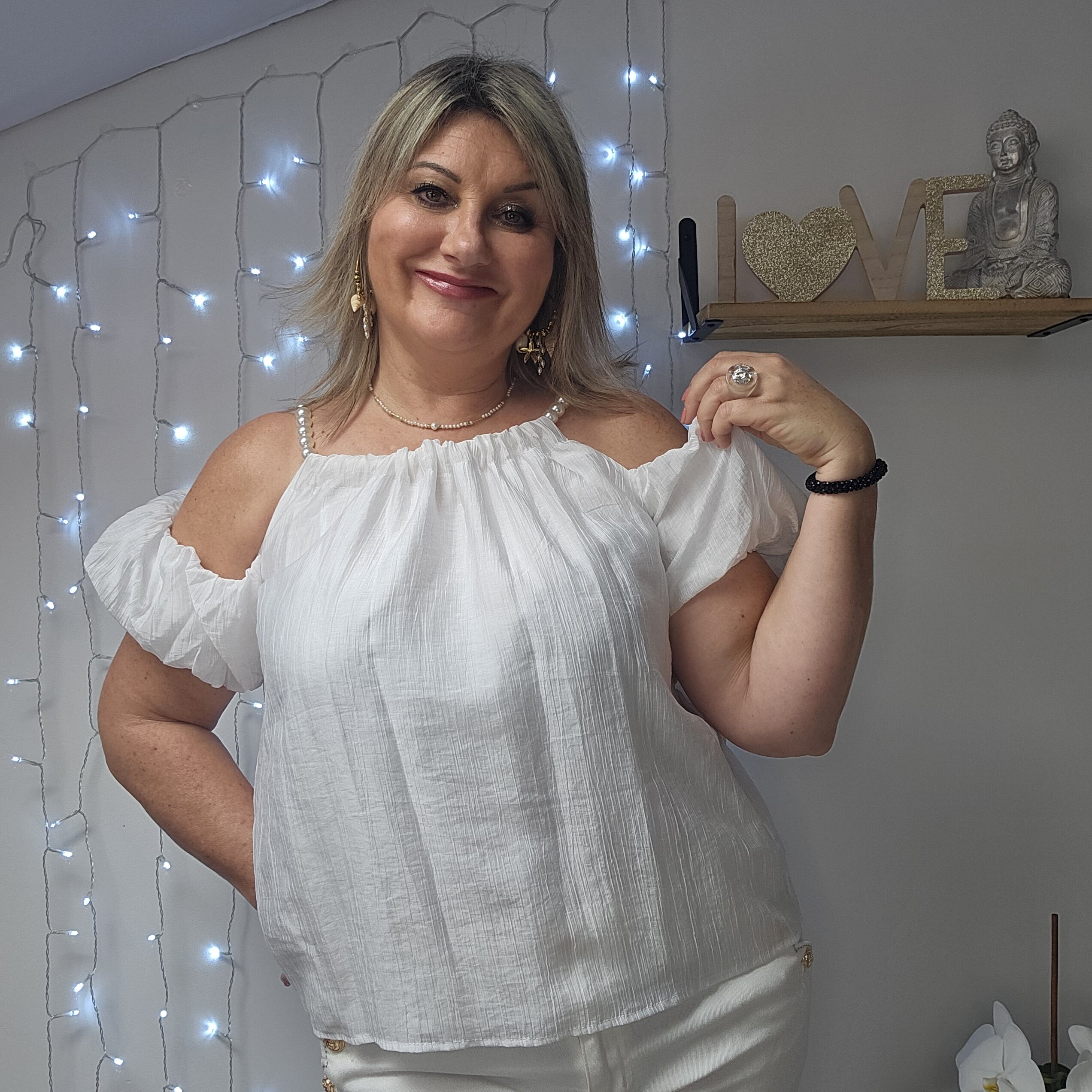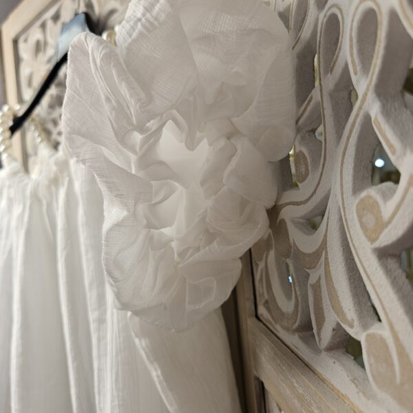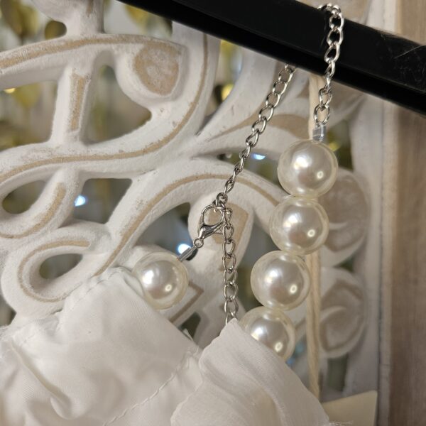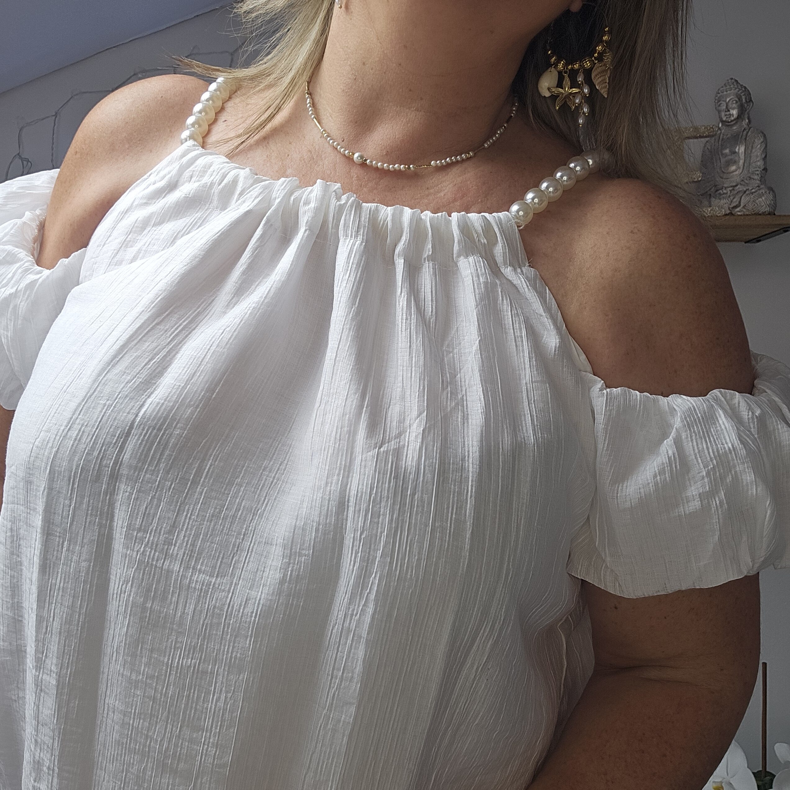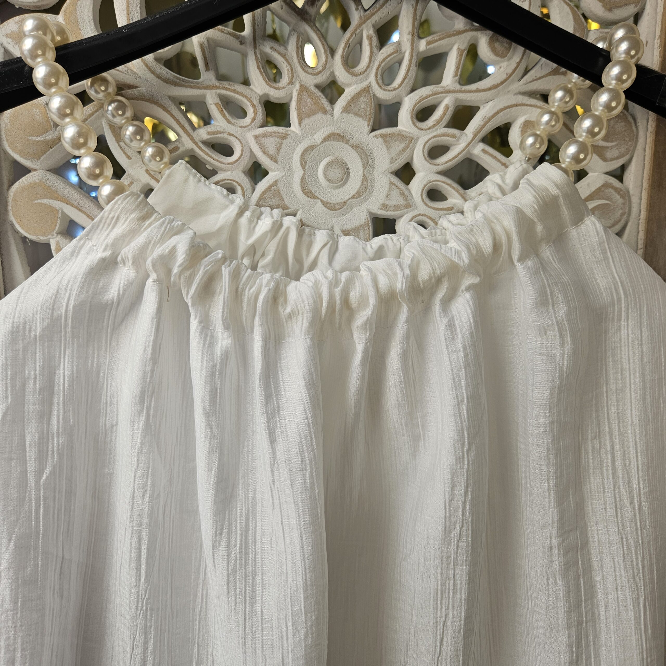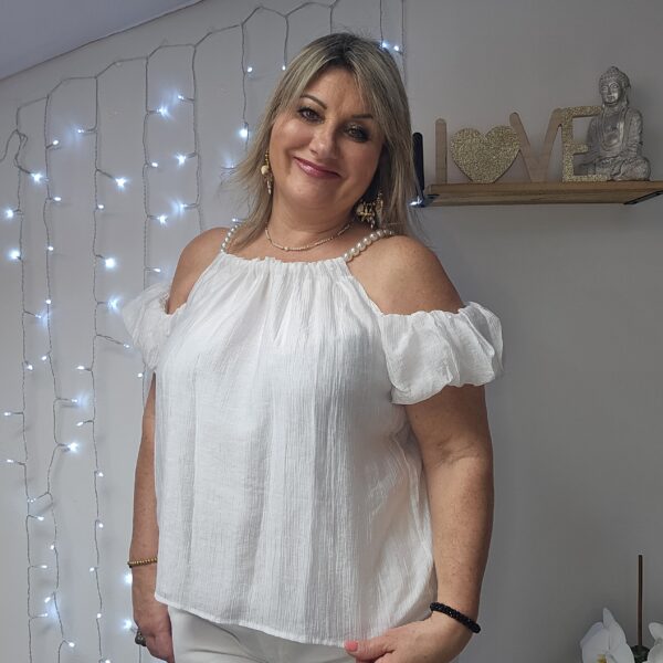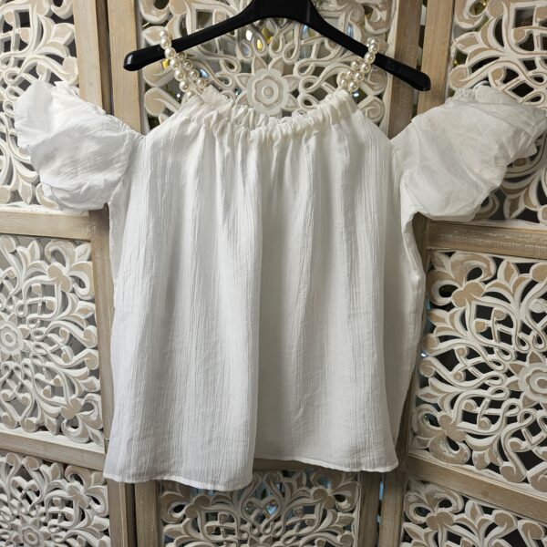 Top blanc épaules dénudées avec des bretelles qui est une chaine réglable en perles blanches, le reste de la manche élastiqué est sur le bras. Tissu froissé . Doublé. Léger et très agréable à porter