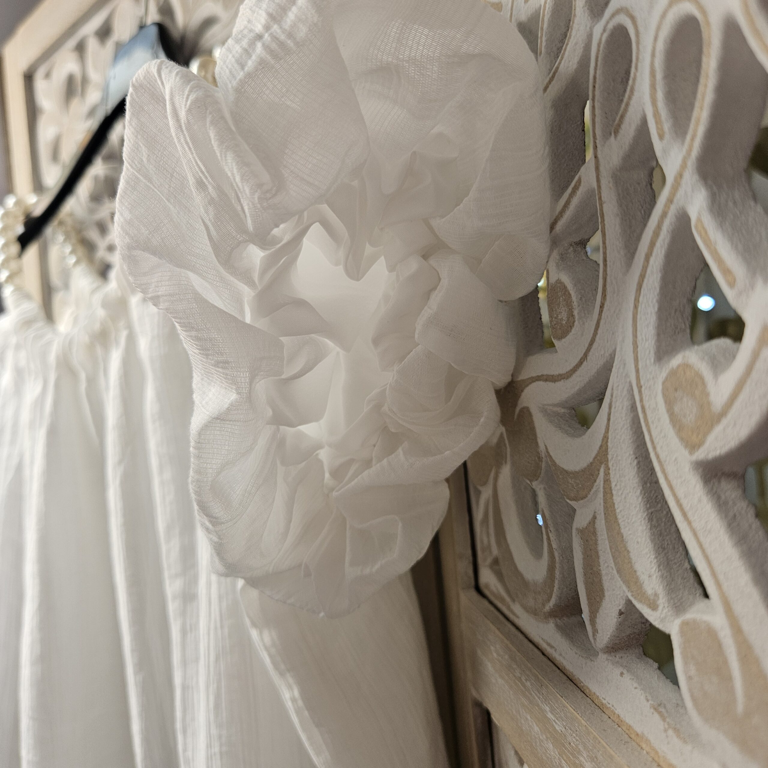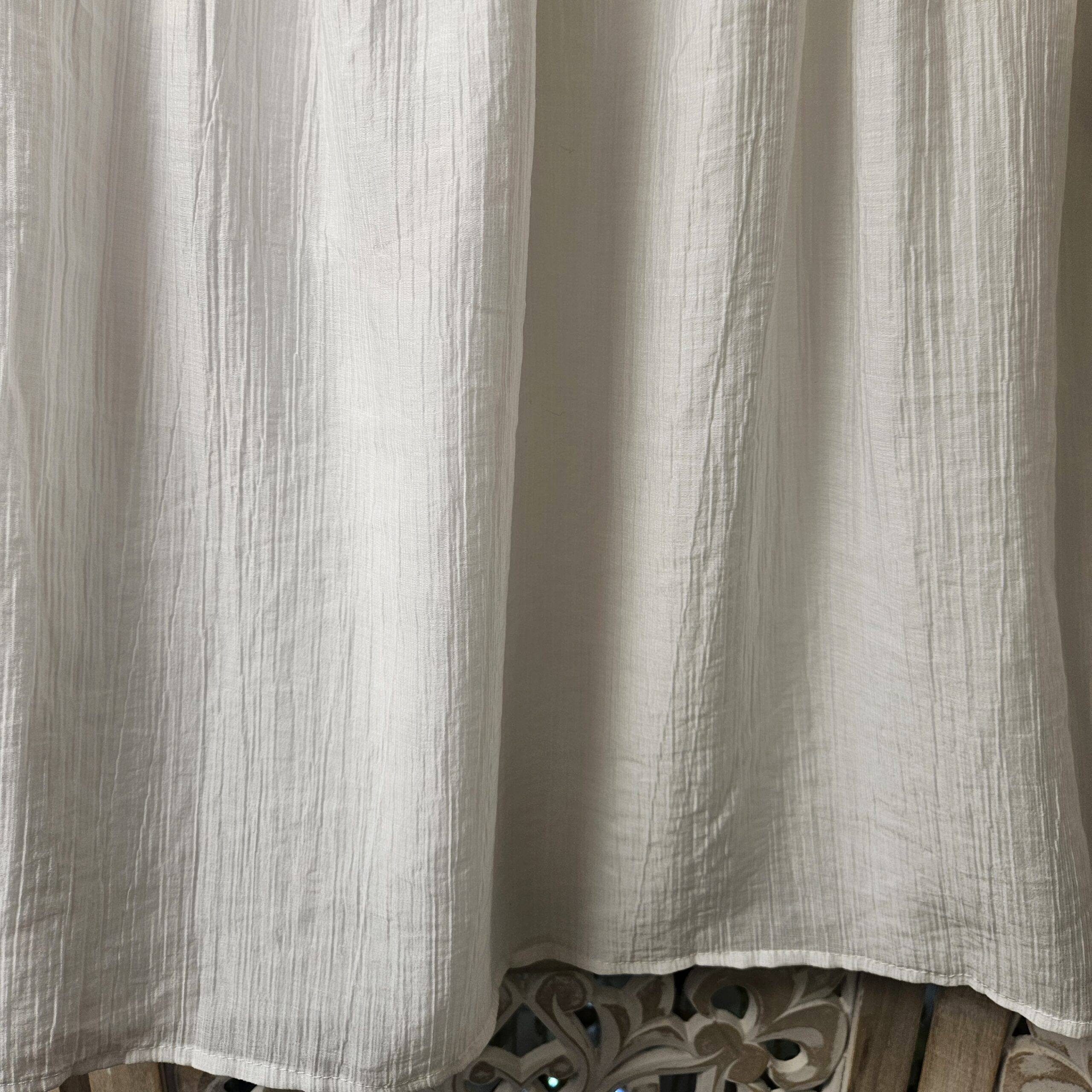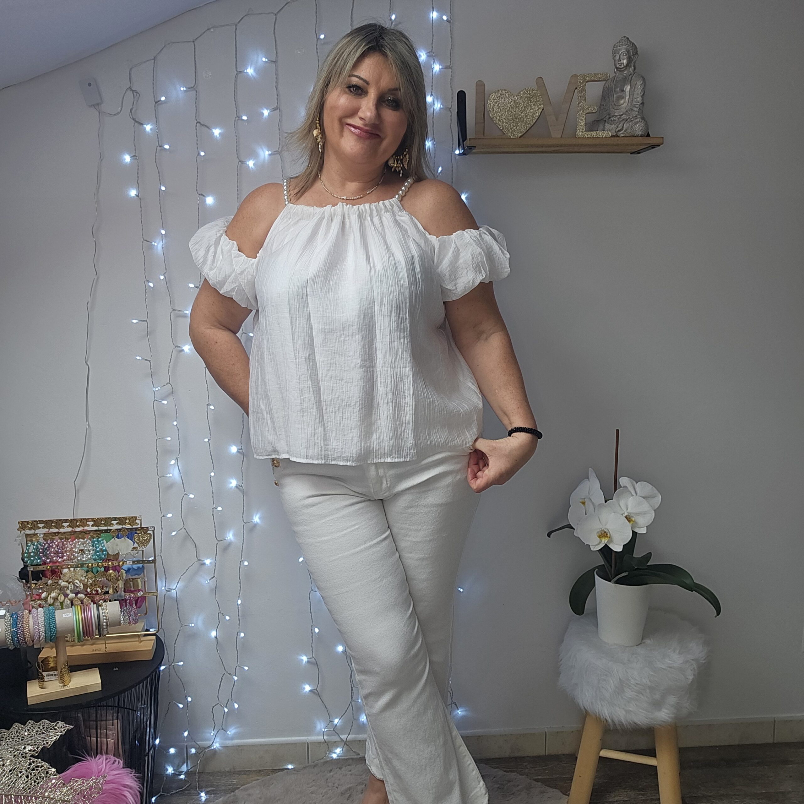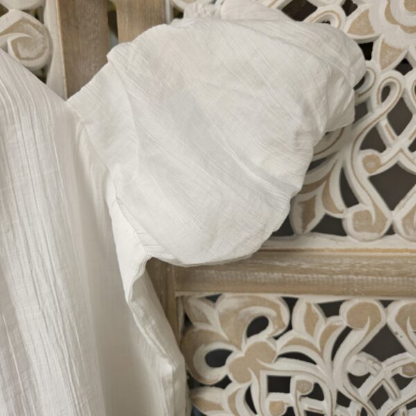 Top blanc épaules dénudées avec des bretelles qui est une chaine réglable en perles blanches, le reste de la manche élastiqué est sur le bras. Tissu froissé . Doublé. Léger et très agréable à porter