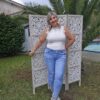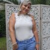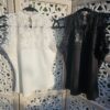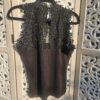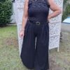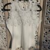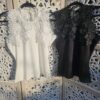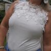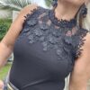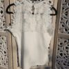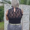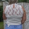 Top sans manches, chic avec dentelle et travail de broderie à l’encolure, fermeture à l’arrière par un bouton nacré. La deuxième partie du top est un peu épaisse, près du corps et extensible. Existe en blanc et noir.