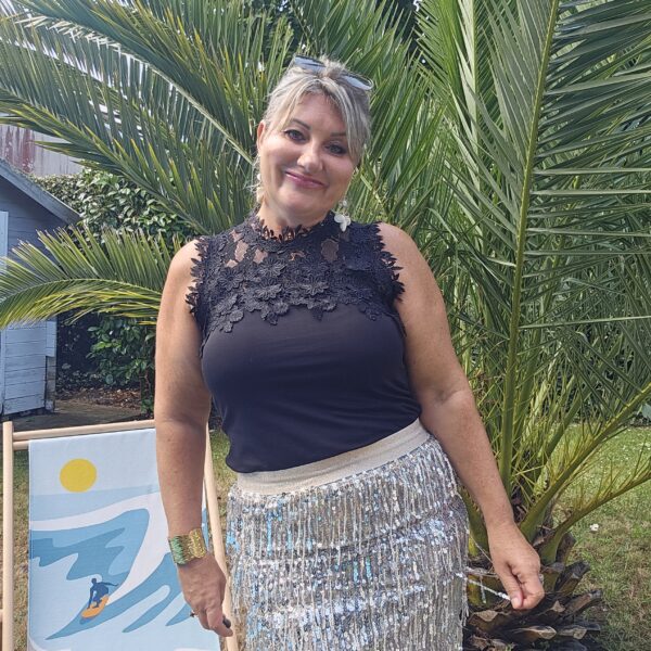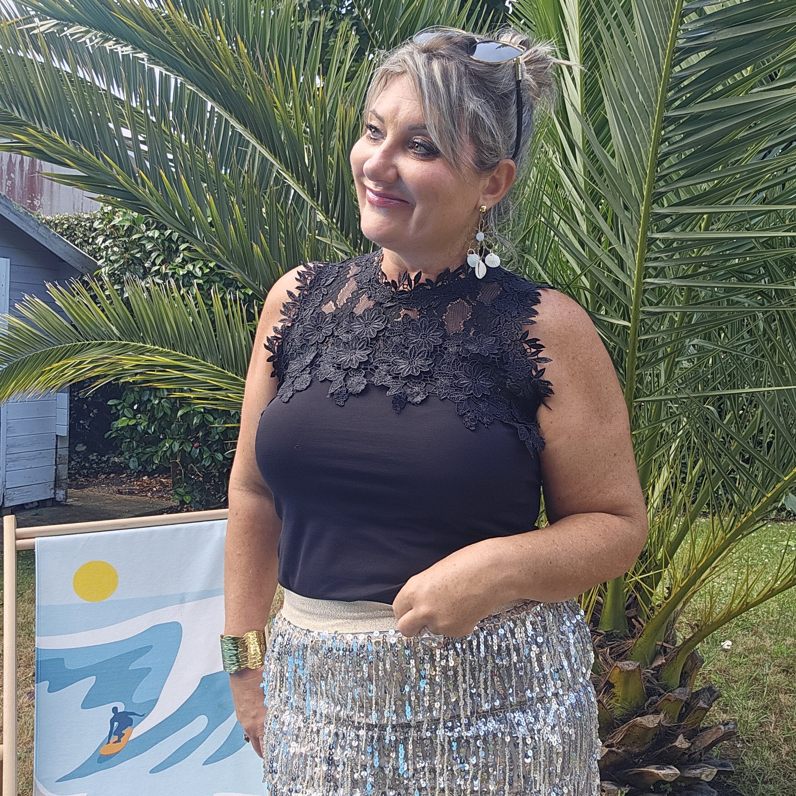 Mon regard pailleté : Top indispensable, on aime le détail de la dentelle sur la poitrine et le haut du dos. Peut se porter avec un pantalon, jean’s ou jupe.
