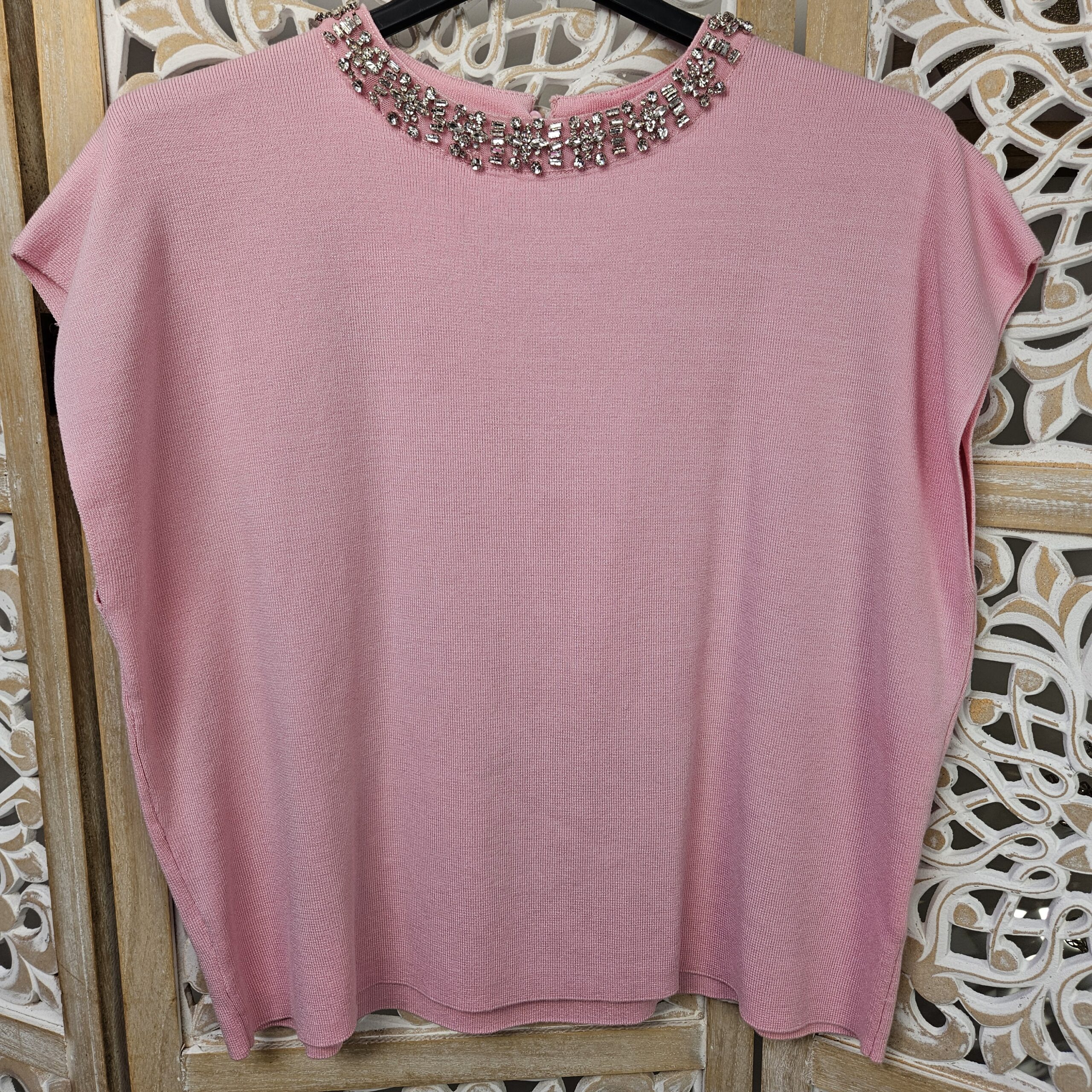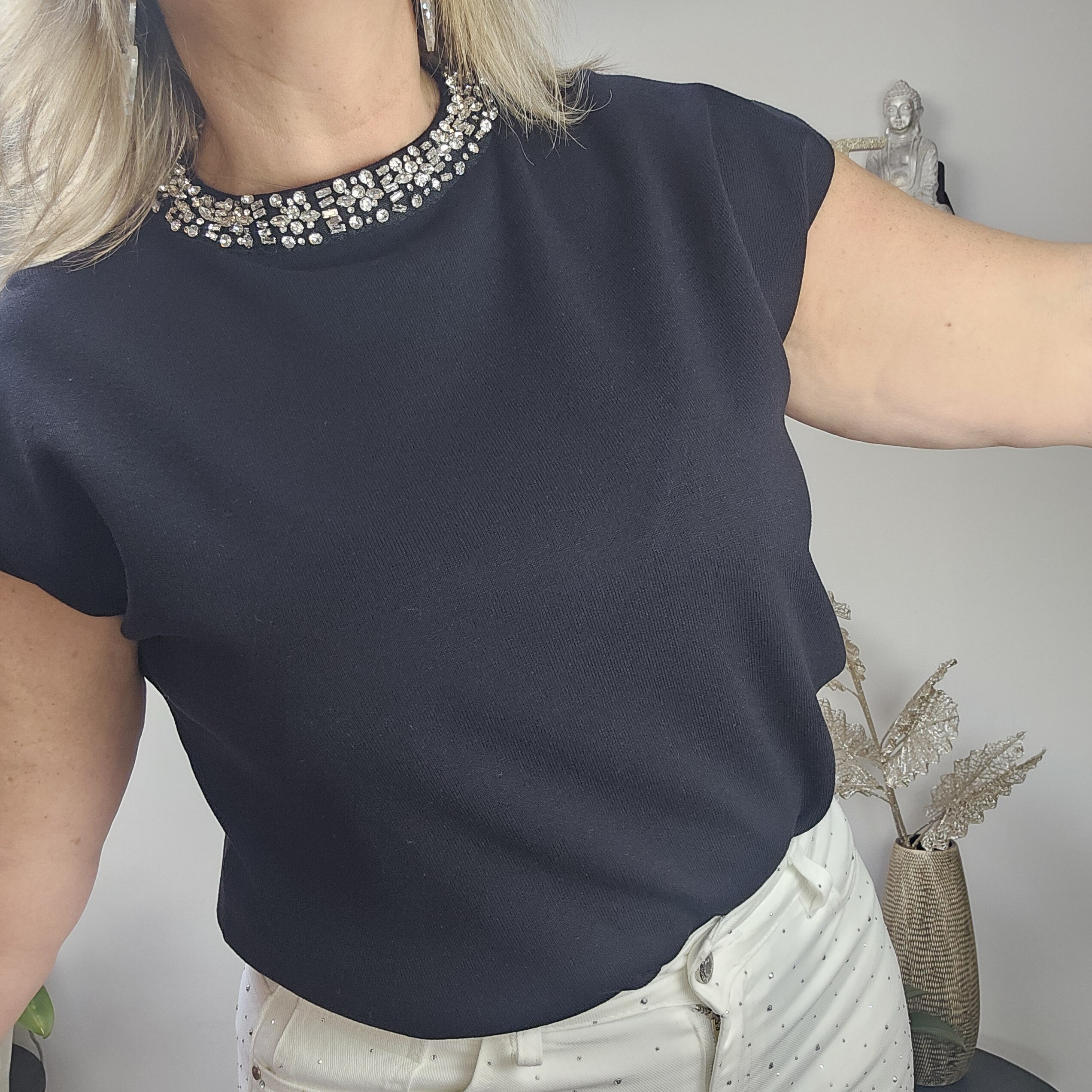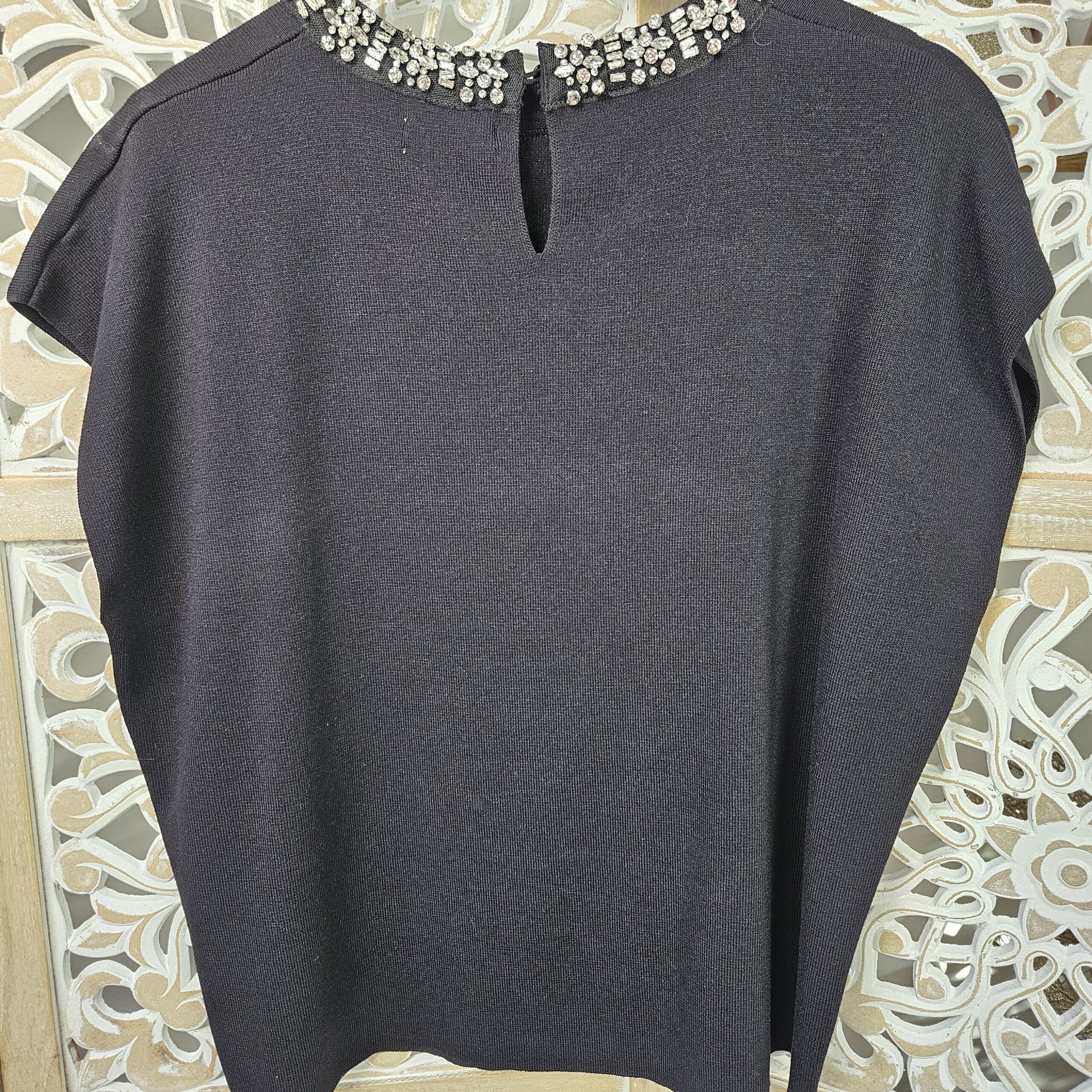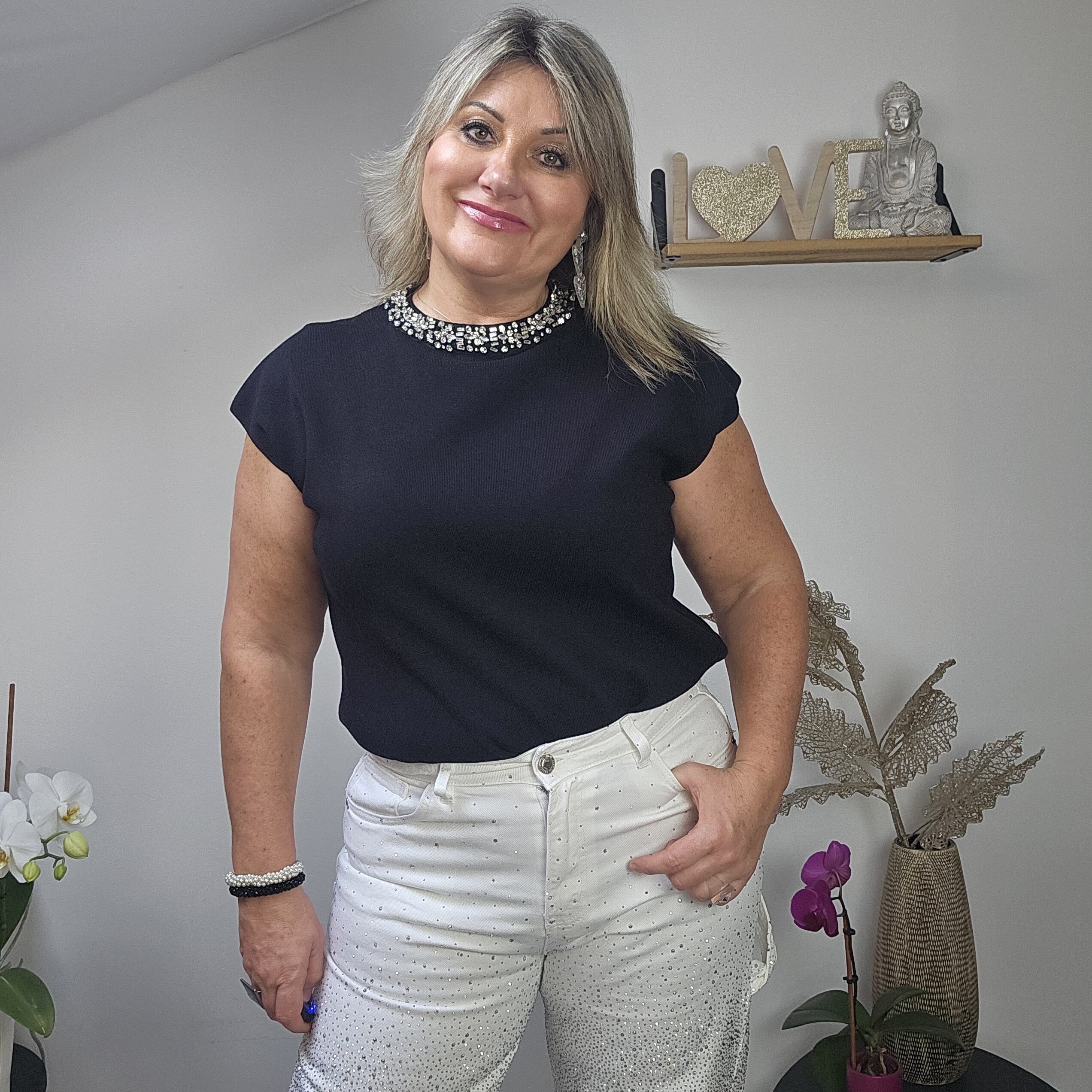 Top avec manches courtes évasées, col avec différents strass, fermeture avec un bouton. Léger et très agréable à porter. Existe en rose et noir.