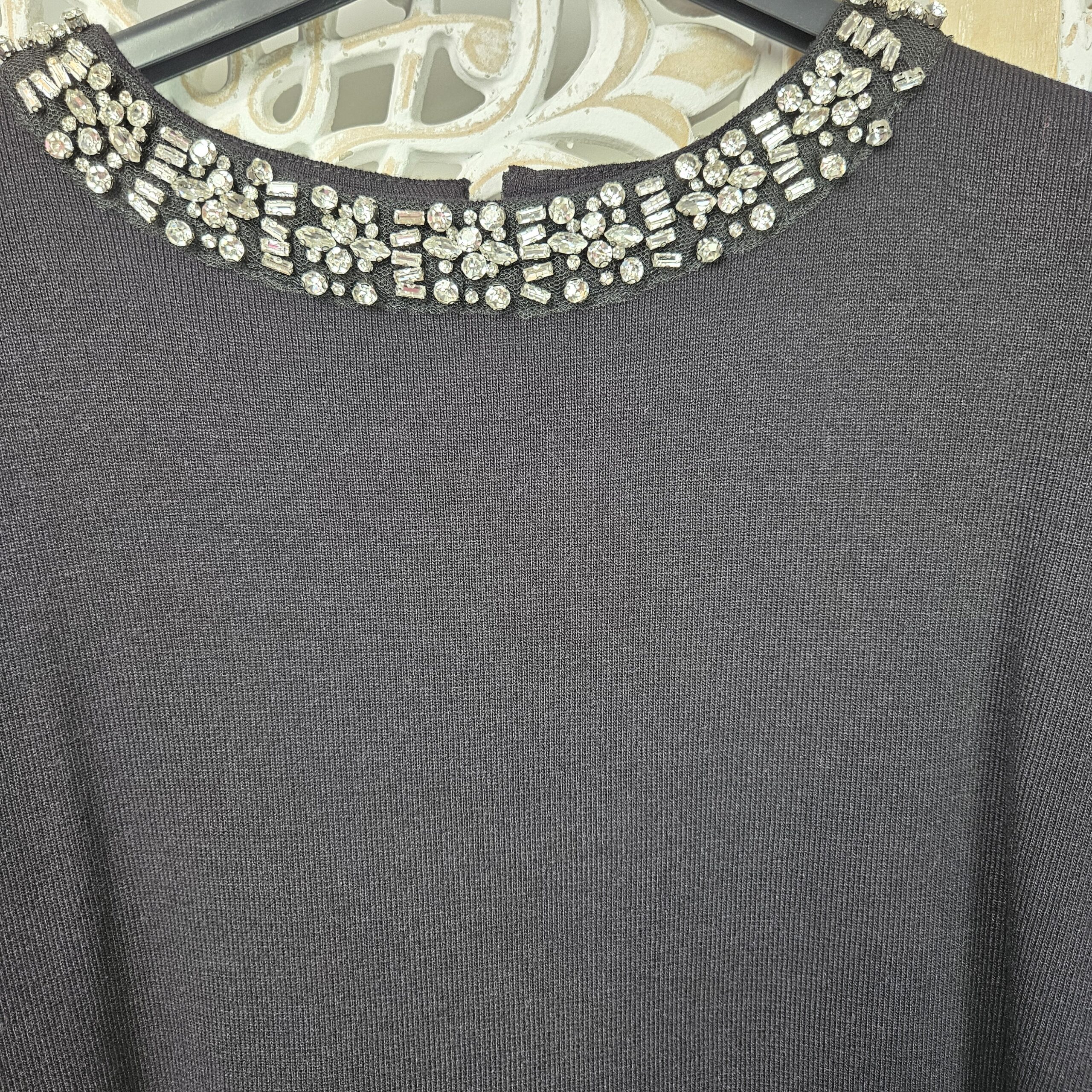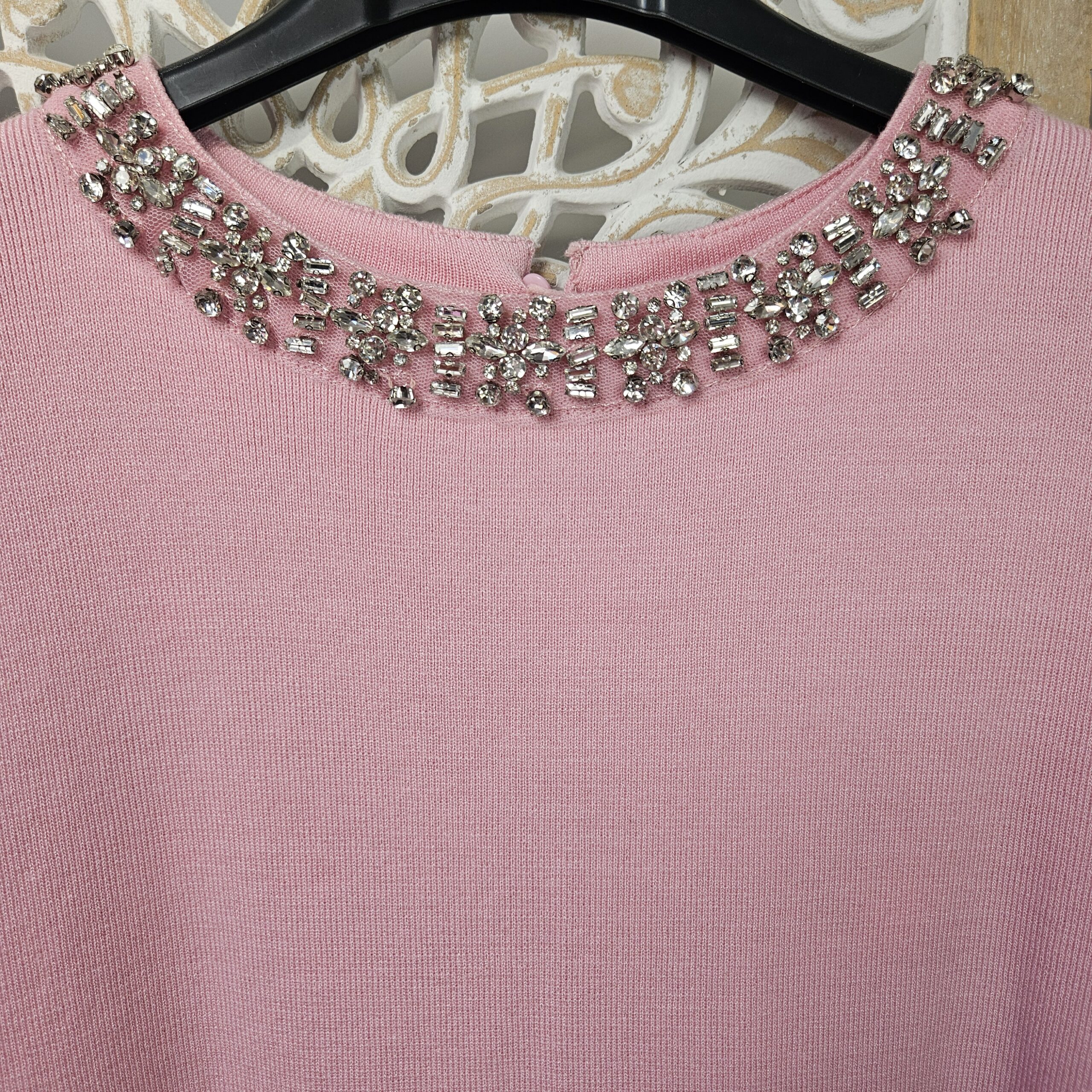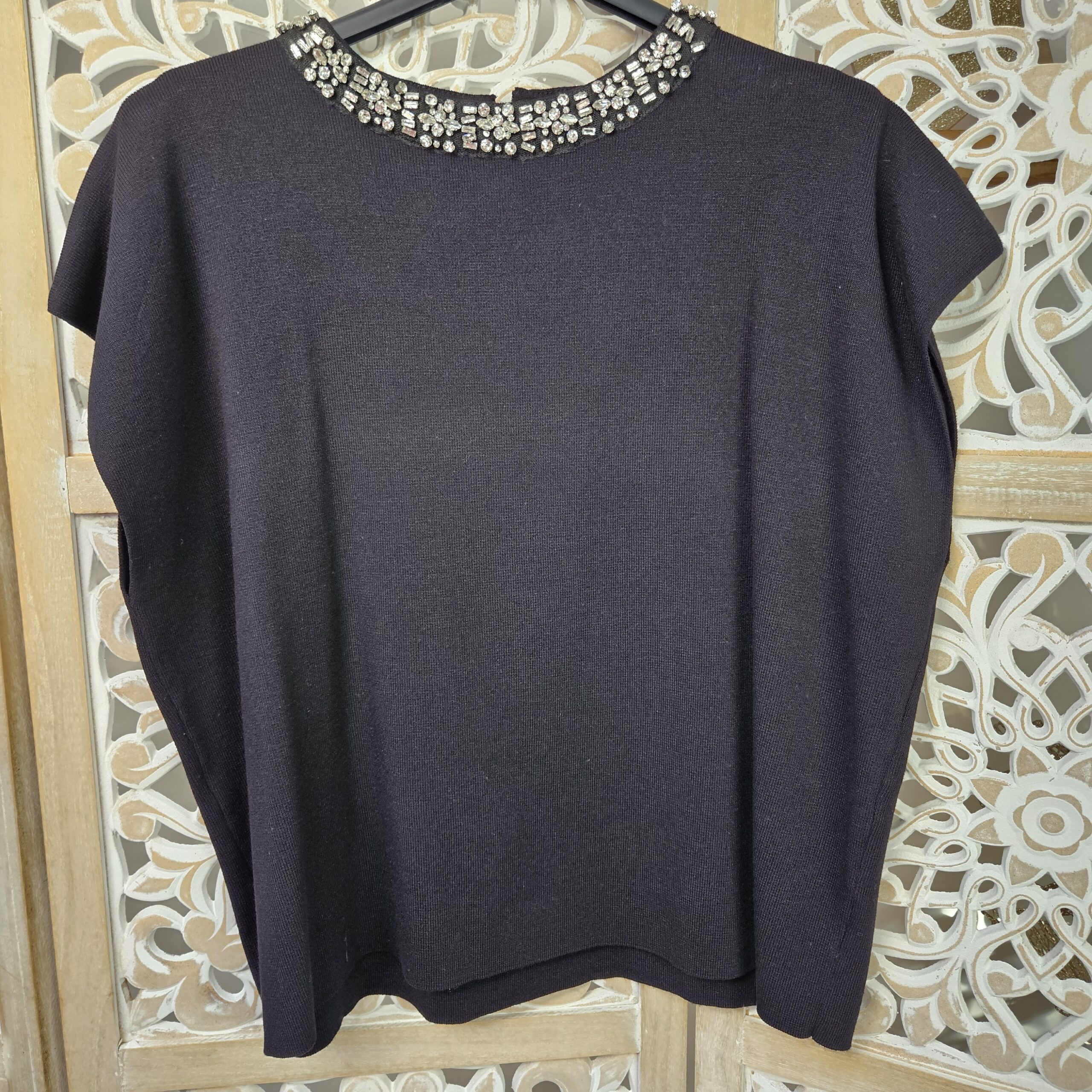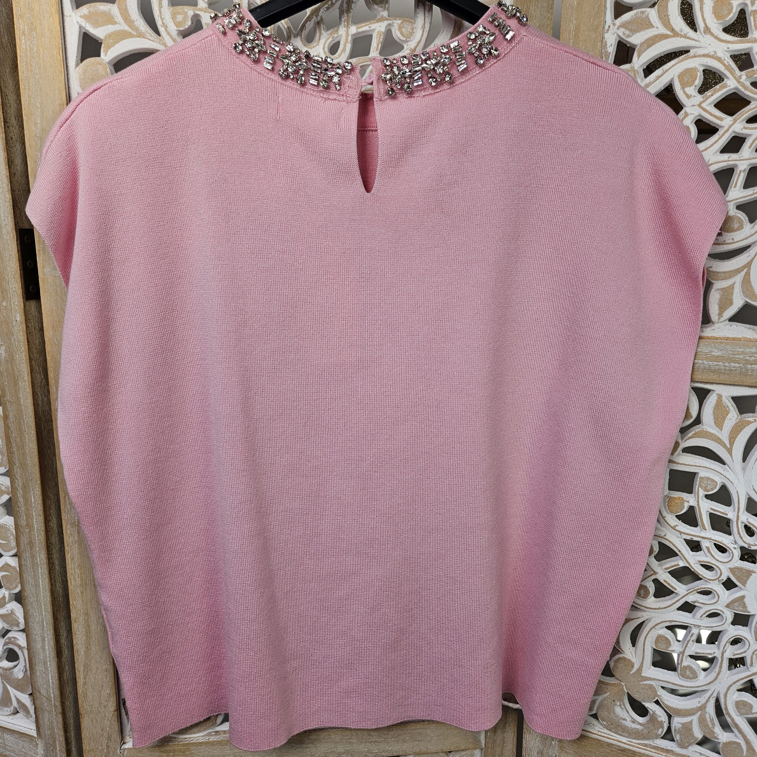 Top avec manches courtes évasées, col avec différents strass, fermeture avec un bouton. Léger et très agréable à porter. Existe en rose et noir.