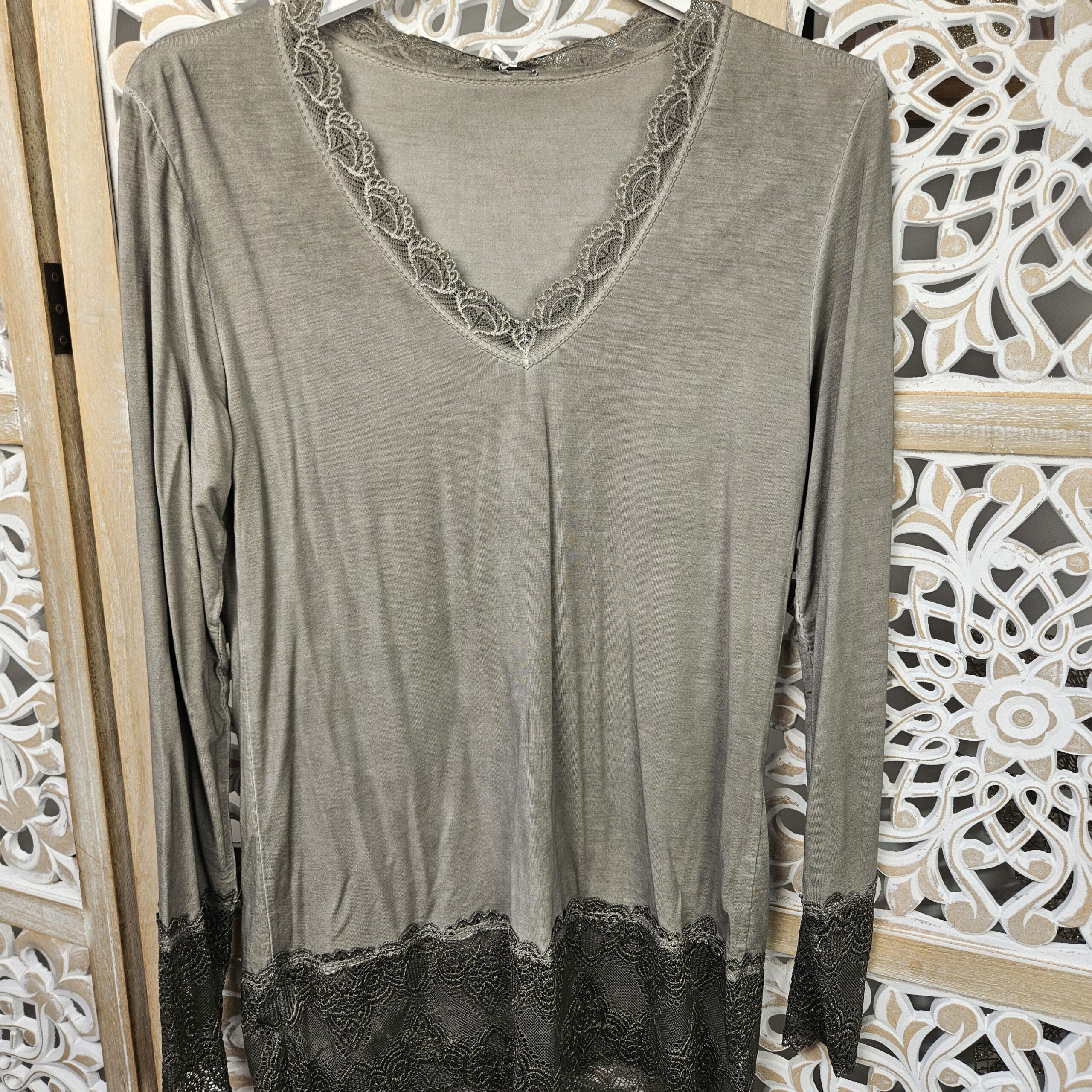 Top dentelle manches longues, (appelé Rouleaux) col V dentelle sur le décolleté, autour des manches, et sur le bas. Coupe près du corps, type slim. TU. La viscose rend le top très doux, et l’élasthanne extensible. Existe en rose pâle, et en taupe.