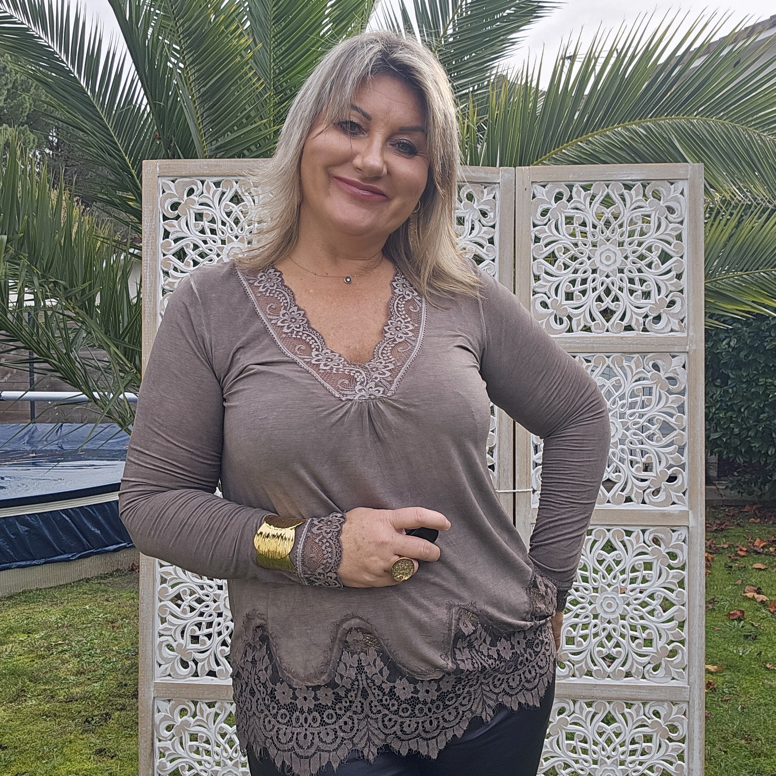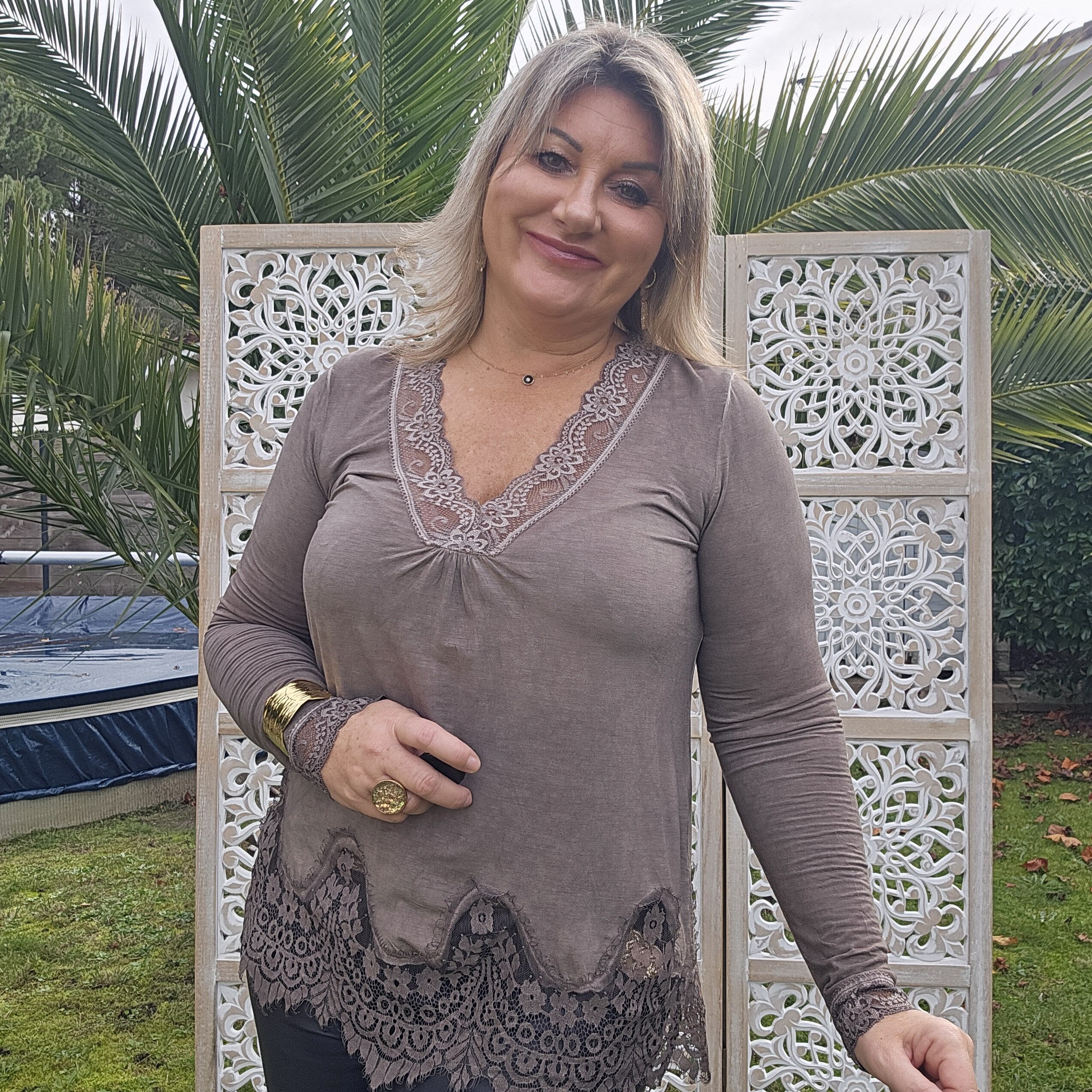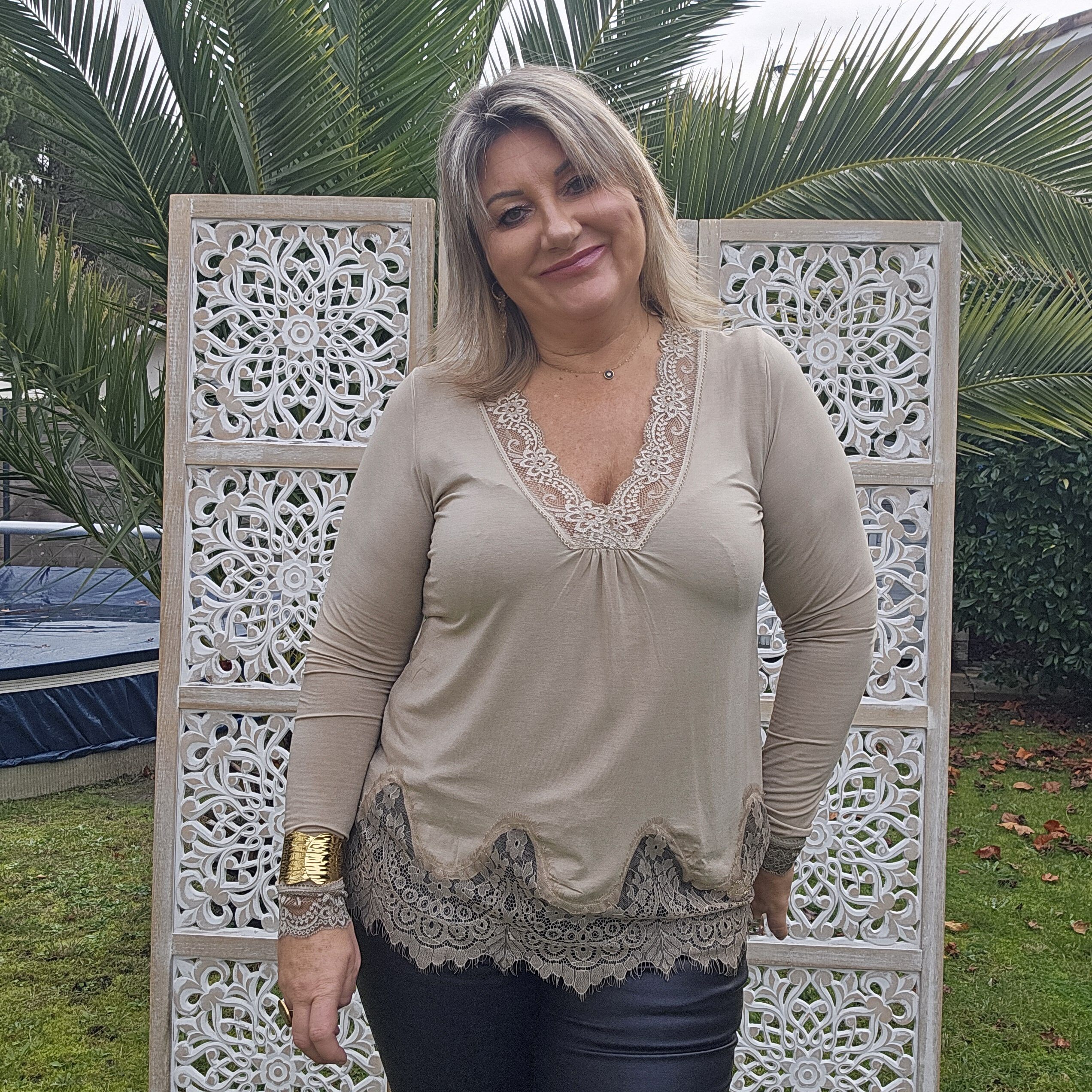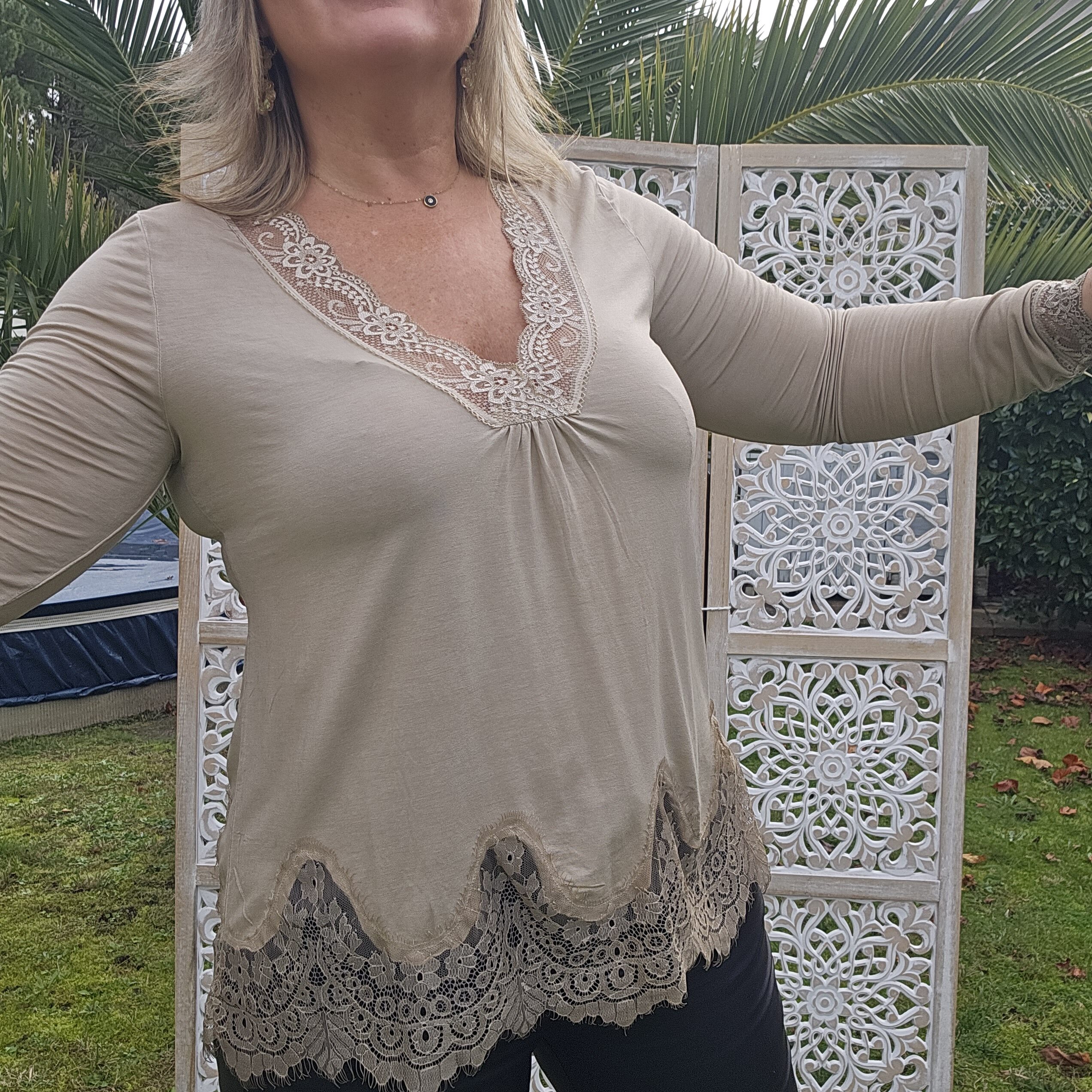 Top dentelle manches longues, col V dentelle large sur le décolleté, autour des manches, et sur le bas. Coupe près du corps, type slim. TU 36/44. La viscose rend le top très doux, et l’élasthanne extensible. Existe en noir, en camel et en chocolat.