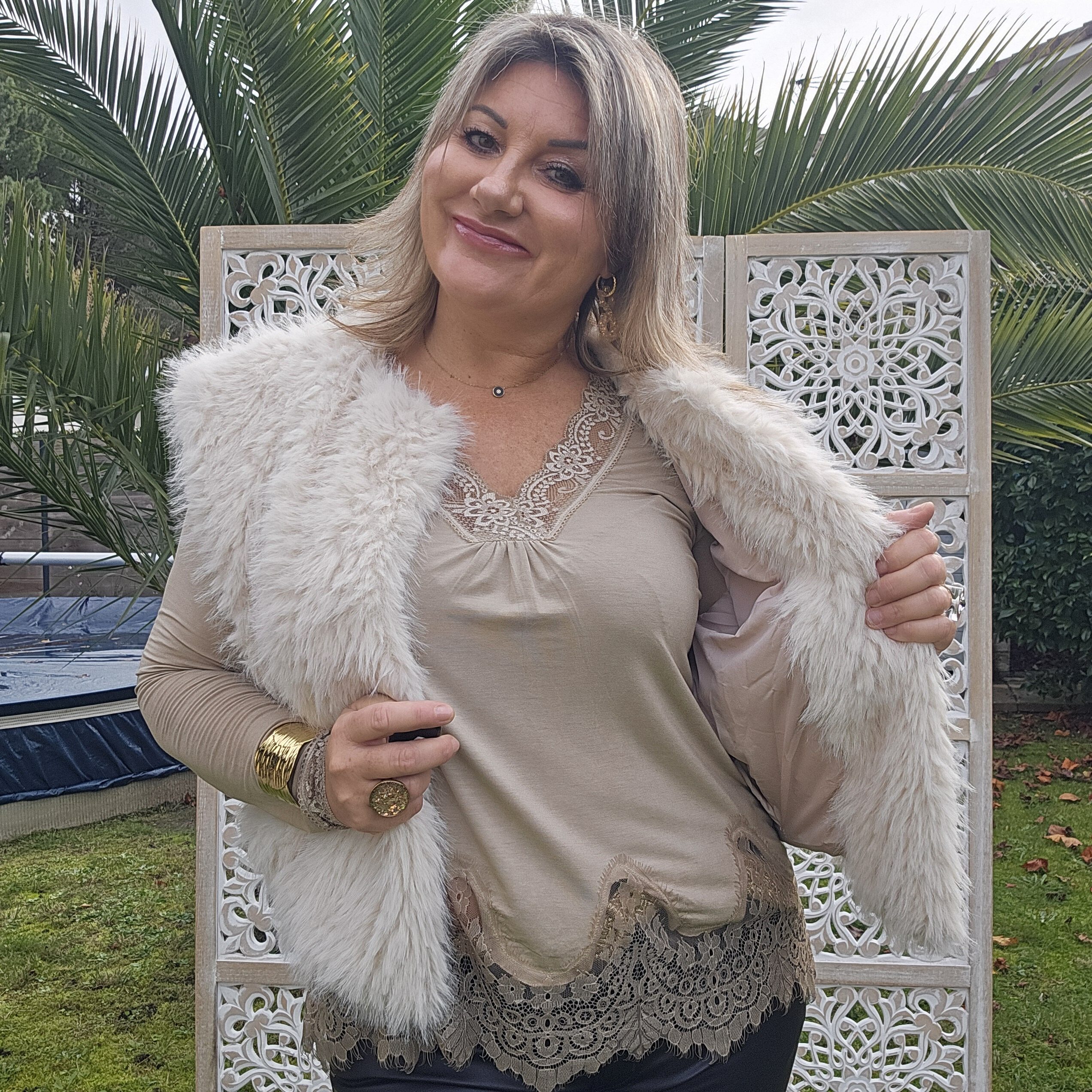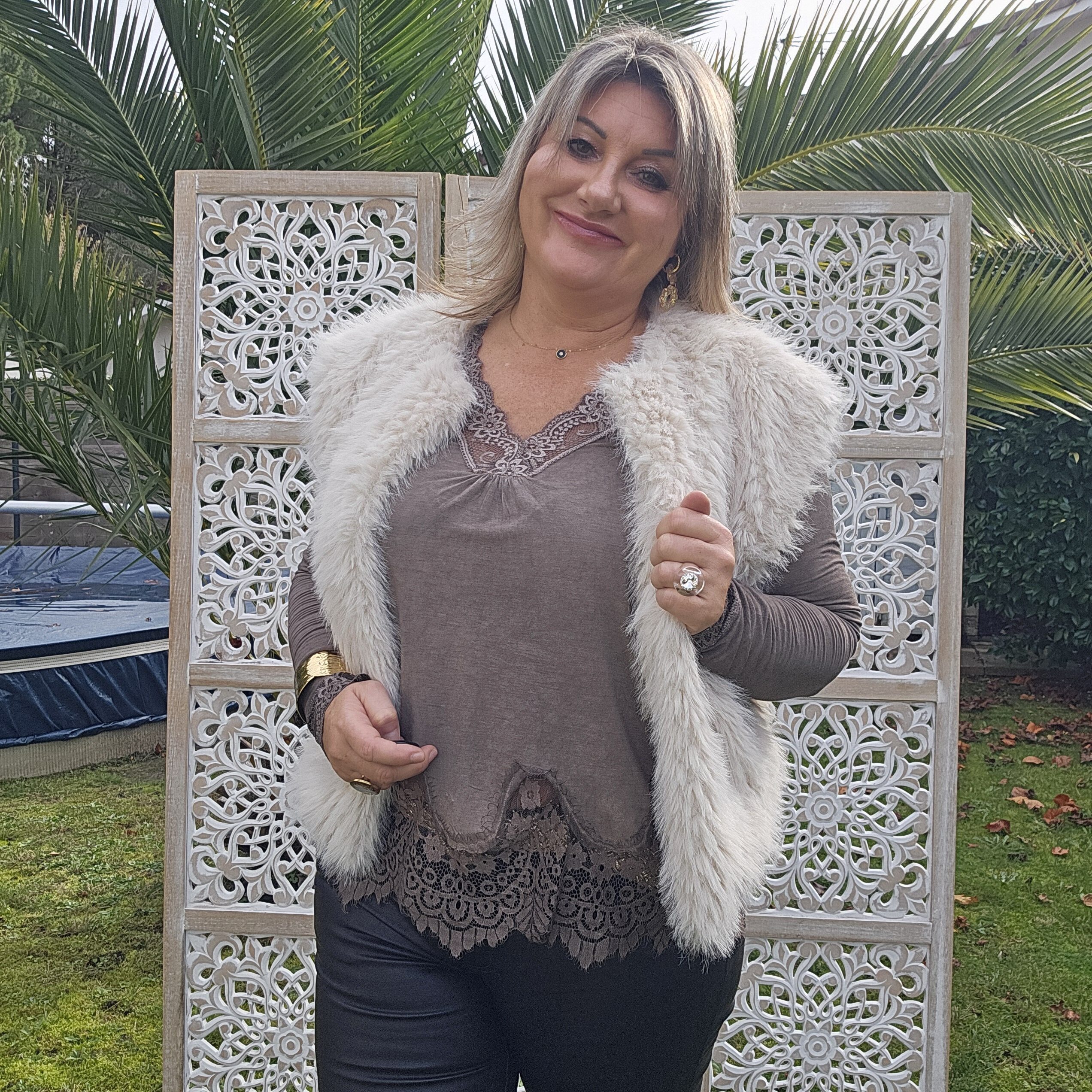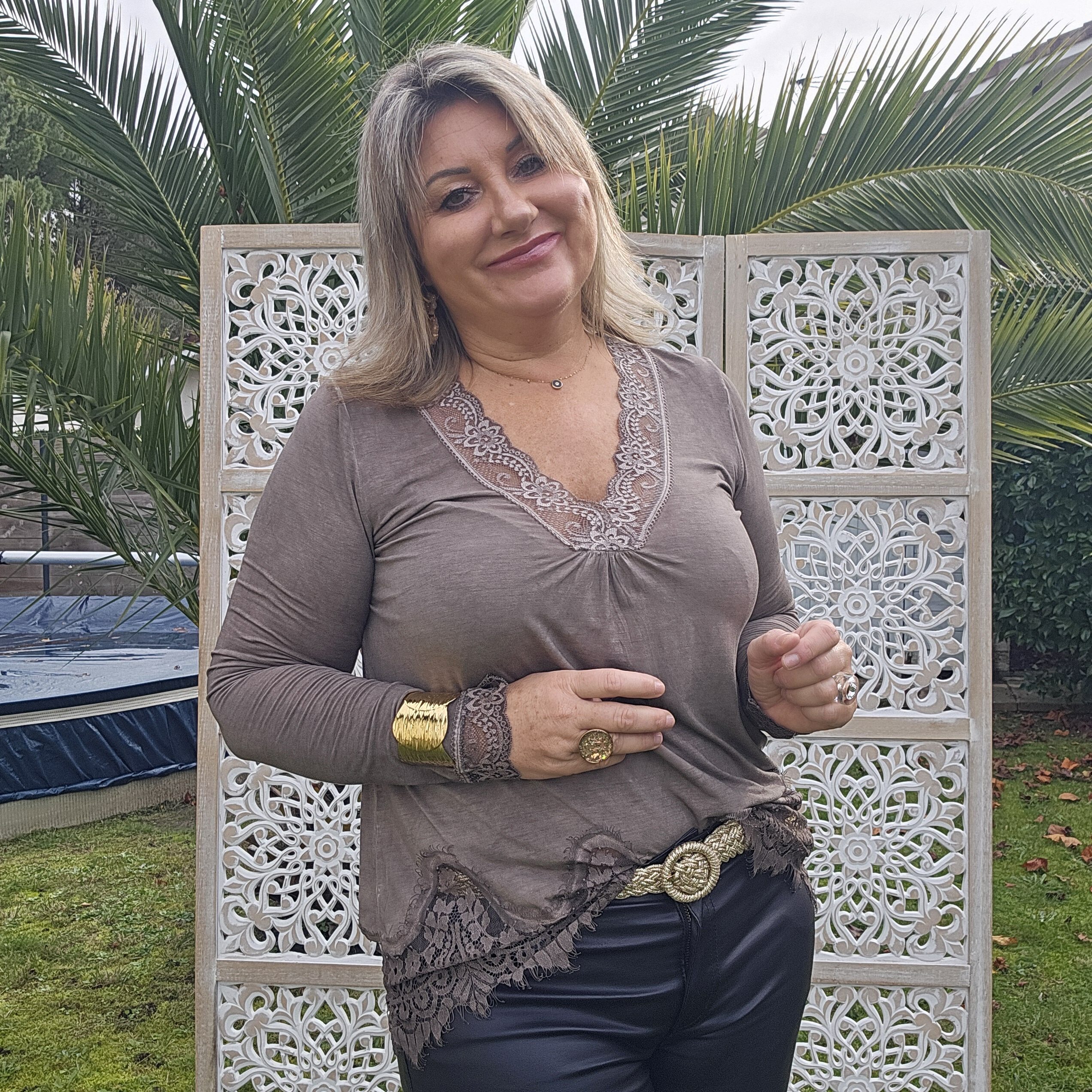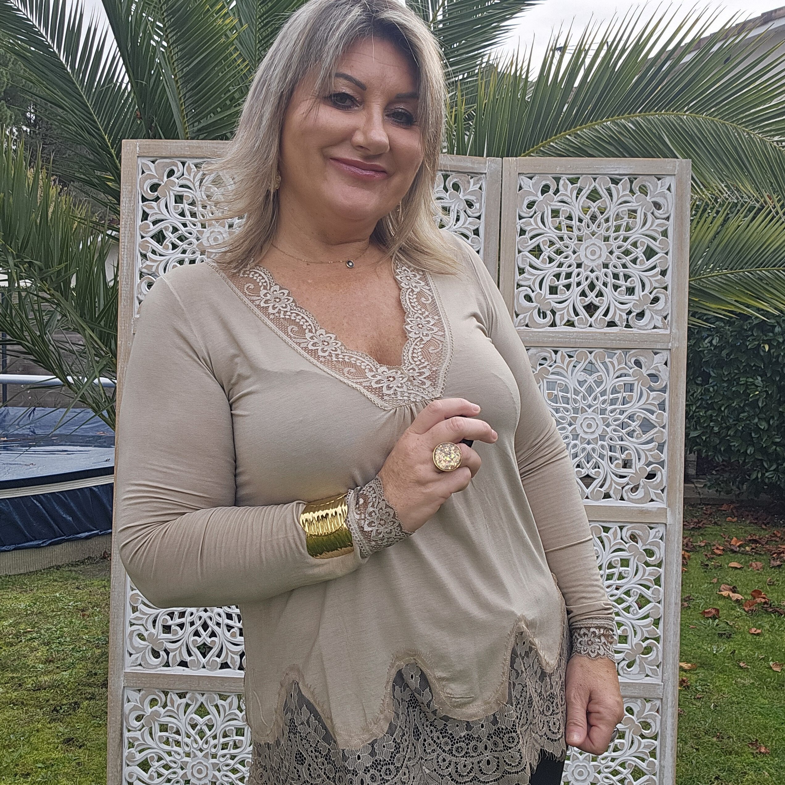 Top dentelle manches longues, col V dentelle large sur le décolleté, autour des manches, et sur le bas. Coupe près du corps, type slim. TU 36/44. La viscose rend le top très doux, et l’élasthanne extensible. Existe en noir, en camel et en chocolat.