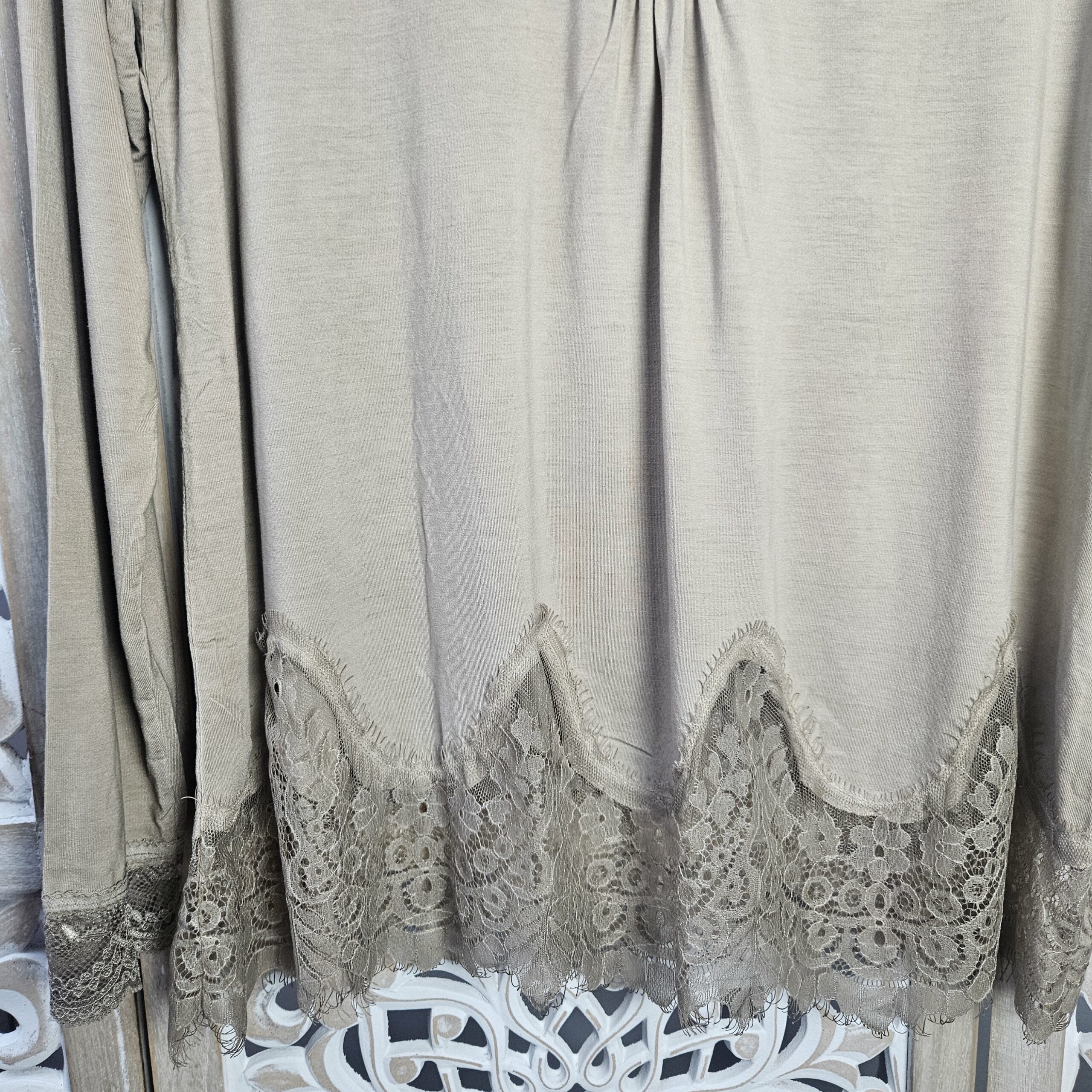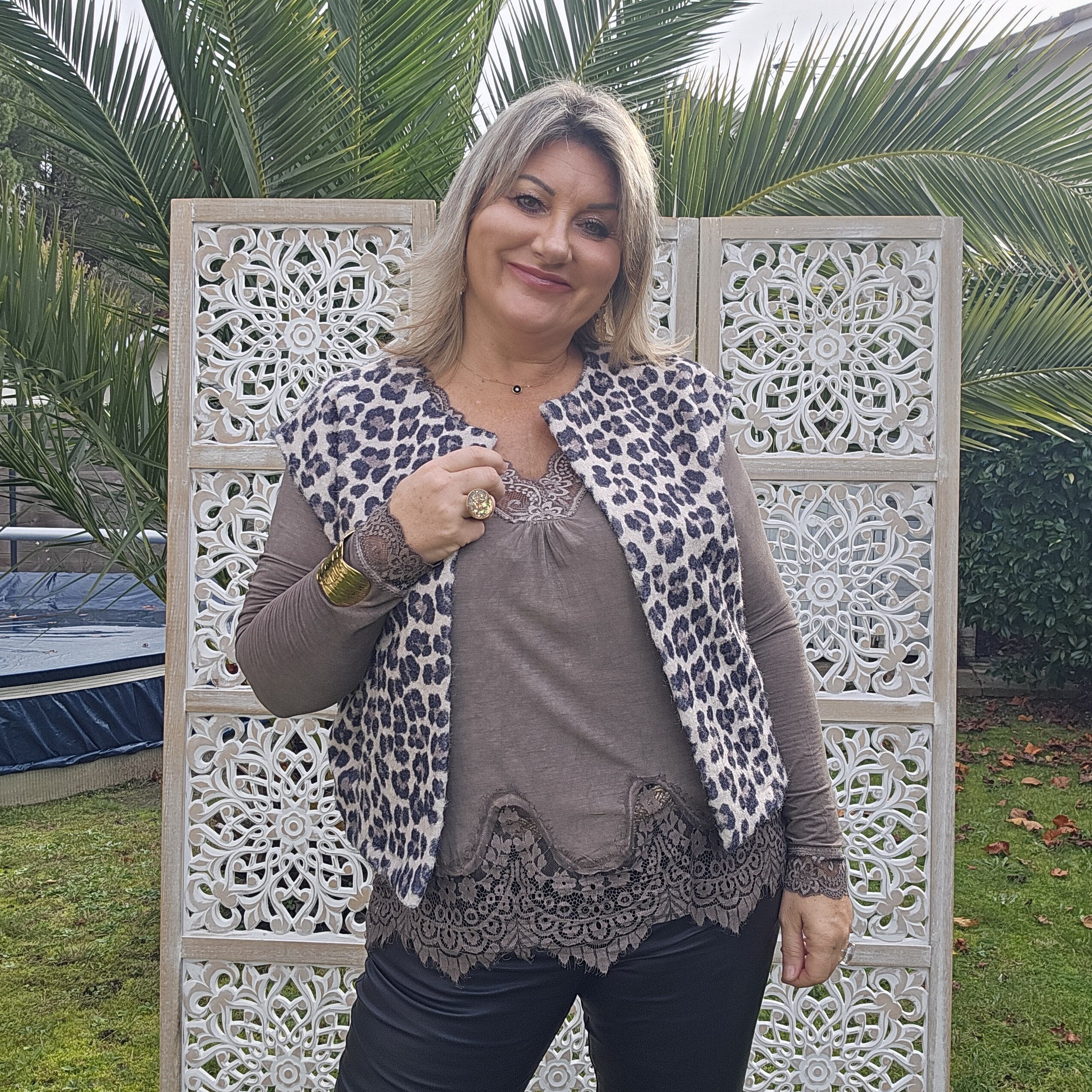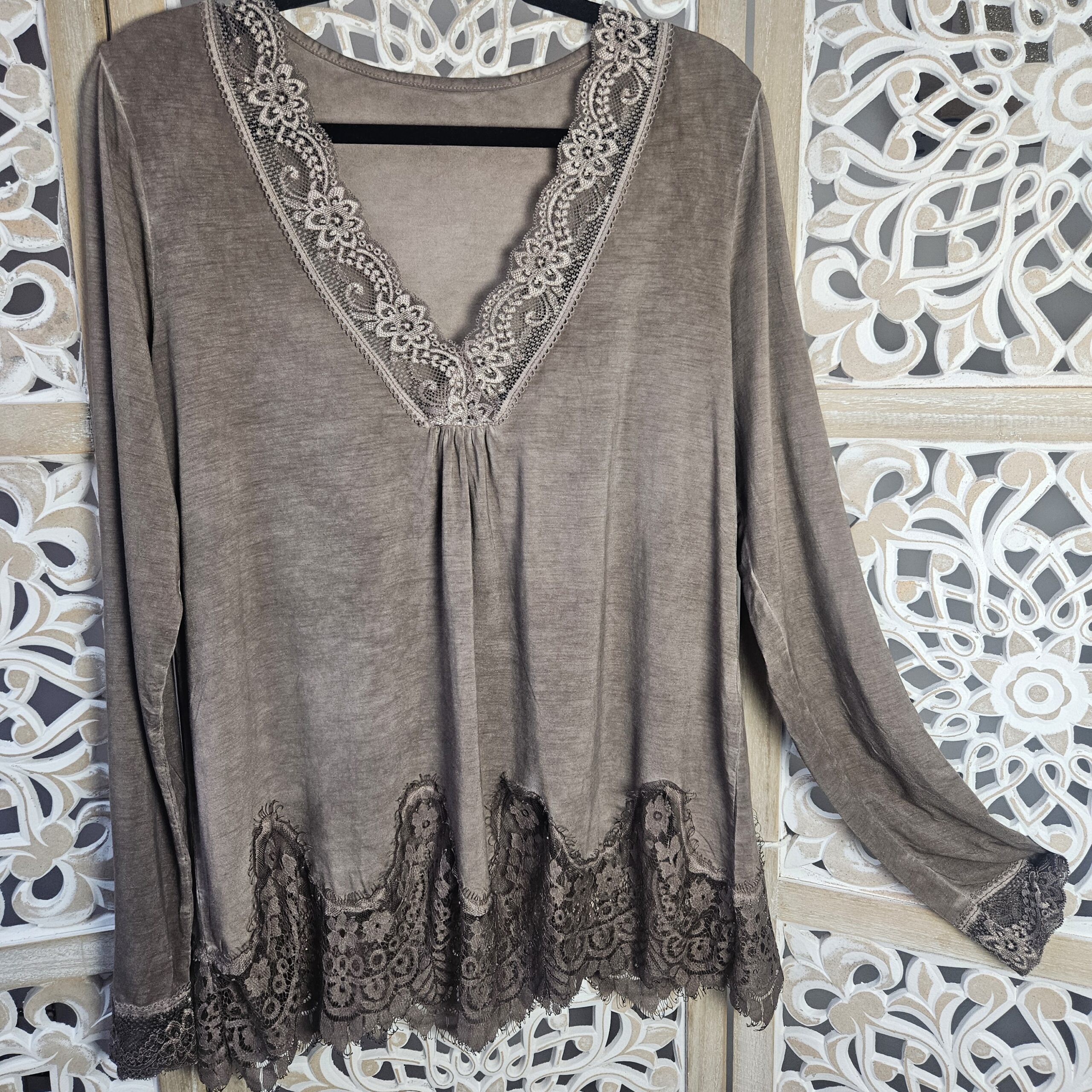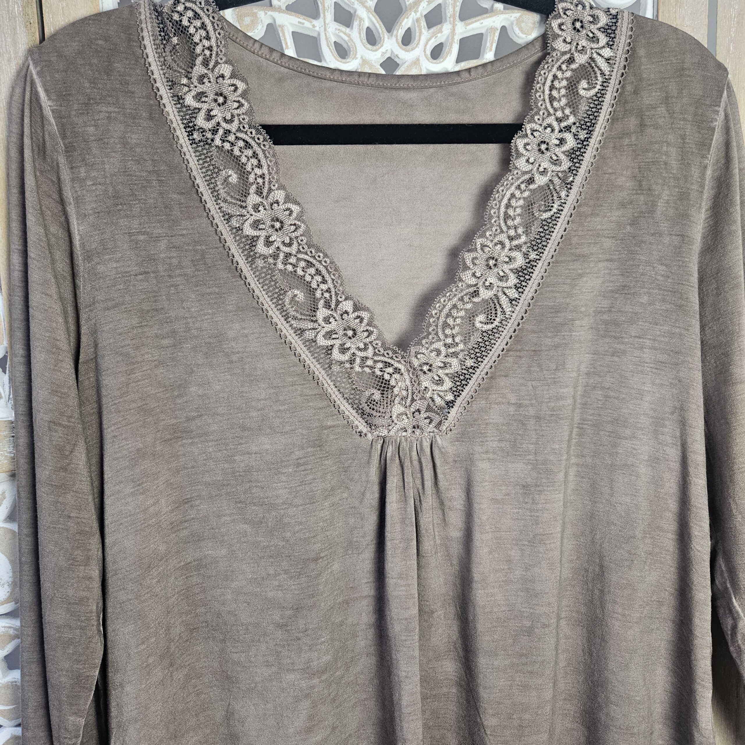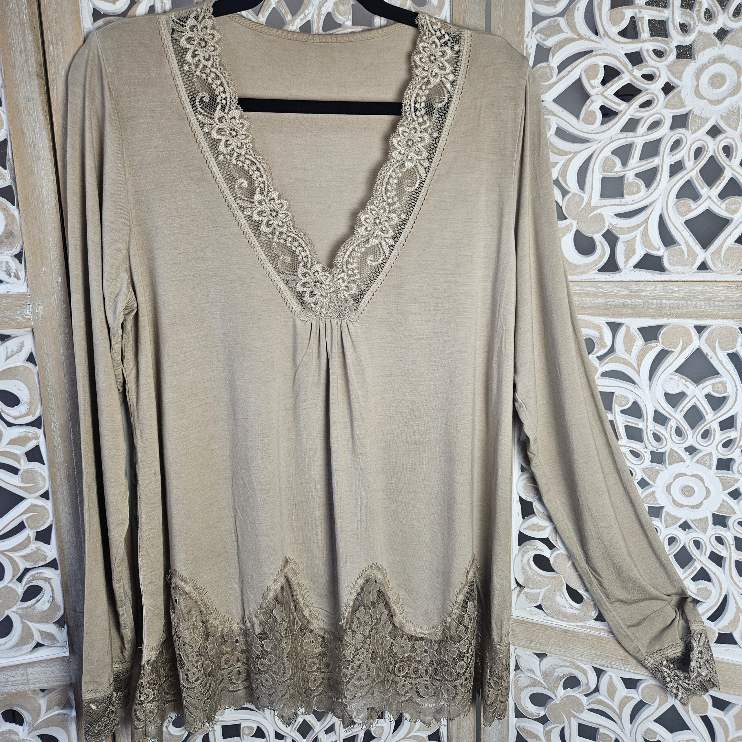 Top dentelle manches longues, col V dentelle large sur le décolleté, autour des manches, et sur le bas. Coupe près du corps, type slim. TU 36/44. La viscose rend le top très doux, et l’élasthanne extensible. Existe en noir, en camel et en chocolat.