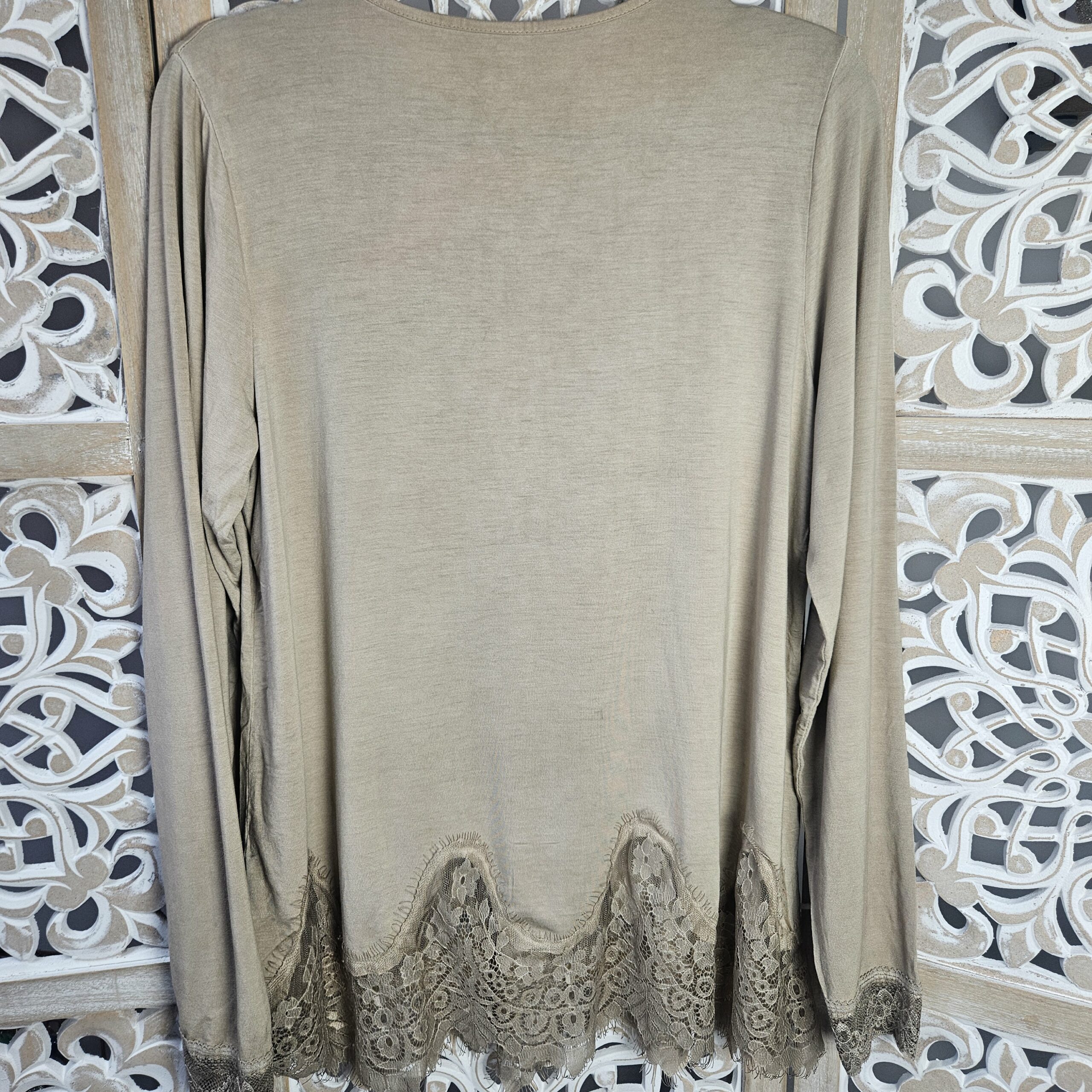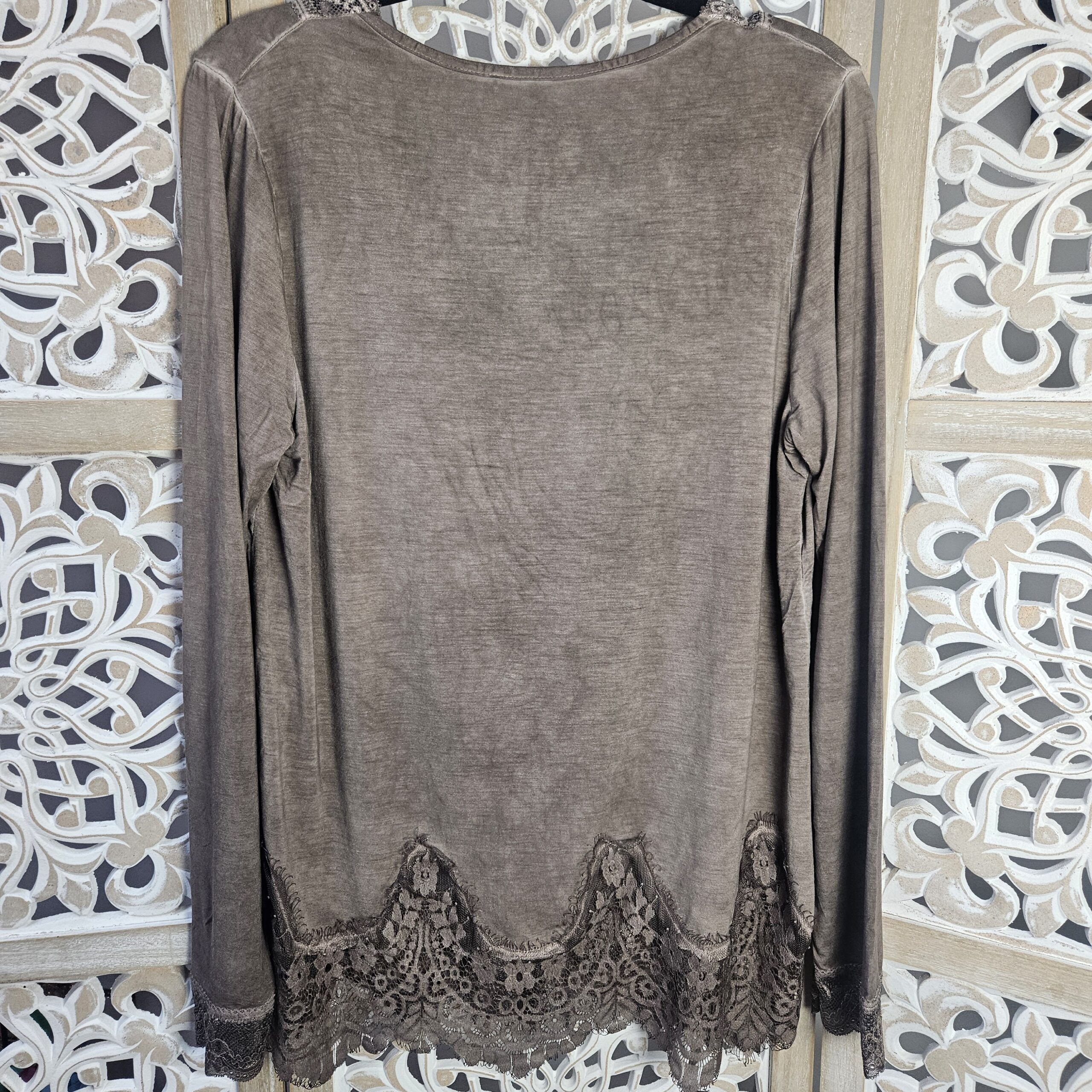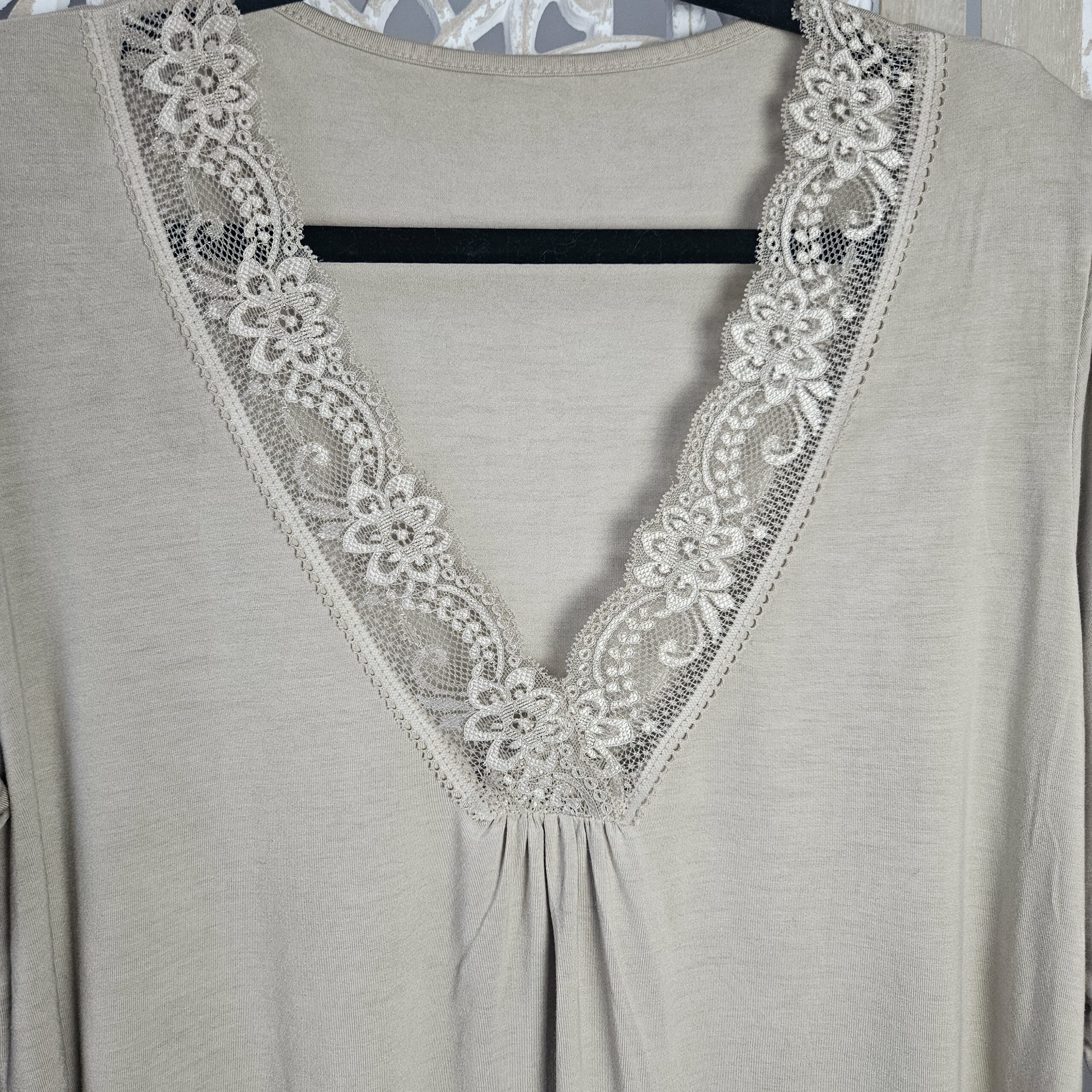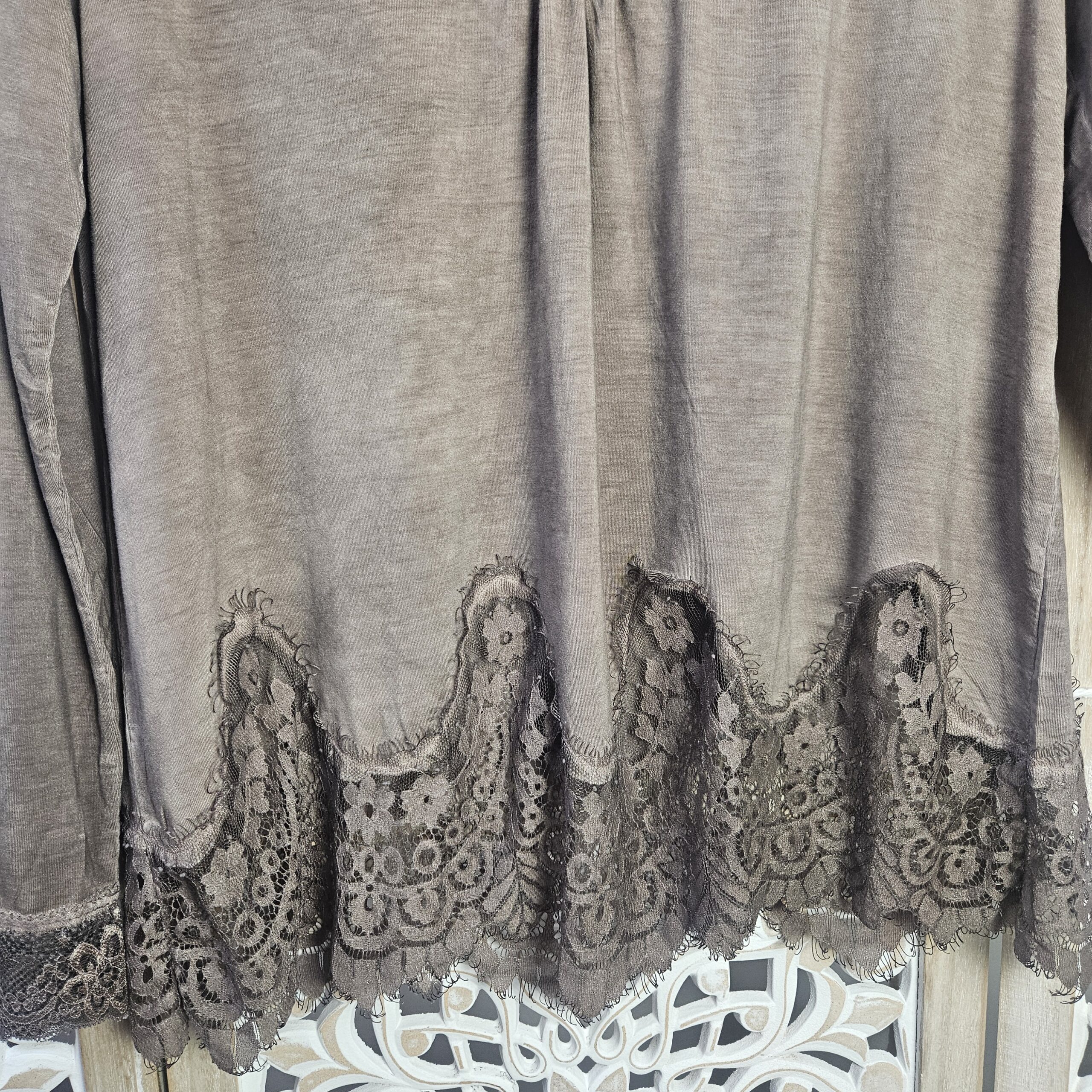 Top dentelle manches longues, col V dentelle large sur le décolleté, autour des manches, et sur le bas. Coupe près du corps, type slim. TU 36/44. La viscose rend le top très doux, et l’élasthanne extensible. Existe en noir, en camel et en chocolat.