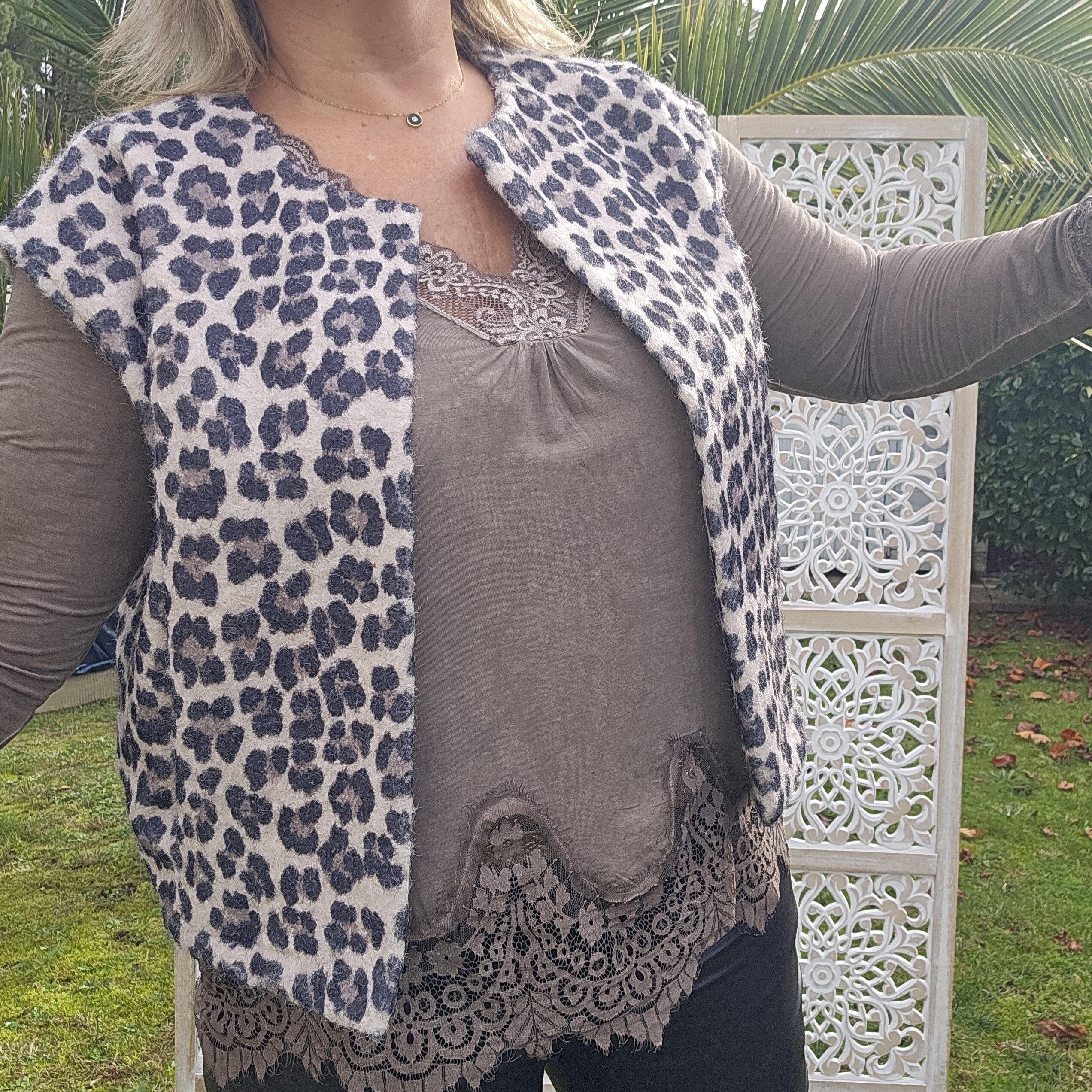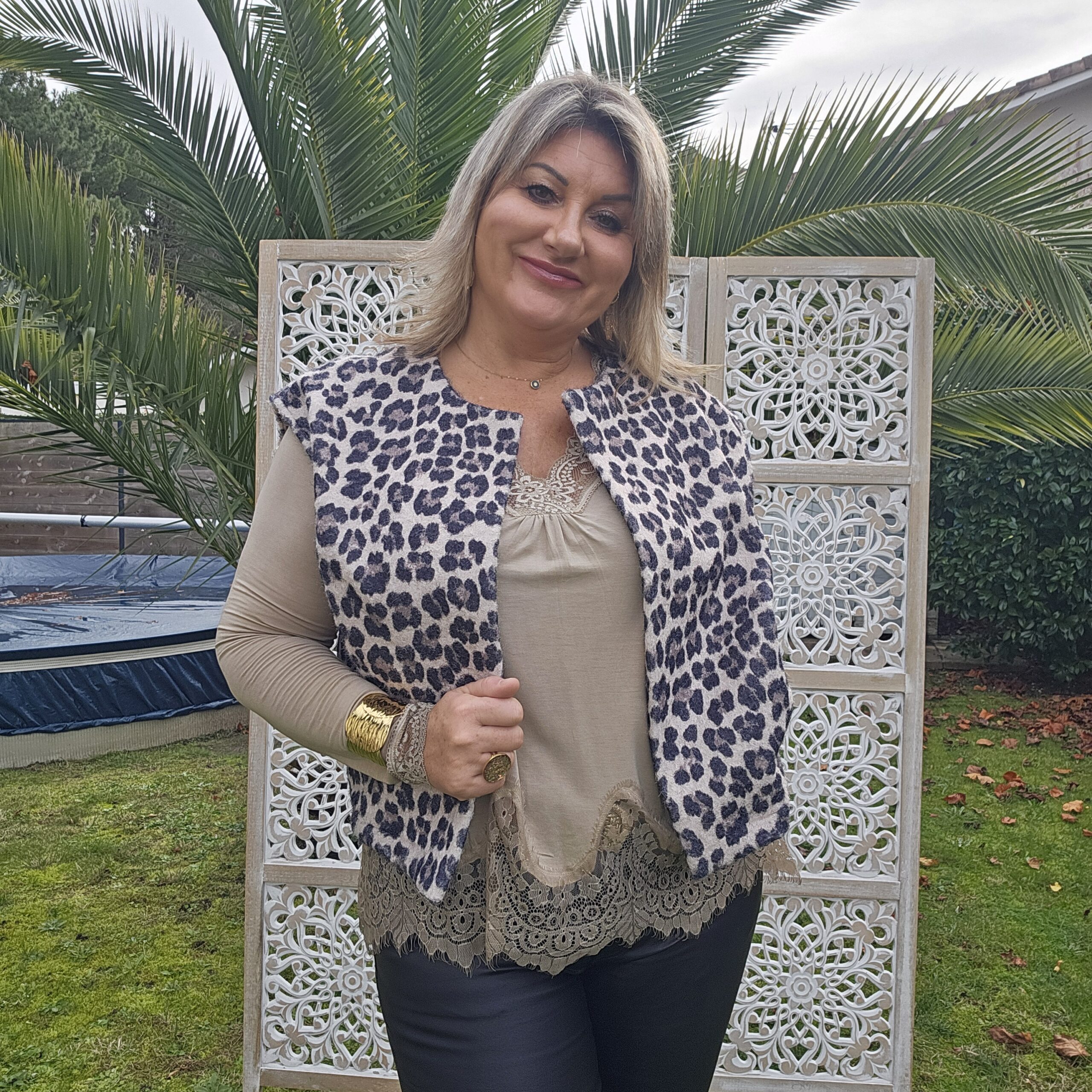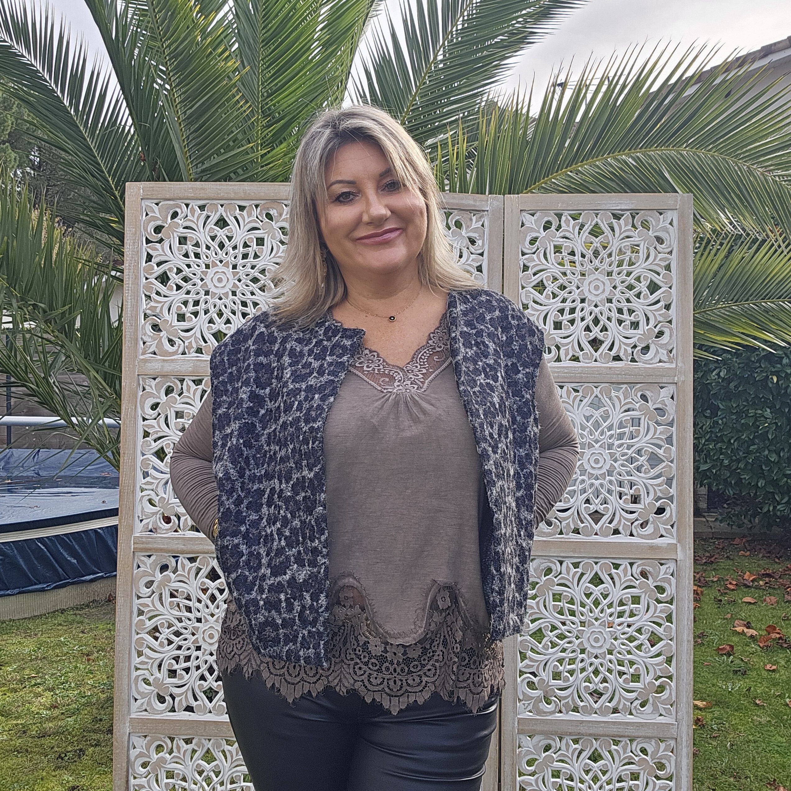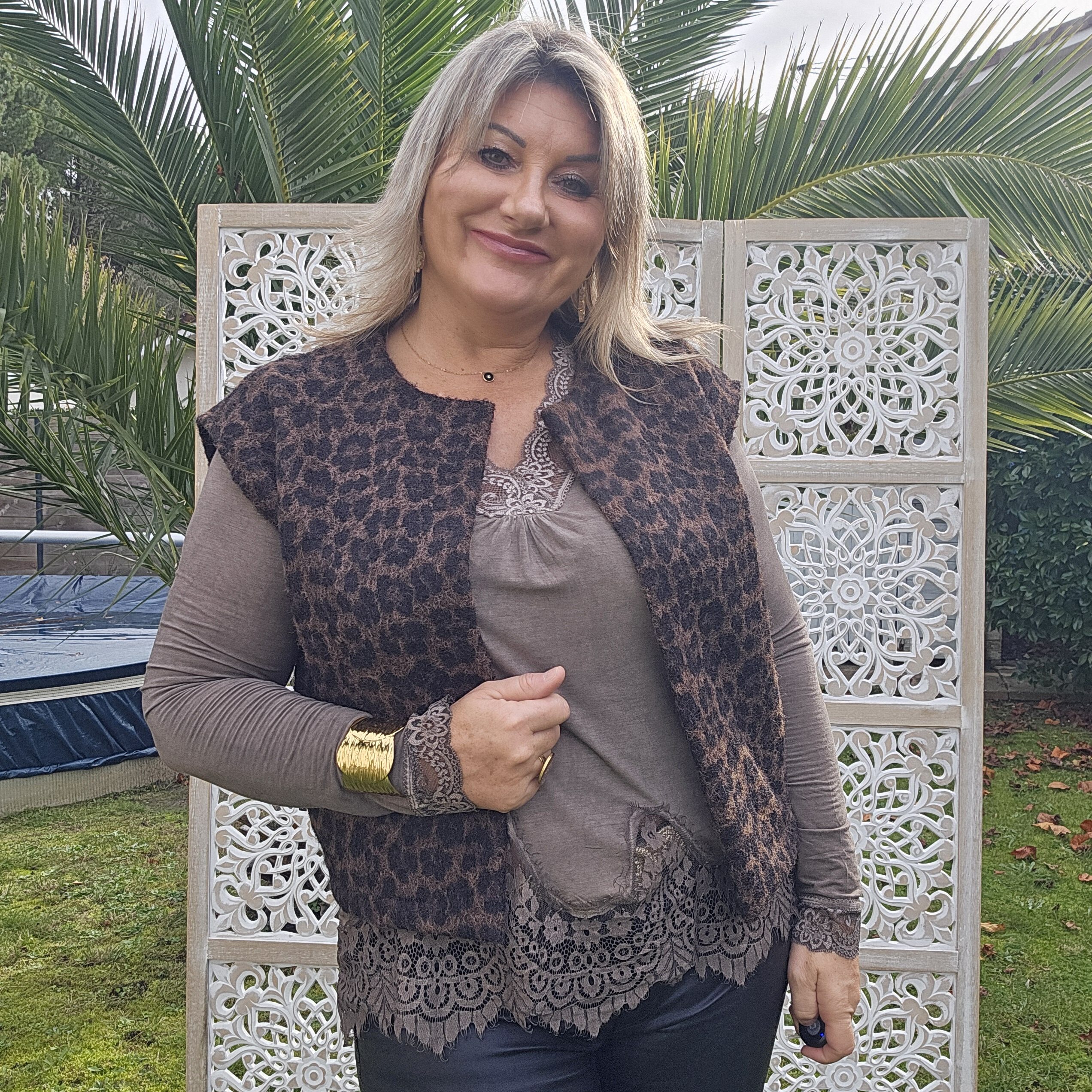 Mon regard pailleté : Convient à toutes les morphologies. Se porte sous les différents gilets sans manches ou seuls. Matière douce, extensible et agréable à porter.