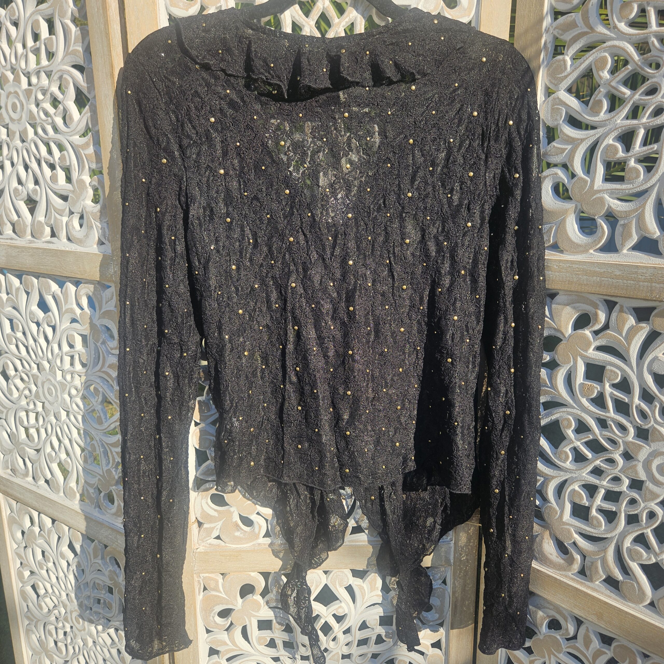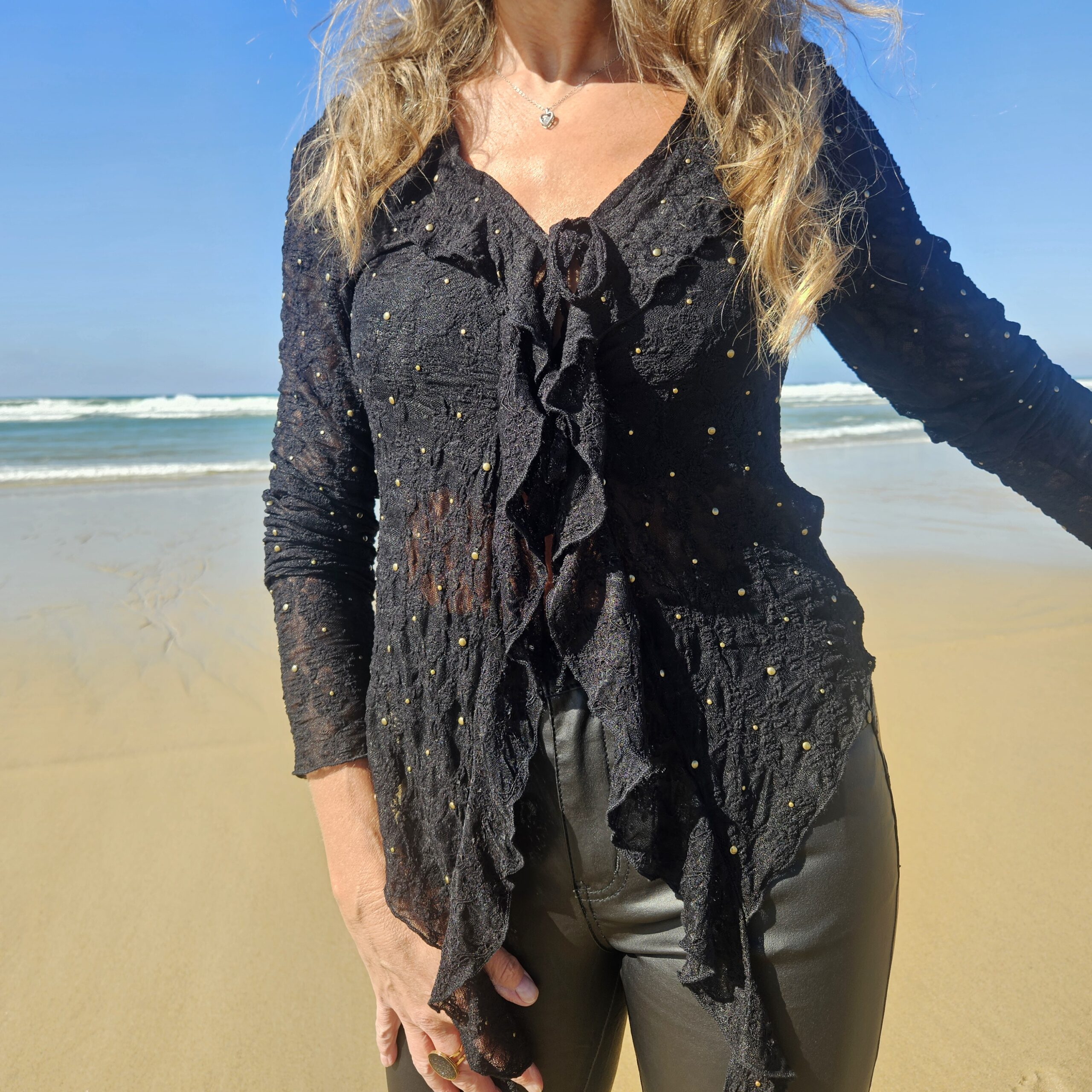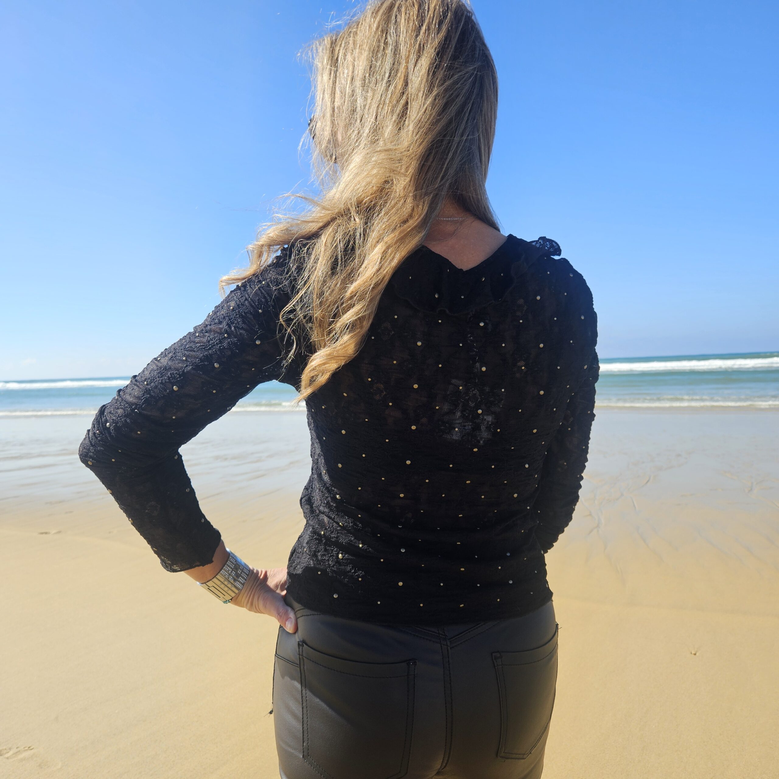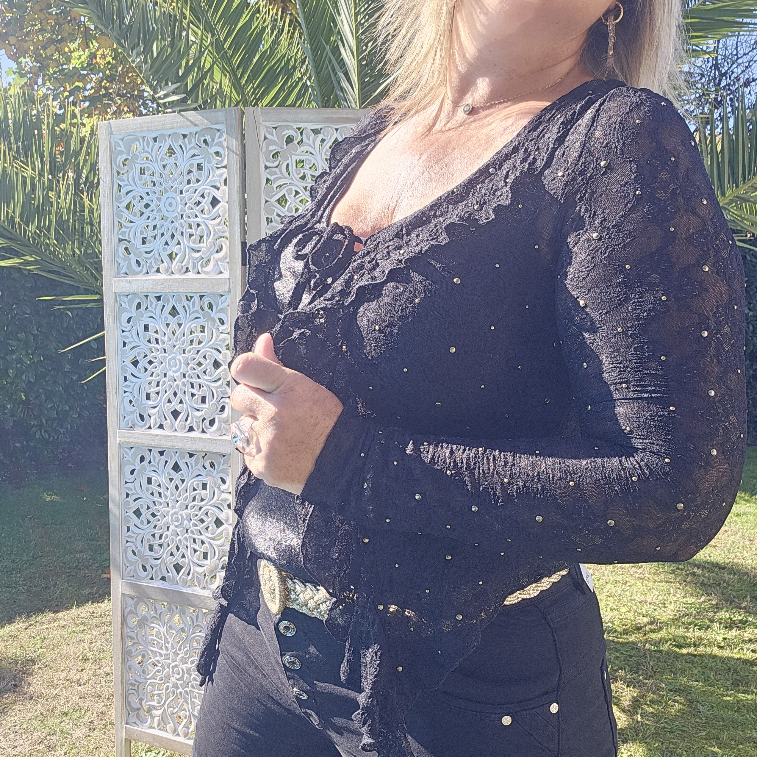 Top noir en dentelle avec des petites et moyennes pastilles dorées brossées, afin de donner un style clouté. Manches longues, col V. Autour du col, une petite bande froufrou jusqu’en bas. Fermeture par 2 liens.