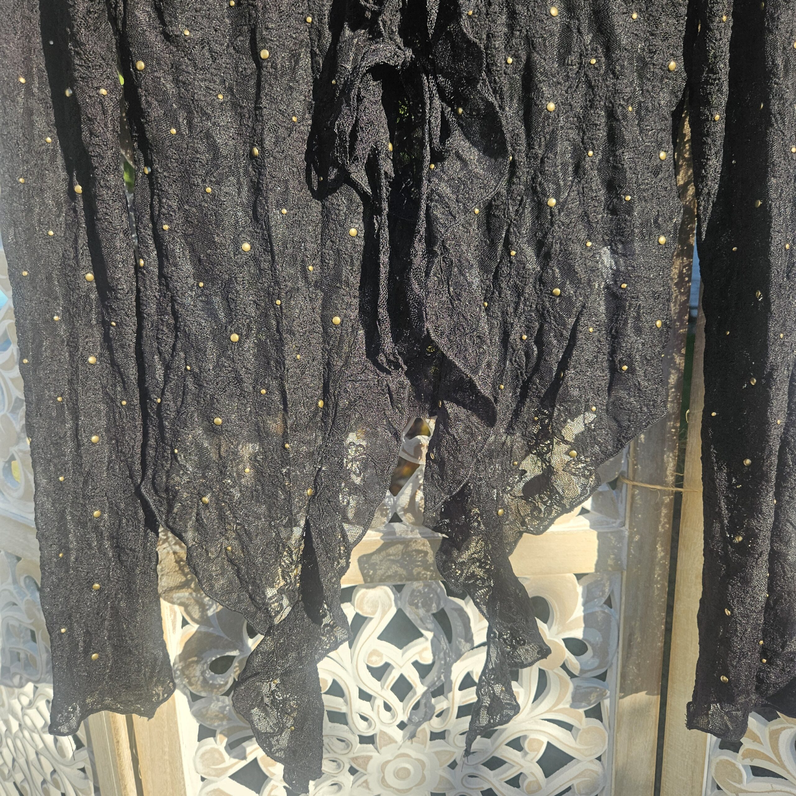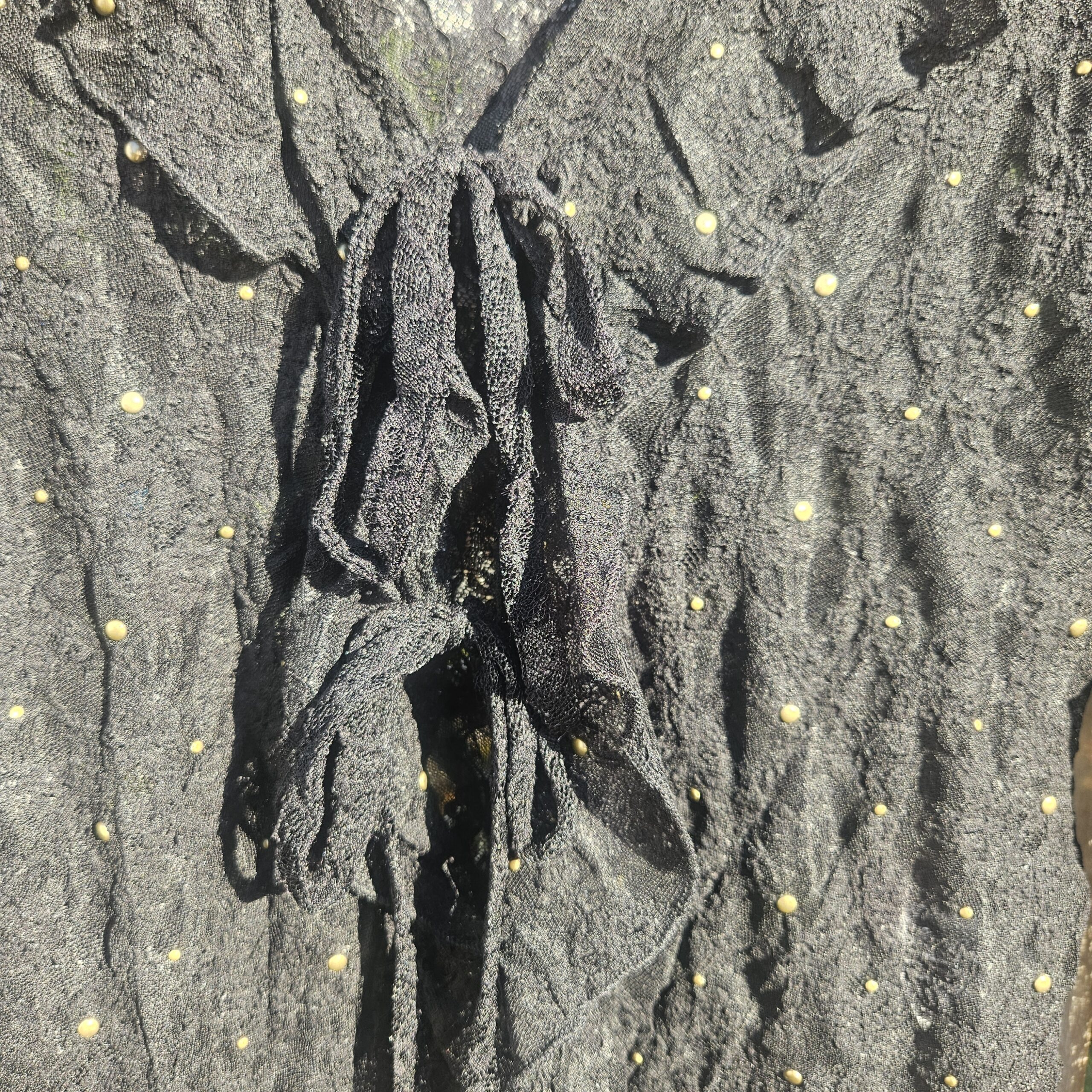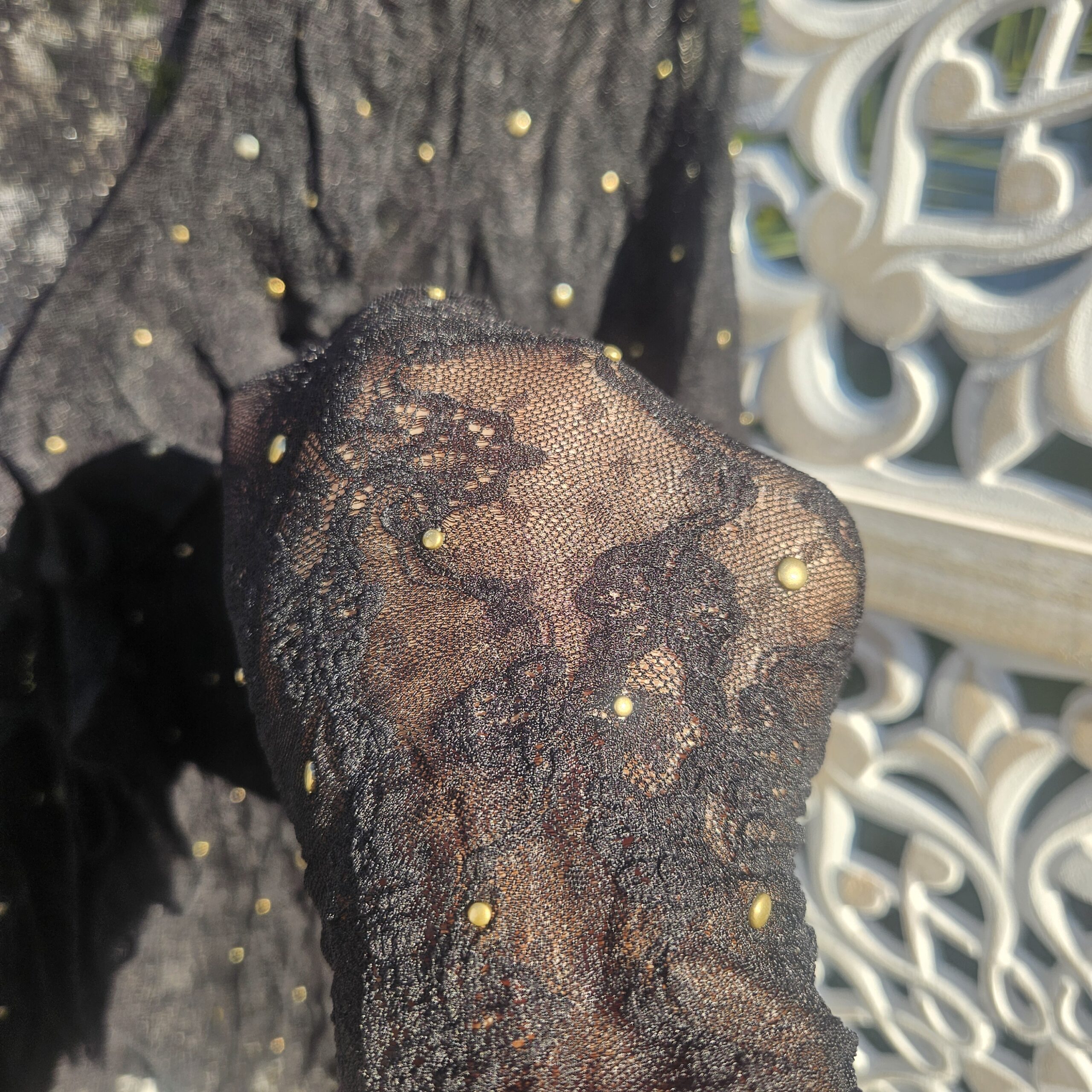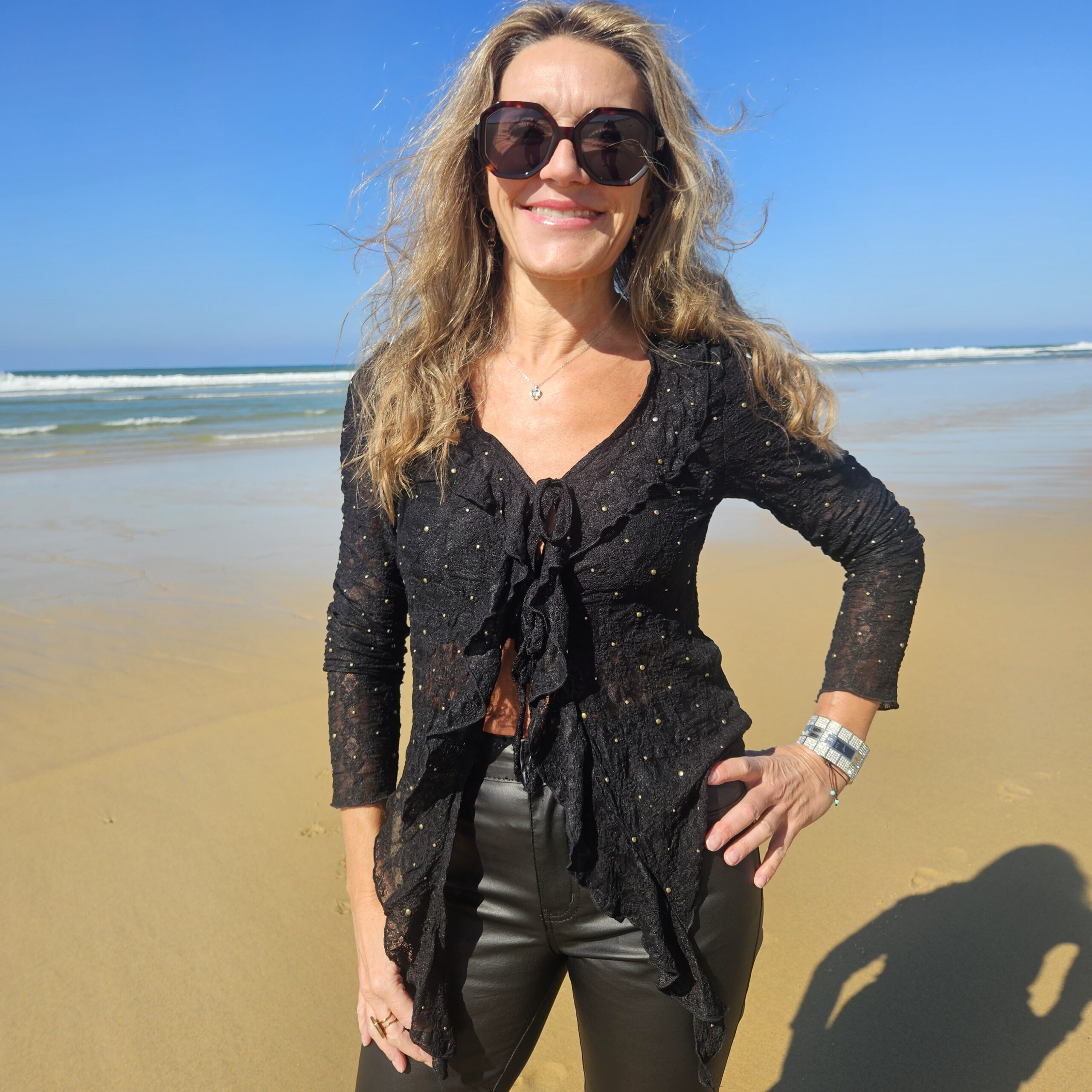 Top noir en dentelle avec des petites et moyennes pastilles dorées brossées, afin de donner un style clouté. Manches longues, col V. Autour du col, une petite bande froufrou jusqu’en bas. Fermeture par 2 liens.